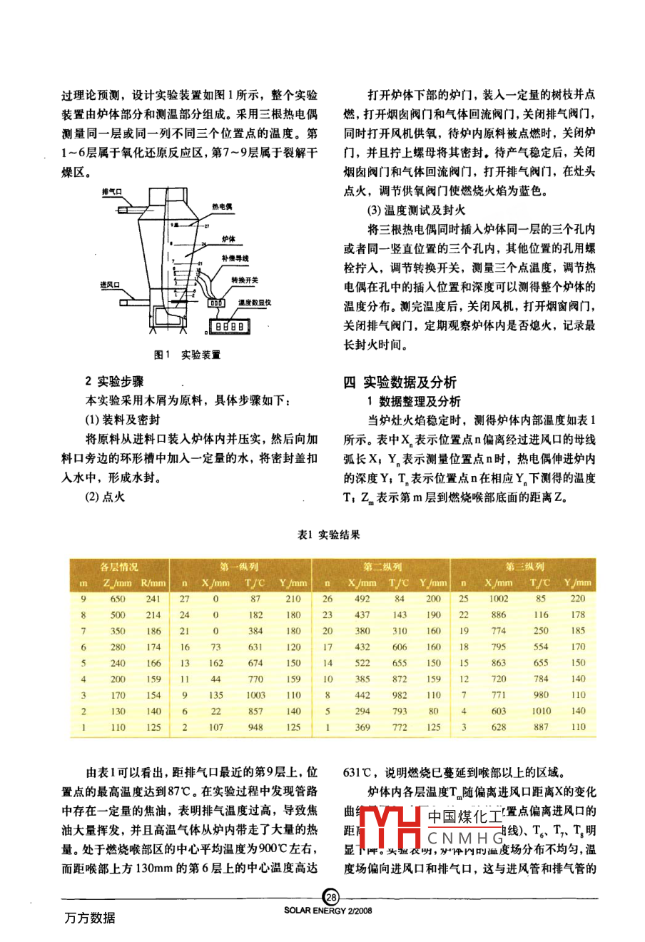 多功能生物質(zhì)氣化爐的優(yōu)化設(shè)計湘潭大學(xué)機械學(xué)院■學(xué)生科技興趣小組" 劉吉普摘要:以高效生物質(zhì)氣化爐為基礎(chǔ),設(shè)計測量爐內(nèi)溫度場的實驗裝置,并對爐體結(jié)構(gòu)的不足進行了分析和改進。優(yōu)化設(shè)計的多功能生物質(zhì)氣化爐,有效地解決了在燃燒過程中存在的溫度場分布不均勻、燃燒偏高、容易搭橋、焦油含量多等問題。關(guān)鍵詞:生物質(zhì),氣化爐;爐內(nèi)溫度場:優(yōu)化設(shè)計-前言區(qū)、干燥區(qū)、裂解區(qū)四個反應(yīng)區(qū)域"。氧化區(qū)空氣比生物質(zhì)是可再生的清潔綠色能源,它的開發(fā)利較充足,炭燃燒比較完全,溫度可達到1000C左右,用不僅可以解決能源匱乏的問題,還具有顯著的社主要反應(yīng)式叫為:會效益和經(jīng)濟效益。生物質(zhì)傳統(tǒng)的處理方法(炊事C+O2=CO2+406kJ/mol用、野外焚燒、露天堆積)不僅造成生物質(zhì)資源的低2C+02=2C0+160kJ/mol效率利用,同時也嚴(yán)重地污染了環(huán)境。通過生物質(zhì)還原區(qū)主要是炭的不完全燃燒,溫度約為氣化或炭化將其轉(zhuǎn)化為高品質(zhì)能源,改變生物質(zhì)能700~900C,主要反應(yīng)式為:的傳統(tǒng)利用方式是推進生物質(zhì)能市場化的關(guān)鍵。生C+CO2=2CO-162kJ/mol物質(zhì)能氣化技術(shù)不僅改善了用能方式,凈化了環(huán)境,C+H20=CO+H2-1 18kJ/mol促進了農(nóng)村地區(qū)經(jīng)濟發(fā)展,而且為我國能源緊張和C+2Hz= =CH.+75kJ/mol環(huán)境治理提供了一條新途徑。然而,對于經(jīng)濟相對裂解區(qū)的溫度約為400~ 600C ,生物質(zhì)燃料揮落后、地理位置比較分散的農(nóng)村用戶,實現(xiàn)集中供發(fā)物逐漸達到裂解溫度,發(fā)生熱裂解,生成CH,及氣不現(xiàn)實。因此,研制成本低、效事高.適用性強CH.等有機可燃?xì)怏w|。的家用型生物質(zhì)氣化爐灶具有很強的經(jīng)濟意義,應(yīng)用前景十分廣闊"。三實驗研究通過調(diào)查研究,目前氣化爐普遍存在氣化效率1實驗裝置不高、焦油含量偏高、穩(wěn)定性差及爐內(nèi)容易搭橋等生物質(zhì)氣化爐的主要影響因素是溫度場分布和缺陷2。影響氣化爐綜合效益的主要因素有原料中氣化后氣體的走勢叫,在現(xiàn)有的理論和參考文獻中,的水分、灰分、顆粒大小、氣化爐內(nèi)溫度分布、氣還沒 有徹底解決氣化爐內(nèi)溫度場分布規(guī)律的問題)。體在爐體內(nèi)停留時間和氣體壓力等時。本文在實驗本 實驗在高效生物質(zhì)氣化爐的基礎(chǔ)上,設(shè)計了一套的基礎(chǔ)上,測得爐體內(nèi)溫度場的分布,并以實驗為能方便測量爐內(nèi)溫度場的實驗裝置。氣化爐錐部尺依據(jù)設(shè)計了解決搭橋現(xiàn)象、提高氣化效率和減少焦寸為300mm x 150mm X 150mm,包括氧化區(qū)和部油的多功能生物質(zhì)氣化爐,同時也為其他爐體的改分還原區(qū),為測得燃燒過程中爐內(nèi)溫度分布及通風(fēng)造提供了理論依據(jù)。后對溫度的影響,在進風(fēng)口上60mm和80mm的兩層分別均布3個測溫孔;氧化區(qū)和還原區(qū)是氣化爐二生物質(zhì)氣化爐的工作原理的核心中國煤化工產(chǎn)生9,故在第2生物質(zhì)燃料在氣化爐中的氣化反應(yīng)是比較復(fù)雜層上1二k區(qū)和裂解區(qū)中,CNMHG的物理、化學(xué)平衡過程”。其反應(yīng)機理可簡述為:當(dāng)只需檢明)件內(nèi)疋言反土指所優(yōu)教和測定排氣溫度,底部燃料引火點燃后,反應(yīng)室內(nèi)分為氧化區(qū)、還原故在第6層上的420mm空間中只需均布3層孔。經(jīng)@SOLAR ENERGY 2/2008過理論預(yù)測,設(shè)計實驗裝置如圖1所示,整個實驗打開爐體下部的爐門,裝入一定量的樹枝并點裝置由爐體部分和測溫部分組成。采用三根熱電偶燃,打開煙囪閥門和氣體回流閥門,關(guān)閉排氣閥門,測量同一層或同一列不同三個位置點的溫度。第同時打開風(fēng)機供氧,待爐內(nèi)原料被點燃時,關(guān)閉爐1~ 6層屬于氧化還原反應(yīng)區(qū),第7~9層屬于裂解千門,并且擰上螺母將其密封。待產(chǎn)氣穩(wěn)定后,關(guān)閉燥區(qū)。煙囪閥門和氣體回流閥門,打開排氣閥門,在灶頭排氣口點火,調(diào)節(jié)供氧閥門使燃燒火焰為藍(lán)色。熱電偶(3)溫度測試及封火將三根熱電偶同時插入爐體同一層的三個孔內(nèi)或者同一豎直位置的三個孔內(nèi),其他位置的孔用螺樸倦導(dǎo)栓擰入,調(diào)節(jié)轉(zhuǎn)換開關(guān),測量三個點溫度,調(diào)節(jié)熱轉(zhuǎn)換開關(guān)進風(fēng)口電偶在孔中的插入位置和深度可以測得整個爐體的溫度數(shù)顯儀溫度分布。測完溫度后,關(guān)閉風(fēng)機,打開煙窗閥門, ..080關(guān)閉排氣閥門,定期觀察爐體內(nèi)是否熄火,記錄最長封火時間。圖1實驗裝置2實驗步驟四實驗數(shù)據(jù)及分析本實驗采用木屑為原料,具體步驟如下:1數(shù)據(jù)整理及分析(1)裝料及密封當(dāng)爐灶火焰穩(wěn)定時,測得爐體內(nèi)部溫度如表1將原料從進料口裝入爐體內(nèi)并壓實,然后向加所示。表中X。表示位置點n偏離經(jīng)過進風(fēng)口的母線料口旁邊的環(huán)形槽中加入- -定量的水,將密封蓋扣弧長X; Y表示測量位置點n時,熱電偶伸進爐內(nèi)入水中,形成水封。的深度Y;T表示位置點n在相應(yīng)Y。下測得的溫度(2)點火T; Z。表示第m層到燃燒喉部底面的距離Z。