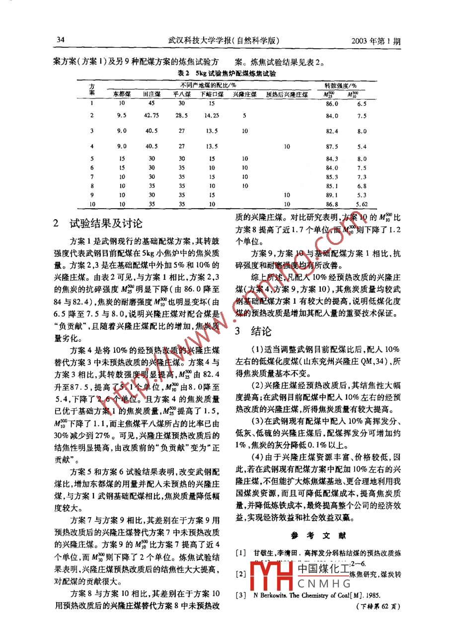 第26卷第】期武漢科技大學(xué)學(xué)報(bào)(自然科學(xué)版)Vol 26. No, I2003年3月J. of Wuhan Uni. of Sci. Tech. Natural Science Edition)Mar.2003增加配煤中低煤化度煤配比的研究周盡暉,周學(xué)鷹2,劉智平2,謝淑平2,周菊武,虞繼舜(1武漢科技大學(xué);湖北武漢,430081;2.武漢鋼鐵(集團(tuán))公司湖北武漢,430083)摘要:通過試驗(yàn)優(yōu)化煤種配比與工藝方法,實(shí)現(xiàn)武漢鋼鐵(集團(tuán))公司現(xiàn)有配煤中增加10%以上的低煤化度煤,焦炭灰分降低01%以上,渫氣產(chǎn)率提高約1%,提高化學(xué)產(chǎn)品的收率與產(chǎn)量,降低煉焦和煉鐵的成本。關(guān)鍵詞:配煤;低煤化度煤;配比中圖分類號(hào):TE622.1文獻(xiàn)標(biāo)識(shí)碼:A文章編號(hào):1672-3090(2003)01-0033-03我國(guó)低煤化度煤(弱粘煤、1/2中粘煤、年輕國(guó)內(nèi)外的研究工作2表明通過對(duì)低煤化度煤氣煤等)資源豐富。由于低煤化度煤粘結(jié)性較快速加熱,實(shí)現(xiàn)其快速預(yù)熱解脫除主要含氧官能差,因此目前我國(guó)使用低煤化度煤的焦化廠較少,團(tuán)后,提高其粘結(jié)性與供氫能力,并且使經(jīng)預(yù)熱改僅包鋼、首鋼、寶鋼等鋼鐵廠的少數(shù)焦化廠使用少質(zhì)的低煤化度煤的焦炭的平均孔徑縮小,最大壁量低煤化度煤。而低煤化度煤普遍易洗、低硫、煤厚增加,各向異性提高,從而顯著提高改質(zhì)煤的結(jié)氣產(chǎn)率髙,如能在煉焦配煤中增加低煤化度煤的焦性。煤的低溫?zé)崽幚?雖未引起煤分子發(fā)生實(shí)用量,可以降低焦炭灰分、硫分,提高化學(xué)產(chǎn)品產(chǎn)質(zhì)性的變化,但對(duì)煤分子結(jié)構(gòu)所引起的一定的改率。從全國(guó)煉焦用煤資源的合理利用和發(fā)展趨勢(shì)性作用和對(duì)其后序熱解行為的影響是不能低估看,增加煉焦配煤中低煤化度煤的配比勢(shì)在必行,的3。這為武鋼配煤中增加經(jīng)預(yù)熱改質(zhì)的低煤而且有潛在的社會(huì)效益與經(jīng)濟(jì)效益。鑒于武鋼煉化度煤的配人量的試驗(yàn)提供了可靠的理論依據(jù)和焦配煤未使用低煤化度煤,本研充擬通過優(yōu)化煤工藝方法種配比與工藝方法,實(shí)現(xiàn)武鋼現(xiàn)有配煤中增加用武鋼配煤方案,通過調(diào)整用煤配比,在10%以上的低煤化度煤。5kg試驗(yàn)焦?fàn)t上煉焦,通過與原配煤方案進(jìn)行比1試驗(yàn)部分較選出最佳方案,以達(dá)到多使用低煤化度煤的目的1.1試驗(yàn)方案的確定12試驗(yàn)用煤的煤質(zhì)分析通過調(diào)研,確定武鋼低煤化度煤的用煤基地;各單種煤及部分配煤的煤質(zhì)指標(biāo)見表1。由利用實(shí)驗(yàn)室固體熱載體的小型簡(jiǎn)易裝置,在約表1可見,東都煤揮發(fā)分很高粘結(jié)指數(shù)很高,屬200℃溫度下,對(duì)低煤化度煤進(jìn)行預(yù)熱改質(zhì)處理。氣肥煤;田莊煤屬1/3焦煤;平八煤屬焦煤;下峪表】各單種煤及部分配煤的煤質(zhì)指標(biāo)Y/mm X/mm東都煤2.367.1237.9441.833352QF,461,819.5726.7930.18171/3J81, 35平八煤1.8310.4922.8826,041下峪口煤1.359.5614.3616.10537sM,13隆莊煤36.609預(yù)熱后興隆莊煤2基礎(chǔ)配煤2469162492815153182幸0%+即肆綠娠+興隆莊煤51.689.1025.9728.57+興隆莊煤10%1,719.0426.2729.0014口煤屬瘦煤;興隆莊煤煤化度較低,屬氣煤,其灰分較低。經(jīng)200預(yù)熱后,揮發(fā)分有所下降粘結(jié)指數(shù)也略有降低。作為基礎(chǔ)配煤,其揮發(fā)分偏高,.YH中國(guó)煤化工CNMHG鋼現(xiàn)行的配煤方收稿日期:2002-09-23作者簡(jiǎn)介:周盡暉(1969),女武漢科技大學(xué)化工與資源環(huán)境學(xué)院,工程武漢科技大學(xué)學(xué)報(bào)(自然科學(xué)版)2003年第1期案方案(方案1)及另9種配煤方案的煉焦試驗(yàn)方案。煉焦試驗(yàn)結(jié)果見表2。表25kg試驗(yàn)焦?fàn)t配煤煉焦試驗(yàn)轉(zhuǎn)鼓強(qiáng)度/%7.513.540.513.51584.3567855000000505720355305383102試驗(yàn)結(jié)果及討論質(zhì)的興隆莊煤。對(duì)比研究表明,方案10的M比方案8提高了近17個(gè)單位,而M0則下降了12方案1是武鋼現(xiàn)行的基礎(chǔ)配煤方案,其轉(zhuǎn)鼓個(gè)單位。強(qiáng)度代表武鋼目前配煤在5kg小焦?fàn)t中的焦炭質(zhì)方案9,方案10與基礎(chǔ)配煤方案1相比,抗量。方案2,3是在基礎(chǔ)配煤中外加5%和10%的碎強(qiáng)度和耐磨強(qiáng)度均有所改善。興隆莊煤。由表2可見,與方案1相比,方案2,3綜上所述,凡配入10%經(jīng)預(yù)熱改質(zhì)的興隆莊的焦炭的抗碎強(qiáng)度M明顯下降(由86.0降至煤(方案4,方案9,方案10),其焦炭質(zhì)量均較武84與82.4),焦炭的耐磨強(qiáng)度M∞也明顯變壞(由鋼基礎(chǔ)配煤方案1有較大的提高,說明低煤化度6.5降至7.5與8.0,說明興隆莊煤對(duì)配合煤是煤的預(yù)熱改質(zhì)是增加其配人量的重要技術(shù)保證。負(fù)貢獻(xiàn)”,且隨著興隆莊煤配比的增加焦炭質(zhì)3結(jié)論量劣化。方案4是將10%的經(jīng)預(yù)熱改質(zhì)的興隆莊煤(1)適當(dāng)調(diào)整武鋼目前配煤比后,配入10%替代方案3中未預(yù)熱改質(zhì)的興隆莊煤。方案4與左右的低煤化度煤(山東兗州興隆莊QM,34),所方案3相比,其轉(zhuǎn)鼓強(qiáng)度明顯提高,M由82.4得焦炭質(zhì)量基本不變。升至87.5,提高了5.1個(gè)單位,M0由8.0降至(2)興隆莊煤經(jīng)預(yù)熱改質(zhì)后,其結(jié)焦性大幅54,下降了26個(gè)單位。且方案4的焦炭質(zhì)量度提高;在武鋼