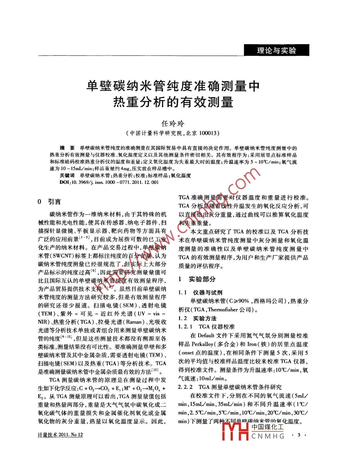 理論與實(shí)驗(yàn)單壁碳納米管純度準(zhǔn)確測量中熱重分析的有效測量任玲玲(中國計(jì)量科學(xué)研究院,北京100013)摘要單壁碳納米管純度的準(zhǔn)確測量在其國際貿(mào)易中具有直接的決定作用。單壁碳納米管純度測量中的熱重分析有效測量與儀器校準(zhǔn)、氧化溫度定義以及其他測量條件密切相關(guān)。其有效程序?yàn)?采用居里點(diǎn)標(biāo)準(zhǔn)樣品和標(biāo)準(zhǔn)砝碼校準(zhǔn)熱重分析儀的溫度和重量;定義氧化溫度為失重最大時(shí)的溫度;升溫速率為5~10℃/min;氧氣流速為10-15mL/min;樣品重量約4mg,壓實(shí)放在樣品槽中。關(guān)鍵詞單壁碳納米管;熱重分析;校準(zhǔn);標(biāo)準(zhǔn)樣品;氧化溫度DOI:10.3969/issn.1000-0771.201.12.0010引言TGA準(zhǔn)確測量需要對儀器溫度和重量進(jìn)行校準(zhǔn)。TGA分析是隨著線性升溫發(fā)生的氧化反應(yīng)分析,可碳納米管作為一維納米材料,由于其特殊的機(jī)以直接給出灰分重量,通過曲線可以推算氧化溫度械性能和光電性能,使其在傳感器、納電子器件、掃和失重重量。描探針顯微鏡、平板顯示器、靶向藥物等方面具有本文重點(diǎn)研究了TGA的校準(zhǔn)以及TGA分析技廣泛的應(yīng)用前景1-3,日前成為屈指可數(shù)的已工業(yè)術(shù)在單壁碳納米管純度測量中灰分測量和氧化溫化生產(chǎn)的納米材料。在產(chǎn)品交易過程中,單壁碳納度測量的準(zhǔn)確性以及單壁碳納米管純度測量中米管(SWc)標(biāo)簽上都標(biāo)注純度的百分含量,認(rèn)為TGA的有效測量程序,為用戶和生產(chǎn)廠家提供產(chǎn)品碳納米管純度測量已經(jīng)很規(guī)范了但實(shí)際上大部分質(zhì)量的評估程序。產(chǎn)品標(biāo)示的純度過高6,因此需要研究測量量值可比且國際互認(rèn)的單壁碳納米管純度有效測量程序,1實(shí)驗(yàn)部分為產(chǎn)品貿(mào)易提供技術(shù)支持8。雖然目前單壁碳納1.1儀器與試劑米管純度的測量方法研究較多,但是有效測量程序的研究還很少報(bào)道。掃描電鏡(SEM)、透射電鏡單壁碳納米管(C≥90%,西格瑪公司),熱重分(TEM)、紫外-可見-近紅外光譜(UV-vis析儀(TGA, Thermofisher公司)。NIR)、熱重分析(TGA)、拉曼光譜( Raman)、光吸收實(shí)驗(yàn)方法光譜等分析技術(shù)單獨(dú)或者組合用來測量單壁碳納米2.1TGA儀器校準(zhǔn)管的純度92,但是這些測量技術(shù)都沒有溯源至各在 Default文件下采用氮?dú)鈿夥辗謩e測量校準(zhǔn)類標(biāo)準(zhǔn),測量結(jié)果沒有可比性。要準(zhǔn)確測量單壁和多樣品 Perkalloy(多合金)和Ion(鐵)的居里點(diǎn)溫度壁碳納米管及其中金屬雜質(zhì),需要透射電鏡(TEM)( onset點(diǎn)的溫度),在相同條件下測量5次,采用5掃描電鏡(SEM)以及熱重(TCA)等分析技術(shù)。TCA次的平均值與校準(zhǔn)樣品溫度比較來校準(zhǔn)TGA儀器,是準(zhǔn)確測量碳納米管中金屬雜質(zhì)最有效的方法1。得到校準(zhǔn)文件。測量條件為升溫速率:10℃/min,氧TGA測量碳納米管的原理是在測量過程中發(fā)氣流速:10mL/mn生如下化學(xué)反應(yīng)C+O2→CO2+E1M+O2→MO+2.2.2TGA測量單壁碳納米管條件研究E2。從TGA測量原理可以看出,TGA測量量值包括在校準(zhǔn)文件下,分別在不同的氧氣流速(5mL重量和熱量兩部分,重量是大氣氣氛中碳氧化成二min,15m/min,35mL/min)和不同升溫速率(1℃/氧化碳?xì)怏w的重量損失和金屬催化劑氧化成金屬min,25℃/min,5℃/min,10℃/min,20℃/min,30℃/氧化物的灰分重量,熱量以氧化溫度顯示。因此,min)下測量了兩種不同單辟磁納來管的鱺化溫度。中國煤化工計(jì)量技術(shù)2011No12CNMHG理論與實(shí)驗(yàn)2結(jié)果與討論表1居里點(diǎn)校準(zhǔn)樣品的TGA測量結(jié)果測量次數(shù)多合金居里點(diǎn)鐵居里點(diǎn)2.1TGA分析測量值℃測量值℃圖1是單壁碳納米管的熱重曲線。通過圖1熱6006790.13重曲線可以確定樣品的氧化溫度。氧化溫度有兩602.1789.50種確定方法,一種是最大失重率時(shí)的溫度T(dw601.36785.64dT);另一種是開始失重時(shí)的溫度Tm。從圖3中可以看出,Tm比T有更多的主觀性,引入的誤300.84800.99差較大。在碳納米管TGA測量過程中采用T表示平均值T(℃)601.7493.03氧化溫度。標(biāo)準(zhǔn)偏差s(℃)1.256.584519℃居里點(diǎn)參考值(℃)469.1誤差(℃)5.7413.03從表1可以看出,校準(zhǔn)樣品測量結(jié)果比廠家給04出的量值偏高,但在600℃的標(biāo)準(zhǔn)偏差只有1.25℃,說明在此溫度范圍測量重復(fù)性較好。在800℃在右標(biāo)準(zhǔn)偏差6.58℃,相對較大。 SWCNT的氧化溫度100200300400500600在500℃左右,所以采用TGA測量的標(biāo)準(zhǔn)偏差較小,比較適用。圖1 SWCNT的TGA曲線2.3燃燒影響2.2TGA校準(zhǔn)在TGA測量 SWCNT過程中,經(jīng)常會出現(xiàn)一些為了使測量結(jié)果準(zhǔn)確可靠,必須對儀器進(jìn)行校特殊情況,如圖2所示,圖中(a)的時(shí)間曲線上出現(xiàn)準(zhǔn)。TGA溫度采用標(biāo)準(zhǔn)樣品進(jìn)行校準(zhǔn),表1是采用個(gè)尖刺,這在升溫速率10~20℃/min情況下都會居里點(diǎn)標(biāo)準(zhǔn)樣品校準(zhǔn)TGA溫度的結(jié)果。由于校準(zhǔn)出現(xiàn)。圖中(b)在氧化后期,曲線向后折回,然后繼樣品 Perkalloy和Iron的居里點(diǎn)溫度量值中沒有給續(xù)向前。這些都是樣品燃燒的信號,可以解釋為樣出不確定度,因此,采用參考樣品校準(zhǔn)儀器后,在校品開始燃燒,迅速釋放