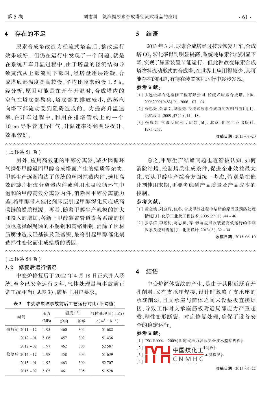 第53卷第5期化肥設(shè)計(jì)Oct.2015015年10月Chemical Fertilizer design甲醇合成結(jié)蠟的原因及對(duì)策宋志遠(yuǎn)(新鄉(xiāng)中新化工有限責(zé)任公司,河南新鄉(xiāng)453800)摘要:在甲醇合成催化劑使用后期,常有高烷烴混合物及石蠟生成,結(jié)蠟嚴(yán)重時(shí)會(huì)引起甲醇分離器堵塞,甚至?xí)?dǎo)致被迫停車(chē)清蠟。針對(duì)這一問(wèn)題,介紹了石蠟的性質(zhì)、產(chǎn)生條件和除蠟的方法,闡述了石蠟產(chǎn)生的主要原因,并從催化劑的選擇、合成塔的選用、甲醇合成條件的控制、工藝操作的控制等方面論述了所采取的措施,對(duì)甲醇的生產(chǎn)操作實(shí)踐具有指導(dǎo)意義關(guān)鍵詞:甲醇;合成;結(jié)蠟;對(duì)策doi:10.3969/.issn.1004-8901.2015.05.015中圖分類(lèi)號(hào):TQ23.121文獻(xiàn)標(biāo)識(shí)碼文章編號(hào):1004-8901(2015)05-0049-03Causes Analysis and Countermeasures of Methanol Synthesis ParaffinningSONG Zhi-yuan(Xinciang Zhongxin Chemical Industry Limited Liability Company, Xinxiang Henan 453800 ChinaAbstract: In late stage of methanol synthesis catalyst, it always generates high paraffin mixture and paraffin. It can lead to methanol separator blockageeven shut-down for paraffin removal. Regarding this question, this paper introduces the nature, generation conditions and reasons of paraffAt the same time, it also puts forward measures in terms of selection of catalyst and synthdumn control of methanolesIs con-dition and process operation, which provides some guidances for methanol productionKeywords: methanol; synthesis; paraffinning: countermeasurdoi:10.3969/j.isn.1004-8901.2015.05.015銅基催化劑的應(yīng)用,使低壓法合成甲醇發(fā)展1.2石蠟產(chǎn)生的條件較快,但在甲醇合成的生產(chǎn)中,特別是催化劑使用在銅基催化劑的作用下,理論上在下述情況末期,常有高烷烴混合物及石蠟的生成,結(jié)蠟嚴(yán)重下,CO與H2會(huì)生成脂肪族烴類(lèi)時(shí)會(huì)引起甲醇水冷器、甲醇分離器堵塞,給精餾工(1)系統(tǒng)中有鐵、鈷、鎳等元素存在時(shí),將有如段的分離提純帶來(lái)更多壓力,嚴(yán)重時(shí)被迫停車(chē)清下反應(yīng)蠟。因此,研究石蠟的性質(zhì)、產(chǎn)生的原因、如何消Co+3HCH+ho除石蠟及避免結(jié)蠟就是甲醇生產(chǎn)人員的一項(xiàng)重要2CH4→C2H6+H2的課題。2C2H6—→C4H10+H21石蠟的性質(zhì)及產(chǎn)生的條件(2)系統(tǒng)中有鈷、氧化釷、鋁存在,在0.011.0MPa壓力下有下列反應(yīng):1.1石蠟的性質(zhì)CO+2H2-CH,+H,O+164.85 kJ/ mol石蠟是由C、H兩種元素為主要成分的物質(zhì)混中國(guó)煤化工咸金屬時(shí),在0.01合而成碳原子數(shù)約為18-30的烴類(lèi)混合物,主要404THCNMHG度下,有下列反應(yīng)組分為直鏈烷烴(約為80%~95%),還有少量帶個(gè)2C0+HCh,+co, +204. 6 kJ/mol別支鏈的烷烴和帶長(zhǎng)側(cè)鏈的單環(huán)環(huán)烷烴(兩者合計(jì)含量在20%以下)。分子式CnH2n+2,密度為0.78~作者簡(jiǎn)介:宋志遠(yuǎn)(1975年-),男,內(nèi)蒙古滿州里人,2000年畢業(yè)于內(nèi)蒙古大學(xué)環(huán)境學(xué)專(zhuān)業(yè),現(xiàn)主要從事化工工藝、安全環(huán)保及工藝管0.82,工業(yè)熔點(diǎn)100℃,沸點(diǎn)300~500℃。理研究等工作化肥設(shè)計(jì)2015年第53卷(4)原料氣中有水蒸氣時(shí),在含有鐵的催化劑帶有大量石蠟的粗甲醇,這種情況一般出現(xiàn)在開(kāi)車(chē)上CO還會(huì)發(fā)生如下反應(yīng):投料階段及停車(chē)過(guò)程中合成塔的降溫階段,新鮮氣Co+h0氫碳比失調(diào),氣質(zhì)差。這兩個(gè)階段產(chǎn)生石蠟最多。2石蠟產(chǎn)生的危害另外,反應(yīng)溫度過(guò)高,如超過(guò)270℃,易生成蠟質(zhì),當(dāng)反應(yīng)溫度超過(guò)300℃時(shí),伴有甲烷化反應(yīng)發(fā)生,同時(shí)蠟主要是甲醇合成過(guò)程中生成的副產(chǎn)物,甲醇加劇蠟質(zhì)的生成。合成過(guò)程中,在較低的反應(yīng)溫度下,銅基催化劑床2.2.2對(duì)合成反應(yīng)壓力的影響層中含有極少量鐵、鈷、鎳等元素時(shí),則可能促成石甲醇合成反應(yīng)是體積減小的反應(yīng),從化學(xué)平衡蠟的產(chǎn)生。石蠟產(chǎn)生的原因比較復(fù)雜,不但與催化角度考慮,提高壓力有利于提高平衡甲醇含量,并劑、原料氣、合成塔的結(jié)構(gòu)及材質(zhì)有關(guān),而且還與合能加快反應(yīng)速度,增加裝置生產(chǎn)能力。但提高壓力成反應(yīng)的操作方法及工藝條件有關(guān)。有利于副反應(yīng)的進(jìn)行,壓力越高會(huì)使合成反應(yīng)向生2.1對(duì)催化劑的影響成高級(jí)烷烴的方向移動(dòng),結(jié)蠟的機(jī)率也越大。2.1.1對(duì)催化劑生產(chǎn)過(guò)程中的影響2.2.3對(duì)空速的影響催化劑生產(chǎn)過(guò)程中所使用的設(shè)備管道大多是甲醇合成過(guò)程中,合成氣與催化劑接觸時(shí)間的由碳鋼制成的,設(shè)備管道如果吹掃不徹底,在催化控制,是通過(guò)調(diào)節(jié)合成循環(huán)氣的空速來(lái)實(shí)現(xiàn)的??談┡c其接觸時(shí)可能會(huì)帶人微量的鐵、鎳;對(duì)沉淀物速是指單位時(shí)間內(nèi)通過(guò)單位體積的催化劑的流體進(jìn)行洗滌時(shí),也可能將鈉鹽帶入到催化劑中,鐵、體積量??账俅?合成原料氣與催化劑接觸時(shí)間鎳、鈉等堿性金屬是生成蠟的催化劑。在新催化劑短,將使岀口氣體中醇凈值降低,催化劑床層中的貯運(yùn)、充裝過(guò)程中,鐵制容器上的