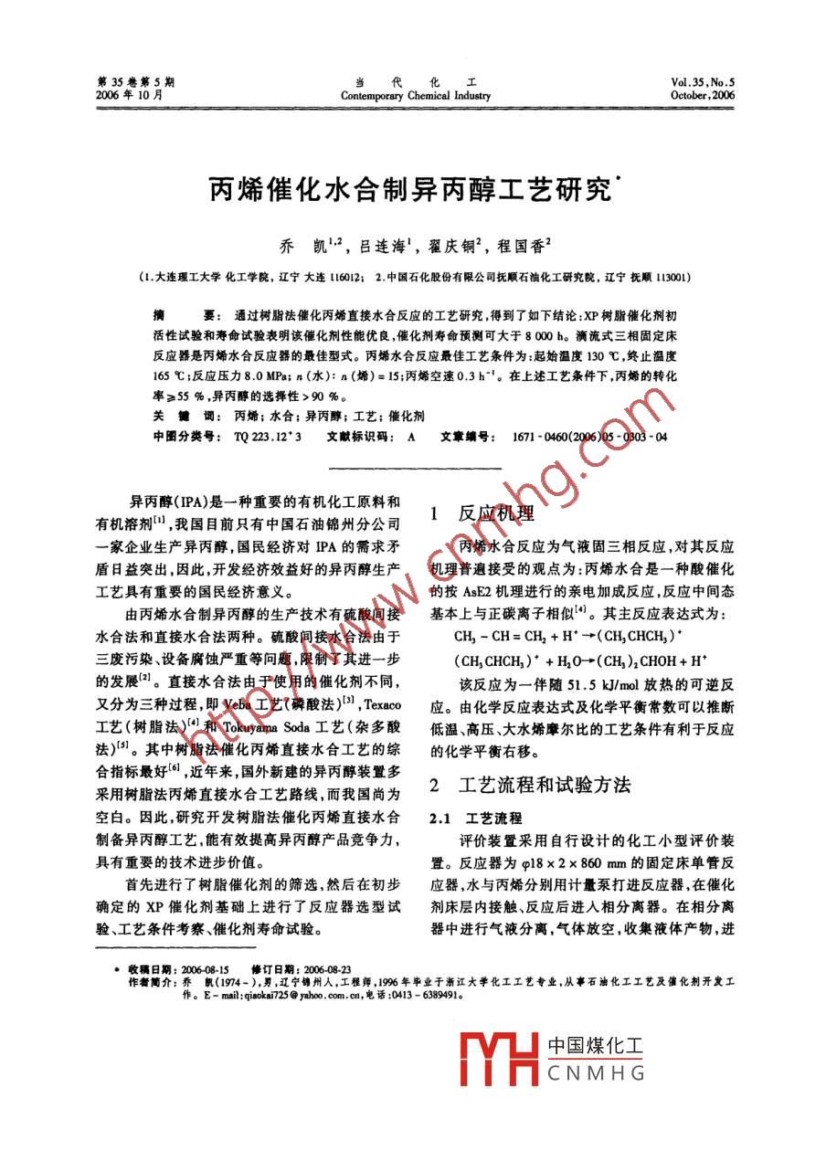 第35卷第5期當(dāng)代化工ol.35,2006年10月Contemporary Chemical IndustryOctober, 2006丙烯催化水合制異丙醇工藝研究喬凱2,呂連海,翟慶銅2,程國(guó)香2(1大連理工大學(xué)化工學(xué)院,遼寧大連116012;2.中國(guó)石化股份有限公司撫順石油化工研究院,遼寧撫順113001)摘要:通過樹脂法催化丙烯直接水合反應(yīng)的工藝研究,得到了如下結(jié)論:XP樹脂催化劑初活性試驗(yàn)和壽命試驗(yàn)表明該催化劑性能優(yōu)良,催化劑壽命預(yù)測(cè)可大于800h。滴流式三相固定床反應(yīng)器是丙烯水合反應(yīng)器的最佳型式。丙烯水合反應(yīng)最佳工藝條件為:起始溫度130℃終止溫度165℃;反應(yīng)壓力80MPa;n(水):n(烯)=15;丙烯空速03h。在上述工藝條件下,丙烯的轉(zhuǎn)化率≥55%,異丙醇的選擇性>9%關(guān)鍵詞:丙烯;水合;異丙醇;工藝;催化劑中圖分類號(hào):TQ223.12·3文獻(xiàn)標(biāo)識(shí)碼:A文章編號(hào):16710460(2006)050903-04異丙醇(PA)是一種重要的有機(jī)化工原料和有機(jī)溶劑,我國(guó)目前只有中國(guó)石油錦州分公司1反應(yīng)機(jī)理一家企業(yè)生產(chǎn)異丙醇,國(guó)民經(jīng)濟(jì)對(duì)PA的需求矛丙烯水合反應(yīng)為氣液固三相反應(yīng),對(duì)其反應(yīng)盾日益突出,因此,開發(fā)經(jīng)濟(jì)效益好的異丙醇生產(chǎn)機(jī)理普遍接受的觀點(diǎn)為:丙烯水合是一種酸催化工藝具有重要的國(guó)民經(jīng)濟(jì)意義。的按AsE2機(jī)理進(jìn)行的親電加成反應(yīng),反應(yīng)中間態(tài)由丙烯水合制異丙醇的生產(chǎn)技術(shù)有硫酸間接基本上與正碳離子相似“。其主反應(yīng)表達(dá)式為:水合法和直接水合法兩種。硫酸間接水合法由于CH,-CH= CH,+H'-(CH, CHCH,)三廢污染、設(shè)備腐蝕嚴(yán)重等問題,限制了其進(jìn)一步(CH, CHCH,)*+H,0-(CH,2 CHOH +H的發(fā)展口。直接水合法由于使用的催化劑不同,該反應(yīng)為一伴隨51.5k/ml放熱的可逆反又分為三種過程即Veha工藝(磷酸法)), Texaco應(yīng)。由化學(xué)反應(yīng)表達(dá)式及化學(xué)平衡常數(shù)可以推斷工藝(樹脂法)和 Tokuyama Soda工藝(雜多酸低溫高壓、大水烯摩爾比的工藝條件有利于反應(yīng)法)。其中樹脂法催化丙烯直接水合工藝的綜的化學(xué)平衡右移。合指標(biāo)最好,近年來,國(guó)外新建的異丙醇裝置多采用樹脂法丙烯直接水合工藝路線而我國(guó)尚為2工藝流程和試驗(yàn)方法空白。因此,研究開發(fā)樹脂法催化丙烯直接水合2.1工藝流程制備異丙醇工藝,能有效提高異丙醇產(chǎn)品競(jìng)爭(zhēng)力評(píng)價(jià)裝置采用自行設(shè)計(jì)的化工小型評(píng)價(jià)裝具有重要的技術(shù)進(jìn)步價(jià)值。置。反應(yīng)器為ql8×2×860mm的固定床單管反首先進(jìn)行了樹脂催化劑的篩選,然后在初步應(yīng)器,水與丙烯分別用計(jì)量泵打進(jìn)反應(yīng)器,在催化確定的XP催化劑基礎(chǔ)上進(jìn)行了反應(yīng)器選型試劑床層內(nèi)接觸、反應(yīng)后進(jìn)入相分離器。在相分離驗(yàn)、工藝條件考察、催化劑壽命試驗(yàn)。器中進(jìn)行氣液分離,氣體放空,收集液體產(chǎn)物,進(jìn)收稿日期:200608-15修訂日期:20060823作者簡(jiǎn)介:喬凱(1974-),男,遼寧錦州人,工程師,1996年畢業(yè)于浙江大學(xué)化工工藝專業(yè),從事石油化工工藝及催化劑開發(fā)工作。E-mail:qiaokai725@yhoo.com,cn,電話:0413-6389491。中國(guó)煤化工CNMHG當(dāng)代化工第35卷第5期行色譜分析,測(cè)定其醇含量?;ば⌒驮u(píng)價(jià)裝置表1各種樹脂催化劑的初活性評(píng)價(jià)結(jié)果流程示意圖如圖1所示。Table I The initial activity of catalysts催化劑種類交換當(dāng)量/(mlL1)丙烯轉(zhuǎn)化率,%XP-10XP--l1.53K24l1表1中FP及K2411均為國(guó)外商品催化劑,在水溶液同類催化劑中其活性和穩(wěn)定性都是比較好的;XP系列催化劑為自行開發(fā)的催化劑??梢钥闯?XP催化劑的初活性更好。因此,以XP催化劑為基圖1小型評(píng)價(jià)裝置流程圖礎(chǔ)進(jìn)行丙烯水合工藝試驗(yàn)。Fig. I The now chart of laboratory4水合反應(yīng)器選型實(shí)驗(yàn)22反應(yīng)原料原料氣:分別選用丙烯質(zhì)量分?jǐn)?shù)分別為在氣液固三相反應(yīng)過程中,反應(yīng)器的選擇對(duì)99.27%,95.50%及97.36%的原料氣。于反應(yīng)過程是十分重要的。反應(yīng)器中,丙烯和水原料水:脫離子水,電導(dǎo)率≤5μs/cm的流動(dòng)情況與化學(xué)反應(yīng)密切相關(guān)。對(duì)于滴流床反23分析方法應(yīng)器,當(dāng)丙烯和水向下并流通過催化劑床層時(shí),丙分析采用SP-3420型氣相色譜儀,熱導(dǎo)檢測(cè)烯為連續(xù)相水沿催化劑表面成薄膜狀和滴狀向器,聚合物固定相CDx-103(50~80目)做柱內(nèi)下流動(dòng)流動(dòng)方式接近于活塞流,能克服流體返填充物。用校正的峰面積歸一化法計(jì)算各組分含混;此外,滴流床反應(yīng)器中催化劑外表面上的持液層很薄,故總液膜阻力很小,非常有利于丙烯流體24數(shù)據(jù)處理擴(kuò)散大催化劑表面,因此在反應(yīng)器內(nèi)可以得到比以反應(yīng)單位時(shí)間進(jìn)丙烯和進(jìn)水的質(zhì)量為依較高的轉(zhuǎn)化率。而該條件下鼓泡床反應(yīng)器中液相據(jù),基于液相產(chǎn)物中異丙醇質(zhì)量百分含量,求出丙水為連續(xù)相丙烯以鼓泡的形式沿催化劑床層向烯的摩爾轉(zhuǎn)化率。上移動(dòng