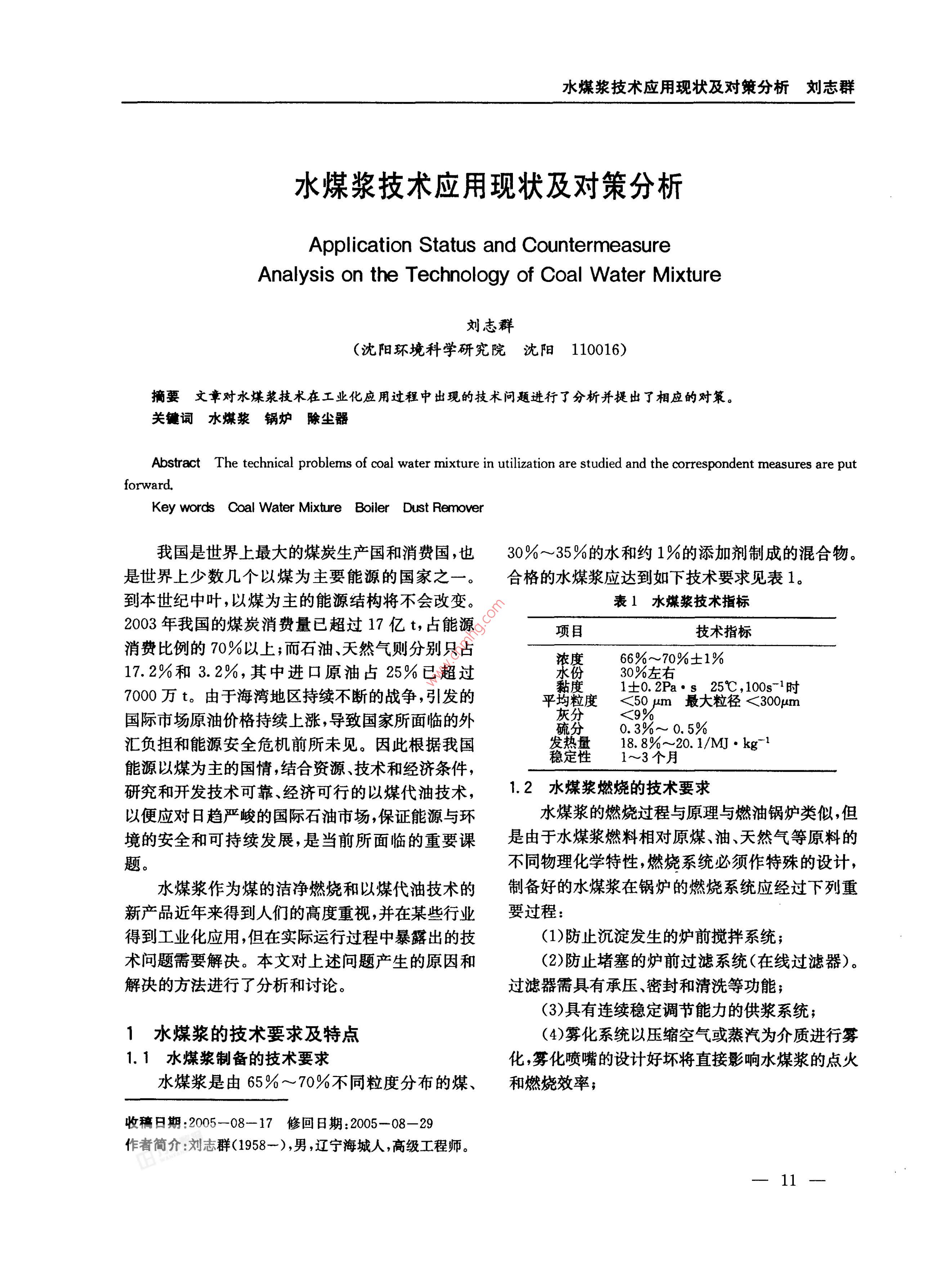 水煤漿技術(shù)應(yīng)用現(xiàn)狀及對(duì)策分析劉志群水煤漿技術(shù)應(yīng)用現(xiàn)狀及對(duì)策分析Application Status and countermeasureAnalysis on the Technology of Coal Water Mixture劉志群(沈陽環(huán)境科學(xué)研究院沈陽110016)摘要文章對(duì)水煤漿技術(shù)在工業(yè)化應(yīng)用過程中出現(xiàn)的技術(shù)問題進(jìn)行了分析并提出了相應(yīng)的對(duì)策。關(guān)鍵詞水煤漿鍋爐除塵器Abstract The technical problems of coal water mixture in utilization are studied and the correspondent measures are putforwardKey words Coal Water Mixture Boiler Dust Remover我國(guó)是世界上最大的煤炭生產(chǎn)國(guó)和消費(fèi)國(guó),也30%~35%的水和約1%的添加劑制成的混合物是世界上少數(shù)幾個(gè)以煤為主要能源的國(guó)家之一。合格的水煤漿應(yīng)達(dá)到如下技術(shù)要求見表1。到本世紀(jì)中葉,以煤為主的能源結(jié)構(gòu)將不會(huì)改變。表1水煤漿技術(shù)指標(biāo)2003年我國(guó)的煤炭消費(fèi)量已超過17億t,占能源項(xiàng)目技術(shù)指標(biāo)消費(fèi)比例的70%以上;而石油、天然氣則分別只占濃度66%~70%±1%172%和3.2%,其中進(jìn)口原油占25%已超過份30%左右7000萬t。由于海灣地區(qū)持續(xù)不斷的戰(zhàn)爭(zhēng),引發(fā)的黏度1士0.2Pa·s25℃,100s1時(shí)9yAm最大粒徑<300m平均粒度<50國(guó)際市場(chǎng)原油價(jià)格持續(xù)上漲,導(dǎo)致國(guó)家所面臨的外灰分硫分0.3‰~0.5%匯負(fù)擔(dān)和能源安全危機(jī)前所未見。因此根據(jù)我國(guó)發(fā)熱量18.8%~20.1/M·kg1能源以煤為主的國(guó)情,結(jié)合資源、技術(shù)和經(jīng)濟(jì)條件,穩(wěn)定性1~3個(gè)月研究和開發(fā)技術(shù)可靠經(jīng)濟(jì)可行的以煤代油技術(shù),12水煤漿燃燒的技術(shù)要求以便應(yīng)對(duì)日趨嚴(yán)峻的國(guó)際石油市場(chǎng),保證能源與環(huán)水煤漿的燃燒過程與原理與燃油鍋爐類似,但境的安全和可持續(xù)發(fā)展,是當(dāng)前所面臨的重要課是由于水煤漿燃料相對(duì)原煤、油、天然氣等原料的題不同物理化學(xué)特性,燃燒系統(tǒng)必須作特殊的設(shè)計(jì),水煤漿作為煤的潔凈燃燒和以煤代油技術(shù)的制備好的水煤漿在鍋爐的燃燒系統(tǒng)應(yīng)經(jīng)過下列重新產(chǎn)品近年來得到人們的高度重視,并在某些行業(yè)要過程:得到工業(yè)化應(yīng)用,但在實(shí)際運(yùn)行過程中暴露出的技(1)防止沉淀發(fā)生的爐前攪拌系統(tǒng);術(shù)問題需要解決。本文對(duì)上述問題產(chǎn)生的原因和2)防止堵塞的爐前過濾系統(tǒng)(在線過濾器)。解決的方法進(jìn)行了分析和討論。過濾器需具有承壓、密封和清洗等功能;(3)具有連續(xù)穩(wěn)定調(diào)節(jié)能力的供漿系統(tǒng)1水煤漿的技術(shù)要求及特點(diǎn)(4)霧化系統(tǒng)以壓縮空氣或蒸汽為介質(zhì)進(jìn)行霧1.1水煤漿制備的技術(shù)要求化,霧化噴嘴的設(shè)計(jì)好壞將直接影響水煤漿的點(diǎn)火水煤漿是由65%~70%不同粒度分布的煤、和燃燒效率;收稿日期:2005-08-17修回日期:2005-08-2作者簡(jiǎn)介:劉志群(1958-),男,遼寧海城人,高級(jí)工程師。環(huán)境保護(hù)科學(xué)第32卷第5期206年10月(5)爐內(nèi)布置應(yīng)滿足水煤漿的特殊燃燒性能;2.2中小型鍋爐燃燒水煤漿技術(shù)尚需完善(6)燃燒器需滿足含水30%條件下的完全燃隨著鍋爐污染物排放標(biāo)準(zhǔn)的提高,多數(shù)城市提燒。因此燃燒器的設(shè)計(jì)將直接影響水煤漿的點(diǎn)火出:市內(nèi)的中小型燃煤鍋爐禁燒原煤,改用燃油和和燃燒效率天然氣,而高昂的燃料代價(jià)使企業(yè)和用戶難以承(7)燃燒后的除灰排渣和除塵系統(tǒng)都須按照受。水煤漿以其價(jià)格便宜可以密閉運(yùn)輸和清潔高水煤漿特性作相應(yīng)的設(shè)計(jì)效的特點(diǎn),受到城市的關(guān)注。目前國(guó)內(nèi)在用的中小1.3水煤漿的技術(shù)特點(diǎn)型水煤漿鍋爐約有150臺(tái)左右出力為1t/h、2t/h水煤漿具有良好的流動(dòng)性和穩(wěn)定性可以像石4t/h、6/h、10/h至20t/h不等。上述鍋爐中,有油產(chǎn)品一樣儲(chǔ)存、運(yùn)輸,并且具有不易燃、不污染的相當(dāng)數(shù)量是燃油改燒水煤漿;部分是直接設(shè)計(jì)的水優(yōu)良特性是目前比較經(jīng)濟(jì)和實(shí)用的清潔煤代油燃煤漿鍋爐。在運(yùn)行中主要存在如下問題料。由于水煤漿是由洗精煤制備,其灰分硫分較2.2.1小型燃油鍋爐改燒水煤漿后出力下降低,在燃燒過程中,水分的存在可降低燃燒火焰中由于小型鍋爐的爐膛容積較小,難以達(dá)到水煤漿完心溫度、抑制氮氧化物的產(chǎn)生。此外水煤漿可采用全燃燒所需要的空間要求。由此導(dǎo)致煤基燃料在管道、罐車輸送,在運(yùn)輸和儲(chǔ)存過程中沒有污染。燃燒室的停留時(shí)間短,燃燒效率達(dá)不到設(shè)計(jì)要求,水煤漿的主要優(yōu)點(diǎn)在于:使鍋爐的出力下降20%~50%。上述問題在4t/h(1)燃燒效率高。水煤漿黏度低于重油使燃以下燃油鍋爐改燒水煤漿后普遍存在。燒負(fù)荷易于調(diào)節(jié)調(diào)節(jié)范圍可達(dá)40%燃燼率可2.2.2與大型水煤漿鍋爐相比,小型水煤漿鍋爐達(dá)到98%;燃燒效率可達(dá)到96%~99%;鍋爐效率容易結(jié)焦水煤漿是通過高壓噴槍高速進(jìn)入燃在88%以上,達(dá)到燃油同等水平,燃燒