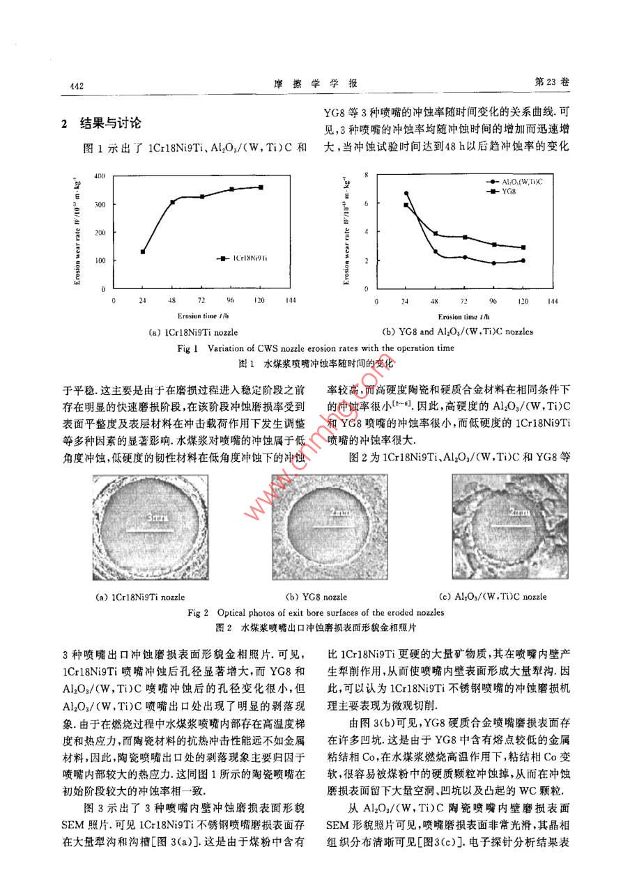 第23卷第5期摩擦學學報Vol 23, No 52003年9月TRIBOLOGYSep,2003水煤漿噴嘴熱沖蝕磨損機理研究丁澤良2,李劍峰1,鄧建新,艾興,張德威2(1.山東大學機被工程學院,山東濟南250061;2.株洲冼煤廠,湖南株洲412005)摘要:采用1Cr18NiTi不銹鋼、YG8硬質(zhì)合金和Al2O3/(W,Ti)C陶瓷3種材料制備了水煤漿噴嘴,考察了其在水煤漿霧化和燃燒過程中的熱沖蝕磨損機理結(jié)果表明:噴嘴材料的硬度對水煤漿噴嘴的熱沖蝕磨損行為具有重要影響在相同條件下,高硬度的A12O3/(W,TC陶瓷噴嘴的沖蝕率最低YG8硬質(zhì)合金次之,硬度較低的1cr18NTi不銹鋼噴嘴的沖蝕率最高;在熱沖蝕磨損工況下,Cr18Ni9Ti不銹鋼水煤漿噴嘴主要呈現(xiàn)微切削特征,YG8硬質(zhì)合金水煤漿噴嘴主要呈現(xiàn)晶粒剝落特征,而A2O3(W,Ti)C陶瓷水煤漿噴嘴主要呈現(xiàn)研磨損傷和熱崩特征,關(guān)鍵詞:水煤漿;噴嘴;沖蝕磨損中圖分類號:THl17.3文獻標識碼:A文章編號:104-0595(2003)05-044104水煤漿作為1種新型煤基代油液體燃料已廣泛2.52g/cm3,平均粒徑1m)和(W,T)C固溶體(株應用于我國電力、冶金和建材等行業(yè)的鍋爐和窯爐.洲硬質(zhì)合金廠提供,平均粒徑1.5m)按一定配比進噴嘴是水煤漿燃燒器的關(guān)鍵部件之一,在水煤漿的霧行混合強化球磨(球磨后粉末平均粒徑<0.8μm);化和燃燒過程中噴嘴發(fā)生嚴重熱沖蝕磨損~4,為將混合粉末干燥后在流動氮氣中過篩然后在氮氣氣了探索研制具有優(yōu)良抗熱沖蝕性能的水煤漿噴嘴,本氛中采用熱壓燒結(jié)工藝制備Al4O3/(W,Ti)C陶瓷材文作者分別選用Cr18NiTi不銹鋼、YG8硬質(zhì)合金料;燒結(jié)工藝參數(shù):溫度為1600~1800℃,壓力為和A2O3/(W,Ti)C陶瓷3種材料制作了水煤漿噴32MPa,保溫時間8~20min.同時采用標準YG型嘴,并對其進行了現(xiàn)場磨損試驗,進而分析了其損傷硬質(zhì)合金YG8和國際標準材質(zhì)1Cr8NiTi不銹鋼機理制備水煤漿噴嘴,其性能列于表1.1實驗部分1.2沖蝕磨損試驗在2t/h蒸汽鍋爐(型號為DNS2-1.0-SM)上進1.1噴嘴材料及試樣制備行沖蝕試驗噴嘴內(nèi)孔直徑4.5mm,長15mm.水煤以乙醇作為介質(zhì),將AO3粉末(該粉末密度為漿消耗量200kg/h,供漿壓力0.2MPa,霧化氣壓力表1水煤漿噴嘴材料的組成和性能Table 1sition and mDensity/gcm-1 Flexural strength/MPa Fracture toughness/MPa.m/2 Hardness/GPaI Cr18Ni9Ti75550(tensile strength)HB180~25011~1514.8Al O3/45%(W, Ti)C0.35~0.4MPa,爐膛最高溫度1300℃,水煤漿濃蝕率),以單位質(zhì)量的水煤漿所引起的噴嘴體積流失度65±2%發(fā)熱量為18.81~20.48MJ/kg、粘度為來表征沖蝕率W,W=m:/(d·m2)(其中m1為噴嘴1000~2500mPa,s、粒度40~120-m的沖蝕磨損質(zhì)量損失,d為噴嘴材料的密度,m2為燃采用萬分之一電子天平稱量沖蝕前后噴嘴的沖用水煤漿的質(zhì)量)采用掃描電子顯微鏡(SEM)觀察蝕磨損質(zhì)量損失進而確定沖蝕磨損率(以下簡稱沖分析噴嘴沖蝕磨損表面的形貌基金項目,國家自然科學基金資助項目(50275088)收稿日期:2002125修回日期:20030401/聯(lián)系人鄧建新,e-mail:jxdeng@sdu,edu.cn作者簡介鄧建新,男,1966年生,博士教授博導目前主要從事切削加工及可掌性陶瓷材料摩擦學及陶瓷刀具開發(fā)等研究摩擦學學報第23卷YG8等3種噴嘴的沖蝕率隨時間變化的關(guān)系曲線.可2結(jié)果與討論見,3種噴嘴的沖蝕率均隨沖蝕時間的增加而迅速增圖1示出了1Cr18Ni9Ti、AlO3/(W,TiC和大,當沖蝕試驗時間達到8h以后趨沖蝕率的變化244872120Erusinn time / at(a)1Cr18Ni9Ti nozzle(b)YG8 and Al O,/(W, Ti)C nozzlesFig 1 Variation of CWS nozzle erosion rates with the operation time圖1水煤漿噴嘴沖蝕率隨時間的變化于平穩(wěn).這主要是由于在磨損過程進入穩(wěn)定階段之前率較高,而高硬度陶瓷和硬質(zhì)合金材料在相同條件下存在明顯的快速磨損階段,在該階段沖蝕磨損率受到的沖蝕率很小.因此,高硬度的Al2O3/W,T)C表面平整度及表層材料在沖擊載荷作用下發(fā)生調(diào)整和YG8噴嘴的沖蝕率很小,而低硬度的1Cr8Ni9Ti等多種因素的顯著影響水煤漿對噴嘴的沖蝕屬于低噴嘴的沖蝕率很大.角度沖蝕,低硬度的韌性材料在低角度沖蝕下的沖蝕圖2為1Cr18Ni9Ti、Al2O3/(W,Ti)C和YG8等(a)1Crl8Ni9Ti nozzleCb)yG8 nozzle(c) Al,O,/(W, Ti)C nozzleFig 2 Optical photos of exit bore surfaces of the eroded nozzles圖2水煤漿噴嘴出口沖蝕磨損表面形貌金相照片3種噴嘴出口沖蝕磨損表面形貌金相照片,可見,比1Cr8Ni9Ti更硬的大量礦物質(zhì),其在噴嘴內(nèi)壁產(chǎn)1Crl8Ni9Ti噴嘴沖蝕后孔徑顯著增大,而YG8和生犁削作用,從而使噴嘴內(nèi)壁表面形成大量犁溝.因Al2O3/(W,Ti)C噴嘴沖蝕后的孔徑變化很小,但此,可以認為1Cr18N9Ti不銹鋼噴嘴的沖蝕磨損機Al2O3/(W,Ti)C噴嘴出口處出現(xiàn)了明顯的剝落現(xiàn)理主要表現(xiàn)為微觀切削象.由于在燃燒過程中水煤漿噴嘴內(nèi)部存在髙溫度梯由圖3(b)可見,YG8硬質(zhì)合金噴嘴磨損表面存度和熱應力,而陶瓷材料的抗熱沖擊性能遠不如金屬在許多凹坑這是由于YG8中含有熔點較低的金屬材料,因此,陶瓷噴嘴出口處的剝落現(xiàn)象主要歸因于粘結(jié)相Co,在水煤漿燃燒高溫作用下,粘結(jié)相Co變噴嘴內(nèi)部較大的熱應力這同圖1所示的陶瓷噴嘴在軟,很容易被煤粉中的硬質(zhì)顆粒沖蝕掉,從而在沖蝕初始階段較大的沖蝕率相一致磨損表面留下大量空洞凹坑以及凸起的wC顆粒圖3示出了3種噴嘴內(nèi)壁沖蝕磨損表面形貌從AloO3/(W,Ti)C陶瓷噴嘴內(nèi)壁磨損表面SEM照片.可見1Cr18NiTi不銹鋼噴