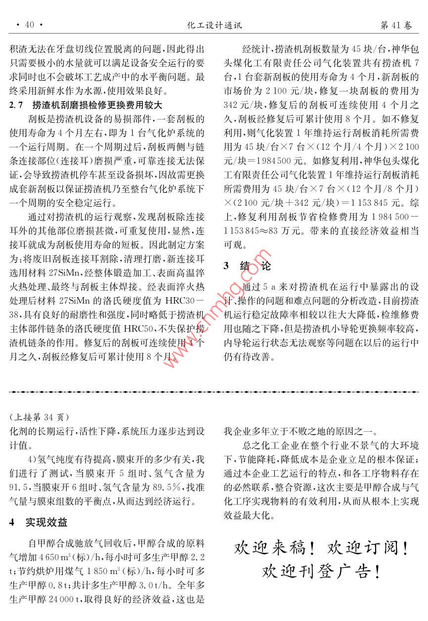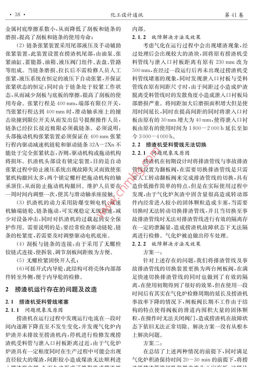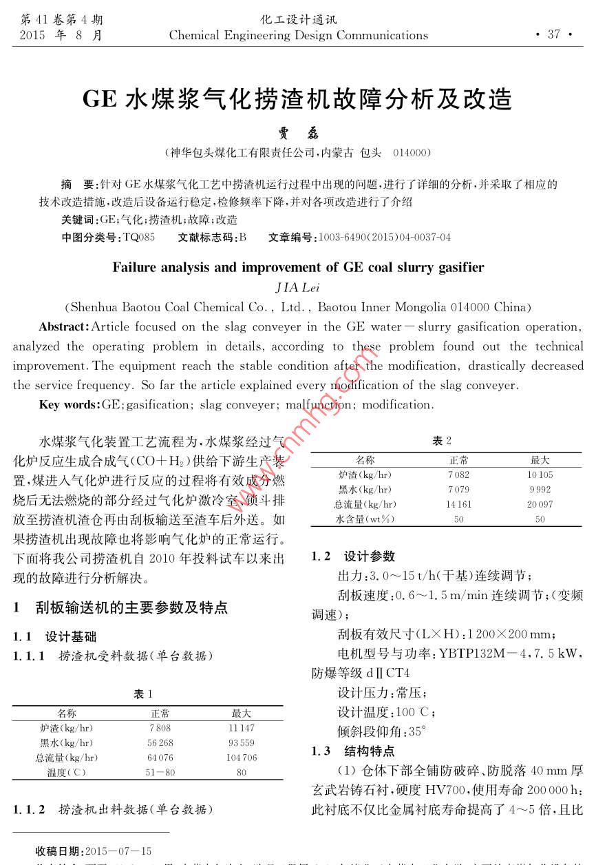 第41卷第4期化工設(shè)計(jì)通訊2015年8月Chemical engineering design CommunicationsGE水煤漿氣化撈渣機(jī)故障分析及改造賈磊(神華包頭煤化工有限責(zé)任公司,內(nèi)蒙古包頭014000摘要:針對(duì)GE水煤漿氣化工藝中撈渣機(jī)運(yùn)行過程中出現(xiàn)的問題,進(jìn)行了詳細(xì)的分析,并采取了相應(yīng)的技術(shù)改造措施改造后設(shè)備運(yùn)行穩(wěn)定,檢修頻率下降,并對(duì)各項(xiàng)改造進(jìn)行了介紹關(guān)鍵詞:GE;氣化;撈渣機(jī);故障;改造中圖分類號(hào):TQ85文獻(xiàn)標(biāo)志碼:B文章編號(hào):1003-6490(2015)040037-04Failure analysis and improvement of ge coal slurry gasifierJIA Lel.(Shenhua Baotou Coal Chemical Co., Ltd, Baotou Inner Mongolia 014000 China)bstract: Article focused on the slag conveyer in the ge water- slurry gasification operationanalyzed the operating problem in details, according to these problem found out the technicalimprovement. The equipment reach the stable condition after the modification, drastically decreasedthe service frequency. So far the article explained every modification of the slag conveyerKey words: GE; gasification; slag conveyer; malfunction; modification水煤漿氣化裝置工藝流程為,水煤漿經(jīng)過氣表2化爐反應(yīng)生成合成氣(CO+H2)供給下游生產(chǎn)裝名稱正常最大置,煤進(jìn)入氣化爐進(jìn)行反應(yīng)的過程將有效成分燃爐渣(kg/hr70799992燒后無法燃燒的部分經(jīng)過氣化爐激冷室、鎖斗排黑水(kg/hr)總流量(kg/hr)1416120097放至撈渣機(jī)渣倉再由刮板輸送至渣車后外送。如水含量(wt%)果撈渣機(jī)出現(xiàn)故障也將影響氣化爐的正常運(yùn)行。下面將我公司撈渣機(jī)自2010年投料試車以來出1.2設(shè)計(jì)參數(shù)現(xiàn)的故障進(jìn)行分析解決。出力:3.0~15t/h(干基)連續(xù)調(diào)節(jié);刮板速度:0.6~1.5m/min連續(xù)調(diào)節(jié);(變頻刮板輸送機(jī)的主要參數(shù)及特點(diǎn)調(diào)速);1.1設(shè)計(jì)基礎(chǔ)刮板有效尺寸(L×H):1200×200mm;1.1.1撈渣機(jī)受料數(shù)據(jù)(單臺(tái)數(shù)據(jù))電機(jī)型號(hào)與功率:YBTP132M-4,7.5kW防爆等級(jí)dⅡCT4表1設(shè)計(jì)壓力:常壓;名稱正常最大設(shè)計(jì)溫度:100℃;爐渣(kg/hr)傾斜段仰角:35黑水(kg/hr)56268總流量(kg/hr)640761047063結(jié)構(gòu)特點(diǎn)溫度(C)51-80(1)倉體下部全鋪防破碎、防脫落40mm厚玄武巖鑄石襯,硬度HV700,使用壽命200000k1.1.2撈渣機(jī)出料數(shù)據(jù)(單臺(tái)數(shù)據(jù))此襯底不僅比金屬襯底壽命提高了4~5倍,且比收稿日期:2015-07-15化工設(shè)計(jì)通訊第41卷金屬襯底摩擦系數(shù)小.從而降低了刮板和鏈條的內(nèi)部磨損提高了刮板和鏈條的使用壽命;2.1.2故障解決方法及效果(2)鏈條張緊裝置采用尾部液壓及手動(dòng)輔助考慮氣化在運(yùn)行過程中會(huì)出現(xiàn)堵渣現(xiàn)象,經(jīng)張緊裝置,此裝置設(shè)置在撈渣機(jī)尾部,由油泵、張過處理后會(huì)出現(xiàn)較大的渣塊,固將原有撈渣機(jī)受緊油缸、蓄能器、油箱、液壓閥門組件、表盤、管路料管線與泄入口襯板距離有原有230mm改為等組成。當(dāng)鏈條磨損、拉長(zhǎng)后不需檢修人員人工500mm,在經(jīng)過一段運(yùn)行后再未岀現(xiàn)過撈渣機(jī)受張緊液壓系統(tǒng)在恒定的液壓下自動(dòng)張緊,并保證料管線堵塞的現(xiàn)象,同時(shí)發(fā)現(xiàn)泄入口襯板與受料張緊狀態(tài)的恒定;同時(shí)由于鏈條處于較緊工作狀管線在原有間距尺寸時(shí),由于間距過小造成爐渣態(tài),從而減少刮板與底板的摩擦,提高了刮板的使脫離受料管線時(shí)的發(fā)散角度小造成泄入口襯板局用壽命。張緊行程是400mm,端部有限位開關(guān),部磨損嚴(yán)重。將間距加大后磨損面積增大但是使當(dāng)張緊行程達(dá)到400mm時(shí),滑動(dòng)軸承座上的撞用時(shí)間延長(zhǎng),同時(shí)在提高間距的同時(shí)將泄入口襯擊塊撞到限位開關(guān)從而發(fā)出信號(hào)提醒操作人員,板由原有的30mm增大為40mm,使得泄入口襯鏈條已經(jīng)拉長(zhǎng)接近極限必須截鏈條。必須說明:板由原有的使用時(shí)間為1800-2000h延長(zhǎng)至如頭部拖動(dòng)機(jī)構(gòu)張緊裝置必須保證在400mm張緊今3000-4000h行程內(nèi)驅(qū)動(dòng)減速機(jī)鏈輪和驅(qū)動(dòng)鏈條32A-2Xn不2.2撈渣機(jī)受料管線無法切換能處于完全張緊狀態(tài),否則,驅(qū)動(dòng)機(jī)構(gòu)或拖動(dòng)機(jī)構(gòu)2.2.Ⅰ問題現(xiàn)象及原因?qū)p壞。扒渣機(jī)頭部設(shè)有鎖定裝置,目的是自動(dòng)撈渣杋在初期設(shè)計(jì)時(shí)將排渣管線與事故排渣張緊過程中防止液壓系統(tǒng)出現(xiàn)故障失靈而致使張管線設(shè)置為翻板閥,在需要切換排渣管線是只需緊機(jī)構(gòu)撤回太多;兩個(gè)鎖定螺杄把拖動(dòng)機(jī)構(gòu)的軸要人工轉(zhuǎn)動(dòng)翻板閥來完成排渣管線的切換,具有承頂住,從而防止拖動(dòng)機(jī)構(gòu)撤回。維護(hù)人員要在造價(jià)低搡作簡(jiǎn)單的特點(diǎn),但是在實(shí)際使用過程中周時(shí)間內(nèi)調(diào)整一次,使其與滑動(dòng)軸承座接觸。發(fā)現(xiàn),由于氣化爐灰渣中固含量很高造成轉(zhuǎn)動(dòng)部(3)扒渣機(jī)的動(dòng)力采用防爆變頻電機(jī)、減速件內(nèi)經(jīng)常進(jìn)入較小的固體顆粒造成卡塞,當(dāng)需要機(jī)軸端鏈輪、鏈條拖動(dòng),可實(shí)現(xiàn)穩(wě