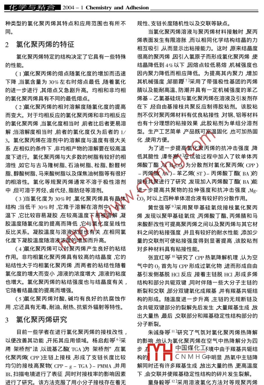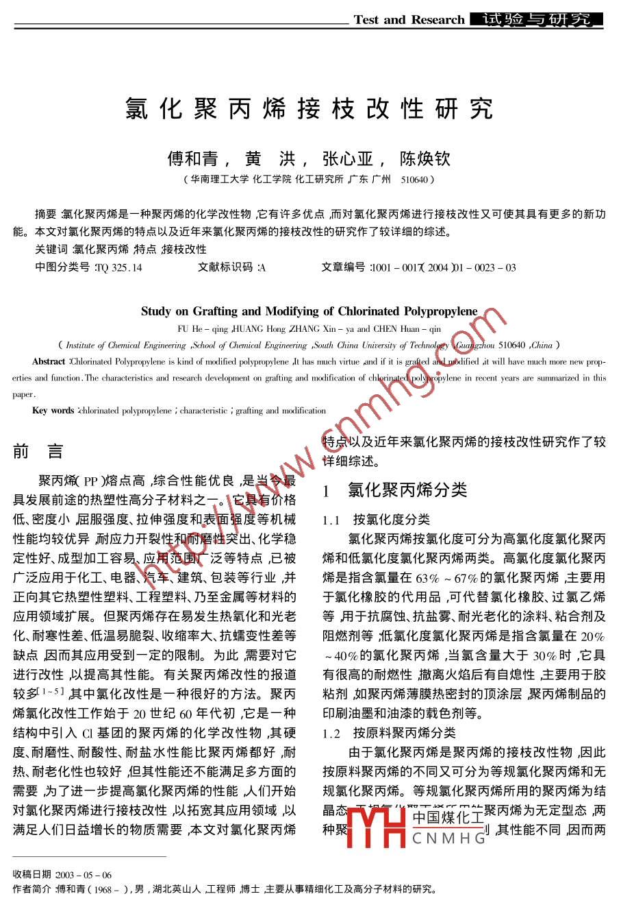 Test and Research【試盜島研氯化聚丙烯接枝改性研究傅和青,黃洪,張心亞,陳煥欽華南理工大學(xué)化工學(xué)院化工研究所廣東廣州510640)摘要氯化聚丙烯是一種聚丙烯的化學(xué)改性物,它有許多優(yōu)點(diǎn)而對氯化聚丙烯進(jìn)行接枝改性又可使其具有更多的新功能。本文對氯化聚丙烯的特點(diǎn)以及近年來氯化聚丙烯旳接枝改性的研究作了較詳細(xì)的綜述。關(guān)鍵詞氯化聚丙烯特點(diǎn)接枝改性中圖分類號IQ文獻(xiàn)標(biāo)識碼:A文章編號:001-00172004)1-0023-03Study on Grafting and Modifying of Chlorinated polypropyleneFU He- qing HUANG Hong ZHANG Xin-ya and CHEN Huan-qinInstitute of Chemical Engineering ,School of Chemical Engineering,South China University of Technology Guangzhou 510640, ChinaAbstract Chlorinated Polypropylene is kind of modified polypropylene It has much virtue and if it is grafted and modified ,it will have much more new properties and function. The characteristics and research development on grafting and modification of chlorinated polypropylene in recent years are summarized in thisKey words chlorinated polypropylene characteristic i grafting and modification特點(diǎn)以及近年來氯化聚丙烯的接枝改性研究作了較詳細(xì)綜述。聚丙爔(PP)熔點(diǎn)高,綜合性能優(yōu)良,是當(dāng)今最具發(fā)展前途的熱塑性高分子材料之一。它具有價格1氯化聚丙烯分類低、密度小屈服強(qiáng)度、拉伸強(qiáng)度和表面強(qiáng)度等機(jī)械1.1按氯化度分類性能均較優(yōu)異耐應(yīng)力開裂性和耐磨性突岀、化學(xué)穩(wěn)氯化聚丙烯按氯化度可分為高氯化度氯化聚丙定性好、成型加工容易、應(yīng)用范圍廣泛等特點(diǎn)已被烯和低氯化度氯化聚丙烯兩類。高氯化度氯化聚丙廣泛應(yīng)用于化工、電器、汽車、建筑、包裝等行業(yè)并烯是指含氯量在63%~67%的氯化聚丙烯主要用正向其它熱塑性塑料、工程塑料、乃至金屬等材料的于氯化橡膠的代用品,可代替氯化橡膠、過氯乙烯應(yīng)用領(lǐng)域擴(kuò)展。但聚丙烯存在易發(fā)生熱氧化和光老等用于抗腐蝕、抗鹽霧、耐光老化的涂料、粘合劑及化、耐寒性差、低溫易脆裂、收縮率大、抗蠕變性差等阻燃劑等泜氯化度氯化聚丙烯是指含氯量在20%缺點(diǎn)因而其應(yīng)用受到一定的限制。為此需要對它~40%的氯化聚丙烯,當(dāng)氯含量大于30%時,它具進(jìn)行改性以提高其性能。有關(guān)聚丙烯改性的報道有很高旳耐燃性撤離火焰后有自熄性主要用于膠較多μ5其中氯化改性是一種很好的方法。聚丙粘劑如聚丙烯薄膜熱密封的頂涂層聚丙烯制品的烯氯化改性工作始于②0世紀(jì)60年代初,它是一種印刷油墨和油漆的載色劑等。結(jié)構(gòu)中引入C基團(tuán)的聚丙烯的化學(xué)改性物,其硬1.2按原料聚丙烯分類度、耐曆性、耐酸性、耐鹽水性能比聚丙烯都好耐由于氯化聚丙烯是聚丙烯的接枝改性物,因此熱、耐老化性也較好但其性能還不能滿足多方面的按原料聚丙烯的不同又可分為等規(guī)氯化聚丙烯和無需要為了進(jìn)一步提高氯化聚丙烯的性能亼們開始規(guī)氯化聚丙烯。等規(guī)氯化聚丙烯所用的聚丙烯為結(jié)對氯化聚丙烯進(jìn)行接枝改性以拓寬其應(yīng)用領(lǐng)域以晶:中國煤化工聚丙烯為無定型態(tài)兩滿足人們?nèi)找嬖鲩L的物質(zhì)需要本文對氯化聚丙烯種聚CNMHG刂其性能不同因而兩收稿日期2003-05-06作者簡介博和青(1968-),男,湖北英山人工程師博士主要從事精細(xì)化工及高分子材料的研究學(xué)寫_2004-1 Chemistry and Adhesion種類型的氯化聚丙烯其特點(diǎn)和應(yīng)用范圍也有所不規(guī)性、支鏈長度隨機(jī)性以及交聯(lián)等缺點(diǎn)。同當(dāng)氯化聚丙烯溶液與聚丙烯材料接觸時聚丙2氯化聚丙烯的特征烯表面發(fā)生有限溶脹而以相同化學(xué)結(jié)構(gòu)結(jié)晶的力相互吸引從而顯示出粘接能力。這時原來結(jié)晶度氯化聚丙烯特定的結(jié)構(gòu)決定了它具有一些特殊很高的聚丙烯因引入氯原子而形成氯化聚丙烯使的性能結(jié)晶降低到4%以下因熔點(diǎn)較低易熔機(jī)械強(qiáng)度也1嵐氟化聚丙烯的熔點(diǎn)隨氯化度的增加而迅速因內(nèi)聚力降低而相應(yīng)降低。為提高其內(nèi)聚力增加下降當(dāng)氯含量為30%左右時熔點(diǎn)最低隨著氯化其機(jī)械強(qiáng)度鄒麗霞采用了帶強(qiáng)極性基團(tuán)的丙烯的進(jìn)一步進(jìn)行其熔點(diǎn)又急劇升高。均相和非均相腈以及能耐高溫、防潮并具有一定機(jī)械強(qiáng)度的苯乙的氯化聚丙烯具有不同的最低熔點(diǎn)。烯基-乙氯基硅烷與氯化聚丙烯在溶液及引發(fā)劑存2嵐化聚丙烯的相對溶解度隨氯化度的提高在下經(jīng)自由基接枝共聚反應(yīng)制得膠粘劑。該膠粘而變大。對于均相反應(yīng)的氯化聚丙烯和非均相反應(yīng)劑不僅對聚丙烯材料有優(yōu)良粘接性對鋼、鋁等材料的氯化聚丙烯當(dāng)氯化度相當(dāng)時前者比后者更易溶也有十分理想的粘接效果批此膠粘劑為單組分溶劑解當(dāng)溶解度相當(dāng)時前者的氯化度僅為后者的1/型。生產(chǎn)工藝簡單產(chǎn)品既可室溫固化也可加熱固3。氯化聚丙烯在溶劑中的溶解度與溫度有很大關(guān)化使用方便系在相似的條件下非均相產(chǎn)物的溶解要在較高溫為了進(jìn)一步提高氯化聚丙烯的抗沖擊強(qiáng)度降度下進(jìn)行