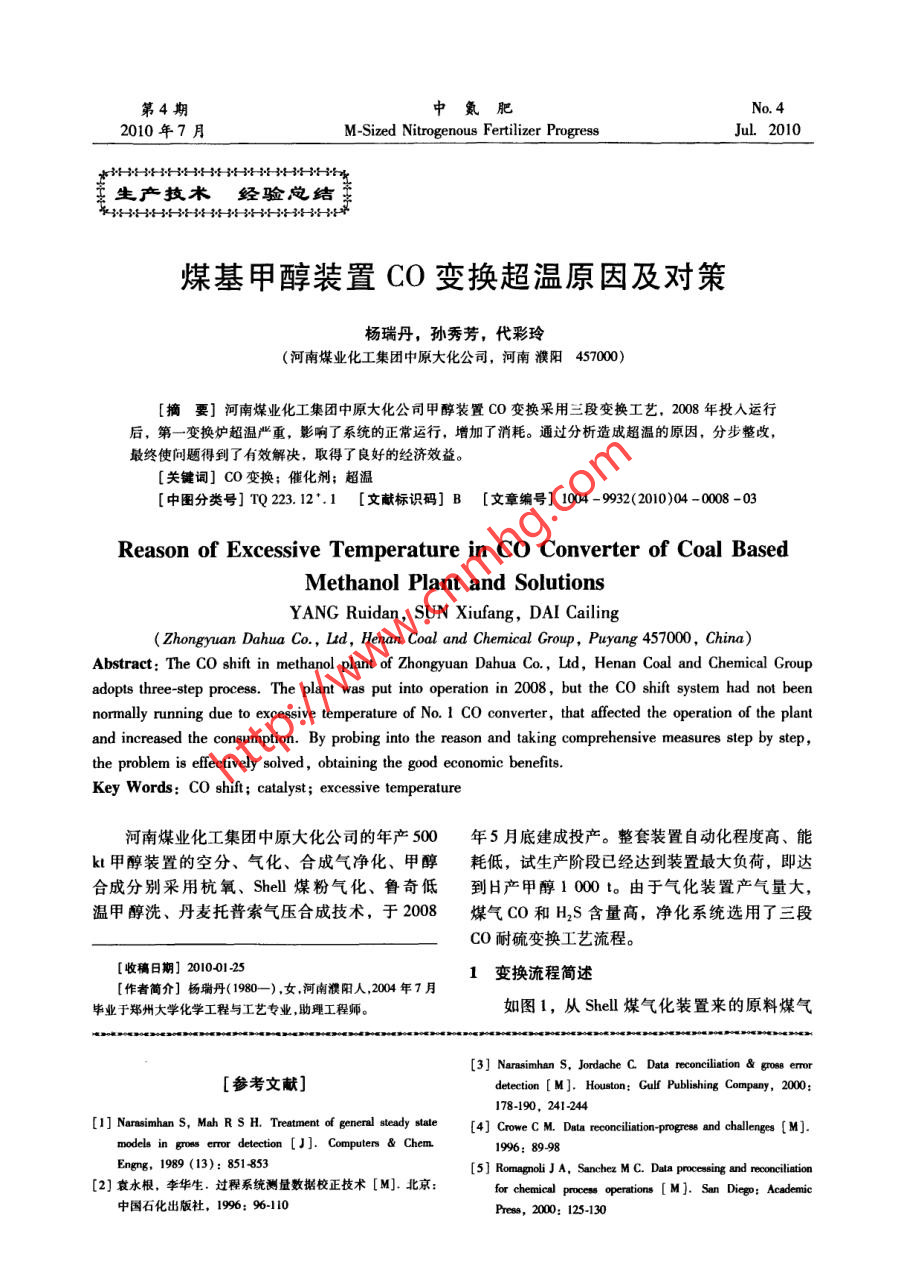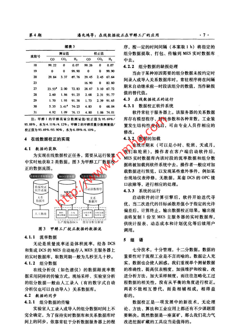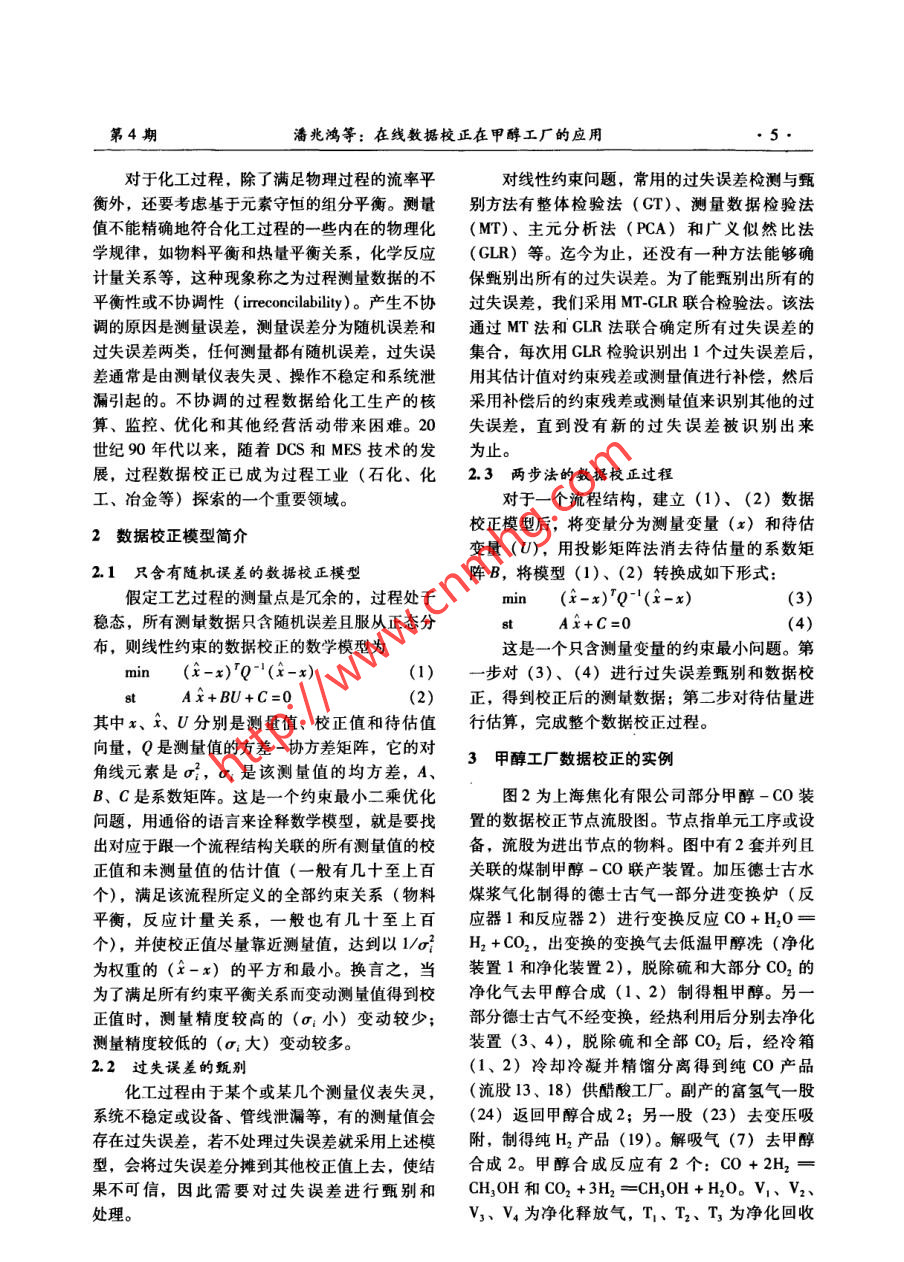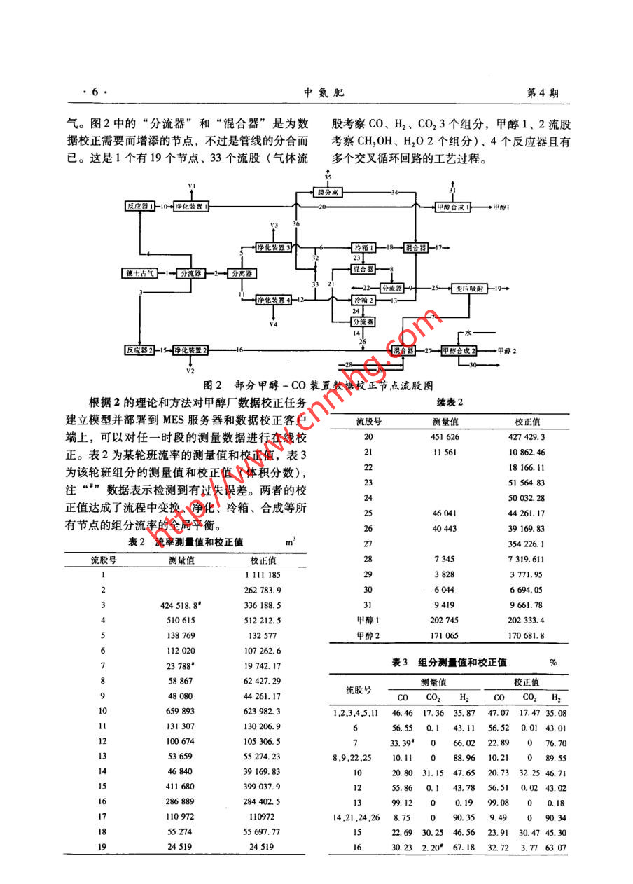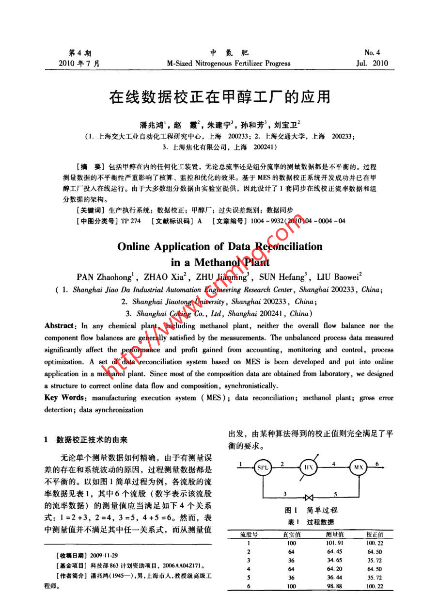 第4期中氮肥No.42010年7月M -Sized Nitrogenous Fertilizer ProgressJul. 2010在線數(shù)據(jù)校正在甲醇工廠的應(yīng)用潘兆鴻',趙霞', 朱建寧’,孫和芳’,劉寶衛(wèi)'(1.上海交大工業(yè)自動(dòng)化工程研究中心,上海200233; 2.上海交通大學(xué),上海200233;3.上海焦化有限公司,上海200241)[摘要] 包括甲醇在內(nèi)的任何化工裝置,無論總流率還是組分流率的測斌數(shù)據(jù)都是不平衡的。過程測量數(shù)據(jù)的不平衡性嚴(yán)重影響了核算、監(jiān)控和優(yōu)化的效果?;贛ES的數(shù)據(jù)校正系統(tǒng)開發(fā)成功并已在甲醇工廠投入在線運(yùn)行。由于大多數(shù)組分?jǐn)?shù)據(jù)由實(shí)驗(yàn)室提供,因此設(shè)計(jì)了1套同步在線校E流率數(shù)據(jù)和組分?jǐn)?shù)據(jù)的架構(gòu)。[關(guān)鍵詞]生產(chǎn)執(zhí)行系統(tǒng);數(shù)據(jù)校正;甲醇廠;過失誤差甄別;數(shù)據(jù)同步[中團(tuán)分類號(hào)] TP274 [ 文獻(xiàn)標(biāo)識(shí)碼] A [文章編號(hào)] 1004 -9932(2010)04 -0004 -04Online Application of Data Reconciliationin a Methanol PlantPAN Zhaohong' ,ZHAO Xia2,ZHU Jianning',SUN Hefang' ,LIU Baowei?( 1. Shanghai Jiao Da Indusrial Automation Engineering Research Center, Shanghai 200233, China;2. Shanghai Jaolong University, Shanghai 200233, China;3. Shanghai Coking Co., Ltd, Shanghai 200241 , China)Abstract: In any chemical plant, including methanol plant, neither the overall flow balance nor thecomponent flow balances are generally satisfied by the measurements. The unbalanced process data measuredsignificantly affect the performance and profit gained from accounting, monitoring and control, processoptimization. A set of data reconeiliation system based on MES is been developed and put into onlineapplication in a methanol plant. Since most of the composition data are obtained from laboratory,we designeda structure to correct online data flow and composition,synchronistically.Key Words: manufacturing execution system ( MES); data reconciliation; methanol plant; gross errordetection; data synchronization出發(fā),由某種算法得到的校正值則完全滿足了平1數(shù)據(jù)校正技術(shù)的由 來衡的要求。無論單個(gè)測量數(shù)據(jù)如何精確,由于有測量誤差的存在和系統(tǒng)波動(dòng)的原因,過程測量數(shù)據(jù)都是1 (srD-2 IN一4(Mx不平衡的。以如圖1簡單過程為例,各流股的流率數(shù)據(jù)見表1,其中6個(gè)流股(數(shù)字表示該流股的流率數(shù)據(jù))的測量值應(yīng)當(dāng)滿足如下4個(gè)關(guān)系圖1簡單過程式: 1=2+3, 2=4, 3=5, 4+5=6。然而,表表1過程數(shù)據(jù).中測量值并不滿足其中任- -關(guān)系式,而從測量值流股號(hào)真安值測景值校正值二100101.91100.2226464. 4564. 50[收稿日期] 209-11293634.6535. 72[基金項(xiàng)目]科技部863計(jì)劃資助項(xiàng)目, 2006A04Z171.64. 20[作者簡介]潘兆鴻(1945-) ,男,上海市人,教授級(jí)高級(jí)工36. 44程師。1098.88第4期潘兆鴻等:在線數(shù)據(jù)校正在甲醇工廠的應(yīng)用●5.對(duì)于化工過程,除了滿足物理過程的流率平對(duì)線性約束問題,常用的過失誤差檢測與甄衡外,還要考慮基于元素守恒的組分平衡。測量別方法有整體檢驗(yàn)法(GT)、測量數(shù)據(jù)檢驗(yàn)法值不能精確地符合化工過程的一些內(nèi)在的物理化(MT)、主元分析法(PCA) 和廣義似然比法學(xué)規(guī)律,如物料平衡和熱量平衡關(guān)系,化學(xué)反應(yīng)(GLR)等。迄今為止,還沒有-種方法能夠確計(jì)量關(guān)系等,這種現(xiàn)象稱之為過程測量數(shù)據(jù)的不保甄別出所有的過失誤差。為了能甄別出所有的平衡性或不協(xié)調(diào)性( ireconcilabiliy)。產(chǎn)生不協(xié)過失誤差,我們采用MT-GLR聯(lián)合檢驗(yàn)法。該法調(diào)的原因是測量誤差,測量誤差分為隨機(jī)誤差和通過MT法和GLR法聯(lián)合確定所有過失誤差的過失誤差兩類,任何測量都有隨機(jī)誤差,過失誤集合,每次用GLR檢驗(yàn)識(shí)別出1個(gè)過失誤差后,差通常是由測量儀表失靈、操作不穩(wěn)定和系統(tǒng)泄用其估計(jì)值對(duì)約束殘差或測量值進(jìn)行補(bǔ)償,然后漏引起的。不協(xié)調(diào)的過程數(shù)據(jù)給化工生產(chǎn)的核采用補(bǔ)償后的約束殘差或測量值來識(shí)別其他的過算、監(jiān)控、優(yōu)化和其他經(jīng)營活動(dòng)帶來困難。20失誤差,直到?jīng)]有新的過失誤差被識(shí)別出來世紀(jì)90年代以來,隨著DCS和MES技術(shù)的發(fā)為止。展,過程數(shù)據(jù)校正已成為過程工業(yè)(石化、化2.3 兩步法的數(shù)據(jù)校正過程工、冶金等)探索的一一個(gè)重要領(lǐng)域。對(duì)于-一個(gè)流程結(jié)構(gòu),建立(1)、(2)數(shù)據(jù)校正模型后,將變量分為測量變量(x)和待估2數(shù)據(jù)校正模型簡介變量(U),用投影矩陣法消去待估量的系數(shù)矩2.1只含有隨機(jī)誤 差的數(shù)據(jù)校正模型陣B,將模型(1)、(2)轉(zhuǎn)換成如下形式:假定工藝過程的測量點(diǎn)是冗余的,過程處于min(i-x)"Q~'(i-x)(3)穩(wěn)態(tài),所有測量數(shù)據(jù)只含隨機(jī)誤差且服從正態(tài)分stAx+C =0.(4)布,則線性約束的數(shù)據(jù)校正的數(shù)學(xué)模型為這是一個(gè)只含測量變量的約束最小問題。第(x-x)"Q~'(x-x)(1)一步對(duì)(3)、(4)進(jìn)行過失誤差甄別和數(shù)據(jù)校Ax+BU+C=0(2)正,得到校正后的測量數(shù)據(jù);第二步對(duì)待估量進(jìn)其中x、。、U分別是測量值、