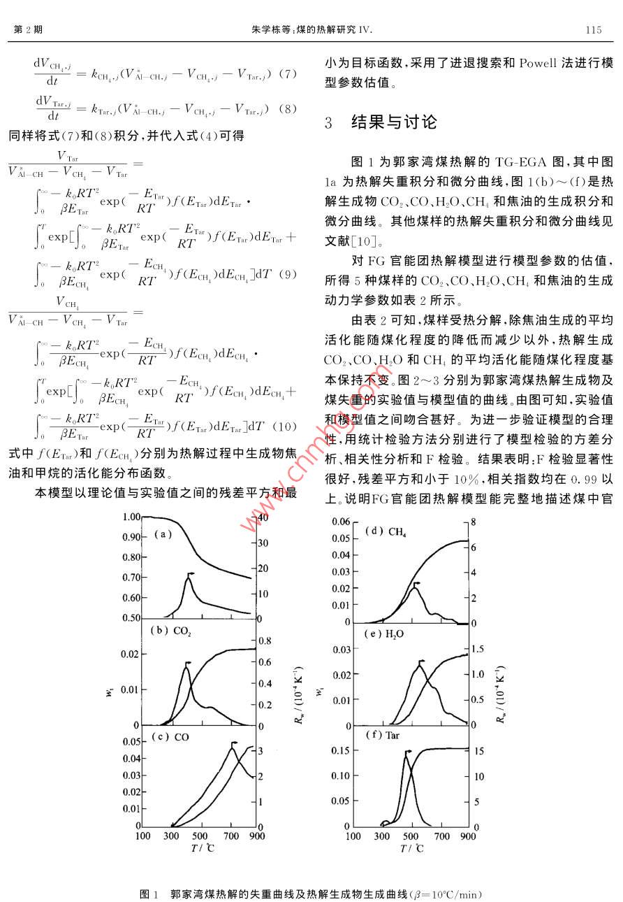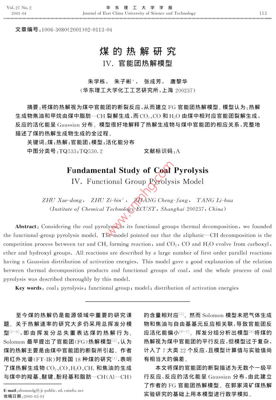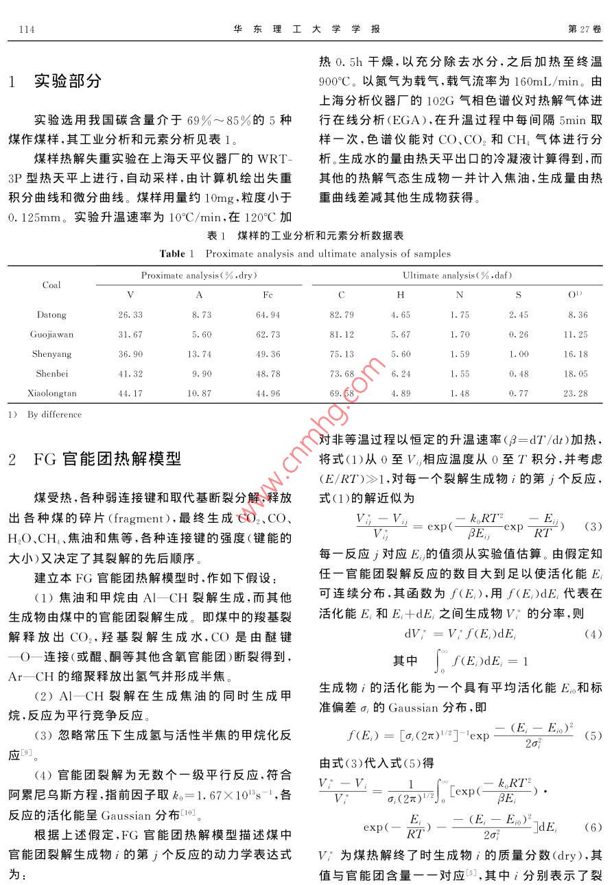 Vol. 27 No,2華東理工大學學報2001-04JournalEast China University of Science and Technology113文章編號:1006- 3080(2001 )02-0113-04煤的熱解研究IV.官能團熱解模型朱學棟,朱子彬”,張成芳,唐黎華(華東理工大學化工工藝研究所,上海200237)摘要:將煤的熱解視為煤中官能團的斷裂反應,從而建立FG官能團熱解模型。模型認為:熱解生成物焦油和甲烷由煤中脂肪-CH裂解生成,而CO2、CO和H2O由煤中相對應官能團裂解生成,反應的活化能呈Gaussian分布。模型很好地解釋了熱解生成物與煤中官能團的相應關系,完整地描述了煤的熱解生成物生成的全過程。關鍵詞:煤;熱解;官能團;模型;活化能分布中圖分類號:TQ533;TQ530.2文獻標識碼:AFundamental Study of Coal PyrolysisIV. Functional Group Pyrolysis ModelZHU Xue-dong,ZHU Zi-bin*,ZHANG Cheng-fang,TANG Li-hua(Institute of Chemical Technology ECUST, Shanghai 200237, China)Abstract: Considering the coal pyrolysis as its functional groups thermal decomposition, we foundedthe functional- group pyrolysis model. The model pointed out that the aliphatic- CH decomposition is thecompetition process between tar and CH。forming reaction, and CO2, CO and H2O evolve from carboxyl,ether and hydroxyl groups. All reactions are described by a large number of first order parallel reactionshaving a Gaussian distribution of activation energies. This model gave a good explanation of the relationbetween thermal decomposition products and functional groups of coal, and the whole process of coalpyrolysis was described thoroughly by this model.Key words: coal; pyrolysis; functional group; model; distribution of activation energies至今煤的熱解仍是能源領域中重要的研究課的含量相對應印]。然而Solomon模型未把氣體生成題。關于熱解速率的研究大多仍采用總揮發(fā)分模物和焦油與自由基基元反應相關聯(lián),導致官能團反型(~2],即由揮發(fā)分總失重表達煤的熱解行為。應活化能偏小[0~7]。揮發(fā)分組分析出模型[8]將煤的Solomon最早提出了官能團(FG)熱解模型的,認為熱解視為煤中官能團的平行反應,但模型過于復雜,煤的熱解主要是由煤中官能團的斷裂所引起。作者計入了7大類22個反應,且模型計算值與實驗值尚用紅外光譜(FT -IR)對我國18種煤的研究[],表明有相當大的偏差。了煤熱解生成物CO2、CO、H2O、CH,和焦油的生成本文將煤的官能團的斷裂描述為無數(shù)個一級平與煤中的羧基、醚鍵、酚羥基和脂肪- CH(AI- CH)行反應,反應的活化能呈Gaussian分布,由此建立了作者的FG官能團熱解模型。在郭家灣礦煤熱解E-mail :zhuxuedg@ ji public. sd. cninfo. net收稿日期:2000-03-01實驗研究的基礎上用本模型進行數(shù)學模擬。華東理工大學學報第27卷熱0.5h干燥,以充分除去水分,之后加熱至終溫1實驗部分900°C。以氮氣為載氣,載氣流率為160mL/min。由上海分析儀器廠的102G氣相色譜儀對熱解氣體進實驗選用我國碳含量介于69%~85%的5種行在線分析(EGA),在升溫過程中每間隔5min取煤作煤樣,其工業(yè)分析和元素分析見表1。樣一次,色譜儀能對CO、CO2和CH。氣體進行分煤樣熱解失重實驗在上海天平儀器廠的WRT-析。生成水的量由熱天平出口的冷凝液計算得到,而3P型熱天平上進行,自動采樣,由計算機繪出失重其他的熱解氣態(tài)生成物一并計入焦油,生成量由熱積分曲線和微分曲線。煤樣用量約10mg,粒度小于重曲線差減其他生成物獲得。0.125mm。實驗升溫速率為10*C/min,在120°C加表1煤樣的工業(yè)分析和元素分析數(shù)據(jù)表Table 1 Proximate analysis and ultimate analysis of samplesProximate analysis(%,dry )Ultimate analysis( % .daf )CoalVAFoODatong26. 338.7364.9482.794. 651. 752. 458. 36Guojlawan31.675. 6062.7381.125. 671.700. 2611.25Shenyang36. 9013.7449.3675.135.6(1.591.0016. 18Shenbei41.329.9048.7873. 686.241.550.4818.05Xiaolongtan44. 1744. 9669. 584. 891.480.7723. 281) By difference對非等溫過程以恒定的升溫速率(β=dT/dt)加熱,2FG官能團熱解模型將式(1)從0至V,相應溫度從0至T積分,并考慮(E/RT)>1,對每一個裂解生成物i的第j個反應,煤受熱,各種弱連接鍵和取代基斷裂分解,釋放式(1)的解近似為出各種煤的碎片(fragment),最終生成CO2、CO、V;- V;k,RT*H2O、CH、焦油和焦等,各種連接鍵的強度(鍵能的ViBE-exp大小)又決定了其裂解的先后順序。每一反應j對應E,的值須從實驗值估算。由假定知建立本FG官能團熱解模型時,作如下假設:任一官能團裂解反應的數(shù)目大到足以使活化能E;(1)焦油和甲烷由AI- CH裂解生成,而其他可連續(xù)分布,其函數(shù)為f(E),用f(E)dE;代表在生成物由煤中的官能團裂解生成。即煤中的羧基裂活化能E;和E,+dE;之間生成物V:的分率,則解釋放出CO2,羥基裂解生成水,CO是由醚鍵dV; = V; f(E,)dE;(4)O-連接(或醌、酮等其他含氧官能團)斷裂得到,其中f(E)dE;= 1Ar- CH的縮聚釋放出氫氣并形成半焦。(2)Al-CH裂解在生成焦油的同時生成甲生成物i的活化能為一個具有平均活化能E。和標準偏差σ;的Gaussian分布,即烷,反應為平行競爭反應。(3)忽略常壓下生成氫與活性半焦的甲烷化反f(E)= [(2n)*]~'exp-二(E,- Eo)g(5)2σ}應0。(4)官能團裂解為無數(shù)個一級平行反應,符合由式(3)代入式(5)得V;-V;k。RTP阿累尼烏斯方程,指前因子取k。=1.67X10*s-+,各V;σ,(2π)72Jo[exp(βE;)●反應的活化能呈Gaussian分布[10]。E;一(E;Ew)"dE,(6)根據(jù)上述假定,FG官能團熱解模型描述煤中2σ?官能團裂解生成物i的第j個反應的動力學表達式.V7為煤熱解終了時生成物i的質(zhì)量分數(shù)(dry),其為:值與官能團含量一-對應印,其中i分別表示了裂第2期朱學