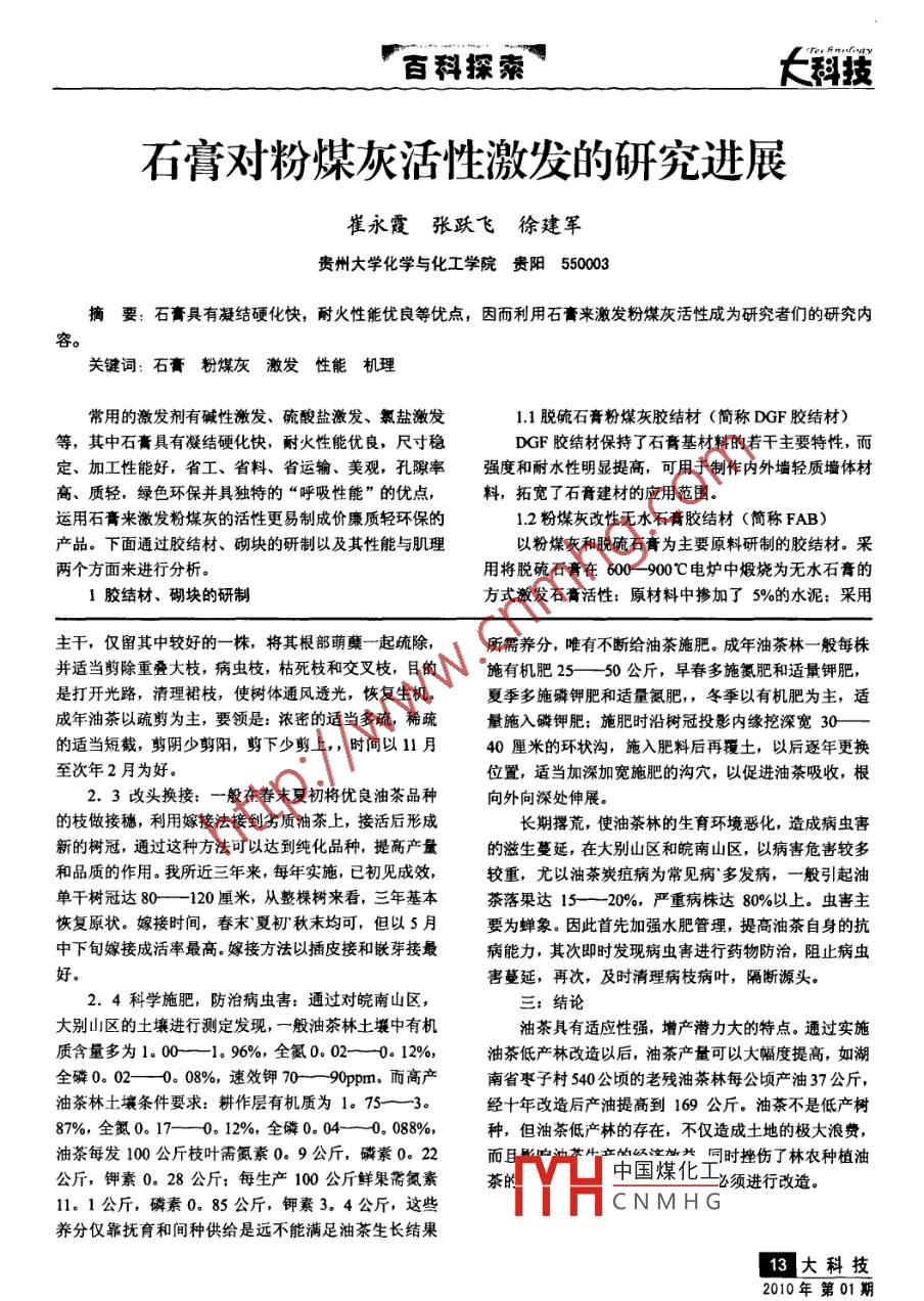 上科技百科探雜油茶低產(chǎn)林的改造李靜黃山市林業(yè)科學(xué)研究所安徵黃山245000摘要:分析油茶低產(chǎn)林的成因,通過林業(yè)技術(shù):管理,修剪,改頭換接,達(dá)到油茶豐產(chǎn)的要求。關(guān)鍵詞:低產(chǎn)林撂荒品種換接管理近年來,油茶產(chǎn)業(yè)的發(fā)展得到了國家的高度重視1.3林相不整齊:現(xiàn)有油茶林內(nèi)高矮大小不一,多中央領(lǐng)導(dǎo)就油茶發(fā)展作了重要批示,明確要求加快油茶代混生的異齡林現(xiàn)象較普遍,有的每畝地達(dá)200株以上,產(chǎn)業(yè)的發(fā)展。國家林業(yè)局編制了《全國油茶產(chǎn)業(yè)發(fā)展規(guī)有的每畝僅20—30株,這種生長弱,林相不整齊的油劃》,啟動了油茶產(chǎn)業(yè)工程,油茶產(chǎn)區(qū)各級政府均出臺了茶林,不僅光照差,其病蟲害滋生蔓延。有的個體發(fā)育油荼產(chǎn)業(yè)規(guī)劃和產(chǎn)業(yè)支持政策,加大資金扶持。因此進(jìn)入衰老期新梢生長量減弱光合能力差冠幅縮小,枝干油茶產(chǎn)業(yè)出現(xiàn)快速發(fā)展勢頭。面對新的戰(zhàn)略機(jī)遇,如何上附著苔蘚,地衣和桑寄生,病蟲害增多,落花落果嚴(yán)科學(xué)穩(wěn)妥快捷發(fā)展油茶產(chǎn)業(yè)已擺在我們面前,改造低重,這類油茶林無論你如何加強管理,其產(chǎn)量也難以提產(chǎn)油茶林較營造油茶幼林增加產(chǎn)量快,時間大為縮短,高當(dāng)?shù)剞r(nóng)林經(jīng)營者可以很快得到經(jīng)濟(jì)效益,自然提高對油二:改造措施茶栽培的積極性,提升油茶產(chǎn)業(yè)化的程度,因此,油茶由于成年油茶林的低產(chǎn)是多方面因素造成的,因此低產(chǎn)林改造勢在必行!在改造前首先應(yīng)調(diào)查和摸清現(xiàn)有低產(chǎn)林的立地條件,林一:油茶低產(chǎn)林形成的原因分年齡,結(jié)構(gòu),密度,品種和組成等,根據(jù)調(diào)查結(jié)果找1.1疏于管理:由于長期以來,油茶生產(chǎn)未受重視出形成低產(chǎn)的原因,針對原因摸某種或綜合措施,才能油茶林長期撂荒,地面灌木雜草從生,還有其它喬木的達(dá)到應(yīng)有的效果。種子乘風(fēng)飄入,如馬尾松,擦樹等,這種混交林首先是2.1:砍清雜灌,墾復(fù)深翻:對那些長期撂荒的油林地荒蕪,多不行墾復(fù),土壤干燥瘠薄;其次是油茶被茶林,必須先清除高大喬木,砍去雜灌和清理藤蔓,使高大喬木樹冠覆蓋,光照嚴(yán)重不足,光和產(chǎn)物少,消耗油茶從被壓的狀態(tài)解脫出來然后墾復(fù)深翻。深翻一般在多,生長衰退,冉加上雜灌根系眾多,分布密集,與油冬季進(jìn)行,深度在30厘米以上,在不造成水土流失的前茶爭奪肥水。據(jù)調(diào)查,肥沃的表土層只有1%的油提下,根據(jù)油茶林的地形,土壤,樹齡的不同,采取全茶根系分布,喬雜灌的根達(dá)90%,這就應(yīng)了那句俗墾,帶狀墾復(fù),穴狀墾復(fù),階梯墾復(fù)或壕溝撫育,一般語:一年不墾草成行,二年不墾減產(chǎn)量,三年不墾葉片荒蕪油茶林一經(jīng)墾復(fù)就可:當(dāng)年得利,兩年增產(chǎn),三年黃,四年不墾茶樹荒。豐收1.2品種雜亂:現(xiàn)有的油茶林大多是以普通油茶為2.2調(diào)整密度,短截修剪:油茶林的種植密度不同,主,長期以來實生栽培和異花授粉,形成了花期,成熟不僅影響地力的發(fā)揮和光能的利用,而且影響油茶的產(chǎn)期,果行多種多樣的品種,油茶品種不同,抗性也不量和質(zhì)量。然而現(xiàn)有的大面積的低產(chǎn)油茶林,不是過稀樣,一些抗病力如弱的品種(類型)或單株容易感染炭過密,就是分布不均,缺株相當(dāng)普遍,林相極不完整。疽病和軟腐病,引起嚴(yán)重的落花落果;品種不同,花期成年油茶林的密度應(yīng)根據(jù)物種,品種,立地條件,經(jīng)營不同,通過調(diào)查發(fā)現(xiàn):油茶花期最早在9月,最遲在12方式和水平,林齡等林分狀況綜合分析,加以調(diào)整,留月,由于油茶是蟲媒花,座果率的高低,除花芽自身發(fā)優(yōu)去劣,密的間伐,疏的補植良種,不論補種或間伐都育的狀況外,決定于當(dāng)時開花授粉的條件。因此,花期要求分布均勻,株行距相對整齊。普通油茶一般每畝60早的因開花植株少而得不到足夠異花授粉的條件,或過中國煤化工或少于50株,都不能早開花花芽自身發(fā)育不健全,座果率不高:花期晚的,高產(chǎn)卻因氣候漸冷,昆蟲不能傳粉或花粉難以門萌發(fā)而不能CNMH枝條重疊,光照不足,完成授粉。內(nèi)堂空虛,結(jié)果枝外移的,首先剪除不結(jié)果或結(jié)果少的大科技2010年第01期百科探囊上科技石膏對粉煤灰活性激發(fā)的研究進(jìn)展崔永霞張躍飛徐建軍貴州大學(xué)化學(xué)與化工學(xué)院貴陽550003摘要:石膏具有凝結(jié)硬化快,耐火性能優(yōu)良等優(yōu)點,因而利用石膏來激發(fā)粉煤灰活性成為研究者們的研究內(nèi)關(guān)鍵詞:石膏粉煤灰激發(fā)性能機(jī)理常用的激發(fā)劑有堿性激發(fā)、硫酸鹽激發(fā)、氯鹽激發(fā)1.1脫硫石膏粉煤灰膠結(jié)材(簡稱DGF膠結(jié)材)等,其中石膏具有凝結(jié)硬化快,耐火性能優(yōu)良,尺寸穩(wěn)DGF膠結(jié)材保持了石膏基材料的若干主要特性,而定、加工性能好,省工、省料、省運輸、美觀,孔隙率強度和耐水性明顯提高,可用于制作內(nèi)外墻輕質(zhì)墻體材高、質(zhì)輕,綠色環(huán)保并具獨特的“呼吸性能”的優(yōu)點,料,拓寬了石膏建材的