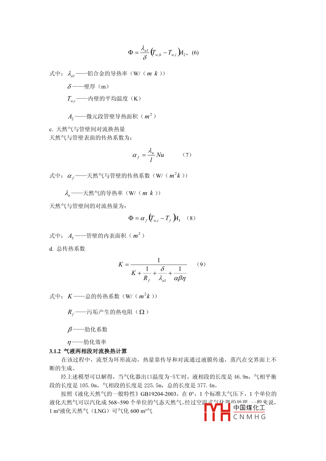 空溫式氣化器氣化能力分析王朝暉深圳市燃?xì)饧瘓F(tuán)股份有限公司廣東深圳518000摘要:在西氣東輸?shù)膰?guó)策指引下,我國(guó)的天然氣事業(yè)得到了飛速的發(fā)展。空溫式氣化器是燃?xì)庠O(shè)備中重要的組成部分。本文通過(guò)研究空溫式氣化器的工作過(guò)程,分析了其氣化能力。并且進(jìn)行了數(shù)值分析,旨在加深人們對(duì)空溫式氣化器的了解。關(guān)鍵詞:空溫式氣化器;氣化能力;方式中圖分類號(hào):P632文獻(xiàn)標(biāo)識(shí)碼:A文章編號(hào):引言目前,天然氣因其安全、熱值高、潔凈等優(yōu)點(diǎn)被廣泛使用。在使用的過(guò)程中,液化天然氣要經(jīng)過(guò)氣化、回復(fù)至常溫兩步處理,才能投入使用。在系統(tǒng)中,空溫式氣化器是重要的核心部分,在燃?xì)庠O(shè)備中起了非常重要的作用2.空溫式氣化器的優(yōu)缺點(diǎn)和氣化過(guò)程2.1空溫式氣化器的優(yōu)缺點(diǎn)空溫式氣化器具有依靠自身顯熱和吸收外界大氣環(huán)境熱量而實(shí)現(xiàn)氣化功能,不消耗水、電等,運(yùn)行成木較低的優(yōu)點(diǎn)。其缺點(diǎn)是:氣化器體積大,氣化量受氣溫的影響較大。在氣溫較低時(shí)(在北方)氣化量可能達(dá)不到額定值據(jù)統(tǒng)計(jì),空溫式氣化器在0℃的氣化能力僅能達(dá)到其額定流量的65%.。為了解決這個(gè)問(wèn)題,可以在溫度低的時(shí)候啟用備用設(shè)備。從經(jīng)濟(jì)上考慮,仍要比使用電熱式氣化器更合適。2.2空溫式氣化器氣化過(guò)程空溫式氣化器包含蒸發(fā)部與加熱部,蒸發(fā)部由端板管連接并排的導(dǎo)熱管構(gòu)成,加熱部由用彎管接頭串聯(lián)成一體的導(dǎo)熱管組成。導(dǎo)熱管是將散熱片和管材擠壓成型,其橫截面一般為星形翅片,翅片材質(zhì)采用鋁合金。LNG空溫式氣化器的安裝形式為立式、露天。氣化器中LNG的氣化過(guò)程是一個(gè)以沸騰換熱為主的傳熱傳質(zhì)過(guò)程。LNG在翅片管內(nèi)流動(dòng)吸熱氣化,管外傳熱為自然對(duì)流換熱,熱量由空氣通過(guò)翅片及管壁傳給LNG。當(dāng)LNG溫度達(dá)到泡點(diǎn)時(shí),液體開始沸騰氣化,氣相與液相處于平衡;隨后氣相中各組分所占比例隨時(shí)間不斷變化,并趨近于原料液化天然氣中各組分所占比例,最終氣體中各組分的比例與原料液體中各組分所占比例相同,此時(shí)的溫度稱為露點(diǎn)。泡點(diǎn)是液相段和氣液平衡段的分界點(diǎn),露點(diǎn)是氣液平衡段和相段的分界點(diǎn),二者是氣化器傳熱模擬中的關(guān)鍵參數(shù)。由于LNG在氣化器內(nèi)的氣化過(guò)程較復(fù)雜,為了更好地分析氣化器的傳熱性能,本文僅研究干空氣條件下的氣化器傳熱情況,且對(duì)氣化器的傳熱進(jìn)行如下簡(jiǎn)化①剛進(jìn)入氣化器的低溫LNG與氣化器中原有LNG的混合是在一瞬間完成的,即氣化器中LNG的溫度與各組分的比例在液體內(nèi)部處處均勻。②沿管程分為3段:液相段、氣液平衡段和氣相段,各段天然氣的熱物性參數(shù)采用相應(yīng)公式計(jì)算。③在氣液平衡段,氣化器中液化天然氣液體與氣體任意時(shí)刻均處于氣液平衡狀態(tài)。④管流采用一維近似,不考慮壓縮性和熱膨脹性⑤氣化器管壁僅考慮徑向?qū)?.空溫式氣化器工作過(guò)程的氣化能力分析氣化器的氣化模型和熱負(fù)荷計(jì)算在專業(yè)書籍和設(shè)計(jì)手冊(cè)中中國(guó)煤化工CNMHG化器的研究取得了一些成果。加熱部、蒸發(fā)部共同構(gòu)成了空溫式氣化器。其中的蒸發(fā)部是由端板管連接并排的導(dǎo)熱管組成的。彎管接頭串聯(lián)則構(gòu)成了加熱部。氣化過(guò)程是一個(gè)以沸騰換熱為主的傳熱傳質(zhì)過(guò)程。液化天然氣在翅片管內(nèi)不斷的吸收熱量,氣化,以自然對(duì)流的方式與管外傳熱。熱量以空氣和翅片管壁為媒介傳給液化天然氣。當(dāng)液化天然氣的溫度達(dá)到泡點(diǎn)時(shí),液體開始沸騰氣化。然后氣相中各部分所占比例不斷變化,并逐漸趨于原始比例。達(dá)到最終狀態(tài)時(shí),氣體中各成分的比例與原料中各個(gè)成分比例相同,該時(shí)刻下的溫度被稱為霸點(diǎn)。混合物進(jìn)入空溫式氣化器之后,沸點(diǎn)低,蒸汽壓高的組分會(huì)首先氣化,此時(shí)液體組分會(huì)發(fā)生變化。液體在氣化過(guò)程中,會(huì)因?yàn)楹蛡鳠崦娼佑|而氣化,液體被氣泡破裂會(huì)飛裂成飛沫而被氣化,以上原因致使各種組分的液體都得到了氣化,所以最后導(dǎo)出的氣體組分和原始的液體組分是相同的實(shí)際設(shè)備和設(shè)計(jì)中,重要的是確定設(shè)備的氣化能力。氣化能力的計(jì)算必定涉及到傳熱過(guò)程的總傳熱系數(shù)。傳熱過(guò)程包括熱煤〔熱水或蒸汽)與換熱管內(nèi)壁面的對(duì)流換熱、金屬管壁的導(dǎo)熱和液化天然氣與換熱外壁面的對(duì)流換熱(有相變)三部分。前兩個(gè)部分可以通過(guò)計(jì)算較準(zhǔn)確的得岀,而第三項(xiàng)由于液化天然氣是混合物,混合物的換熱沸騰非常復(fù)雜,因此其熱系數(shù)的計(jì)算公式中含有與特定二元物質(zhì)組合有關(guān)的實(shí)驗(yàn)系數(shù)。因此,通過(guò)實(shí)驗(yàn)測(cè)得總的傳熱系數(shù),來(lái)表示其設(shè)備的氣化能力是合理的由上述可知,整個(gè)氣化過(guò)程非常
