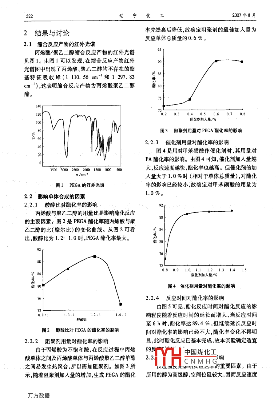 第36卷第8期遼寧化工Vol 36. No 82007年8月Liaoning Chemical IndustryAugust, 2007丙烯酸聚乙二醇單酯的合成研究李先紅,李淑琴襄樊學(xué)院化學(xué)與生物科學(xué)系,湖北襄樊441053)摘要:以聚乙二醇-200與丙烯酸直接縮合反應(yīng),在不加有毒帶水劑的條件下合成了丙烯酸聚乙二醇單酯。探討影響縮合反應(yīng)酯化率的因素確定酯化反應(yīng)的最偉條件丙烯酸與PEC200的摩爾比為12:1.0,反應(yīng)溫度是110~140℃,阻聚劑對苯二酚為0.6%(以醇酸總質(zhì)量計),反應(yīng)時間為6h,催化劑對甲苯磺酸為1.0%(以醇酸總質(zhì)量計),產(chǎn)率達(dá)89.4%關(guān)鍵詞:丙烯酸聚乙二醇單酯;合成;聚乙二醇;丙烯酸中圖分類號:TQ325文獻(xiàn)標(biāo)識碼:A文章編號:1004-0935(2007)08-0521-03聚羧酸系高分子分散劑以其優(yōu)良的分散性能丁較理想的反應(yīng)條件在眾多種類分散劑中異軍突起它憑借靜電位阻1實驗部分效應(yīng),在水性介質(zhì)及非水介質(zhì)中均能起到良好的分散穩(wěn)定作用,尤其在陶瓷顏料涂料、造紙建1.1主要原料及儀器筑醫(yī)藥等領(lǐng)域發(fā)揮了重要的作用-3。聚羧酸聚乙二醇(PEG-200),CP,上?;瘜W(xué)試劑公系高分子分散劑的合成單體主要包括(甲基)丙司;丙烯酸,AR,天津市化學(xué)試劑研究所;對甲苯烯酸、聚乙二醇醚接枝不飽和酸而形成的酯、(甲磺酸磺酸,CP,天津市天達(dá)凈化材料精細(xì)化工∫基)烯丙基磺酸鈉等,其中聚乙二醇醚接枝不飽對苯二酚,AR,天津市化學(xué)試劑一廠;集熱式恒溫和酸而形成的酯是決定聚羧酸型高分子分散劑性加熱器與磁力攪拌器,DF=101S型(河南鞏義市能的重要單體。而丙烯酸聚乙二醇單酯(FE-英石谷儀器一廠);傅立葉紅外光譜儀, BrukerGA)是聚乙二醇醚接枝不飽和酸而形成的酯之505型(瑞士 Bruker公司)。。因此開展丙烯酸聚乙二醇單酯的制備研究具1.2實驗步驟有現(xiàn)實意義。在三口瓶中加入一定量的聚乙二醇、對甲苯目前,丙烯酸聚乙二醇單酯一般采用丙烯酸磺酸、對苯二酚。110~120℃時開始加入丙烯與聚乙二醇縮合反應(yīng)制備,為了提高縮合反應(yīng)產(chǎn)酸,滴加完畢后,于120℃恒溫2.5h。將反應(yīng)液率,往往采用帶水劑除去副產(chǎn)品水。但是,由減壓蒸出副產(chǎn)物水,在此溫度下反應(yīng)2h,脫出水于聚乙二醇分子量較大,該縮合反應(yīng)生成的水量分的速度明顯減慢;130℃恒溫,至真空反應(yīng)得出較少,并且水分子與丙烯酸分子和聚乙二醇分子水的量與理論值接近時為反應(yīng)終點(diǎn);在真空條件具有較強(qiáng)的相互作用,因此采用帶水劑帶水困難,下降溫至40℃以下,出料,分離,得到棕黃透明的副產(chǎn)品水較難除去,既降低了丙烯酸聚乙二醇單液體。將此粗產(chǎn)品用5%Na2CO3溶液調(diào)到中酯的產(chǎn)率,又影響了高分子分散劑的性能。為了性,然后用飽和的NaCl溶液洗滌,再用30mL乙提高丙烯酸聚乙二醇單酯的反應(yīng)產(chǎn)率改善的高醚萃取PEGA,分離有機(jī)層,過濾,在低溫下減壓分子分散劑性能。本文采用逐步升溫減壓蒸餾真空王24b得到純的產(chǎn)品的方法除去酯化反應(yīng)副產(chǎn)品水制備丙烯酸聚乙中國煤化工二醇單酯,探討影響縮合反應(yīng)酯化率的因素確定CNMHG522寧化2007年8月2結(jié)果與討論率先提高后降低,故確定阻聚劑的最佳加入量為反應(yīng)單體總質(zhì)量的0.6%2.1縮合反應(yīng)產(chǎn)物的紅外光譜丙烯酸/聚乙二醇縮合反應(yīng)產(chǎn)物的紅外光譜見圖1。由圖1可以發(fā)現(xiàn),在編合反應(yīng)產(chǎn)物紅外光譜圖中出現(xiàn)了丙烯酸、聚乙二醇均不存在的酯基特征吸收蜂(1110.56cm和1297.83cm-),這表明縮合反應(yīng)產(chǎn)物為丙烯酸聚乙二醇60.70.8陽聚劑加入量/%圖3阻聚劑用量對PEGA酯化率的影響22.3催化劑用量對酯化率的影響圖4是用對甲苯磺酸作催化劑時,其用量對PA酯化率的影響。由圖4可知,催化劑加入量越0030002500200015001000500大,反應(yīng)速度越快,酯化率也越高。但催化劑的加入量大于1.0%時(相對于單體總質(zhì)量),對酯化圖1PEGA的紅外光譜率的影響已經(jīng)較小,故確定對甲苯磺酸的用量為2.2影響單體合成的因素1.0%。2.2.1.酸醇比對酯化率的影響丙烯酸與聚乙二醇的用量比是影響酯化反應(yīng)的主要因素。圖2是PEGA酯化率隨丙烯酸與聚乙二醇的比(摩爾比)的變化曲線。從圖2可看出酸醇比為12:1.0時,PEGA酯化率最大。0.80.91.01.11.21.31.41.5保化劑加入量/%圖4催化劑用量對酯化率的影響22.4反應(yīng)時間對酯化率的影響由圖5可見,酯化反應(yīng)時間對酯化反應(yīng)的影.2:1響程度隨著反應(yīng)時間的延長而增大,當(dāng)反應(yīng)時間酸H至6h時,酯化率達(dá)894%,但繼續(xù)延長反應(yīng)時圖2醇酸比對PECA的酯化率的影響間對酯化率的影響已經(jīng)不大,酯化率變化不再明2.2.2阻聚劑用量對酯化率的影響顯,此時酯化反應(yīng)已基本完成,故本實驗確定適宜由于丙烯酸為不飽和酸,在反應(yīng)過程中丙烯的反中國煤化工酸單體之間及丙烯酸單體與丙烯酸聚乙二醇單酯2.2CNMHG響之間易發(fā)生熱聚合,所以需加阻聚劑。如圖3所M面復(fù)是影啊漢應(yīng)還平的重要因素。由于示,隨著阻聚劑加入量的增加,生成PGA的酯化所用的醇為高級醇空間位阻較大,因而反應(yīng)速度第36卷第8期李先紅,等:丙烯酸聚乙二醇單酯的合成研究523較慢。為提高反應(yīng)速率,應(yīng)提高反