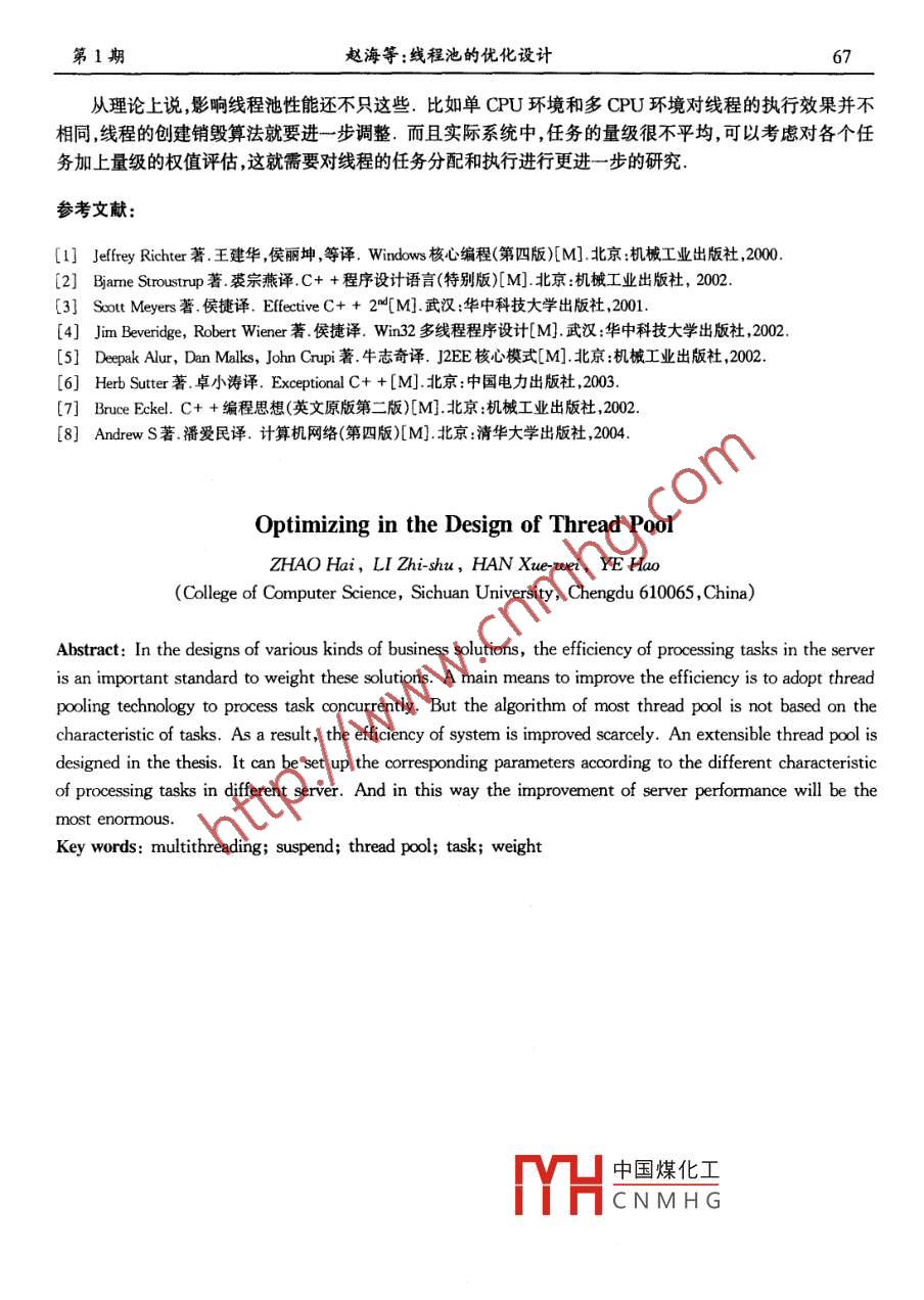 2005年2月四川大學學報(自然科學版)Feb.2005第42卷第1期Journal of Sichuan University (Natural Science Edition)Vol.42 No.1文章編號:0490-6756(2005)01-0063-05線程池的優(yōu)化設計趙海,李志蜀,韓學為,葉浩(四川大學計算機學院,成都610064)摘要:在各種業(yè)務解決方案的設計中,服務器處理任務的效率是衡量方案優(yōu)劣的一個重要標準.使用線程池技術(shù)并發(fā)處理任務是提高服務器效率的一個主要手段.在幾乎所有線程池的設計中,線程的算法都沒有根據(jù)線程所要執(zhí)行的任務特點進行調(diào)整,導致實際使用過程中的效率并不高.作者設計了一個通用的線程池,并且可以根據(jù)不同任務的特點,調(diào)整線程池參數(shù),最大幅度地提高系統(tǒng)性能.關鍵詞:多線程;阻塞;線程池;任務;量級中圖分類號:TP391文獻標識碼:A1引言在各種業(yè)務解決方案的設計過程中,服務器處理任務的效率往往決定了方案的成敗.使用線程池技術(shù)處理任務是提高服務器效率的主要手段,它提高了對服務器資源的利用,使得任務可以并發(fā)處理.線程池是預先創(chuàng)建線程的一種技術(shù). 線程池在還沒有任務到來之前,創(chuàng)建-定數(shù)量(N1)的線程 ,放人空閑隊列中.這些線程都是處于睡眠(Sleep)狀態(tài),不消耗CPU,但占用較小的內(nèi)存空間.當任務到來后,緩沖池給次任務分配-個空閑線程,把任務傳人此線程中運行.當N1個線程都在處理任務后,緩沖池自動創(chuàng)建- -定數(shù)量的新線程,用于處理更多的任務.當系統(tǒng)比較空閑時,大部分線程都一直處于暫停狀態(tài),線程池自動銷毀-部分線程,回收系統(tǒng)資源.在大多數(shù)情況下,不同業(yè)務中服務器處理的任務的特點都是不相同的.如果單個任務很復雜卻采用一個線程處理多個任務的策略,那么單個任務在處理過程中會因為長時間占用-一個線程 ,而延長任務的響應速度.如果單個任務比較簡單卻采用一個線 程處理一個任務的策略,那么頻繁的給任務分配線程也會導致系統(tǒng)利用率降低.線程池的設計,不僅要實現(xiàn)線程的分配功能,還要根據(jù)任務特點調(diào)整分配過程的分配算法,增加可移植性,減少重復開發(fā).設計中需要考慮的重點是:(1)任務對象的通用性; (2)線程創(chuàng)建和銷毀策略;(3)任務的分配策略.2算法分析與設計2.1任 務對象的通用性不同的業(yè)務解決方案有各自獨特的任務處理方法,任務的劃分上也就千差萬別.為了使得在處理任務對象時達到一定程度的通用性,任務對象的設計必須與實際任務的處理邏輯完全無關.從任務執(zhí)行的角度看,任務不過是處理流程的一次或多次的執(zhí)行過程,可中國煤化工class Task°TYHCNMHG收稿日期:2004-07-01作者簡介:趙海(1981 - ) ,男,2003級碩士研究生.54四川大學學報(自然科學版)第42卷{public:Task();virtual ~ Task();virtual bool run() = 0;};Task類是所有任務類的基類,其中的純虛函數(shù)run( )是任務流程的人口,工作線程在處理任務的時候就從此處開始執(zhí)行任務的處理流程.設計--個新的任務時,只需要繼承Task接口,新的任務就可以放入線程池中執(zhí)行.任務的創(chuàng)建、執(zhí)行和銷毀設計:(1)任務在其需要的時候才創(chuàng)建,任務的創(chuàng)建通過new操作,動態(tài)創(chuàng)建具體的任務對象,然后傳人線程池,由線程池自動分配線程來執(zhí)行此任務;(2)任務是否執(zhí)行完畢由其自身來決定,一個未知任務什么時候執(zhí)行完畢是不可能預測的,必須由任務本身來決定,這個策略通過Task: :run()的返回值來實現(xiàn).當工作線程執(zhí)行一次任務時,如果返回值為true, 表示任務執(zhí)行完畢,就用delete操作銷毀此任務;如果返回值為false,表示任務需要執(zhí)行的工作并未完成,繼續(xù)執(zhí)行此任務.這樣的策略,使得在設計新的任務處理流程時,不需要過多的關心任務的接口規(guī)范,只需要在新任務類的構(gòu)造函數(shù)中初始化各種資源,在新任務類的析構(gòu)函數(shù)中回收資源,在run()方法中實現(xiàn)主要的處理邏輯,那么新的任務類即可在線程池中執(zhí)行.2.2線程的創(chuàng)建與銷毀分析線程緩沖池中的維持線程數(shù)量按照任務處理的需求來定.在緩沖池剛剛建立時,線程池中有一定數(shù)量(N;)的已創(chuàng)建好的線程,這樣可以使得新任務可以及時的得到執(zhí)行.比如,某客戶端在向服務器發(fā)送登陸請求時,這樣一個請求使得服務器通常需要創(chuàng)建好幾個相互有關聯(lián)的任務.也就是說,客戶端與服務器端的-次交互,通常會產(chǎn)生- -定數(shù)量的任務.根據(jù)一個服務器所處理的業(yè)務,估計出平均情況下,- -次業(yè)務產(chǎn)生的任務數(shù)量N2.那么N1應該是N2的整數(shù)倍, N;= N2 X n,減少由于線程不夠而再創(chuàng)建線程的概率,才能使得服務器在業(yè)務處理初期最為高效.在線程緩沖池中的所有線程都處于繁忙狀態(tài)的時候,線程池就會創(chuàng)建新的線程(設創(chuàng)建N3個).由以上分析,為了減少由于線程不夠而再創(chuàng)建線程的概率,N3也應該是N2的整數(shù)倍,N3=N2X n2.當服務器業(yè)務減少,出現(xiàn)大量線程閑置的情況,就應該銷毀-部分線程.很顯然,這里應該使用超時策略,當某些線程在超過時間T仍然處于閑置狀態(tài),就銷毀一部分 空閑線程.設銷毀Ns個空閑線程,為了減少由于線程不夠而再創(chuàng)建線程的概