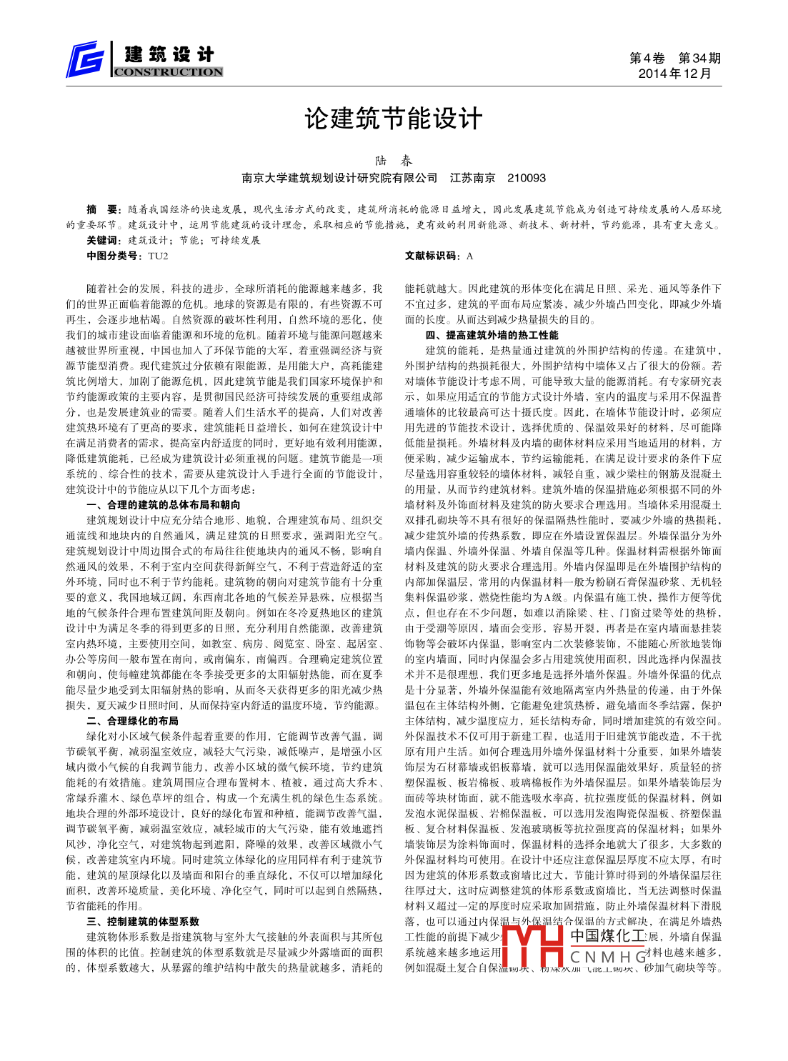 后L建筑設(shè)計第4卷第34期CONSTRUCTION2014年12月論建筑節(jié)能設(shè)計陸春南京大學(xué)建筑規(guī)劃設(shè)計研究院有限公司江蘇南京210093摘要:隨著我國經(jīng)濟的快速發(fā)展,現(xiàn)代生活方式的改變,建筑所消耗的能源日益増大,因此發(fā)展建筑節(jié)能成為創(chuàng)造可持續(xù)發(fā)展的人居環(huán)境的重要環(huán)節(jié)。建筑設(shè)計中,運用節(jié)能建筑的設(shè)計理念,采取相應(yīng)的節(jié)能措施,更有效的利用新能源、新技術(shù)、新材料,節(jié)約能源,具有重大意義關(guān)鍵詞:建筑設(shè)計;節(jié)能;可持續(xù)發(fā)展中圖分類號:TU2文獻標識碼:A隨著社會的發(fā)展,科技的進步,全球所消耗的能源越來越多,我能耗就越大。因此建筑的形體變化在滿足日照、采光、通風(fēng)等條件下們的世界正面臨著能源的危機。地球的資源是有限的,有些資源不可不宜過多,建筑的平面布局應(yīng)緊湊,減少外墻凸凹變化,即減少外墻再生,會逐步地枯竭。自然資源的破壞性利用,自然環(huán)境的惡化,使面的長度。從而達到減少熱量損失的目的我們的城市建設(shè)面臨著能源和環(huán)境的危機。隨著環(huán)境與能源問題越來四、提高建筑外墻的熱工性能越被世界所重視,中國也加人了環(huán)保節(jié)能的大軍,著重強調(diào)經(jīng)濟與資建筑的能耗,是熱量通過建筑的外圍護結(jié)構(gòu)的傳遞。在建筑中源節(jié)能型消費。現(xiàn)代建筑過分依賴有限能源,是用能大戶,高耗能建外圍護結(jié)構(gòu)的熱損耗很大,外圍護結(jié)構(gòu)中墻體又占了很大的份額。若筑比例增大,加劇了能源危機,因此建筑節(jié)能是我們國家環(huán)境保護和對墻體節(jié)能設(shè)計考慮不周,可能導(dǎo)致大量的能源消耗。有專家硏究表節(jié)約能源政策的主要內(nèi)容,是貫徹國民經(jīng)濟可持續(xù)發(fā)展的重要組成部示,如果應(yīng)用適宜的節(jié)能方式設(shè)計外墻,室內(nèi)的溫度與采用不保溫普分,也是發(fā)展建筑業(yè)的需要。隨著人們生活水平的提高,人們對改善通墻體的比較最高可達十?dāng)z氏度。因此,在墻體節(jié)能設(shè)計時,必須應(yīng)建筑熱環(huán)境有了更高的要求,建筑能耗日益増長,如何在建筑設(shè)計中用先進的節(jié)能技術(shù)設(shè)計,選擇優(yōu)質(zhì)的、保溫效果好的材料,盡可能降在滿足消費者的需求,提高室內(nèi)舒適度的同時,更好地有效利用能源,低能量損耗。外墻材料及內(nèi)墻的砌體材料應(yīng)采用當(dāng)?shù)剡m用的材料,方降低建筑能耗,已經(jīng)成為建筑設(shè)計必須重視的問題。建筑節(jié)能是一項便采購,減少運輸成本,節(jié)約運輸能耗,在滿足設(shè)計要求的條件下應(yīng)系統(tǒng)的、綜合性的技術(shù),需要從建筑設(shè)計入手進行全面的節(jié)能設(shè)計,盡量選用容重較輕的墻體材料,減輕自重,減少梁柱的鋼筋及混凝土建筑設(shè)計中的節(jié)能應(yīng)從以下幾個方面考慮的用量,從而節(jié)約建筑材料。建筑外墻的保溫措施必須根據(jù)不同的外合理的建筑的總體布局和朝向墻材料及外飾面材料及建筑的防火要求合理選用。當(dāng)墻體采用混凝土建筑規(guī)劃設(shè)計中應(yīng)充分結(jié)合地形、地貌,合理建筑布局、組織交雙排孔砌塊等不具有很好的保溫隔熱性能時,要減少外墻的熱損耗通流線和地塊內(nèi)的自然通風(fēng),滿足建筑的日照要求,強調(diào)陽光空氣。減少建筑外墻的傳熱系數(shù),即應(yīng)在外墻設(shè)置保溫層。外墻保溫分為外建筑規(guī)劃設(shè)計中周邊圍合式的布局往往使地塊內(nèi)的通風(fēng)不暢,影響自墻內(nèi)保溫、外墻外保溫、外墻自保溫等幾種。保溫材料需根據(jù)外飾面然通風(fēng)的效果,不利于室內(nèi)空間獲得新鮮空氣,不利于營造舒適的室材料及建筑的防火要求合理選用。外墻內(nèi)保溫即是在外墻圍護結(jié)構(gòu)的外環(huán)境,同時也不利于節(jié)約能耗。建筑物的朝向?qū)ㄖ?jié)能有十分重內(nèi)部加保溫層,常用的內(nèi)保溫材料一般為粉刷石膏保溫砂漿、無機輕要的意義,我國地域遼闊,東西南北各地的氣候差異懸殊,應(yīng)根據(jù)當(dāng)集料保溫砂漿,燃燒性能均為A級。內(nèi)保溫有施工快,操作方便等優(yōu)地的氣候條件合理布置建筑間距及朝向。例如在冬冷夏熱地區(qū)的建筑點,但也存在不少問題,如難以消除梁、柱、門窗過梁等處的熱橋設(shè)計中為滿足冬季的得到更多的日照,充分利用自然能源,改善建筑由于受潮等原因,墻面會變形,容易開裂,再者是在室內(nèi)墻面懸掛裝室內(nèi)熱環(huán)境,主要使用空間,如教室、病房、閱覽室、臥室、起居室、飾物等會破壞內(nèi)保溫,影響室內(nèi)二次裝修裝飾,不能隨心所欲地裝飾辦公等房間一般布置在南向,或南偏東,南偏西。合理確定建筑位置的室內(nèi)墻面,同時內(nèi)保溫會多占用建筑使用面積,因此選擇內(nèi)保溫和朝向,使每幢建筑都能在冬季接受更多的太陽輻射熱能,而在夏季術(shù)并不是很理想,我們更多地是選擇外墻外保溫。外墻外保溫的優(yōu)點能盡量少地受到太陽輻射熱的影響,從而冬天獲得更多的陽光減少熱是十分顯著,外墻外保溫能有效地隔離室內(nèi)外熱量的傳遞,由于外保損失,夏天減少日照時間,從而保持室內(