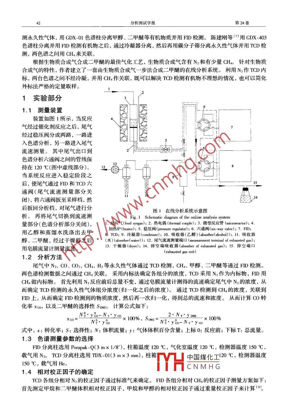 第24卷第3期分析測試學報Vol 24 No. 3005年5月ENXI CESHI XUEBAO(oumal of Instrumental analysis生物質合成氣一步法合成二甲醚的在線分析系統(tǒng)魯皓12,付嚴,常杰(1.中國科學院廣州能源研究所,廣東廣州510640;2.中國科學院研究生院,北京10009摘要:建立了一套由生物質合成氣一步法制取二甲醚的在線分析系統(tǒng)。針對生物質合成氣一步法合成二甲醚特征,采用兩臺分別裝有TC和FD檢測器的色譜儀分析反應產物。利用原料氣中N2作為內標物,來確定TCD上檢測到的水久性氣體組分濃度;通過CH4作內標物,來確定FID上檢測到的有機物組分濃度。T℃CD和FID之間通過CH4來關聯(lián),從而確定反應產物中主要組分的濃度。該系統(tǒng)在壓力3MPa,溫度250℃,空速(流速與催化劑體積的比值分別為1000、2000、3000h的條件下用C306和HZSM5催化劑進行評價測試,發(fā)現(xiàn)系統(tǒng)分析效果好,重復性高,并且反應前后主產物碳平衡到達90%以上。關鍵詞:生物質;二甲醚;合成;在線分析系統(tǒng);氣相色譜中圖分類號:0657.71;0658文獻標識碼:A文章編號:1004-4957(2005)03-0041-04An Online Analysis System for Direct Synthesis of Dimethyl Ether fromBiomass SyngasLU Hao. 2. FU Yan. CHANG Jie(1. Guangzhou Institute of Energy Conversion, Chinese Academy of Sciences, Guangzhou 510640.China2. Graduate School of the Chinese Academy of Sciences, Beijing 100039, China)Abstract: An online analysis system was established for direct synthesis of dimethyl ether(DME)frombiomass syngas that contains N2 and CHa besides CO, H2 and CO2. Two gas chromatographs(GCs)connectedquentially were used for online analysis. One gC was equipped with a tcd detector and a TDX-01 columnused to separate N2, CO, CH4, and CO2. The other GC was equipped with an Fid detector and a PorapakQ column used to separate CH4, CHOH, DME and light hydrocarbons. N2 and CH in the syngas were useas intemal standard in TCD and FID, respectively. The data from two GCs were related by CHa. The tubingfrom the catalyst bed to the GCs was heated at 120C so as to avoid any condensation of the products. Thesystem was tested, and the industrial methanol catalyst C306 and dehydration catalyst HZSM-5 were used inthe experiments. With a temperature of 250C, pressure of 3 MPa, and GHSV of 1 000, 2 000, and 3000h", the carbon balance of main components between the reactants and products were 92%,98% and919, respectively. At GHSV of 3 000 -, the relative standard deviation was less than 4%Key words: Biomass; Dimethyl ether; Synthesis; Online analysis system; Gas chromatograph生物質是一種重要的可再生能源,而且在其生產和利用過程中可以降低大氣中溫室氣體二氧化碳的積累。隨著石油天然氣儲量的逐漸減少以及近年來環(huán)境保護的壓力,利用熱化學方法從生物質中獲得液體燃料的研究日益受到重視。二甲醚(DME)是一種重要的化工產品,可作為發(fā)泡劑、制冷劑、民用潔凈燃料和發(fā)動機燃料以及重要的化工中間產品。目前二甲醚生產工藝一般有兩步法和一步法兩種。一步法合成具有流程短、投資少、能耗低的優(yōu)點,而且可以獲得較高的單程轉化率,因而越來越受到重視2我國是一個農業(yè)大國,通過生物質氣化合成氣一步法制取二甲醚具有高效率、低成本等優(yōu)點。其主要過程如下:生物質預處理、熱處理、氣體凈化、氣體重整、一步法二甲醚合成以及分離等。在二甲醚合成研究中,產物的檢測至關重要。梁宇等3提出一種用串接反應色譜法來研究甲醇氣相脫水制取二甲醚的色譜分析流程,可以一次性定量分析氣V山中國煤化工用并行的PplQ和TDX-01色譜柱來分離CO2加氫制取二甲醚的產物,分CNMHGCO加氫制取二甲醚的檢測,用單一的 Porapak-Q分離和TCD檢測。葛慶杰等利用mx01色譜柱分離并用TCD來檢收稿日期:2004-05-21;修回日期:2005-01-25基金項目:廣東省科技計劃項目(200383083);國家“863”計劃項目(2002AA51400)芳秀數(shù)擂(9=,.男,湖北孝感人,土研究生:常杰,聯(lián)系人,1:0280ym,E-m由mmp分析測試學報第24卷測永久性氣體,用GDX-01色譜柱分離甲醇、二甲醚等有機物質并用FID檢測。陳建剛等”用CDX-403色譜柱分離并用FID檢測有機物之后,通過冷凝器分離,然后再用碳分子篩分離永久性氣體并用TCD檢測,兩色譜之間用CH4來關聯(lián)根據(jù)生物質合成氣合成二甲醚的最佳氣化工藝,生物質合成氣含有N2和有少量CH4針對生物質合成氣的特性,作者建立了一套由生物質合成氣一步法合成二甲醚的在線分析系統(tǒng)。利用N2作TCD內標,兩臺色譜之間不經冷凝,并用CH4作關聯(lián),既可以解決TCD檢測有機物不理想的情況,也可以簡化外標法嚴格的定量取樣。1實驗部分1.1測量裝置裝置如圖1所示,當反應氣經過催化劑反應之后,尾氣經過穩(wěn)壓閥分成兩路,一路進入色譜分析,另一路進入尾氣流速測量。其中尾氣出口到色譜分析六通閥之間的管線保持在120℃(圖中虛線部分)。③當系統(tǒng)反應進入穩(wěn)定階段之后,使尾氣通過FID和TCD六通閥(尾氣流速測量部分關閉),將六通閥扳至采樣檔,然后扳回分析檔,對尾氣進行分圖1在線分析系統(tǒng)示意圖析。再將尾氣切換到流速測Fig 1 Schematic diagram of the online analysis system量部分(色譜分析部分關閉),1.反應氣( eed syngas):2.熱電偶( ( thermal cor);3.微型反應管( microreactor);4用乙醇和蒸餾水洗滌出去甲加熱爐( heater);5.穩(wěn)壓閥( pressure regulator);6.六通閥( six-way valve);7.FID8.TCD;9.冷凝器( condenser);10.吸收器(乙醇)( absorber( alcohol);1l.吸收器醇、二甲醚,經過干燥器之后(水)( absorber(wlr);12.