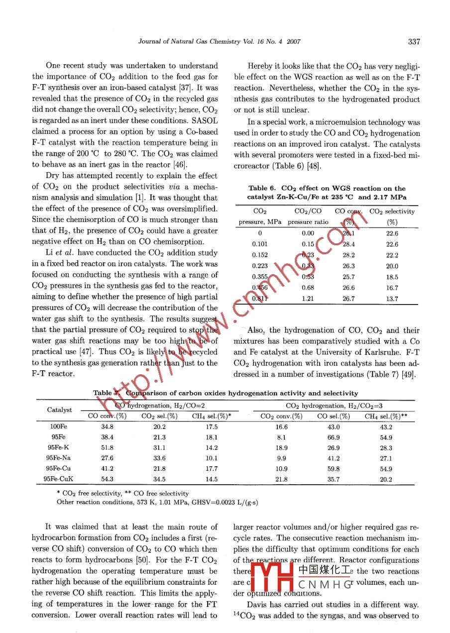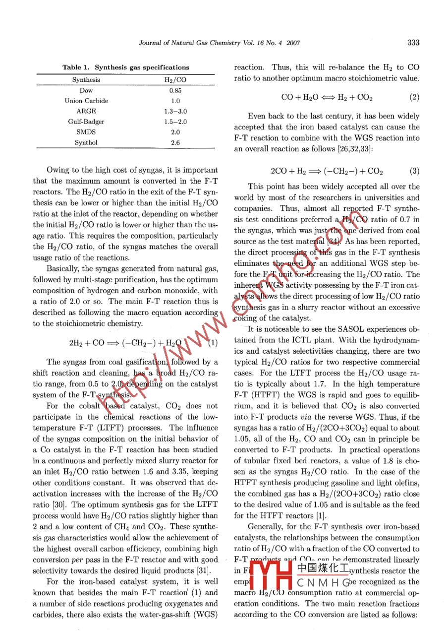Availableonlineatwww.sciencedirect.comScienceDirect圖Journal of Natural Gas Chemistry 16(2007)329-341SCIENCE PRESSReviewInfluence of the Feed Gas Composition on the Fischer-TropschSynthesis in Commercial OperationsYijun lu’, Theo LeeR&D Center, Headwaters Technologies Innovation Group, 1501 New York Avenue, Trenton, New Jersey, USAI Manuscript received July 9, 2007; revised September 13, 2007 1Abstract: Key technical challenges relating to theYijun Lu was born in 1972. HeFischer-Tropsch(F-T)synthesis applied in the commer-received his chemical engineering/gas-to-liquids(CTL/GTL)teademic of Sciences(CAS) ingies have been reviewed. Based on the experiences ac-1999. He was assistant and ascumulated from pilot plant, semi-work test and lab re-sociate professor of the Institutesearches, the influences of the H2/Co ratio and the cOof Coal Chemistry, CAS in 2000in the feed gas on the F-T process as well as on CTL/GTLand from 2001 moved to the hydrorbon Technologies Incorporation,complex in terms of product yields, energy efficiency andUSA, to become a research engi-carbon utilization efficiency have been studied. Beingneer and project designer of the In-contrary to the current design schemes for F-T processusing the coal derived syngas and the iron-based cata-esearch activity was focused on thelyst, it is suggested to feed the F-T synthesis unit with a Fischer- Tropsch catalysis, the core process engineering ofsyngas having a H2/CO ratio of 0.5 and then adjusting gas-liquid-solid reaction, petroleum product characterizato 1. 4 via the recycling process. As a result, the carbontion and upgrading processes. He has invented the novelslurry F-T synthesis catalyst, entitle as skeletal iron basedefficiency of the whole plant could be reached to as highcatalyst. His work was witnessed by 8 US and Chinese50%. For the issue of CO2 addition to the feed gaspatents and 20 more publicationsit is proved that only a diluting role is played under theDr. Theo L.k. Lee is vice presicurrent commercial slurry phase F-T processdent and Chief Technology oficerKey words: Fischer-Tropsch synthesis; gas-to-liquidfeed gas composition; carbon efficienbility Company. He is responsiblefor the development and promoting of Headwaters'coal-to-diquids1. Introduction(CTL) technology. He leads a CTLproject development team and a de-sign/engineering group in evaluatOil supply security and price concerns have leding CTL project opportunity in theto a renewed interest in coal and natural gas as alUnited States and asian countriesHe has his bachelor of chemicalternative feedstocks for the production of transportfuels and chemicals. Synfuels derived from naturalUniversity (Taiwan) and his doctoral degree also in chemical engineering degree from Uni-gas, coal and biomass can also improve air quallty. versity of New Brunswick. He has conducted research andto-liquids(GTL), the world has stepped into a huge bon zi opment in heavy oil and adsorption of light hydrocar-By using natural gas conversion technologies, gas-中國(guó)煤化工mre8ddm水a(chǎn)nd promising synfuel production commercializationAnother well-known energy conversion route, coal-to- facticCNMHGeer direct kcna liquequids, describes both coal gasification and Fischer- He led the designing work of a 1000 t/y capacity of gtlTropsch(F-T) synthesis to produce liquid fuels to direct/indirect coal liquefaction techiCorrespondingauthorTel:001-609-807-9308;Fax:001-609-807-9320or9334;E-mail:yijunlv@yahoo.comYijun Lu et al. Journal of Natural Gas Chemistry Vol. 16 No. 4 2007(indirect CTL). And there are also the less developed, owned 2000 more patentsdirect coal liquefaction technologies. As has been pub-In the race of alternative energy commercializa-lished, the world s vast coal resources could become an tion, apparently the countries that have owned hugeimportant alternative to crude oil via the CTL routes. coal or natural gas resources are in the technologyThe F-T synthesis, first developed in Germany dur- frontiers. According to the published data, it can being the early decades of the 20th century, has been listed briefly here for the current status of the F-Tfurther developed and improved in South Africa by technology development as well as for the ICTL/GTLSASOL. Since the 1950,'s, 40 million tons of coal per commercial projects world widerear have been converted into 160,000 barrels per day . Chinaor crudeoil equivalent [1]Starting from the biggest investor, China(theFor any conversion routes, including the indirect ShenHua Group) is constructing a 60,000 bpd(di-coal-to-liquid(ICTL)and GTL technologies, the first rect)CTl plant and, with plans for further projects,step is to generate cleaned synthesis gas and followed aims to produce one million barrels per day by 2020by F-T synthesis, in which the two main characteris- China also has signed MOU with SASOL for a simi-tics are the unavoidable production of a wide range lar scaled ICTL plant in northwest China. SASOL isof hydrocarbon products and the liberation of a large considering the building of two CTL plants in Chinaamount of heat from the highly exothermic synthesis at a total cost of S14 billion. As a domestic repre-reactions. Product selectivities are influenced by tem- sentative technology vendor, the Shanxi Institute ofperature, feed gas composition(H2/Co), pressure, Coal Chemistry, Chinese Academy of Sciences(ICCand catalyst type 2CAS) dominates most of the F-T process researchersOver the years, four types of F-T reactors have and pilot plant experiences, covering from the fixedbeen designed and used commercially. The fixed bed bed reactor technology to the slurry ones [101tubular reactor, known as the ARGe reactor, oper-. USAates at 220-260C and 2-3 MPa. The high tempera-In the US, new incentives have been introducedture circulating fluidized bed reactors, known as Syn- for coal-based transport fuels, and coal companiesthol reactors, have been developed for gasoline andlight olefin production. Decades ago, 