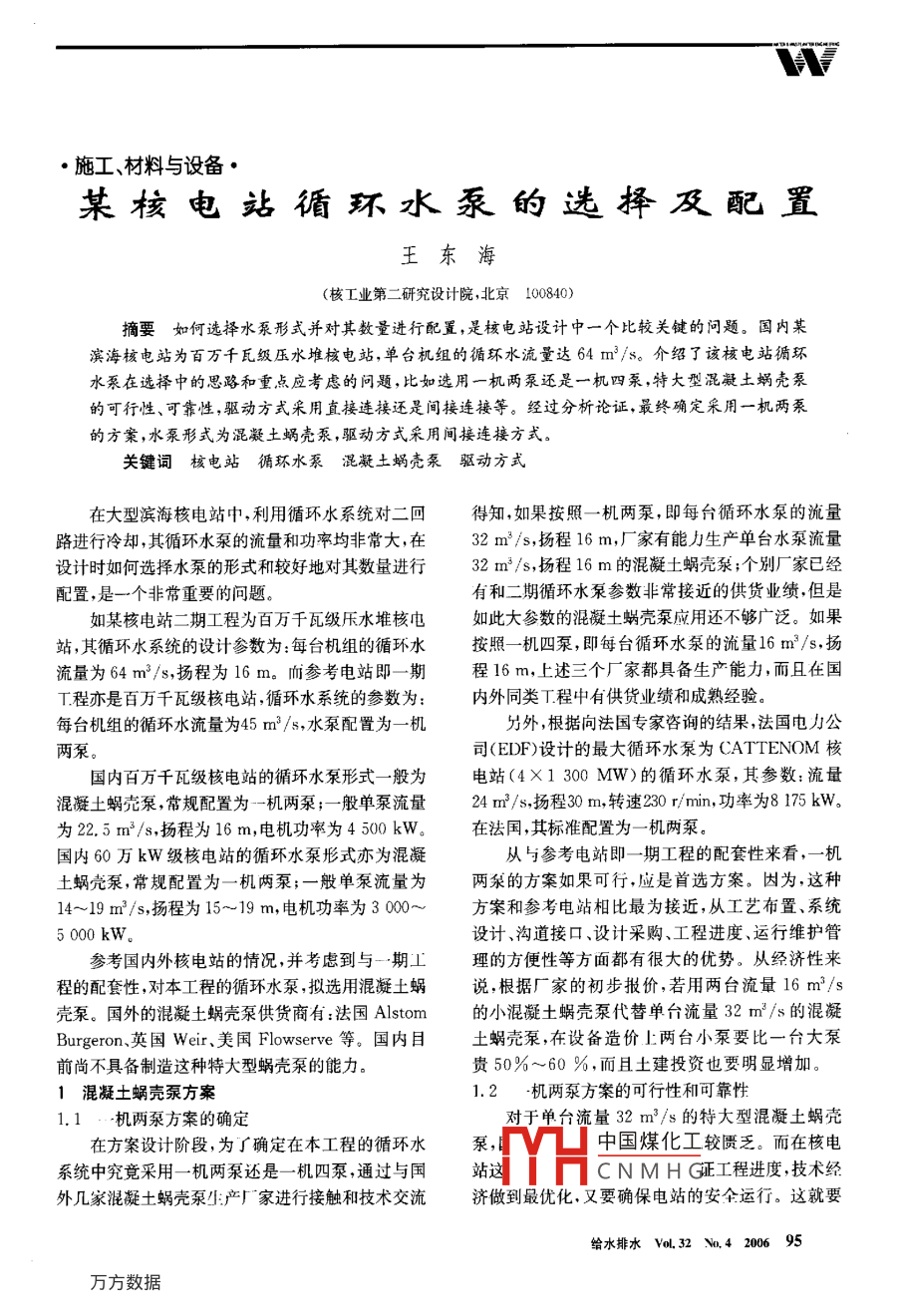 Av施工、材料與設(shè)備·某核電站循環(huán)水泵的選擇及配置王東海(核工業(yè)第二研究設(shè)計院,北京100840)摘要如何選擇水泵形式并對其數(shù)量進行配置,是核電站設(shè)計中一個比較關(guān)鍵的問題。國內(nèi)某濱海核電站為百萬千瓦級壓水堆核電站,單臺杋組的循環(huán)水流量達(dá)64m3/s。介紹了該核電站循環(huán)水泵在選擇中的思路和重點應(yīng)考慮的問題,比如選用一機兩泵還是一機四泵,特大型混凝土蝸殼泵的可行性、可靠性,驅(qū)動方式采用直接連接還是間接連接等。經(jīng)過分析論證,最終確定采用一機兩泵的方案,水泵形式為混凝土蝸殼泵,驅(qū)動方式采用間接連接方式。關(guān)鍵詞核電站循環(huán)水系混凝土蝸殼泵驅(qū)動方式在大型濱海核電站中,利用循環(huán)水系統(tǒng)對二回得知如果按照一機兩泵,即每臺循環(huán)水泵的流量路進行冷卻,其循環(huán)水泵的流量和功率均非常大,在32m3/s,揚程16m,廠家有能力生產(chǎn)單臺水泵流量設(shè)計時如何選擇水泵的形式和較好地對其數(shù)量進行32m3/s,揚程16m的混凝土蝸殼泵;個別廠家已經(jīng)配置,是一個非常重要的問題。有和二期循環(huán)水泵參數(shù)非常接近的供貨業(yè)績,但是如某核電站二期工程為百萬千瓦級壓水堆核電如此大參數(shù)的混凝土蝸殼泵應(yīng)用還不夠廣泛。如果站,其循環(huán)水系統(tǒng)的設(shè)計參數(shù)為:每臺機組的循環(huán)水按照一機四泵,即每臺循環(huán)水泵的流量16m3/s,揚流量為64m3/s,揚程為16m。而參考電站即一期程16m,上述三個廠家都具備生產(chǎn)能力,而且在國工程亦是百萬千瓦級核電站循環(huán)水系統(tǒng)的參數(shù)為:內(nèi)外同類丁程中有供貨業(yè)績和成熟經(jīng)驗每臺機組的循環(huán)水流量為45m23/s,水泵配置為一機另外,根據(jù)向法國專家咨詢的結(jié)果,法國電力公兩泵司(EDF)設(shè)計的最大循環(huán)水泵為 CATTENOM核國內(nèi)百萬千瓦級核電站的循環(huán)水泵形式一般為電站(4×1300MW)的循環(huán)水泵,其參數(shù):流量混凝土蝸殼泵,常規(guī)配置為一機兩泵;一般單泵流量24m/s揚程30m,轉(zhuǎn)速230r/min,功率為8175k為22.5m3/s揚程為16m,電機功率為4500kW在法國,其標(biāo)準(zhǔn)配置為一機兩泵國內(nèi)60萬kW級核電站的循環(huán)水泵形式亦為混凝從與參考電站即一期工程的配套性來看,一機土蝸殼泵,常規(guī)配置為一機兩泵;一般單泵流量為兩泵的方案如果可行,應(yīng)是首選方案。因為,這種14-~19m3/s,揚程為15~19m,電機功率為300~方案和參考電站相比最為接近,從工藝布置、系統(tǒng)5000kW。設(shè)計、溝道接口、設(shè)計采購、工程進度、運行維護管參考國內(nèi)外核電站的情況,并考慮到與一期理的方便性等方面都有很大的優(yōu)勢。從經(jīng)濟性來程的配套性,對本工程的循環(huán)水泵,擬選用混凝土蝸說,根據(jù)廠家的初步報價,若用兩臺流量16m3/s殼泵。國外的混凝土蝸殼泵供貨商有:法國Asom的小混凝土蝸殼泵代替單臺流量32m2/s的混凝Burgeon、英國weir、美國 Flowserve等。國內(nèi)目土蝸殼泵,在設(shè)備造價上兩臺小泵要比一臺大泵前尚不具備制造這種特大型蝸殼泵的能力。貴50%~60%,而且土建投資也要明顯增加1混凝土蝸殼泵方案1.2機兩泵方案的可行性和可靠性1.1機兩泵方案的確定對于單臺流量32m3/s的特大型混凝土蝸殼在方案設(shè)計階段,為∫確定在本工程的循環(huán)水泵中國煤化工較匱乏。而在核電系統(tǒng)中究竟采用一機兩泵還是一機四泵通過與國站過CNMHG工程進度,技術(shù)經(jīng)外幾家混凝土蝸殼泵生產(chǎn)廠家進行接觸和技術(shù)交流濟做到最優(yōu)化,又要確保電站的安全運行。這就要給水排水Vo.32Y4200695求我們必須從理論和實際生產(chǎn)能力上對其可行性和mm的軸可靠性進行論證(3)功率。二期循環(huán)水泵的軸功率為5700kW1.2.1一期循環(huán)水泵參數(shù)國外的蝸殼泵廠曾生產(chǎn)過單臺功率達(dá)8000kW的單臺流量2248m3/s,揚程16m轉(zhuǎn)速161.4r/min,電機。功率4000kW,效率91%。(4)業(yè)績方面。根據(jù)日前掌握的情況,法國廠n=3.65n4=349家曾為韓國KNU核電站提供過的最大混凝土蝸殼泵參數(shù):流量為30.9m3/s,揚程為15.05m,功率式中n—比轉(zhuǎn)數(shù);5300kW,共4臺。該泵運轉(zhuǎn)18年來一直良好,幾Q—流量,m3/乎沒有任何維修。與本工程的循環(huán)水泵參數(shù)非常接H—揚程,m;近n——轉(zhuǎn)速,r/min根據(jù)設(shè)計院的要求,蝸殼泵廠家提供了滿足本期循環(huán)水泵參數(shù)L程設(shè)計參數(shù)的蝸殼泵性能曲線和水泵布置圖。本單臺流量32m/s,揚程16m。通過調(diào)整水泵程循環(huán)水泵的性能曲線詳見圖1。根據(jù)水泵的性的轉(zhuǎn)速,使得一期和二期的循環(huán)水泵比轉(zhuǎn)數(shù)基本能曲線,在流量Q=32m3/s,揚程H=16m處,水致。從而使得二期和一期的循環(huán)水泵為相似泵。這泵軸功率P=5700kW,效率n=90%,汽蝕余量樣即可確定二期循環(huán)水泵的轉(zhuǎn)速為135r/minNPSH=6. 4mn=3.65348由丁一期和二期的水泵流量、轉(zhuǎn)速均已知,所以可利用水泵的流量相似定律,對一期的水泵進行放大,求出放大系數(shù)為1.194(代表葉輪直徑的比D2/D1)。根據(jù)功率相似定律,二期循環(huán)水泵的功率P2H(9P1×(D2/D1)5×(n2/m1)3=5700kW。對于水泵效率,由于水泵的放大系數(shù)不大(1.194,未超過2~