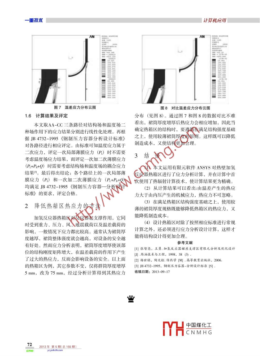 計(jì)算機(jī)應(yīng)用CFHI TECHNOLOGY10.3969/jisn1673-3355.2013.05018熱壁加氫反應(yīng)器熱箱區(qū)有限元應(yīng)力分析盧峰摘要:采用有限元法對熱壁加氫反應(yīng)器熱箱區(qū)進(jìn)行包含熱輻射傳導(dǎo)的非線性有限元應(yīng)力分析,并按照J(rèn)B4732對危險(xiǎn)截面進(jìn)行評定,其評定結(jié)果和應(yīng)用實(shí)踐都說明對熱箱區(qū)部位進(jìn)行非線性有限元分析設(shè)計(jì)是十分必要的關(guān)鍵詞:熱壁加氫反應(yīng)器;熱箱區(qū);應(yīng)力分析中圖分類號:TE966文獻(xiàn)標(biāo)識碼:A文章編號:1673-3355(2013)05-0018-04Finite Element Analysis for Hot Chamber of Hot-wall Hydrogenation Reactor Lu FenAbstract: The paper analyses nonlinear stress of heat radiation and conduction in the hot chamber of hot-wall hydrogenationreactor with finite element analysis (FEA), and evaluates the dangerous section according to JB4732. The evaluation andpractical application indicate that it is necessary to do nonlinear finite element analysis for hot chamber designKey words: Hot-wall hydrogenation reactor: hot chamber; stress analysis熱壁加氫反應(yīng)器是煉油加工中的關(guān)鍵設(shè)備,而式中,h—對流換熱系數(shù)(或稱膜傳熱系數(shù)、給熱熱箱區(qū)是熱壁加氫反應(yīng)器的高應(yīng)力區(qū),上部連接筒系數(shù)、膜系數(shù)等)(W/m2·K);T固體表面體,下部連接封頭及裙座,屬于關(guān)鍵部位。由于熱的溫度(K);T周圍流體的溫度(K)。箱區(qū)是在高溫、高壓且溫差較大的環(huán)境下工作,其熱輻射指物體發(fā)射電磁能,被其它物體吸收并應(yīng)力狀況非常復(fù)雜,既存在由壓力載荷等引起的機(jī)轉(zhuǎn)變?yōu)闊岬臒崃拷粨Q過程。物體溫度越高,單位時(shí)械應(yīng)力,又存在由溫差載荷引起的熱應(yīng)力,屬于復(fù)間內(nèi)輻射的熱量也越多。熱傳導(dǎo)和熱對流都需要有雜的熱-結(jié)構(gòu)的耦合應(yīng)力分析。在熱-結(jié)構(gòu)的耦合傳熱介質(zhì),而熱輻射無須任何介質(zhì)。實(shí)質(zhì)上,在真應(yīng)力分析中,熱分析又是重中之重空中的熱輻射效率最高。在工程中通常考慮兩個(gè)或熱分析中的熱傳遞方式有三種:熱傳導(dǎo)、熱對兩個(gè)以上物體之間的輻射,系統(tǒng)中每個(gè)物體同時(shí)輻流及熱輻射。熱傳導(dǎo)可以定義為完全接觸的兩個(gè)物射并吸收熱量。體之間或一個(gè)物體的不同部分之間由于溫度梯度而熱輻射遵循斯蒂芬一波爾茲曼方程引起的內(nèi)能交換。q=eoA Fi2(T1-T2)(3)熱傳導(dǎo)遵循付里葉定律:式中,q—熱流率;ε—輻射率(黑度),它介于0(1)之間;σ-斯蒂芬-波爾茲曼常數(shù),約為567×10W/m2·K4;Ar輻射面1的面積式中,q熱流密度(Wm;k導(dǎo)熱系數(shù)(Whm·K)(mm2);F2由輻射面1到輻射面2的形狀”號—熱量流向溫度降低的方向系數(shù);T一輻射面1的絕對溫度(K);T2為熱對流是指固體表面與它周圍所接觸的流體之輻射面2的絕對溫度(K)。間由于存在溫差而引起的熱量交換。熱對流可以分由方程可知含有熱輻射的分析是高度非線性的為自然對流和強(qiáng)制對流。其中的黑度(輻射率)反映著物體在輻射能力方面其中,熱對流遵循牛頓冷卻方程接近黑體的程度,是輻射換熱中的重要參數(shù)。在相(2)中國煤化工1.一重集團(tuán)大連設(shè)計(jì)研究院有限公司工程師大連116600CNMHG2013年第5期總155期CFHI重技朮一計(jì)算機(jī)應(yīng)用同的溫度下,以黑體的輻射率為最大;物體表面的精度。輻射率(即黑度)在數(shù)值上等于該表面對來自同溫度的投入輻射的吸收率。因此,一切輻射率高的物熱箱區(qū)應(yīng)力分析計(jì)算及評定體都具有高的吸收力。黑體的黑度等于1.0;各種實(shí)際物體的黑度都在0~1.0之間。1.1熱壁加氫反應(yīng)器結(jié)構(gòu)及主要技術(shù)參數(shù)由于受到計(jì)算機(jī)軟件及硬件的制約,以往熱箱本文以某煉廠熱壁加氫反應(yīng)器為例,設(shè)計(jì)壓力區(qū)的熱分析僅包含熱傳導(dǎo)、熱對流兩種熱傳遞方P20.37MPa,設(shè)計(jì)溫度T=454℃,反應(yīng)器本體材式,僅進(jìn)行線性穩(wěn)態(tài)熱-固耦合有限元分析計(jì)算;料為鍛鋼2均Cr-Mo-V,設(shè)計(jì)溫度下許用應(yīng)力而本文新增加熱輻射傳導(dǎo),要進(jìn)行非線性穩(wěn)態(tài)熱-強(qiáng)度Sn=169MPa(見表1、圖1)。固耦合有限元分析計(jì)算,將在很大程度上提高計(jì)算表1反應(yīng)器主要技術(shù)參數(shù)工作工作設(shè)計(jì)壓力設(shè)計(jì)溫度容器外的最低冷氫進(jìn)料十算載荷組合內(nèi)徑壓力溫度環(huán)境溫度溫度系數(shù)MPa)MPa)℃)(MPa)18.531.04413主體腐蝕焊接設(shè)備金屬設(shè)備操作基礎(chǔ)環(huán)底截面基礎(chǔ)環(huán)底截面保溫材料的防火層材料的裕量接頭材料總質(zhì)量總質(zhì)量上的風(fēng)彎矩上的地震彎矩導(dǎo)熱系數(shù)導(dǎo)熱系數(shù)(mm)系數(shù)W/mm·℃)2 14Cr-IMo-74V31.0670877952315755280191722000.10le-314e-3《鋼制壓力容器-分析設(shè)計(jì)標(biāo)準(zhǔn)》(205年確認(rèn))附錄G及其它參考資料(見表2)閂表2材料特性參數(shù)使用溫度部件名稱彈性模量材料名稱筒體(鍛)2Cr-1Mo-V454174000封頭(鋼板)21/4Cr-1Mo-V174裙座上段2%4Cr-1Mo%V454174000熱傳導(dǎo)率線膨脹系數(shù)設(shè)計(jì)應(yīng)力強(qiáng)度泊松比13.93e-6190.31.3有限元計(jì)算模型由于結(jié)構(gòu)對稱,計(jì)算時(shí)采用二維軸對稱模型其中筒體及裙座長度