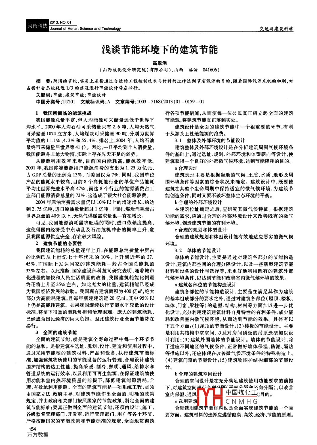 2013.No.01南科技Joumal of Henan Science and Technology交通與建筑科學(xué)淺談節(jié)能環(huán)境下的建筑節(jié)能高翠涓(山西焦化設(shè)計(jì)研究院(有限公司),山西臨汾041606)摘要:所謂的節(jié)能,實(shí)質(zhì)上是指通過合適的工程控制技術(shù)與材料的選擇達(dá)到節(jié)省能源的目的,隨著國際能源危機(jī)的加劇,對(duì)占據(jù)社會(huì)總能耗近1/3的建筑進(jìn)行節(jié)能設(shè)計(jì)勢(shì)在必行。關(guān)鍵詞:節(jié)能;建筑節(jié)能;節(jié)能設(shè)計(jì)中圖分類號(hào):TU201文獻(xiàn)標(biāo)識(shí)碼:A文章編號(hào):1003-5168(2013)01-0159-011我國所面臨的能源挑戰(zhàn)行各項(xiàng)節(jié)能措施,從而使每一位公民真正樹立起全面的建筑我國能源總量豐富,但人均能源可采儲(chǔ)量遠(yuǎn)低于世界平節(jié)能觀,將建筑節(jié)能真正落到實(shí)處。均水平。2000年人均石油可采儲(chǔ)量只有2.6噸,人均天然氣建筑設(shè)計(jì)是全面的建筑節(jié)能中一個(gè)很重要的環(huán)節(jié),有利可采儲(chǔ)量1074立方米,人均煤炭可采儲(chǔ)量90噸,分別為世界于從源頭上杜絕能源的浪費(fèi)。平均值的11.1%4.3%和55.4%.排名上,2004年,人均石油3.1整體及外部環(huán)境的節(jié)能設(shè)計(jì)最終可采儲(chǔ)量居世界第41位。因此,一旦平均到個(gè)人消費(fèi)量建筑整體及外部環(huán)境設(shè)計(jì)是在分析建筑周圍氣候環(huán)境條我國能源并非地大物博,實(shí)際上存在先天不足的弱勢(shì)。件的基礎(chǔ)上,通過選址、規(guī)劃、外部環(huán)境和體型朝向等設(shè)計(jì),使從能源利用效率來看,目前國內(nèi)能耗高,能源效率低。建筑獲得一個(gè)良好的外部微氣候環(huán)境達(dá)到節(jié)能降耗的目的2001年,我國終端能源用戶能源消費(fèi)的支出為1.25萬億元a合理選址占GDP總量的比例為13%,而美國僅為7%同時(shí),我國單位建筑選址主要是根據(jù)當(dāng)?shù)氐臍夂?、土質(zhì)、水質(zhì)、地形及周產(chǎn)品的能耗水平較高,目前8個(gè)高耗能行業(yè)的單位產(chǎn)品能耗圍環(huán)境條件等因素的綜合狀況來確定。建筑設(shè)計(jì)中,既要使平均比世界先進(jìn)水平高47%,而這8個(gè)行業(yè)的能源消費(fèi)占工建筑在其整個(gè)生命周期中保持適宜的微氣候環(huán)境,為建筑節(jié)業(yè)部門能源消費(fèi)總量的73%.這造成了很大社會(huì)能源浪費(fèi)。能創(chuàng)造條件,同時(shí)又要不破壞整體生態(tài)環(huán)境的平衡。2004年原油消費(fèi)需求量仍以10%以上的增速增長,約達(dá)b合理的外部環(huán)境設(shè)計(jì)到2.75億噸,進(jìn)口原油數(shù)量超過1億噸。同時(shí),煤炭消耗量占在建筑位址確定之后,應(yīng)研究其微氣候特征。根據(jù)建筑世界總量的40%以上,天然氣供暖需求量也一直在增長。功能的需求,應(yīng)通過合理的外部環(huán)境設(shè)計(jì)來改善既有的微氣可見,我國能源消耗需求旺盛的同時(shí),進(jìn)口依賴度提高,候環(huán)境創(chuàng)造建筑節(jié)能的有利環(huán)境。這使得國內(nèi)經(jīng)濟(jì)受中東動(dòng)亂及石油危機(jī)沖擊的概率上升,危c合理的規(guī)劃和體型設(shè)計(jì)及我國能源供應(yīng)安全,存在較大風(fēng)險(xiǎn)。合理的建筑規(guī)劃和體型設(shè)計(jì)能有效地適應(yīng)惡劣的微氣候2建筑節(jié)能的必要性環(huán)境。我國建筑能耗的總量逐年上升,在能源總消費(fèi)量中所占3.2單體的節(jié)能設(shè)計(jì)的比例已從上世紀(jì)七十年代末的10%,上升到近年的27單體的節(jié)能設(shè)計(jì),主要是通過對(duì)建筑各部分的節(jié)能構(gòu)造45%而國際上發(fā)達(dá)國家的建筑能耗一般占全國總能耗的設(shè)計(jì)、建筑內(nèi)部空間的合理分隔設(shè)計(jì),以及一些新型建筑節(jié)能33%左右。以此推斷,國家建設(shè)部科技司研究表明,隨著城市材料和設(shè)備的設(shè)計(jì)與選擇等,來更好地利用既有的建筑外部化進(jìn)程的加快和人民生活質(zhì)量的改善,我國建筑耗能比例最氣候環(huán)境條件,以達(dá)到節(jié)能和改善室內(nèi)微氣候環(huán)境的效果。終還將上升至35%左右。如此龐大的比重,建筑耗能已經(jīng)成a建筑各部位的節(jié)能構(gòu)造設(shè)計(jì)為我國經(jīng)濟(jì)發(fā)展的軟肋。我國現(xiàn)有建筑面積為400億m,絕大建筑各部位的節(jié)能構(gòu)造設(shè)計(jì),主要是在滿足其作為建筑部分為高能耗建筑,且每年新建建筑近20億m,其中95%以的基本組成部分的要求之外,通過對(duì)建筑各部位(屋頂樓板上仍是高能耗建筑。如果我國繼續(xù)執(zhí)行節(jié)能水平較低的設(shè)計(jì)墻體、門窗、梁柱等)的造型、結(jié)構(gòu)、材料等方面加以進(jìn)一步優(yōu)標(biāo)準(zhǔn)將留下很重的能耗負(fù)擔(dān)和治理困難。龐大的建筑能耗,化設(shè)計(jì),充分利用建筑建筑材料自身特性的有利條件,減少能已經(jīng)成為國民經(jīng)濟(jì)的巨大負(fù)擔(dān)。因此建筑行業(yè)全面節(jié)能勢(shì)在耗和改善室內(nèi)微氣候環(huán)境,從而達(dá)到節(jié)能的效果。具體有以必行。下五個(gè)方面:(1)屋頂?shù)墓?jié)能設(shè)計(jì);(2)樓板的節(jié)能設(shè)計(jì)。主要3全面的建筑節(jié)能是利用其結(jié)構(gòu)中空空間,以及對(duì)房間頂板的吊頂造型加以