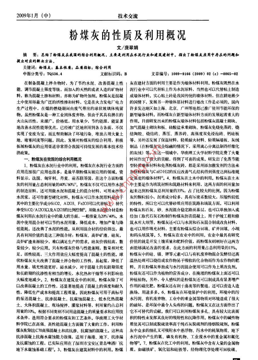 2009年1月(中)技術(shù)交流粉煤灰的性質(zhì)及利用概況文/龐翠娟摘要:總結(jié)了粉煤灰在我國(guó)的綜合利用概況,主要是利用在水泥行業(yè)和建筑建材中。指出了粉煤灰應(yīng)用中存在的問題和提出對(duì)應(yīng)的解決方法。關(guān)鍵詞:粉煤灰;基本性贗;品質(zhì)指標(biāo):綜合利用中圖分類號(hào):TQ5364文獻(xiàn)標(biāo)識(shí)碼:B文章編號(hào):1009-9166(2009)02(e)-0065-02在制備混凝土拌合物時(shí),為了節(jié)約水泥、改善混凝土性|灰在建材方面的利用主要是作為墻體材料利用。粉煤灰既然在水能、調(diào)節(jié)混凝土強(qiáng)度等級(jí),而加入的大然的或者人造的礦物材泥行業(yè)中可以代棒粘土作為水泥原料,當(dāng)然也可以代替粘土制造料,稱為混凝土摻和材料,亦稱為礦物外加劑。粉煤灰是混凝|成墻體材料。實(shí)心粘土磚是我國(guó)傳統(tǒng)的墻體材料,但在耕地稀少土中使用得最為廣泛的活性摻和材料,它是在火力發(fā)電廠電力的國(guó)情下,發(fā)展另一種墻體原材料進(jìn)行墻改工作是必須的。國(guó)內(nèi)生產(chǎn)過程中,在煤的燃燒期間由廢氣帶出的球狀玻璃體殘留許多發(fā)達(dá)地區(qū)如上海、北京、廣州等地都已推廣使用節(jié)能環(huán)保物。雖然粉煤灰是一種工業(yè)固體廢棄物,但由于其具有潛在的新型墻體材料。而粉煤灰在新型墻體材料方面的發(fā)展起著重大的火山灰活性,來源廣,價(jià)格低,用水鬟少,節(jié)約能源,能顯著作用。月前研發(fā)出來的粉煤灰墻體材料包括粉煤灰混凝士砌塊地改善水泥性能等優(yōu)點(diǎn),已經(jīng)被廣泛地利用到各方各面,不僅加氣混凝土砌塊和板、硅酸鹽承重砌塊、粉煤灰免燒免蒸磚、燒實(shí)現(xiàn)了變廢為寶,而且?guī)椭鉀Q了環(huán)境污染,堆放占用大量土結(jié)陶粒、燒結(jié)磚、蒸壓、蒸養(yǎng)磚、高強(qiáng)度雙免浸泡磚、鈣硅板地、堵塞河流等問題。因此,發(fā)展對(duì)粉煤灰的綜合利用,積極等,另外還發(fā)展了保溫材料,輕質(zhì)耐火材料、輕質(zhì)隔墻板、灰絨拓展粉煤灰的應(yīng)用渠道非常符合我國(guó)可持續(xù)發(fā)展的基本技術(shù)經(jīng)|制品(在粉煤灰完全熔融的情況下,采用離心分離法制得纖維化濟(jì)政策。的灰絨)等。在這一領(lǐng)域中,華南理工大學(xué)材料學(xué)院花費(fèi)了大量粉煤灰在我國(guó)的綜合利用概況時(shí)間作出了很大的貢獻(xiàn),得到了可喜的成果。研發(fā)出了免蒸節(jié)能1、粉媒灰在水泥行業(yè)中的利用。粉煤灰存水泥行業(yè)方面的型輕質(zhì)墻體材料和免蒸粉煤灰磚,都是采用添加激發(fā)劑的方法來應(yīng)用范圍很廣應(yīng)用也很多,是最早期粉煤灰被應(yīng)用的領(lǐng)域。資「加快粉煤灰與caOH2的反應(yīng)改善氣扎結(jié)構(gòu)得到強(qiáng)度達(dá)到標(biāo)崔規(guī)料顯示,法國(guó)、匈牙利、丹麥、前蘇聯(lián)等國(guó),在這個(gè)方面粉煤定強(qiáng)度的墻體材料。4.粉煤灰在土木中的利用。粉煤灰在士木灰的利用量占總利用敏的4%。粉煤灰不僅可以用作水泥中主要是作為填筑材料和筑路材料來利用,這兩方面的利用量加的制造原料,還可用做水泥和混凝土的混合材料,可用米拌作起來達(dá)到粉煤灰總利用量的3%,占了比較大的比例。因?yàn)榉勖核酀{,還可作新型硬化材料。粉煤灰可以作水泥原料是由于灰的顆料較小,泥質(zhì)成分較多,具有壓密系數(shù)較大,壓縮性較低其中的主要化學(xué)成分S02.AD03、Fe203可以代替粘土,替代的特性,所以它可以代替砂質(zhì)應(yīng)用在筑路和填筑方面??梢岳寐适躍io/A1∞O3以及AO3的比例控制。用做水泥混合材是粉粉煤灰和石灰、砂、水泥混合穩(wěn)定路面基層,也可以單獨(dú)加入或煤灰利用在水泥行業(yè)中的最人的方面,一般摻量為m%4.水經(jīng)加「取代石灰石粉制作粉煤灰瀝青混凝土,用于護(hù)坡工程和修泥中使用混合材可以節(jié)約水泥用量,降低成本,增加產(chǎn)量與降「筑水庫大壩等。粉煤灰還叫以與水泥和石灰混合制成改良材料,低能耗,還改辮了水泥的性能。從利用混合材的經(jīng)驗(yàn)得出,最也可以用作填充材料,主要有粉煤灰綜合回填、礦井回填、小壩具有利用價(jià)值的是這三種混合材:粉煤灰、高爐礦渣硅灰。和碼頭填筑等。5、粉煤灰在農(nóng)業(yè)中的利用。農(nóng)業(yè)中最民有研究高爐礦渣來源較少,難以滿足生產(chǎn)的需求。硅灰價(jià)錢較高,數(shù)價(jià)值的就是開發(fā)土壤質(zhì)量和肥料價(jià)值,而粉煤灰則剛好在這兩方量較少,較少應(yīng)用。只有粉煤灰價(jià)格與性能兼顧,數(shù)疑相對(duì)充|面能夠滿改善的求,在此方血的利用量占總利用碌的5%足,活性較高,三大作用效應(yīng)大幅度提高了混疑十的性能。球粉煤灰屮的硅、鎂、鉀等元素可以與有機(jī)廢棄物混合發(fā)酵經(jīng)過高狀粉煤灰大大改善了混凝土拌合物的工作性,易起漿,降低了溫?zé)崽幚砜梢詿Y(jié)成農(nóng)作物易于吸收的化合物而作為農(nóng)作物的肥用水量,填充性能更好,泌水減少,對(duì)于混凝的長(zhǎng)齡期強(qiáng)度料。并且粉煤灰單獨(dú)或與水污泥混合使用可以作為土質(zhì)改良劑。和長(zhǎng)齡期的抗?jié)B性有相當(dāng)?shù)脑鲩L(zhǎng),水化熱和干縮等不利影也粉煤灰還可以作為植物的營(