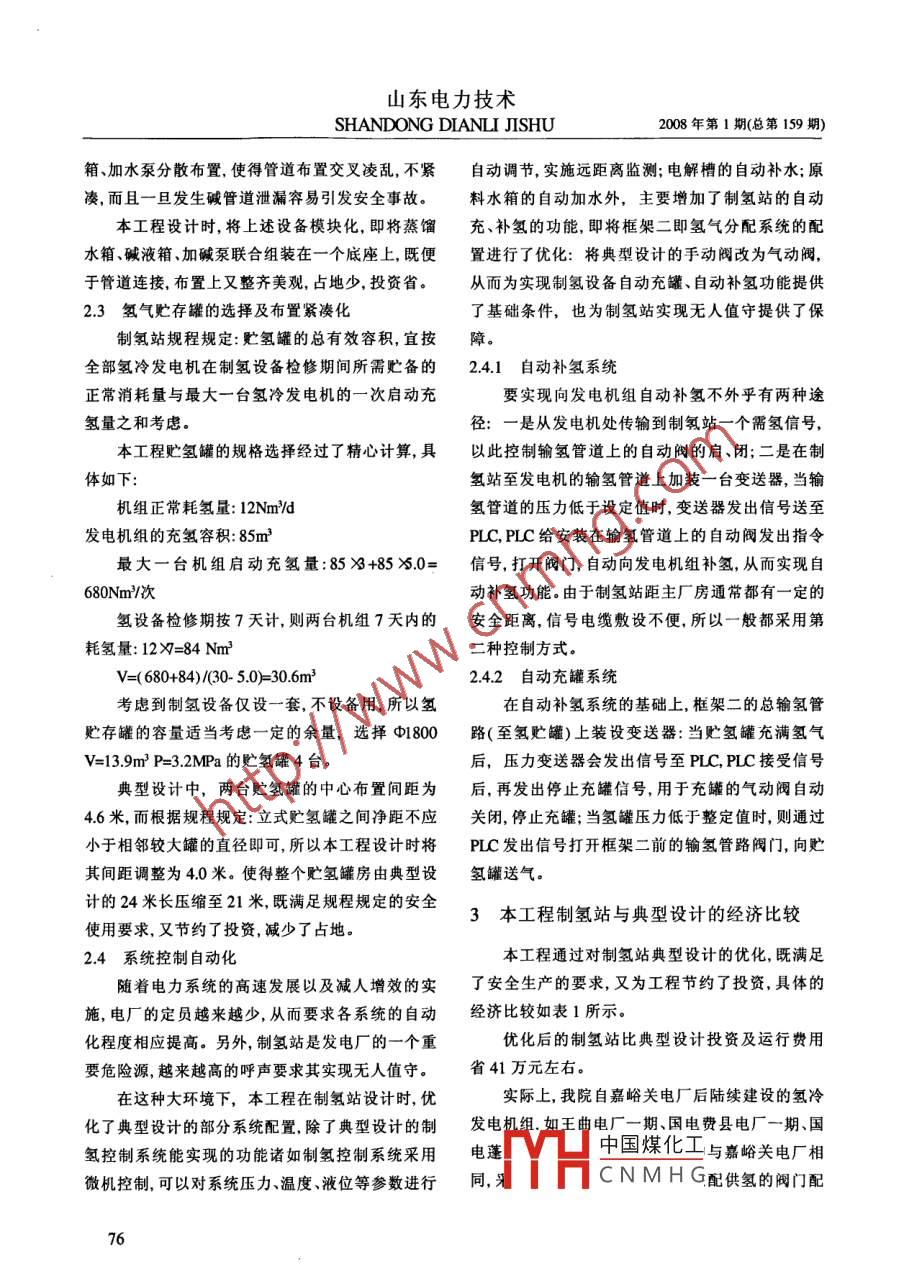 山東電力技術(shù)SHANDONG DIANLI JISHU2008年第1期(總第159期)制氫站優(yōu)化設(shè)計Optimized Design of Hydrogen Generation Station徐秀萍,馬玉奇(山東電力工程咨詢院,山東濟(jì)南250013)摘要:介紹了火力發(fā)電廠制氫的原理和系統(tǒng)組成,以嘉峪關(guān)電廠為例,論述了對典型設(shè)計的制氫站系統(tǒng)、布置的優(yōu)化,為具備相似條件的制氫站設(shè)計提供參考。關(guān)鍵詞:制氫站;典型設(shè)計;優(yōu)化Abstract: This paper briefly introduced the principle and the system components of hydrogen generation for thermal powerplant, and described how to optimize the system and the arrangement of the typical design on the basis of Jiayuguan powerplant. It can be referenced for the similar condition power plant when design the hydrogen generation station.Key words: hydrogen generation station;typical design:optimize.中圖分類號:TM621.8文獻(xiàn)標(biāo)識碼:B文章編號: 1007- 9904(2008)0 74- 040引言區(qū)內(nèi)設(shè)制氫裝置。目前供氫站的設(shè)置方式基本上是廠內(nèi)設(shè)置制火力發(fā)電廠目前最常用的制氫裝置是采用中氫裝置和外購氫氣供氫方案。外購氫氣供氫分為通壓電解純水制取氫氣,本文就這種供氫方式、以嘉峪過外購瓶裝氫向機組供氫和直接通過管道向電廠關(guān)電廠制氫站與傳統(tǒng)的制氫站典型設(shè)計的比較為例,介紹一下 對制氫站的系統(tǒng)及布置的優(yōu)化設(shè)計。供氫兩種。不管采用哪種供氫方式,均應(yīng)在廠內(nèi)設(shè)置-定1典型設(shè)計的制氫站簡介的氫氣貯量。廠內(nèi)氫氣貯量有如下規(guī)定:(1)廠內(nèi)設(shè)置制氫裝置時,貯氬罐的總有效容1.1 水電解制氫裝置工作原理水電解制氫的原理是由浸沒在電解液中的一積,宜按全部氫冷發(fā)電機在制氫設(shè)備檢修期間所需對電極中間隔以防止氣體滲透的隔膜而構(gòu)成的水貯備的正常消耗量與最大一臺氫冷發(fā)電機的一次電解池,當(dāng)通以-定的直流電時,水就發(fā)生分解,在.啟動充氫量之和考慮。陰極析出氫氣,陽極析出氧氣。其反應(yīng)式如下:(2)當(dāng)采用外購氫氣瓶供氫時,氫氣瓶的總有陰極: 2H20+2e- +H2↑+20H-效容積應(yīng)滿足全部氫冷發(fā)電機7~0天的正常消耗舊極: 20H--2e- -H20+1/202↑量和最大一臺氫冷發(fā)電機-次啟動充氫量之和??偡磻?yīng): 2H2O→2H2↑ +O2↑(3)當(dāng)由制氫工廠通過管道向發(fā)電廠直接送氫產(chǎn)生的氫氣進(jìn)入干燥部分,由干燥劑吸附氫氣時,發(fā)電廠內(nèi)貯氫罐的總有效容積,可根據(jù)制氫工攜帶的水分,達(dá)到發(fā)電機組對氫氣濕度的要求。廠的貯氫情況和送氫管道的可靠程度確定,但應(yīng)能1.2水電解制氫 系統(tǒng)工藝流程滿足全部氫冷發(fā)電機4天以上的正常消耗量。1.2.1中國煤化工在許多情況下,受客觀條件限制,外購不到滿YHCNMHG用下分解,在電解足氫氣純度及用量要求的成品氫氣,所以需要在廠小室的陰、陽極表面 分別產(chǎn)生氫氣、氧氣。74山東電力技術(shù)SHANDONG DIANLI JISHU2008年第I期(總第159期)從電解小室出來的氫氣和堿液-起通過極框及布置上陰極側(cè)的出氣孔流過氣道,進(jìn)入氫氣分離器中,在1 X0Nm2/h典型設(shè)計的制氫裝置包括:電解重力作用下進(jìn)行氣液分離,分離出的氫氣進(jìn)入氫氣槽、框架 I.框架II、加水泵、原料水箱、堿箱、氫氣干洗滌器中洗滌,然后經(jīng)頂部除霧器除去液滴后經(jīng)氫燥裝置七件套”,此外還包括電解輔助單元如除鹽氣調(diào)節(jié)閥進(jìn)入干燥器除濕后進(jìn)入儲存系統(tǒng)備用。水冷卻裝置和氫氣貯罐、壓縮空氣貯罐等。氧氣處理過程與上述過程相似。只不過通常氧其中電解槽、框架1、加水泵、原料水箱及堿箱氣不經(jīng)過洗滌,經(jīng)氧分離器分離后直接放空。為制氫部分;框架II為氫氣分配部分;氫氣貯罐為1.2.2電解液 循環(huán)系統(tǒng)氫氣貯存部分。從電解槽出來夾帶氫氣和氧氣的堿液在氫分分別布置在電解槽間、干燥間、加水配堿室三離器和氧分離器中,在重力作用下分別與氫氣、氧個房間內(nèi),設(shè)備顯得零散,管道交叉,安裝不便。氣分離,經(jīng)蛇管冷卻后,電解液通過氫、氧分離器底2制氫站系統(tǒng)布置優(yōu)化部的連通管經(jīng)過過濾器進(jìn)入循環(huán)泵,然后進(jìn)入電解槽形成了電解液循環(huán)系統(tǒng)。嘉峪關(guān)電廠是我院的EPC總承包工程,于1.2.3補充系統(tǒng)2002年7月進(jìn)行制氫站的系統(tǒng)設(shè)計。為節(jié)約投資,補充原料水。蒸餾水箱中的水通過加水泵被注沒有再繼續(xù)套用典型設(shè)計,而是通過與制氫廠家的入氫洗滌器,先供冷卻洗滌,然后通過溢流管流入氫溝通及配合,對典型設(shè)計的制氫站系統(tǒng)布置進(jìn)行了分離器,經(jīng)循環(huán)泵送入電解槽,不斷地補充電解消以下優(yōu)化。耗的原料水。2.1系統(tǒng)設(shè)計采用 一體化補充堿液。水電解過程中,堿起到增加電導(dǎo)的本工程設(shè)計時采用- -體化布置,即整個制氫部作用,理論上不消耗堿,正常運行中- -般不需補充分只有制氫處理器(框架I)、框架II、加水配堿裝置堿,如確需補充堿時,可通過加水泵直接加入堿液循(框架II) 3件套”,其中制氫處理器包括電解槽、環(huán)系統(tǒng)中。氫分離器、氧分離器、氫洗滌器、堿液過濾器、堿液1.2.4除鹽水冷卻系統(tǒng)循環(huán)泵、氫氣干燥裝置