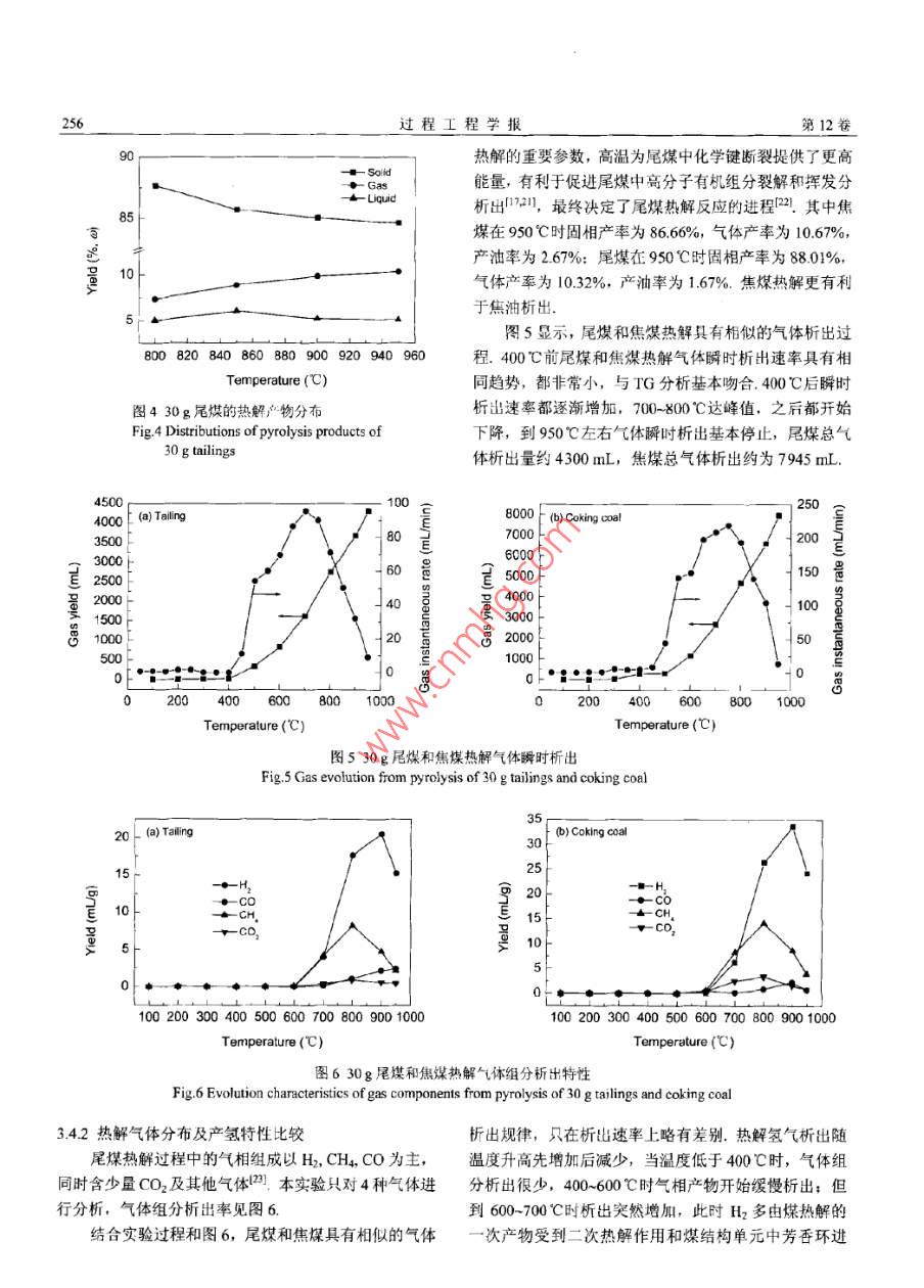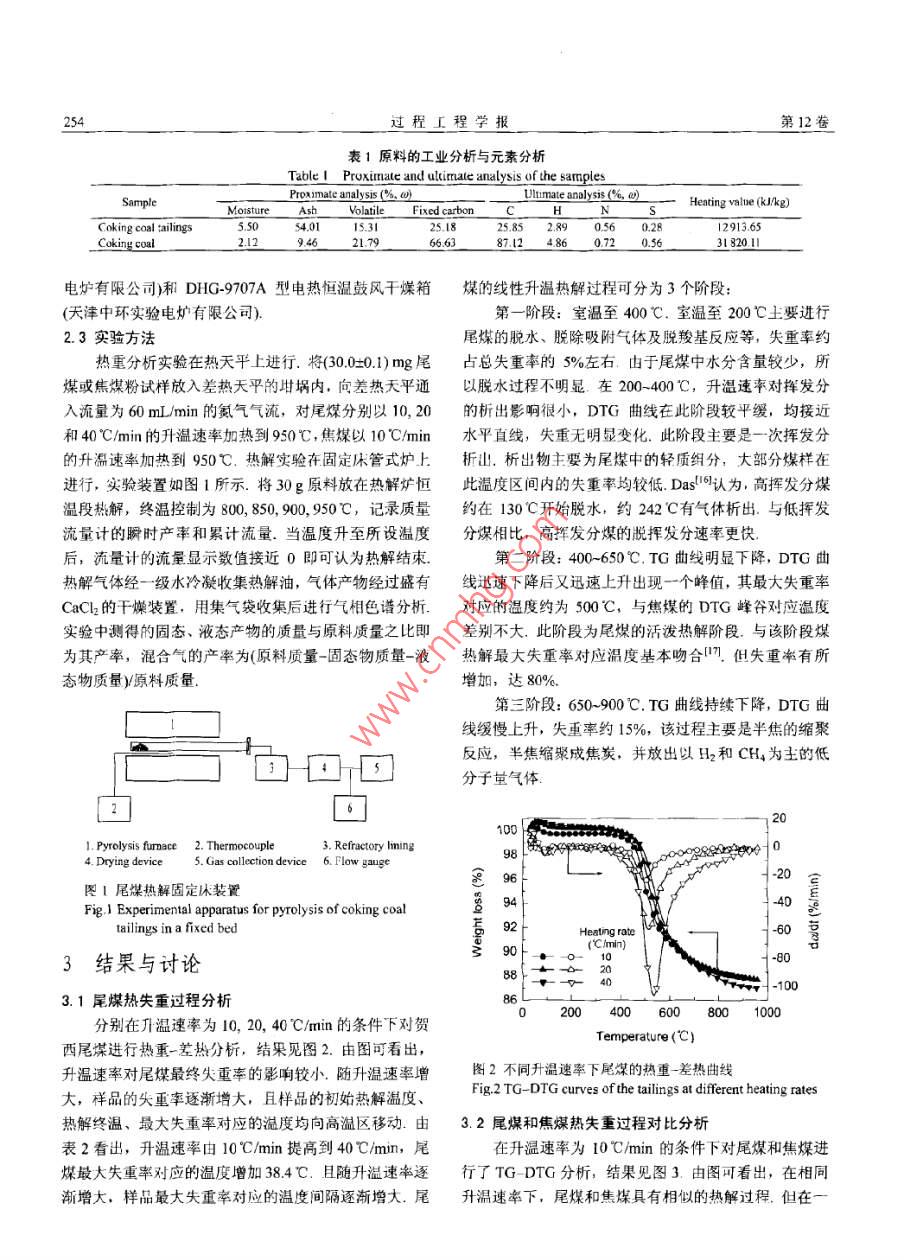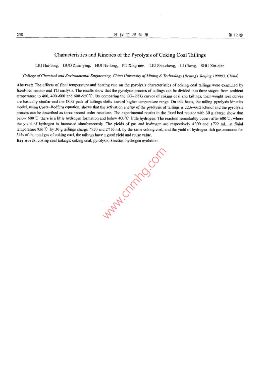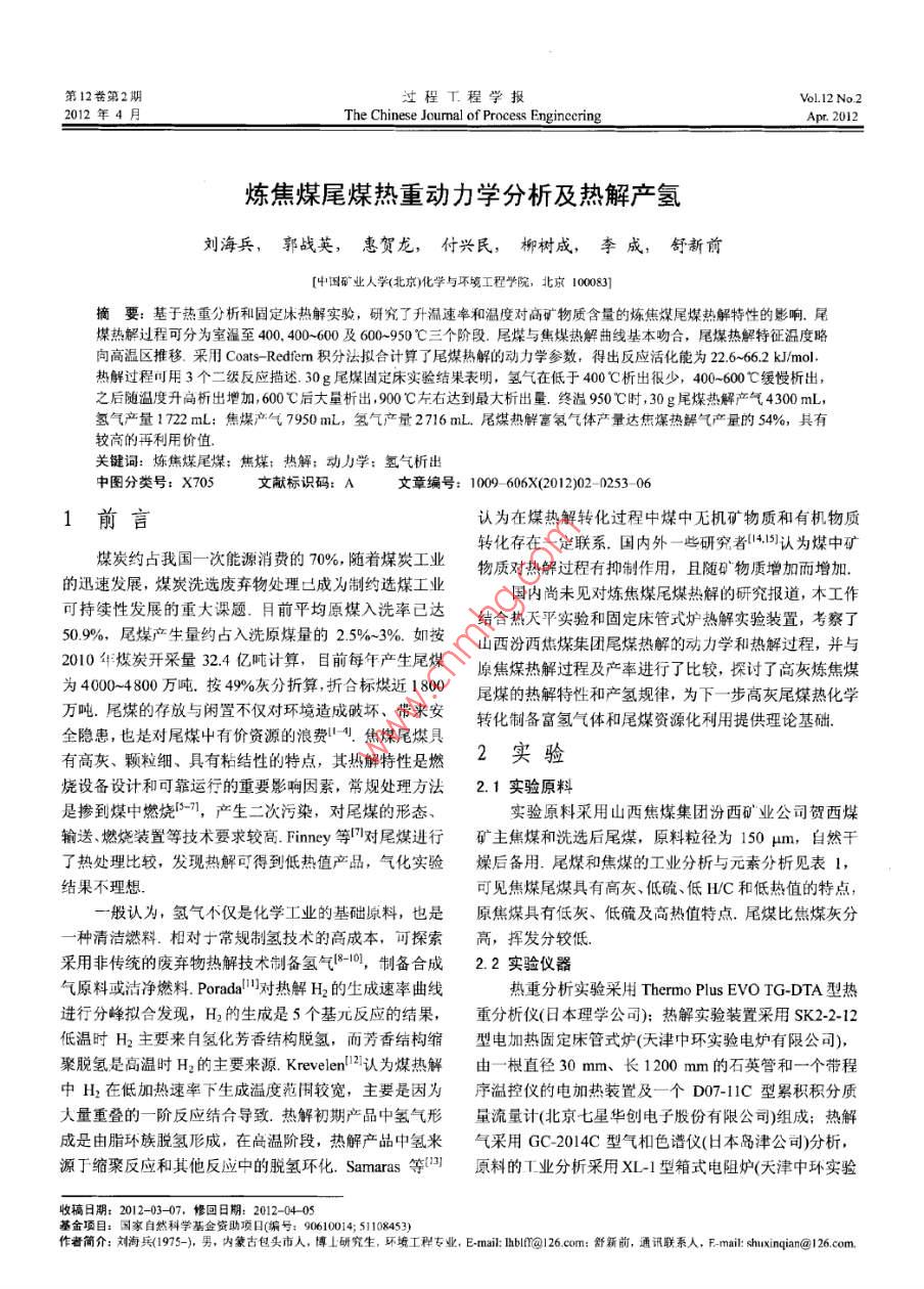 第12卷第2期過(guò)程工程學(xué)報(bào)Vol.12 No.22012年4月The Chinese Joumal of Process EngineeringApe 2012煉焦煤尾煤熱重動(dòng)力學(xué)分析及熱解產(chǎn)氫劉海兵,郭戰(zhàn)英, 惠賀龍, 付興民,柳樹(shù)成,李成,舒新前[中國(guó)礦業(yè)人學(xué)(北京)化學(xué)與環(huán)境工程學(xué)院,北京000830]摘要:基于熱重分析和固定床熱解實(shí)驗(yàn),研究了升溫速率和溫度對(duì)商礦物質(zhì)含量的煉焦煤尾煤熱解特性的影響.尾煤熱解過(guò)程可分為室溫至400, 400-600及600~950C三個(gè)階段.尾煤與焦煤熱解曲線基本吻合,尾煤熱解特征溫度略向高溫區(qū)推移、采用Coats- Redfemn積分法擬合計(jì)算了尾煤熱解的動(dòng)力學(xué)參數(shù),得出反應(yīng)活化能為2.6-66.2 k/mol.熱解過(guò)程可用3個(gè)二級(jí)反應(yīng)描述30g尾煤固定床實(shí)驗(yàn)結(jié)果表明,氫氣在低于400C析出很少,400-600C緩慢析出,之后隨溫度升高析出增加,600后大量析出,900C左右達(dá)到最大析出量.終溫950C時(shí), 30 g尾煤熱解產(chǎn)氣4300 mL,氫氣產(chǎn)量1722 mL;焦煤產(chǎn)氣7950 mL,氫氣產(chǎn)量2716 mL.居煤熱解富氫氣體產(chǎn)量達(dá)焦煤熱解氣產(chǎn)量的54%,具有較高的再利用價(jià)值.關(guān)鍵詞:煉焦煤尾煤:焦煤;熱解;動(dòng)力學(xué):氫氣析出中圖分類(lèi)號(hào): X705文獻(xiàn)標(biāo)識(shí)碼: A文章編號(hào): 1009 606X(2012)02 -0253 061前言認(rèn)為在煤熱解轉(zhuǎn)化過(guò)程中煤中無(wú)機(jī)礦物質(zhì)和有機(jī)物質(zhì)煤炭約占我國(guó)一-次能源消費(fèi)的70%,隨著煤炭工業(yè)轉(zhuǎn)化存在一定聯(lián)系.國(guó)內(nèi)外一些研究4.15)認(rèn)為煤中礦的迅速發(fā)展,煤炭洗選廢棄物處理已成為制約選煤工業(yè)物質(zhì)對(duì)熱解過(guò)程有抑制作用,且隨石物質(zhì)增加而增加.國(guó)內(nèi)尚未見(jiàn)對(duì)煉焦煤尾煤熱解的研究報(bào)道,木工作可持續(xù)性發(fā)展的重大課題。月前平均原煤入洗率已達(dá)結(jié)合熱天平實(shí)驗(yàn)和固定床管式爐熱解實(shí)驗(yàn)裝置,考察了50.9%,尾煤產(chǎn)生量約占入洗原煤量的2.5%~3%.如按山西汾西焦煤集團(tuán)尾煤熱解的動(dòng)力學(xué)和熱解過(guò)程,并與2010年煤炭開(kāi)采量32.4 億噸計(jì)算,目前每年產(chǎn)生尾煤原焦煤熱解過(guò)程及產(chǎn)率進(jìn)行了比較,探討了高灰煉焦煤為4000~4800萬(wàn)噸.按49%灰分折算,折合標(biāo)煤近1800尾煤的熱解特性和產(chǎn)氫規(guī)律,為下-步高灰尾煤熱化學(xué)萬(wàn)噸.尾煤的存放與閑置不僅對(duì)環(huán)境造成破壞、帶來(lái)安轉(zhuǎn)化制備富氫氣體和尾煤資源化利用提供理論基礎(chǔ).全隱患,也是對(duì)尾煤中有價(jià)資源的浪費(fèi)-4.焦煤尾煤具有高灰、顆粒細(xì)、具有粘結(jié)性的特點(diǎn),其熱解特性是燃2實(shí)驗(yàn)燒設(shè)備設(shè)計(jì)和可靠運(yùn)行的重要影響因素,常規(guī)處理方法2.1實(shí)驗(yàn)原料是摻到煤中燃燒[5-7],產(chǎn)生二次污染,對(duì)尾煤的形態(tài)、實(shí)驗(yàn)原料采用山西焦煤集團(tuán)汾西礦業(yè)公司賀西煤輸送、燃燒裝置等技術(shù)要求較高. Finney等!"對(duì)尾煤進(jìn)行礦主焦煤和洗選后尾煤,原料粒徑為150 μm,自然干了熱處理比較,發(fā)現(xiàn)熱解可得到低熱值產(chǎn)品,氣化實(shí)驗(yàn)燥后備用.尾煤和焦煤的工業(yè)分析與元素分析見(jiàn)表1,結(jié)果不理想可見(jiàn)焦煤尾煤具有高灰、低硫、低HC和低熱值的特點(diǎn),- -般認(rèn)為,氫氣小僅是化學(xué)工業(yè)的基礎(chǔ)原料,也是原焦煤具有低灰、低硫及高熱值特點(diǎn).尾煤比焦煤灰分一種清潔燃料.相對(duì)于常規(guī)制氫技術(shù)的高成本,可探索高,揮發(fā)分較低.采用非傳統(tǒng)的廢棄物熱解技術(shù)制備氫氣(8-10),制備合成2.2實(shí)驗(yàn)儀器氣原料或潔凈燃料。Porall對(duì)熱解H2的生成速率曲線熱重分析實(shí)驗(yàn)采用Thermo Plus EVO TG-DTA型熱進(jìn)行分峰擬合發(fā)現(xiàn),H2的生成是5個(gè)基元反應(yīng)的結(jié)果,重分析儀(日本理學(xué)公司);熱解實(shí)驗(yàn)裝置采用SK2-2-12低溫時(shí)H2主要來(lái)自氫化芳香結(jié)構(gòu)脫氫,而芳香結(jié)構(gòu)縮型電加熱固定床管式爐(天津中環(huán)實(shí)驗(yàn)電爐有限公司),:聚脫氫是高溫時(shí)H2的主要來(lái)源. Krevelen!2認(rèn)為煤熱解由一根直徑30 mm、長(zhǎng)1200 mm的石英管和一個(gè)帶程中H2在低加熱速率下生成溫度范圍較寬,主要是因?yàn)樾驕乜貎x的電加熱裝置及一個(gè)D07-1IC型累積積分質(zhì)大量重疊的一階反應(yīng)結(jié)合導(dǎo)致.熱解初期產(chǎn)品中氫氣形量流量計(jì)(北京七星華創(chuàng)電子股份有限公司)組成;熱解成是由脂環(huán)族脫氫形成,在高溫階段,熱解產(chǎn)品中氫來(lái)氣采用GC-2014C型氣相色譜儀(H本島津公司)分析,源于縮聚反應(yīng)和其他反應(yīng)中的脫氫環(huán)化. Samaras 等四原料的工業(yè)分析采用XL-1型箱式電阻爐(天津中環(huán)實(shí)驗(yàn)收稿日期: 2012-03- 07,修回日期: 2012-04-05基金項(xiàng)目:國(guó)家自然科學(xué)基金資助項(xiàng)日(編號(hào): 90610014; 51108453)作者簡(jiǎn)介:劉海兵(1975-).男,內(nèi)蒙古包頭市人,博上研究生,環(huán)境工程專(zhuān)業(yè),E-mail: Ihblr@126. com:舒新前,通訊聯(lián)系人,F(xiàn).mail: shuxinqin@e 126. com.2