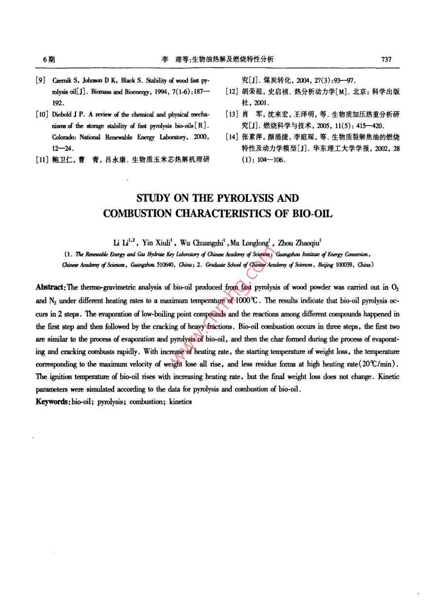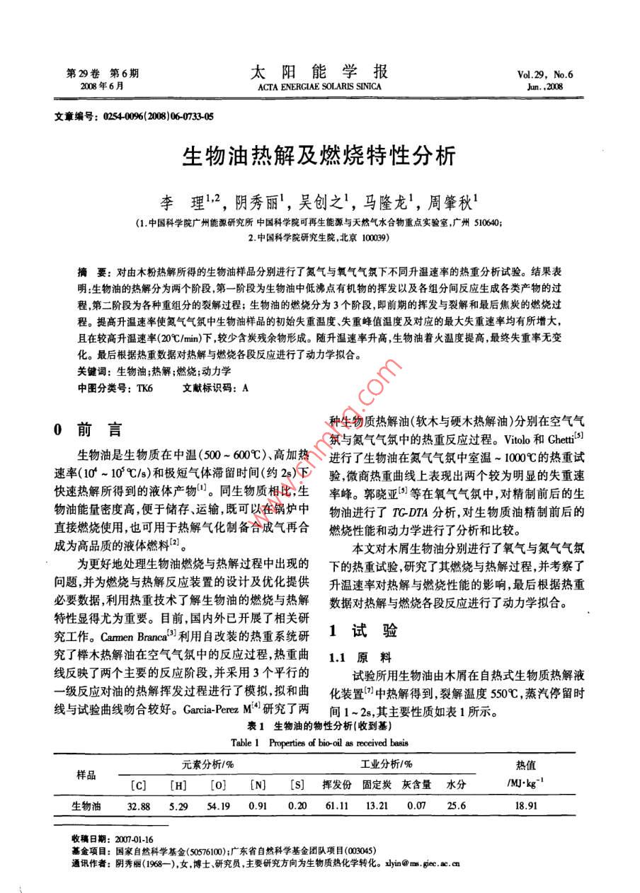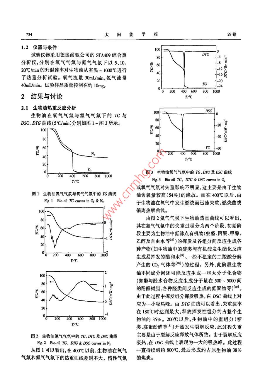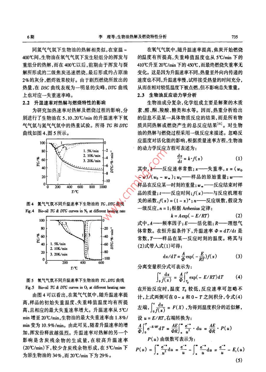 第29卷第6期太陽能學(xué)報Vol 29. No 62008年6月ACTA ENERGLAE SOLARIS SINICAJmn.,206文章編號:0254006073305生物油熱解及燃燒特性分析李理12,陰秀麗,吳創(chuàng)之!,馬隆龍1,周肇秋(1中國科學(xué)院廣州能源研究所中國科學(xué)院可再生能源與天然氣水合物重點實驗室,廣州510640;2中國科學(xué)院研究生院,北京10009)摘要:對由木粉熱解所得的生物油樣品分別進行了氮氣與氧氣氣氛下不同升溫速率的熱重分析試驗。結(jié)果表明:生物油的熱解分為兩個階段第一階段為生物油中低沸點有機物的揮發(fā)以及各組分間反應(yīng)生成各類產(chǎn)物的過程第二階段為各種重組分的裂解過程;生物油的燃燒分為3個階段,即前期的揮發(fā)與裂解和最后焦炭的燃燒過程。提高升溫速率使氮氣氣氛中生物油樣品的初始失重溫度、失重峰值溫度及對應(yīng)的最大失重速率均有所增大且在較高升溫速率(20℃/min)下,較少含炭殘余物形成。隨升溫速率升高生物油著火溫度提高最終失重率無變化。最后根據(jù)熱重數(shù)據(jù)對熱解與燃燒各段反應(yīng)進行了動力學(xué)擬合。關(guān)鍵詞:生物油;熱解;燃燒;動力學(xué)中圖分類號:TK6文獻標(biāo)識碼:A0前言種生物質(zhì)熱解油(軟木與硬木熱解油)分別在空氣氣氛與氮氣氣氛中的熱重反應(yīng)過程。woo和 Ghetti1生物油是生物質(zhì)在中溫(500-600℃)、高加熱進行了生物油在氮氣氣氛中室溫-1000c的熱重試速率(10~10°℃/)和極短氣體滯留時間(約2s)下驗微商熱重曲線上表現(xiàn)出兩個較為明顯的失重速快速熱解所得到的液體產(chǎn)物"。同生物質(zhì)相比生率峰。郭曉亞等在氧氣氣氛中對精制前后的生物油能量密度高便于儲存、運輸,既可以在鍋爐中物油進行了TDA分析,對生物質(zhì)油精制前后的直接燃燒使用,也可用于熱解氣化制備合成氣再合燃燒性能和動力學(xué)進行了分析和比較。成為高品質(zhì)的液體燃料2。本文對木屑生物油分別進行了氧氣與氮氣氣氛為更好地處理生物油燃燒與熱解過程中出現(xiàn)的下的熱重試驗,研究了其燃燒與熱解過程,并考察了問題并為燃燒與熱解反應(yīng)裝置的設(shè)計及優(yōu)化提供升溫速率對熱解與燃燒性能的影響,最后根據(jù)熱重必要數(shù)據(jù)利用熱重技術(shù)了解生物油的燃燒與熱解數(shù)據(jù)對熱解與燃燒各段反應(yīng)進行了動力學(xué)擬合。特性顯得尤為重要。目前,國內(nèi)外已開展了相關(guān)研究工作。 Carmen Branca3利用自改裝的熱重系統(tǒng)研1試驗究了櫸木熱解油在空氣氣氛中的反應(yīng)過程熱重曲11原料線反映了兩個主要的反應(yīng)階段,并采用3個平行的試驗所用生物油由木屑在自熱式生物質(zhì)熱解液級反應(yīng)對油的熱解揮發(fā)過程進行了模擬擬和曲化裝置中熱解得到,裂解溫度550℃,蒸汽停留時線與試驗曲線吻合較好。 Garcia-Perez M“研究了兩間1-2,其主要性質(zhì)如表1所示。表1生物油的物性分析收到基)Table 1 Properties of bio-oil元素分析/%工業(yè)分析/%熱值樣品[c][H][o][N揮發(fā)份固定炭灰含量水分生物油3288529541909102061.1113.210.725.618,91收稿日期:2001-16基金項目:國家自然科學(xué)基金(50576100);廣東省自然科學(xué)基金團隊項目(0045通訊作者:陰秀麗(1968-),女博士、研究員主要研究方向為生物質(zhì)熱化學(xué)轉(zhuǎn)化。功yin@ msgec.ac.am734太陽能學(xué)報12儀器與條件試驗儀器采用德國耐馳公司的STA409綜合熱分析儀,分別在氧氣氣氛與氮氣氣氛下以5、1020℃/mn的升溫速率對生物油從室溫~1000℃進行了熱重分析試驗。氧氣流量30mL/min,氮氣流量40mL/min。試驗樣品質(zhì)量控制在約1020040060080010002結(jié)果與討論TAC21生物油熱重反應(yīng)分析SC生物油在氧氣氣氛與氮氣氣氛下的TG與DSC、DTG曲線(5℃/mn)分別如圖1~圖3所示。T/C圖3生物油氧氣氣氛中的TG、DrG及DSC曲線T/CFig 3 Bio-oil TG, DtG& DSc curves in O或氧氣氣氛對失重影響不明顯,這主要是由于生物圖1生物油氮氣氣氛與氧氣氣氛中的TG曲線油含氧量較高(54%)的緣故。而在400℃以后,由Fig 1 Bio-oil TG curves in 0& n2于生物油在氧氣中發(fā)生燃燒而迅速失重,燃燒曲線偏離熱解曲線。由圖2氮氣氣氛下生物油熱重曲線可以看出,其在氮氣氣氛中的失重過程分為兩個階段,初始階段主要為生物油中低沸點有機物(蟻醛、丙酮、甲醇、乙醇及自由水等)的揮發(fā)及各組分間反應(yīng)生成各種產(chǎn)物(如生物油中的醇類與有機酸發(fā)生酯化反應(yīng)2004006008001000生成易揮發(fā)的酯和水9、一些不穩(wěn)定的二羧酸分解T/C產(chǎn)生的CO2氣體等)的過程。另外,此階段生物油不同成分間還可能反應(yīng)生成一些大分子化合物(如酚與醛水合物反應(yīng)生成分子量在500~500間的酚醛樹脂、各種醛類間反應(yīng)生成的低聚物等)。由于此過程中揮發(fā)組分揮發(fā)吸熱,在DSC曲線上對應(yīng)為一小吸熱峰。由DTG曲線可以看出,失重速率在180℃時達到最大,釋放揮發(fā)性組分約占整個生4006008001000物油的35%。200℃以后,生物油中的重組分(糖T/C類、寡聚酚醛等)開始發(fā)生裂解反應(yīng),此過程失重圖2生物油氮氣氣氛中的TG、DG及DSC曲線主要是由于裂解反應(yīng)釋放氣體所致。由于裂解反應(yīng)Fig 2 Bio-oil TG, DtG& DSC curves in N,吸熱,在DSC曲線上表現(xiàn)為一大的吸熱峰。此過程從圖1可以看出,在400℃以前,生物油在氧氣一直持續(xù)到約