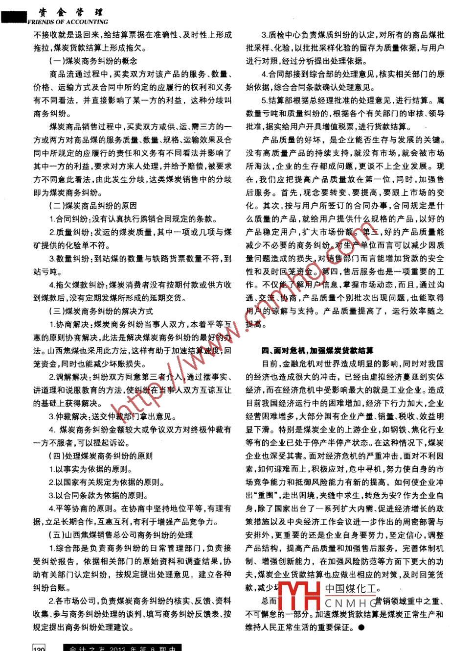 資金管理FRIENDS OF ACCOUNTING煤炭貨款結(jié)算的重要性山西焦煤集團(tuán)煤炭銷售總公司.王志珍.[摘要]文章主要闡述了煤炭企業(yè)貨款結(jié)算的重要性;煤炭貨款結(jié)算方式(1.先付款、后發(fā)貨;2.先發(fā)貨、后付款;3.分批付款)以及這些方式存在的風(fēng)險;如何規(guī)避風(fēng)險;煤炭貨款結(jié)算中商務(wù)糾紛處理;酉對危機加強煤炭貨款結(jié)算,減少壞賬損失。加速煤炭貨款結(jié)算對企業(yè)的正常發(fā)展具有重要作用。[關(guān)鍵詞]增值稅;結(jié)算栗據(jù); 風(fēng)險; 壞賬損失; 商務(wù)糾紛煤炭貨款結(jié)算,這是煤炭運銷的最后一個環(huán)節(jié) ,也是貨到付款,這樣需方就沒有風(fēng)險了。對于供方.都要求先款最重要的環(huán)節(jié)。煤炭銷售出去以后貨款結(jié)算顯得尤為重后貨,這樣供方就沒有風(fēng)險了。什么樣的付款方式對供需要,煤炭企業(yè)通過煤款結(jié)算將煤款回收入賬,為企業(yè)的再雙方都是安全的?直到現(xiàn)在還沒有-個比較好的能使供需生產(chǎn)提供保證。煤炭企業(yè)貨款結(jié)算的有價票據(jù)就是結(jié)算票雙方都認(rèn)可的方法。其實煤炭貨款結(jié)算,想完全規(guī)避風(fēng)險據(jù),結(jié)算票據(jù)包括鐵路貨票和國家法律規(guī)定的增值稅發(fā)票是不可能的,只能降低風(fēng)險,把風(fēng)險降低到可以接受的程兩部分,涉及國家稅收和企業(yè)商品的銷量、售價,體現(xiàn)企業(yè)度。上面的幾種結(jié)算方式都有缺陷,如果只是一昧地謀求的收入及經(jīng)營成果。煤炭企業(yè)的貨款能否及時收回,直接一方?jīng)]有風(fēng)險,無疑風(fēng)險就轉(zhuǎn)嫁到了另一方身上,至于如影響到煤炭企業(yè)正常經(jīng)營運轉(zhuǎn)。結(jié)算票據(jù)在企業(yè)經(jīng)營活動何規(guī)避各種付款方式存在的風(fēng)險,只能靠自己把握了。中所起的重要作用決定了要對結(jié)算票據(jù)加強管理,它的準(zhǔn)1.先付款后發(fā)貨的風(fēng)險。國營大礦收到貨款后,有沒確性和及時性顯得更為重要。準(zhǔn)確性就是要求企業(yè)準(zhǔn)確計有能力批到計劃?計劃可以按時批下來嗎?計劃批下來能算并真實反映商品銷售、企業(yè)經(jīng)營收入情況,同時,確保國不能按時走車?煤礦可以保證自己的產(chǎn)量嗎?化驗合格后家財政稅收。及時性要求企業(yè)在經(jīng)濟(jì)業(yè)務(wù)完成后,將結(jié)算裝車的質(zhì)量與到廠的質(zhì)量相同嗎?怎么保證到廠的質(zhì)量?票據(jù)快捷開具、傳遞到用戶單位,與用戶建立起一種債權(quán)到廠的煤炭貨物數(shù)量有虧噸嗎?債務(wù)的經(jīng)濟(jì)關(guān)系,確保貨款安全及資金的及時回籠,保障2.先發(fā)貨后付款的風(fēng)險。國營大礦對國營大廠拖欠資企業(yè)的可持續(xù)發(fā)展。金的風(fēng)險由國家承擔(dān),不存在大的問題,對于規(guī)模不大的企業(yè)和私營企業(yè),就存在風(fēng)險了:這個企業(yè)有沒有支付煤一、煤炭企業(yè)采用的結(jié)算方式款的能力?會不會很長時間占用煤款作為企業(yè)的周轉(zhuǎn)資金煤款結(jié)算是依據(jù)合同中的煤價條款以及用戶煤炭到而延時支付貨款?企業(yè)會不會出于對生產(chǎn)成本的考慮故意站驗收情況,核算最終煤款清算數(shù)額。煤炭企業(yè)的貨款結(jié)壓低煤炭到廠的價格?算可以根據(jù)雙方的資信情況,在簽訂購運銷經(jīng)濟(jì)合同時合3.分批付款的風(fēng)險。煤礦發(fā)運的煤炭質(zhì)量跟到廠的質(zhì)理地選用結(jié)算方式,主要采用以下結(jié)算類型,即先發(fā)煤后量相同嗎? 怎么保證到廠的數(shù)量不出現(xiàn)虧噸?如果煤炭的付款和先付款后發(fā)煤。質(zhì)量、數(shù)量沒有問題,供貨方能順利拿到剩余款嗎?1.先付款,后發(fā)貨。這就是所謂的預(yù)付款,這種方式主4.除結(jié)算方式有風(fēng)險外,這里還要提的是票據(jù)風(fēng)險,要是國企煤礦針對規(guī)模不大的單位或個體經(jīng)營者。國企煤煤炭企 業(yè)拿到銀行票據(jù)(匯票承兌等)也存在風(fēng)險。票據(jù)礦有很好的信譽,小單位或個體經(jīng)營者先付款也放心,煤的主要風(fēng)險 有:這張票據(jù)是否真實有效?票據(jù)是不是空頭礦做到款到發(fā)貨。實現(xiàn)款到發(fā)貨,貨款兩清。的?票據(jù)本身是否規(guī)范,票面有沒有錯誤而導(dǎo)致不能貼現(xiàn)?2.先發(fā)煤,后付款。這種方式主要是國企大礦對國企票據(jù)的出票方有沒有與其他第三方產(chǎn)生糾紛,致使票據(jù)不大廠。他們之間勢均力敵,誰也不怕跑了誰,大家彼此已經(jīng)能 正常貼現(xiàn)?了解,相互有了很深的信任度,才會貨到付款。3.分批付款。先預(yù)付一部分,收貨后付清。在彼此之間三、煤炭貨款結(jié)算中的商務(wù)糾紛處理還沒有建立良好的信任度時,一般采用此方法,這種結(jié)算企業(yè)要提高煤炭質(zhì)量,避免過多的商務(wù)糾紛。產(chǎn)品質(zhì)方式對于供需雙方都易于接受。量與結(jié)算票據(jù)看起來沒有多大關(guān)系,實際上煤炭質(zhì)量不穩(wěn)定會在中國煤化工沒有按合同約定的二、煤炭貨款結(jié)算方式存在的風(fēng)險數(shù)量、質(zhì)量YHC N MH G務(wù)糾紛。在處理商在煤炭運銷過程中,選擇哪種貨款結(jié)算方式企業(yè)自己務(wù) 糾紛時,需要經(jīng)過雙方進(jìn)行仲