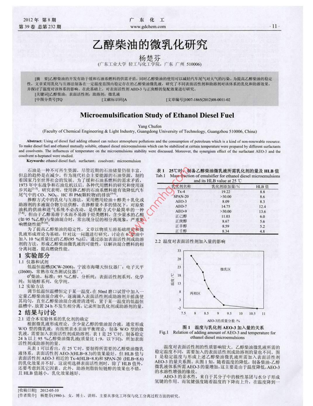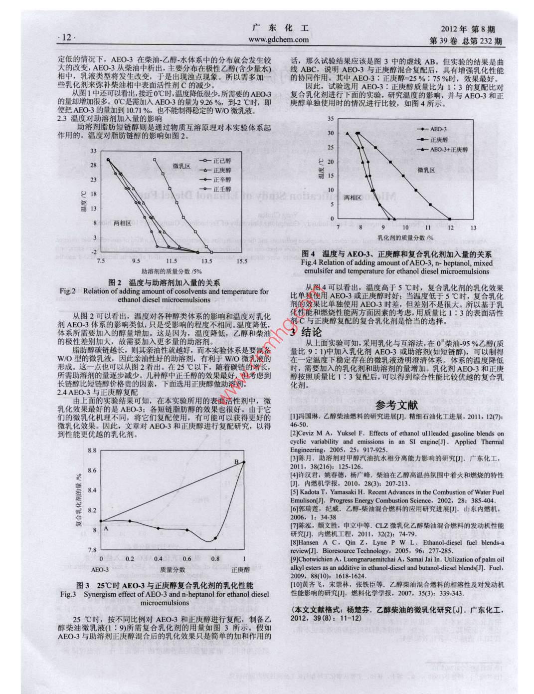 2012年第8期化第39卷總第232期www.gdchem.com乙醇柴油的微乳化研究楊楚芬(廣東工業(yè)大學(xué)輕工與化工學(xué)院,廣東廣州51000[摘要]乙醇柴油的開發(fā)有助于緩和石油系燃料的供需矛盾,同時乙醇柴油的使用可以減輕汽車尾氣對大氣的污染。為提高乙醇柴油的穩(wěn)定性,文章采用乳化與互溶法制備在一定溫度范圍內(nèi)穩(wěn)定存在的乙醇柴油微乳液,研究了不同表面活性劑和助溶劑對該體系的乳化和助溶效果并探討了溫度對該體系的影響。在此基礎(chǔ)上,對表面活性劑AEO-3與正庚醇的復(fù)配效果進(jìn)行研究關(guān)鍵詞]乙醇柴油:表面活性劑:助溶劑:微乳液中圖分類號TQ[文獻(xiàn)標(biāo)識碼]A文章編號1007-1865(2012)08001102Microemulsification Study of ethanol Diesel Fuel(Faculty of Chemical Engineering Light Industry, Guangdong University of Technology, Guangzhou 510006, China)Abstract: Using of diesel fuel adding ethanol can reduce atmosphere pollutions and the consumption of petroleum which is a kind of non-renewable resourceTo make diesel fuel and ethanol mutually soluble, ethanol diesel microemulsions which can be stabilized at certain temperature were prepared by different surfactantsand cosolvents. The influences of temperature on the microemulsions stability were discussed. Moreover, the synergism effect of the surfactant AEO-3 and thecosolvent n-heptanol were studied.Keywords: ethanol diesel fuel: surfactant: cosolvent: microemulsion石油是一種不可再生資源,盡管近期的石油儲量仍很豐富表125℃時,制備乙醇柴油微乳液所需乳化劑的量及HLB值但總的趨勢是在減少。作為現(xiàn)代社會主要能源的石油資源,制約Tab.1 Mass fraction of emulsifier for ethanol diesel microemulsions著國家乃至世界社會的發(fā)展。為了緩和石油系燃料的需求矛盾,d its hLB value at25℃1973年中東戰(zhàn)爭和石油危機以后,各種代用燃料的研究和使用逐步興起。研究表明,使用摻乙醇的石油系燃料能有效降低汽車乳化劑名稱乳化劑添加量/%HLB值尾氣中的CO、NOx、HC和PM(顆粒物)的排放。19.22SPAN-20摻醇方式中的乳化與互溶法,采用燃用烴油+醇類+乳化或AFO-3助溶劑的多液混合物方法供醇,在摻醇量不多的情況下,對原柴8.09AEO-714.75124油機的供油和進(jìn)氣系統(tǒng)不必改動,是供醇方式中最簡單的一種>30.0013.6(如95%乙醇)與柴油混合時,常出現(xiàn)分層的相分離現(xiàn)象,嚴(yán)重影1103響燃燒性能5.6為了提高乙醇柴油的穩(wěn)定性,文章以物質(zhì)互溶基礎(chǔ)理論和微正辛醇5.2乳液形成理論為基礎(chǔ),針對這一問題進(jìn)行研究,討論在0柴油中加入10%質(zhì)量比)的乙醇(95%)后,通過添加表面活性劑或助溶劑的方法,形成乙醇柴油微乳液的可能性,以解決混合燃料的相22溫度對表面活性劑加入量的影響分離問題,提高燃燒性能。1實驗部分1.1儀器和試劑氐溫恒溫槽(DCW-2008),寧波市海曙天恒儀器廠:電子天平383(J600),常熟市雙杰測試儀器廠微乳區(qū)0柴油,標(biāo)準(zhǔn);95%乙醇,分析純:表面活性劑系列,化學(xué)18純;短鏈醇系列,化學(xué)純2實驗方法調(diào)節(jié)低溫恒溫槽恒定于某一溫度,在50ml磨口試管中加入定量乙醇柴油混合液中,逐滴滴入表面活性劑或助溶劑并搖蕩使兩相區(qū)其均勻,直至乙醇柴油混合液澄清透明,置于某一溫度的低溫恒溫槽中,放置24h不發(fā)生相分離,記錄所加乳化劑或助溶劑的量2結(jié)果與討論99.51010.51121適合本實驗體系的乳化劑的確定根據(jù)微乳液形成理論,含少量乙醇的柴油混合液,通常形成AEO3的質(zhì)量分?jǐn)?shù)%WO型的微乳液:而按照親水親油平衡理論,制備WO型的微圖1溫度與乳化劑AEO3加入量的關(guān)系乳液,需要加入表面活性劑或助溶劑。表1是25℃時,制備穩(wěn)定Fig. I Relation of adding amount of AEO-3 and temperature for24h以上95%乙醇柴油微乳液(質(zhì)量比1:9,以下同),所加表面ethanol diesel microemulsions活性劑或助溶劑的量。從表1可以看出,在25℃時,要制得所需要的乙醇柴油微乳穩(wěn)定溫度不同,需要加入的表面活性劑或助溶劑的量也不同圖表面活性劑AEO3相近的Tx4(HLB-88和PAN:20(mB86)1是穩(wěn)定溫度與形成上述乙醇柴油微乳液所需加入表面活性劑的乳化效果并不好。這說明選擇表面活性劑時,除了HLB值外,還要考慮到其它因素。此外,助溶劑脂肪短鏈醇的效果也不錯微乳液體系所需AEO3的量增加,這主要是由于溫度降低,AEO-3且HLB值越小,乳化效果越好。的水落性增強的繞性,來自其分子中的極性基團與水分子形成AEO3的親氫鍵的作用。而氫鍵強度隨著溫度的下降而上升,在溫度降到一[收稿日期]2012-05-10作者簡介】楊楚芬(1980-),女,博士,講師,主要從事化工環(huán)保與化工分離過程方面的研究廣東化工2012年第8期12www.gdchem.com第39卷總第232期么大的改變,AEO3從柴油中析出,主要分布在極性乙醇(含少量水)線ABC,說明AEO3與正庚醇混合復(fù)配后,具有增強乳化性能相中,乳液類型將發(fā)生改變,于是出現(xiàn)濁點現(xiàn)象。所以需多加的協(xié)同作用。其中AEO-3:正庚醇=25%:75%時,效果最好。從圖1中還可以看出,接近0℃時,溫度降低很少,所需要的AEO3復(fù)合乳化劑進(jìn)行下面的實驗,研究溫度的影響,并與AEO3和正小2℃時,即庚醇單獨使用時的情況進(jìn)行比較,如圖4所示使把AEO3的量加到1071%,也不能制得穩(wěn)定的wO微乳液23溫度對助溶劑加入量的影響助溶劑脂肪短鏈醇則是通過物質(zhì)互溶原理對本實驗體系起AEO-3作用的。溫度對