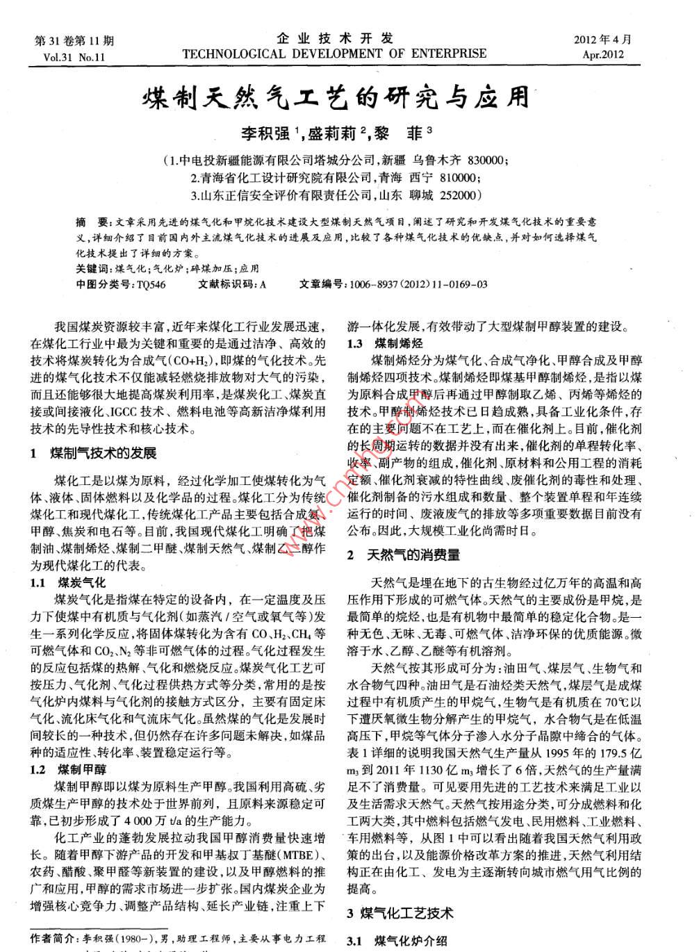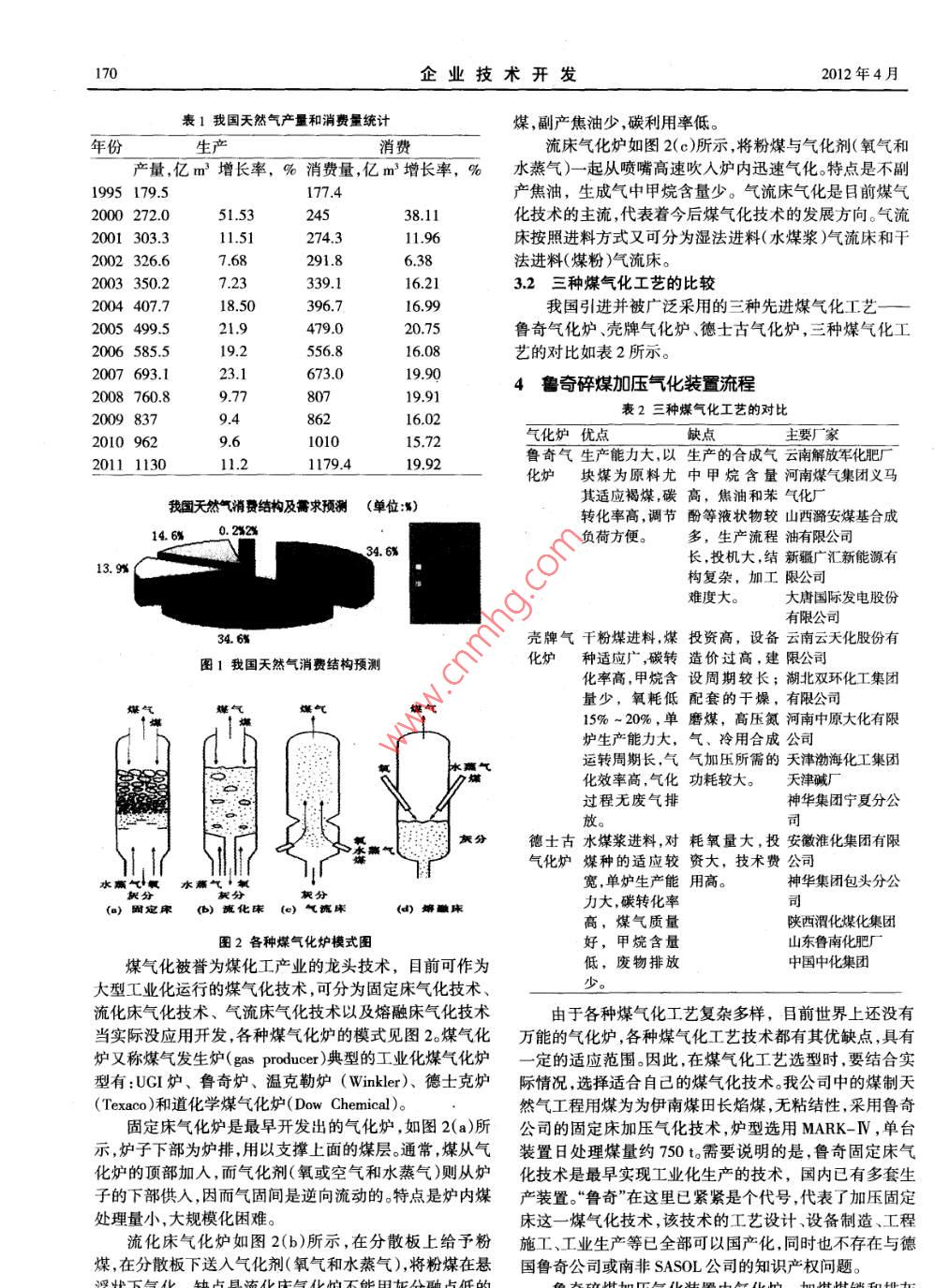第31卷第11期企業(yè)技術(shù)開發(fā)2012年4月.Vol.31 No.11TECHNOLOGICAL DEVELOPMENT OF ENTERPRISEApr.2012煤制天然氣工藝的研究與應(yīng)用李積強(qiáng)1,盛莉莉2,黎菲3(1.中電投新疆能源有限公司塔城分公司,新疆烏魯木齊830000;2.青海省化工設(shè)計研究院有限公司,青海西寧810000;3.山東正信安全評價有限責(zé)任公司,山東聊城252000)摘要:文章采用先進(jìn)的煤氣化和甲烷化技術(shù)建設(shè)大型煤制天然氣項(xiàng)目,闡述了研究和開發(fā)煤氣化技術(shù)的重要意義,詳細(xì)介紹了目前國內(nèi)外主流煤氣化技術(shù)的進(jìn)展及應(yīng)用,比較了各種煤氣化技術(shù)的優(yōu)缺點(diǎn),并對如何選擇煤氣化技術(shù)提出了詳細(xì)的方案。關(guān)鍵詞:煤氣化;氣化爐;碎煤加壓;應(yīng)用中圖分類號:TQ546文獻(xiàn)標(biāo)識碼:A .文章編號: 1006- 8937 (2012)11-0169-03我國煤炭資源較豐富,近年來煤化工行業(yè)發(fā)展迅速,游一體化發(fā)展,有效帶動了大型煤制甲醇裝置的建設(shè)。在煤化工行業(yè)中最為關(guān)鍵和重要的是通過潔凈、高效的1.3 煤制烯烴技術(shù)將煤炭轉(zhuǎn)化為合成氣(CO+H2),即煤的氣化技術(shù)。先煤制烯烴分為煤氣化、合成氣凈化、甲醇合成及甲醇進(jìn)的煤氣化技術(shù)不僅能減輕燃燒排放物對大氣的污染,制烯烴四項(xiàng)技術(shù)。煤制烯烴即煤基甲醇制烯烴,是指以煤而且還能夠很大地提高煤炭利用率,是煤炭化工、煤炭直為原料合成甲醇后再通過甲醇制取乙烯、丙烯等烯烴的接或間接液化、IGCC技術(shù)、燃料電池等高新潔凈煤利用技術(shù)。甲醇制烯烴技術(shù)已日趨成熟,具備工業(yè)化條件,存:技術(shù)的先導(dǎo)性技術(shù)和核心技術(shù)。在的主要問題不在工藝上,而在催化劑上。目前,催化劑的長周期運(yùn)轉(zhuǎn)的數(shù)據(jù)并沒有出來,催化劑的單程轉(zhuǎn)化率、1煤制氣技術(shù)的發(fā)展收率、副產(chǎn)物的組成,催化劑、原材料和公用工程的消耗煤化工是以煤為原料,經(jīng)過化學(xué)加工使煤轉(zhuǎn)化為氣定 額、催化劑衰減的特性曲線、廢催化劑的毒性和處理、體、液體、固體燃料以及化學(xué)品的過程。煤化工分為傳統(tǒng)催化劑制備的污水組成和數(shù)量、整個裝置單程和年連續(xù)煤化工和現(xiàn)代煤化工,傳統(tǒng)煤化工產(chǎn)品主要包括合成氨、運(yùn)行的時間 、廢液廢氣的排放等多項(xiàng)重要數(shù)據(jù)目前沒有甲醇、焦炭和電石等。目前,我國現(xiàn)代煤化工明確了把煤公布。因此,大規(guī)模工業(yè)化尚需時日。制油、煤制烯烴、煤制二甲醚、煤制天然氣、煤制乙二醇作2天然氣的消費(fèi)量為現(xiàn)代煤化工的代表。1.1 煤炭氣化天然氣是埋在地下的古生物經(jīng)過億萬年的高溫和高煤炭氣化是指煤在特定的設(shè)備內(nèi),在一-定溫度及壓壓作用下形成的可燃?xì)怏w。天然氣的主要成份是甲烷,是力下使煤中有機(jī)質(zhì)與氣化劑(如蒸汽1空氣或氧氣等)發(fā)最簡 單的烷烴,也是有機(jī)物中最簡單的穩(wěn)定化合物。是一生一系列化學(xué)反應(yīng),將固體煤轉(zhuǎn)化為含有CO、H、CH4等種無色 、無味、無毒、可燃?xì)怏w、潔凈環(huán)保的優(yōu)質(zhì)能源。微可燃?xì)怏w和CO2、N2等非可燃?xì)怏w的過程。氣化過程發(fā)生溶于水、乙醇、乙醚等有機(jī)溶劑。的反應(yīng)包括煤的熱解、氣化和燃燒反應(yīng)。煤炭氣化工藝可天然氣按其形成可分為:油田氣、煤層氣、生物氣和按壓力、氣化劑、氣化過程供熱方式等分類,常用的是按水 合物氣四種。油田氣是石油烴類天然氣,煤層氣是成煤氣化爐內(nèi)煤料與氣化劑的接觸方式區(qū)分,主要有固定床過程中有機(jī)質(zhì)產(chǎn)生的甲烷氣,生物氣是有機(jī)質(zhì)在70C以氣化、流化床氣化和氣流床氣化。雖然煤的氣化是發(fā)展時下遭厭氧微生物分解產(chǎn)生的甲烷氣,水合物氣是在低溫間較長的一種技術(shù),但仍然存在許多問題未解決,如煤品高壓下,甲烷等氣體分子滲入水分子晶隙中締合的氣體。種的適應(yīng)性、轉(zhuǎn)化率裝置穩(wěn)定運(yùn)行等。表1詳細(xì)的說明我國天然氣生產(chǎn)量從1995 年的179.5億1.2 煤制甲醇m3到2011年1130億m3增長了6倍,天然氣的生產(chǎn)量滿煤制甲醇即以煤為原料生產(chǎn)甲醇。我國利用高硫、劣足不了消費(fèi)量。可見要用先進(jìn)的工藝技術(shù)來滿足工業(yè)以質(zhì)煤生產(chǎn)甲醇的技術(shù)處于世界前列,且原料來源穩(wěn)定可及生活需求天然氣。天然氣按用途分類,可分成燃料和化靠,已初步形成了4 000萬ta的生產(chǎn)能力。工兩大類,其中燃料包括燃?xì)獍l(fā)電、民用燃料、工業(yè)燃料、化工產(chǎn)業(yè)的蓬勃發(fā)展拉動我國甲醇消費(fèi)量快速增車用燃料等,從圖1中可以看出隨著我國天然氣利用政長。隨著甲醇下游產(chǎn)品的開發(fā)和甲基叔丁基醚(MTBE)、策的出臺,以及能源價格改革方案的推進(jìn),天然氣利用結(jié)農(nóng)藥、醋酸、聚甲醛等新裝置的建設(shè),以及甲醇燃料的推構(gòu)正在由化工、發(fā)電為主逐漸轉(zhuǎn)向城市燃?xì)庥脷獗壤膹V和應(yīng)用,甲醇的需求市場進(jìn)- - 步擴(kuò)張。國內(nèi)煤炭企業(yè)為提高。增強(qiáng)核心競爭力、調(diào)整產(chǎn)品結(jié)構(gòu)延長產(chǎn)業(yè)