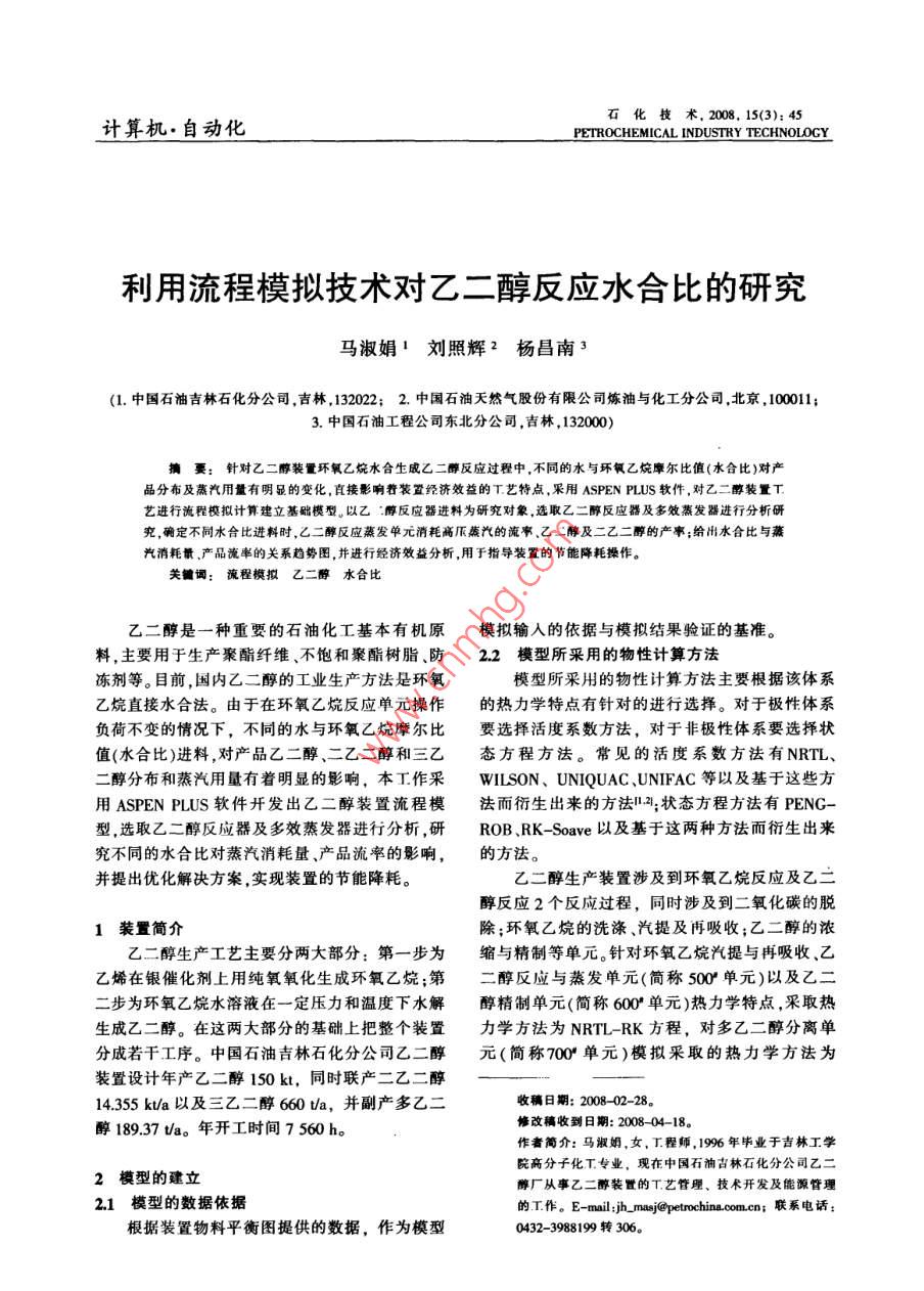 利用流程模擬技術(shù)對(duì)乙二醇反應(yīng)水合比的研究