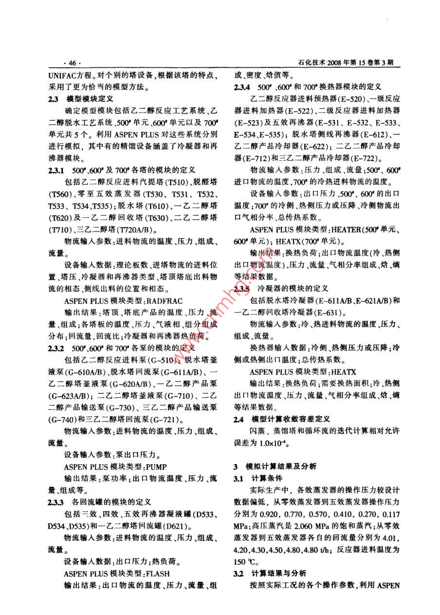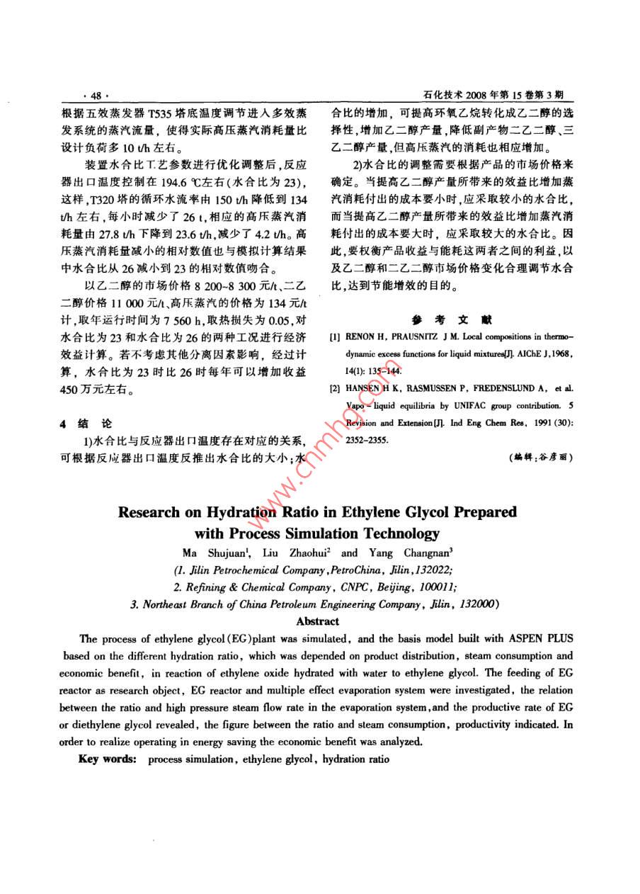 計(jì)算機(jī)·自動(dòng)化石化技術(shù),2008,15(3):45PETROCHEMICAL INDUSTRY TECHNOLOGY利用流程模擬技術(shù)對(duì)乙二醇反應(yīng)水合比的研究馬淑娟1劉照輝2楊昌南3(1.中國石油吉林石化分公司,吉林,132022;2.中國石油天然氣股份有限公司煉油與化工分公司,北京,10001;3.中國石油工程公司東北分公司,吉林,132000摘要:針對(duì)乙二醇裝置環(huán)氧乙烷水合生成乙二醇反應(yīng)過程中,不同的水與環(huán)氧乙烷摩爾比值(水合比)對(duì)產(chǎn)品分布及蒸汽用量有明顯的變化,直接影響著裝置經(jīng)濟(jì)效益的T藝特點(diǎn),采用 ASPEN PLUS軟件,對(duì)乙二醇裝置T藝進(jìn)行流程模擬計(jì)算建立基礎(chǔ)模型。以乙:醇反應(yīng)器進(jìn)料為研究對(duì)象,選取乙二醇反應(yīng)器及多效蒸發(fā)器進(jìn)行分析研究,確定不同水合比進(jìn)料時(shí),乙二醇反應(yīng)蒸發(fā)單元消耗高壓蒸汽的流率、乙二醇及二乙二醇的產(chǎn)率;給出水合比與蒸汽消耗欹、產(chǎn)品流率的關(guān)系趨勢(shì)圖,并進(jìn)行經(jīng)濟(jì)效益分析用于指導(dǎo)裝置的節(jié)能降耗操作關(guān)鵪詞:流程模擬乙二醇水合比乙二醇是一種重要的石油化工基本有機(jī)原模擬輸入的依據(jù)與模擬結(jié)果驗(yàn)證的基準(zhǔn)料,主要用于生產(chǎn)聚酯纖維、不飽和聚酯樹脂、防22模型所采用的物性計(jì)算方法凍劑等。目前,國內(nèi)乙二醇的工業(yè)生產(chǎn)方法是環(huán)氧模型所采用的物性計(jì)算方法主要根據(jù)該體系乙烷直接水合法。由于在環(huán)氧乙烷反應(yīng)單元操作的熱力學(xué)特點(diǎn)有針對(duì)的進(jìn)行選擇。對(duì)于極性體系負(fù)荷不變的情況下,不同的水與環(huán)氧乙烷摩爾比要選擇活度系數(shù)方法,對(duì)于非極性體系要選擇狀值(水合比)進(jìn)料對(duì)產(chǎn)品乙二醇、二乙二醇和三乙態(tài)方程方法。常見的活度系數(shù)方法有NRTL、醇分布和蒸汽用量有著明顯的影響,本工作采 WILSON、 UNIQUAC、 UNIFAC等以及基于這些方用 ASPEN PLUS軟件開發(fā)出乙二醇裝置流程模法而衍生出來的方法M2;狀態(tài)方程方法有PENG-型,選取乙二醇反應(yīng)器及多效蒸發(fā)器進(jìn)行分析,研ROB、 RK-Soave以及基于這兩種方法而衍生出來究不同的水合比對(duì)蒸汽消耗量、產(chǎn)品流率的影響,的方法。并提出優(yōu)化解決方案,實(shí)現(xiàn)裝置的節(jié)能降耗。乙二醇生產(chǎn)裝置涉及到環(huán)氧乙烷反應(yīng)及乙二醇反應(yīng)2個(gè)反應(yīng)過程,同時(shí)涉及到二氧化碳的脫1裝置簡介除;環(huán)氧乙烷的洗滌汽提及再吸收;乙二醇的濃乙二醇生產(chǎn)工藝主要分兩大部分:第一步為縮與精制等單元。針對(duì)環(huán)氧乙烷汽提與冉吸收、乙乙烯在銀催化劑上用純氧氧化生成環(huán)氧乙烷;第二醇反應(yīng)與蒸發(fā)單元(簡稱500單元)以及乙二步為環(huán)氧乙烷水溶液在一定壓力和溫度下水解醇精制單元(簡稱600單元)熱力學(xué)特點(diǎn),采取熱生成乙二醇。在這兩大部分的基礎(chǔ)上把整個(gè)裝置學(xué)方法為NRTL-RK方程,對(duì)多乙二醇分離單分成若干工序。中國石油吉林石化分公司乙二醇元(簡稱700單元)模擬采取的熱力學(xué)方法為裝置設(shè)計(jì)年產(chǎn)乙二醇150kt,同時(shí)聯(lián)產(chǎn)二乙二醇14355kua以及三乙二醇660ta,并副產(chǎn)多乙收稿日期:200802-2醇18937ta。年開工時(shí)間7560h修改稿收到日期:2008-04-18作者簡介:馬淑姻,女,工程師,1996年畢業(yè)于吉林工學(xué)院高分子化工專業(yè),現(xiàn)在中國石油吉林石化分公司乙二2模型的建立醇廠從事乙二醇裝置的T藝管理、技術(shù)開發(fā)及能源管理21模型的數(shù)據(jù)依據(jù)的工作。E-mil;h_mass@petrochina.com.cn;聯(lián)系電話:根據(jù)裝置物料平衡圖提供的數(shù)據(jù),作為模型0432-3988199轉(zhuǎn)306。石化技術(shù)2008年第15卷第3期UNIFAC方程。對(duì)個(gè)別的塔設(shè)備,根據(jù)該塔的特點(diǎn),成、密度、焓值等采用了更為恰當(dāng)?shù)哪P头椒ā?3450°、600和70礦換熱器模塊的定義2.3模型模塊定義乙二醇反應(yīng)器進(jìn)料預(yù)熱器(E-520)、一級(jí)反應(yīng)確定模型模塊包括乙二醇反應(yīng)工藝系統(tǒng)、乙器進(jìn)料加熱器(E-522)、二級(jí)反應(yīng)器進(jìn)料加熱器二醇脫水工藝系統(tǒng)、500單元、600單元以及700(E-523)及五效再沸器(E-531、E-532、E-533、元共5個(gè)。利用 ASPEN PLUS對(duì)這些系統(tǒng)分別E-534E-535);脫水塔側(cè)線再沸器(E-612進(jìn)行模擬,其中有的精餾設(shè)備涵蓋了冷凝器和再乙二醇產(chǎn)品冷卻器(E-622);二乙二醇產(chǎn)品冷卻沸器模塊。器(E-712)和三乙二醇產(chǎn)品冷卻器(E-72)。23.1500°、600"及700°各塔的模塊的定義物流輸入?yún)?shù):壓力、組成、流量;500、600°包括乙二醇反應(yīng)進(jìn)料汽提塔(T510)、脫醛塔進(jìn)口物流的溫度,70的冷熱進(jìn)料物流的溫度(T560)、零至五效蒸發(fā)器(T530、T531、T532設(shè)備輸入?yún)?shù):出口壓力、500"、600的出口T533、T534、T535);脫水塔(T610)、一乙二醇塔溫度;700°的冷側(cè)、熱側(cè)壓力或壓降、冷側(cè)物流出(T620)及一乙二醇回收塔(T630)、二乙二醇塔口氣相分率、總傳熱系數(shù)。(T710)、三乙二醇塔(T720A/B)。ASPEN PLUS模塊類型: HEATER(500單元、物流輸入?yún)?shù):進(jìn)料物流的溫度