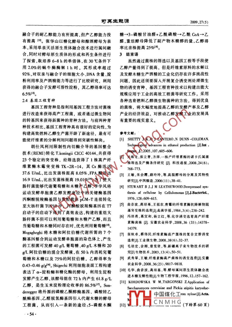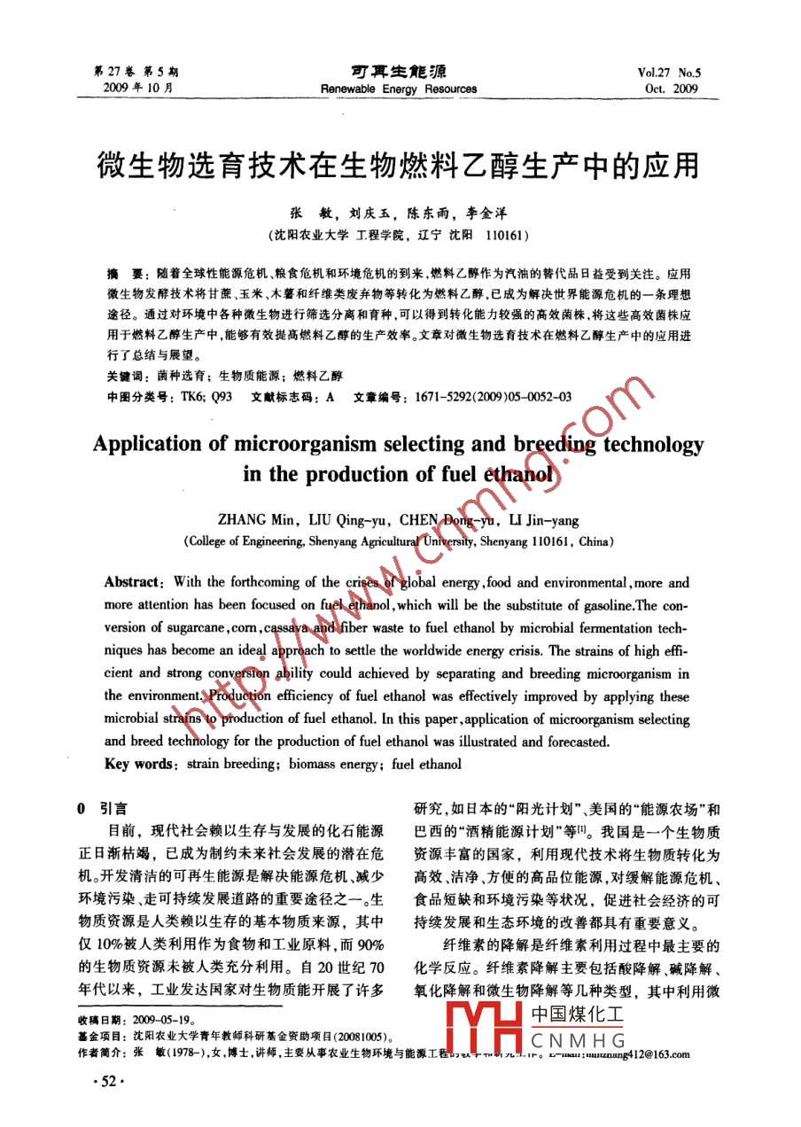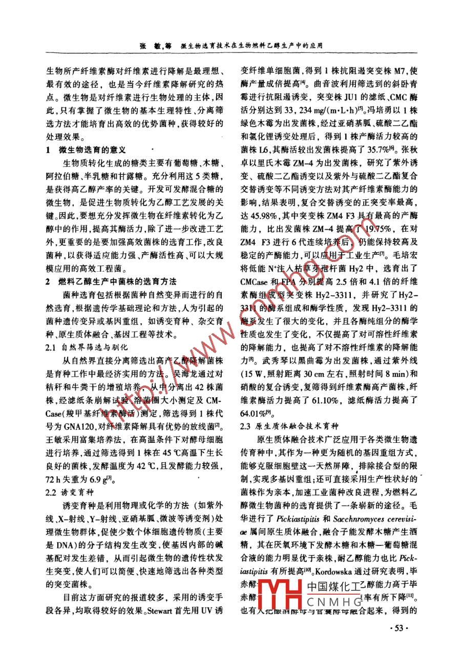 第27卷第5期可耳生能Vol 27 No 5009年10月renewable Energy Resources0ct.2009微生物選育技術(shù)在生物燃料乙醇生產(chǎn)中的應用張敏,劉慶玉,陳東雨,李金洋(沈陽農(nóng)業(yè)大學丁程學院,遼寧沈陽110161)摘要:隨著全球性能源危機、糧食危機和環(huán)境危機的到來燃料乙醇作為汽油的替代品日益受到關(guān)注。應用微生物發(fā)酵技術(shù)將甘蔗、玉米、木薯和纖維類廢棄物等轉(zhuǎn)化為燃料乙醇已成為解決世界能源危機的一條理想途徑。通過對環(huán)境中各種微生物進行篩選分離和育種,可以得到轉(zhuǎn)化能力較強的高效菌株,將這些高效菌株應用于燃料乙醇生產(chǎn)中,能夠有效提高燃料乙醇的生產(chǎn)效率。文章對微生物選育技術(shù)在燃料乙醇生產(chǎn)中的應用進行了總結(jié)與展望。關(guān)鍵詞:菌種選育;生物質(zhì)能源;燃料乙醇中圖分類號:TK6;Q93文獻標志碼:A文章編號:1671-5292(2000050052-03Application of microorganism selecting and breeding technologyin the production of fuel ethanolZHANG Min, LIU Qing-yu, CHEN Dong-yu, LI Jin-yangCollege of Engineering, Shenyang Agricultural University, Shenyang 110161, China)Abstract: With the forthcoming of the crises of global energy, food and environmental, more andmore attention has been focused on fuel ethanol, which will be the substitute of gasoline. The con-version of sugarcane, com, cassava and fiber waste to fuel ethanol by microbial fermentation techniques has become an ideal approach to settle the worldwide energy crisis. the strains of high efficient and strong conversion ability could achieved by separating and breeding microorganism inthe environment. Production efficiency of fuel ethanol was effectively improved by applying theseand breed technology for the production of fuel ethanol was illustrated and forecasted selectingmicrobial strains to production of fuel ethanol. In this paper, application of microorganiKey words: strain breeding: biomass energy; fuel ethanol0引言研究,如日本的“陽光計劃”、美國的“能源農(nóng)場”和目前,現(xiàn)代社會賴以生存與發(fā)展的化石能源巴西的“酒精能源計劃”等。我國是一個生物質(zhì)正日漸枯竭,已成為制約未來社會發(fā)展的潛在危資源豐富的國家,利用現(xiàn)代技術(shù)將生物質(zhì)轉(zhuǎn)化為機。開發(fā)清潔的可再生能源是解決能源危機、減少高效潔凈方便的高品位能源,對緩解能源危機環(huán)境污染、走可持續(xù)發(fā)展道路的重要途徑之一。生食品短缺和環(huán)境污染等狀況,促進社會經(jīng)濟的可物質(zhì)資源是人類賴以生存的基本物質(zhì)來源,其中持續(xù)發(fā)展和生態(tài)環(huán)境的改善都具有重要意義。僅10%被人類利用作為食物和工業(yè)原料,而90%纖維素的降解是纖維素利用過程中最主要的的生物質(zhì)資源未被人類充分利用。自20世紀70化學反應。纖維素降解主要包括酸降解堿降解年代以來,工業(yè)發(fā)達國家對生物質(zhì)能開展了許多氧化降解和微生物降解等幾種類型,其中利用微收稿日期:200905-19中國煤化工基金項目:沈陽農(nóng)業(yè)大學青年教師科研基金資助項目(20081005)。CNMHG作者簡介:張敏(1978-),女博士,講師,主要從事農(nóng)業(yè)生物環(huán)境與能源ror-mau:uuunung412@163.com5敏,等微生物選育技術(shù)在生物然料乙醇生產(chǎn)中的應用生物所產(chǎn)纖維素酶對纖維素進行降解是最理想、變纖維單細胞菌,得到1株抗阻遏突變株M7,使最有效的途徑,也是當今纖維素降解研究的熱酶產(chǎn)量成倍提高。曲音波利用篩選到的斜臥青點。微生物是對纖維素進行生物處理的主體,因霉進行抗阻遏誘變,突變株JU1的濾紙CMC酶此,只有掌握了微生物的基本生理特性、分離篩活分別達到33,234mg/(mLh門。馮培勇以1株選方法才能培育出髙效的優(yōu)勢菌種,獲得較好的綠色木霉為出發(fā)菌株,經(jīng)過亞硝基胍、硫酸二乙酯處理效果。和氯化鋰誘變處理后,得到1株產(chǎn)酶活力較高的1微生物選育的意義菌株L6,其酶活較出發(fā)菌株提高了35.7%。張秋生物質(zhì)轉(zhuǎn)化生成的糖類主要有葡萄糖、木糖、卓以里氏木霉ZM-4為出發(fā)菌株,研究了紫外誘阿拉伯糖、半乳糖和甘露糖。充分利用這5類糖,變、硫酸二乙酯誘變以及紫外與硫酸二乙酯復合是獲得高乙醇產(chǎn)率的關(guān)鍵。開發(fā)可發(fā)酵混合糖的交替誘變等不同誘變方法對其產(chǎn)纖維素酶能力的微生物,是促進生物質(zhì)轉(zhuǎn)化為乙醇工藝發(fā)展的關(guān)影響,結(jié)果表明,復合交替誘變的正突變率最高,鍵。因此,要想充分發(fā)揮微生物在纖維素轉(zhuǎn)化為乙達45.98%,其中突變株ZM4F3具有最高的產(chǎn)酶醇中的作用,提高其酶活力,除了進一步改進工藝能力,比出發(fā)菌株ZM-4提高了1975%,在對外,更重要的是要加強高效菌株的選育工作,改良ZM4F3進行6代連續(xù)培養(yǎng)后,仍能保持較髙及菌種,以獲得適應能力強、產(chǎn)酶活性高、可以大規(guī)穩(wěn)定的產(chǎn)酶能力,可以應用于工業(yè)生產(chǎn)。毛培宏模應用的高效工程菌將低能N注入枯草芽孢桿菌Hy2中,選育出了2燃料乙醇生產(chǎn)中菌株的選育方法CMCase和FPA分別提高25倍和41倍的纖維菌種選育包括根據(jù)菌種自然變異而進行的自素酶組成型突變株Hy2-331,并研究了Hy2然選育,根據(jù)遺傳學基礎(chǔ)理論和方法,人為引起的3311的酶系組成和酶學性質(zhì),發(fā)現(xiàn)Hy2-311的菌種遺傳變異或基因重組,