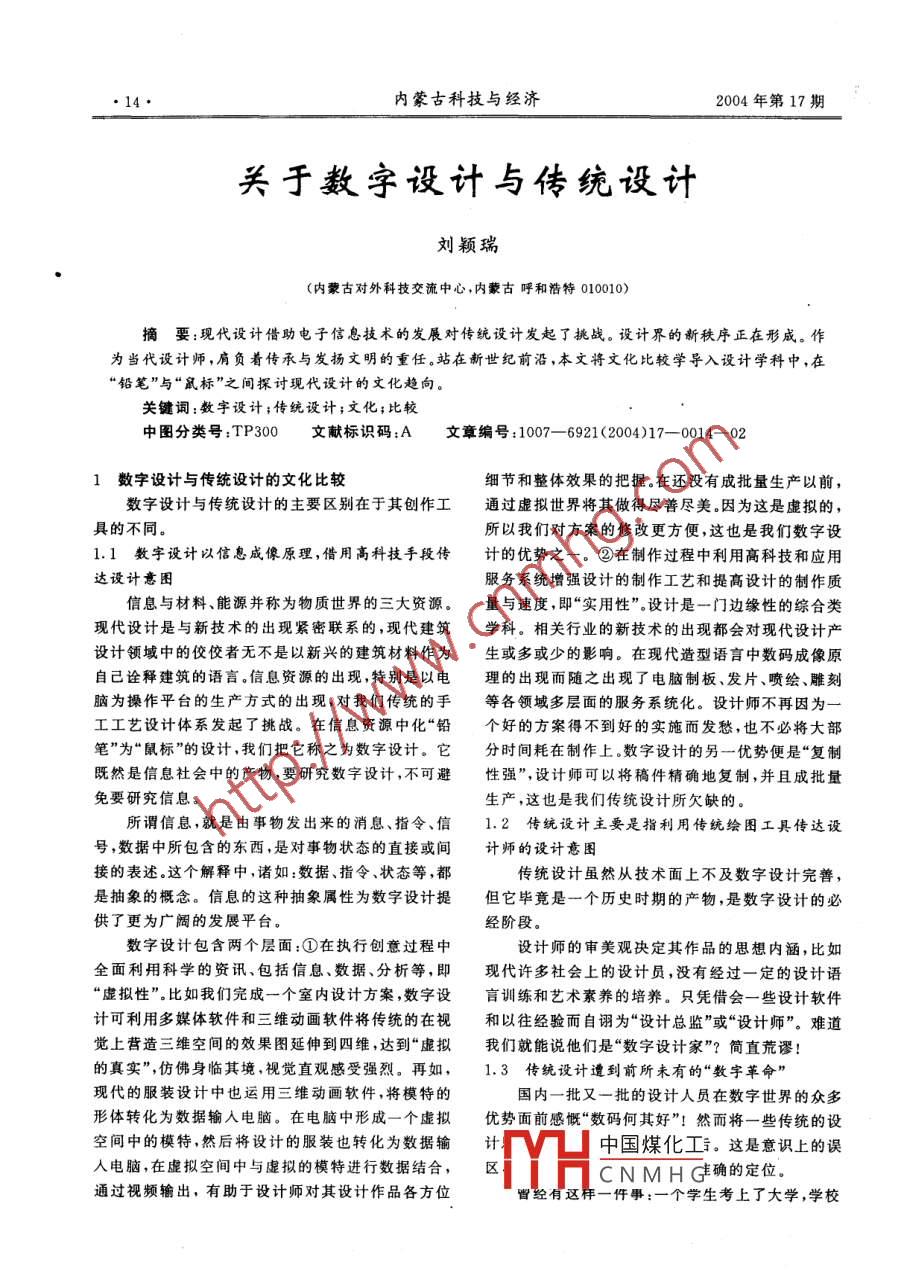 ●14●內(nèi)蒙古科技與經(jīng)濟(jì)2004年第17期.關(guān)于數(shù)字設(shè)計(jì)與傳統(tǒng)設(shè)計(jì)劉穎瑞(內(nèi)蒙古對(duì)外科技交流中心,內(nèi)蒙古呼和浩特010010)摘要:現(xiàn)代設(shè)計(jì)借助電子信息技術(shù)的發(fā)展對(duì)傳統(tǒng)設(shè)計(jì)發(fā)起了挑戰(zhàn)。 設(shè)計(jì)界的新秩序正在形成。作.為當(dāng)代設(shè)計(jì)師,肩負(fù)著傳承與發(fā)揚(yáng)文明的重任。站在新世紀(jì)前沿,本文將文化比較學(xué)導(dǎo)入設(shè)計(jì)學(xué)科中,在“鉛筆”與“鼠標(biāo)”之間探討現(xiàn)代設(shè)計(jì)的文化趨向。關(guān)鍵詞:數(shù)宇設(shè)計(jì);傳統(tǒng)設(shè)計(jì);文化;比較中圖分類號(hào):TP300文獻(xiàn)標(biāo)識(shí)碼:A文章編號(hào):1007- 6921 (2004)17- -0014- -021數(shù)字設(shè)計(jì) 與傳統(tǒng)設(shè)計(jì)的文化比較細(xì)節(jié)和整體效果的把握。在還沒(méi)有成批量生產(chǎn)以前,數(shù)字設(shè)計(jì)與傳統(tǒng)設(shè)計(jì)的主要區(qū)別在于其創(chuàng)作工通過(guò)虛擬世界將其做得盡善盡美。因?yàn)檫@是虛擬的,具的不同。所以我們對(duì)方案的修改更方便,這也是我們數(shù)字設(shè).1.1 數(shù)字設(shè)計(jì)以信息成像原理,借用高科技手段傳計(jì)的優(yōu)勢(shì)之一。②在制作過(guò)程中利用高科技和應(yīng)用達(dá)設(shè)計(jì)意圖服務(wù)系統(tǒng)增強(qiáng)設(shè)計(jì)的制作工藝和提高設(shè)計(jì)的制作質(zhì)信息與材料、能源并稱為物質(zhì)世界的三大資源。量與速度,即“實(shí)用性”。設(shè)計(jì)是一門(mén)邊緣性的綜合類現(xiàn)代設(shè)計(jì)是與新技術(shù)的出現(xiàn)緊密聯(lián)系的,現(xiàn)代建筑.學(xué)科。相關(guān)行業(yè)的新技術(shù)的出現(xiàn)都會(huì)對(duì)現(xiàn)代設(shè)計(jì)產(chǎn)設(shè)計(jì)領(lǐng)域中的佼佼者無(wú)不是以新興的建筑材料作為生或多或少的影響。在現(xiàn)代造型語(yǔ)言中數(shù)碼成像原自己詮釋建筑的語(yǔ)言。信息資源的出現(xiàn),特別是以電理的出現(xiàn)而隨之出現(xiàn)了電腦制板、發(fā)片、噴繪、雕刻腦為操作平臺(tái)的生產(chǎn)方式的出現(xiàn),對(duì)我們傳統(tǒng)的手等各領(lǐng)域多層面的服務(wù)系統(tǒng)化。設(shè)計(jì)師不再因?yàn)橐还すに囋O(shè)計(jì)體系發(fā)起了挑戰(zhàn)。在信息資源中化“鉛個(gè)好的方案得不到好的實(shí)施而發(fā)愁,也不必將大部筆”為“鼠標(biāo)”的設(shè)計(jì),我們把它稱之為數(shù)字設(shè)計(jì)。它分時(shí)間耗在制作上。數(shù)字設(shè)計(jì)的另一優(yōu)勢(shì)便是“復(fù)制既然是信息社會(huì)中的產(chǎn)物,要研究數(shù)字設(shè)計(jì),不可避性強(qiáng)”,設(shè)計(jì)師可以將稿件精確地復(fù)制,并且成批量免要研究信息。生產(chǎn),這也是我們傳統(tǒng)設(shè)計(jì)所欠缺的。所謂信息,就是由事物發(fā)出來(lái)的消息、指令、信1.2 傳統(tǒng)設(shè)計(jì)主要是指利用傳統(tǒng)繪圖工具傳達(dá)設(shè)號(hào),數(shù)據(jù)中所包含的東西,是對(duì)事物狀態(tài)的直接或間計(jì)師的設(shè)計(jì)意圖接的表述.這個(gè)解釋中,諸如:數(shù)據(jù)、指令、狀態(tài)等,都.傳統(tǒng)設(shè)計(jì)雖然從技術(shù)面上不及數(shù)字設(shè)計(jì)完善,是抽象的概念。信息的這種抽象屬性為數(shù)字設(shè)計(jì)提但它畢竟是一個(gè)歷史時(shí)期的產(chǎn)物,是數(shù)字設(shè)計(jì)的必供了更為廣闊的發(fā)展平臺(tái)。經(jīng)階段。數(shù)字設(shè)計(jì)包含兩個(gè)層面:①在執(zhí)行創(chuàng)意過(guò)程中設(shè)計(jì)師的審美觀決定其作品的思想內(nèi)涵,比如全面利用科學(xué)的資訊、包括信息、數(shù)據(jù)、分析等,即.現(xiàn)代許多社會(huì)上的設(shè)計(jì)員,沒(méi)有經(jīng)過(guò)一定的設(shè)計(jì)語(yǔ)“虛擬性”。比如我們完成一個(gè)室內(nèi)設(shè)計(jì)方案,數(shù)字設(shè)盲訓(xùn)練和藝術(shù)素養(yǎng)的培養(yǎng)。只憑借會(huì)-些設(shè)計(jì)軟件計(jì)可利用多媒體軟件和三維動(dòng)畫(huà)軟件將傳統(tǒng)的在視和以往經(jīng)驗(yàn)而自詡為“設(shè)計(jì)總監(jiān)”或“設(shè)計(jì)師”。難道覺(jué)上營(yíng)造三維空間的效果圖延伸到四維,達(dá)到“虛擬我們就能說(shuō)他們是“數(shù)字設(shè)計(jì)家”?簡(jiǎn)直荒謬!的真實(shí)”,仿佛身臨其境,視覺(jué)直觀感受強(qiáng)烈。再如,1.3 傳統(tǒng)設(shè)計(jì)遭到前所未有的“數(shù)字革命”現(xiàn)代的服裝設(shè)計(jì)中也運(yùn)用三維動(dòng)畫(huà)軟件,將模特的國(guó)內(nèi)-批又-批的設(shè)計(jì)人員在數(shù)字世界的眾多形體轉(zhuǎn)化為數(shù)據(jù)輸人電腦。在電腦中形成- -個(gè)虛擬優(yōu)勢(shì)面前感慨“數(shù)碼何其好”!然而將一些傳統(tǒng)的設(shè)空間中的模特,然后將設(shè)計(jì)的服裝也轉(zhuǎn)化為數(shù)據(jù)輸中國(guó)煤化工。這是意識(shí)上的誤人電腦,在虛擬空間中與虛擬的模特進(jìn)行數(shù)據(jù)結(jié)合,CNMH C確的定位。通過(guò)視頻輸出,有助于設(shè)計(jì)師對(duì)其設(shè)計(jì)作品各方位曾經(jīng)有這樣一件事:一個(gè)學(xué)生考上了大學(xué),學(xué