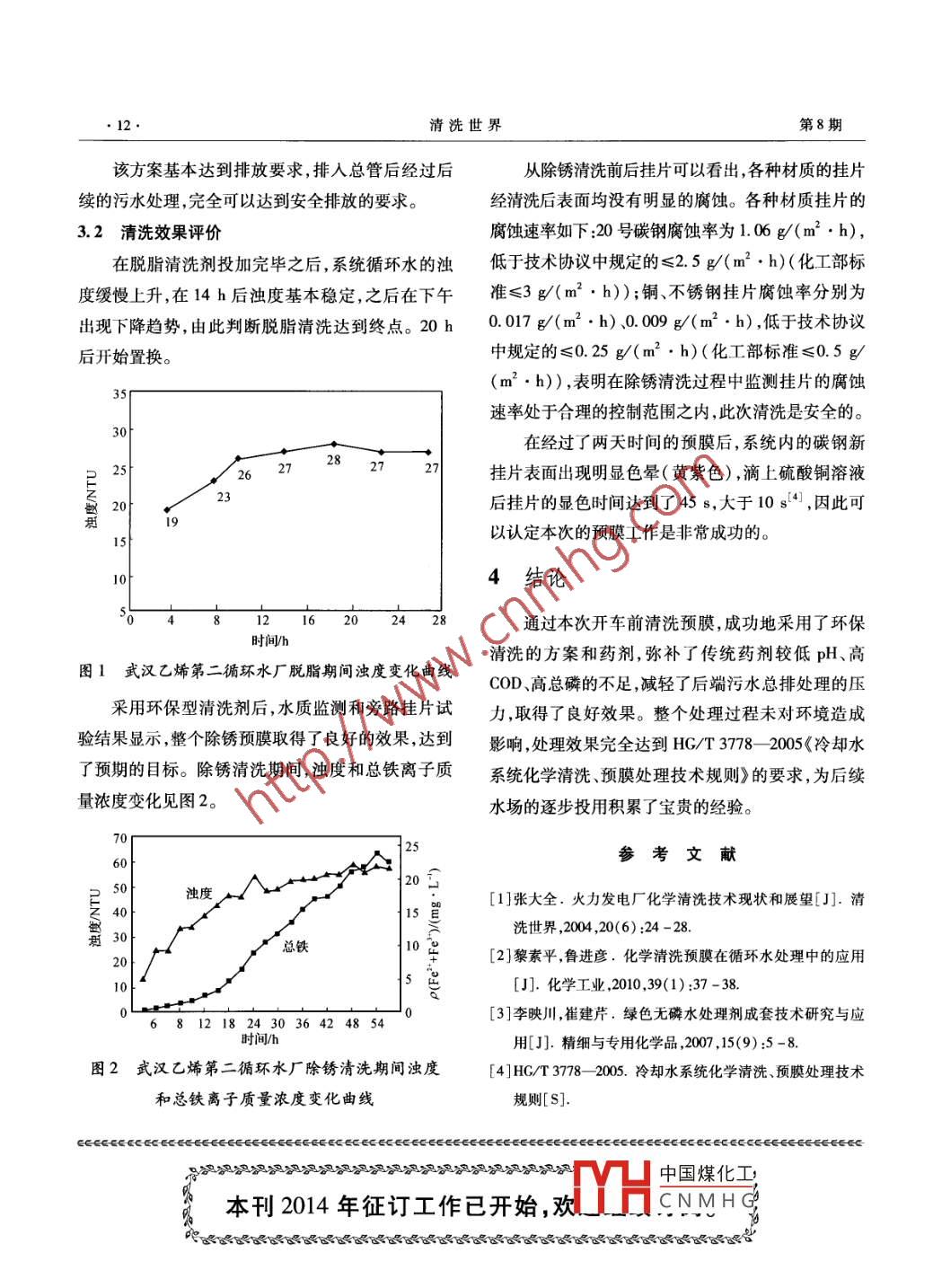 實(shí)用拔術(shù)清洗世界第29卷第8期Cleaning World2013年8月文章編號(hào):1671 - 8909(2013)08 -0010 -03循環(huán)水系統(tǒng)環(huán)保型清洗預(yù)膜劑在武漢乙烯項(xiàng)目中的應(yīng)用趙婷婷' ,張勁松' ,張大全2(1.中石化武漢分公司乙烯廠,武漢430000;2.上海電力學(xué)院 環(huán)境工程系,上海200090)摘要:采用環(huán)保型清洗預(yù)膜劑對(duì)武漢乙烯項(xiàng)目第二循環(huán)水場(chǎng) 系統(tǒng)進(jìn)行清洗預(yù)膜處理,通過脫脂清洗、除銹清洗和預(yù)膜等工藝應(yīng)用,降低了清洗廢水中污染物排放濃度,取得了良好效果。關(guān)鍵詞:循環(huán)水系統(tǒng);清洗;預(yù)膜;環(huán)境保護(hù)中圖分類號(hào):TQ085文獻(xiàn)標(biāo)識(shí)碼:BApplication of green cleaning and prefilm agentin circulation water system of Wuhan Ethylene PlantZHAO Tingting' , ZHANG Jinsong' ,ZHANG Daquan2(1. Ethylene Plant of W uhan Branch of SINOPEC , W uhan , Hubei 430000 , China;2. Department of Environmental Engineering , Shanghai University of Electric Power , Shanghai 200090 , China)Abstract: The environmental - friendly cleaning and prefilm chemicals are used in the second circu-lating water plant of the W uhan ethylene project. The technical process includes degrease ,rust clean-ing and prefilm. The water quality monitoring and corrosion coupon test show that the discharge con-centration of pollutants in the cleaning waste water decreases. The cleaning prefilm goes very well.Key words :circulating water system ; cleaning; prefilm ; environmental protection循環(huán)冷卻水全系統(tǒng)的清洗預(yù)膜是熱交換器運(yùn)行質(zhì)穩(wěn)定、材質(zhì)保護(hù)打下良好的基礎(chǔ)[2]。維護(hù)的一項(xiàng)重要工作。循環(huán)冷卻水全系統(tǒng)的清洗預(yù)系統(tǒng)開車前的清洗預(yù)膜已成為循環(huán)水系統(tǒng)投用膜,通過將所有換熱器、管線中的油污、腐蝕產(chǎn)物等前的必要運(yùn)行措施,常規(guī)處理過程包括脫脂-酸洗清洗干凈,從而顯著提高換熱效果"。尤其是新裝-磷系預(yù)膜等過程。這種成熟而被廣泛采用的方式置開車前的清洗預(yù)膜,利用化學(xué)藥劑與兩價(jià)金屬離具有效果良好,成本可控的優(yōu)點(diǎn),但也存在大量酸性子,如Ca2+、Zn2+、Fe2+等形成絡(luò)合物,在活化的金屬排水、清洗廢水排放COD與總磷過高的不足。在環(huán)表面形成致密、極薄的保護(hù)膜,可以為今后的常規(guī)水保要求 日益增強(qiáng)的情況下,傳統(tǒng)的清洗預(yù)膜已不能中國(guó)煤化工收稿日期:2013-04 - 10作者簡(jiǎn)介:趙婷婷( 1986 -),女,本科,研究方向:電廠化學(xué)及水處理。MHCNMHG通訊作者簡(jiǎn)介:張大全( 1968 -) ,男,河南潢川人,博士,教授,主要研究方向:金屬腐蝕與防護(hù)。.第29卷趙婷婷等.循環(huán)水系統(tǒng)環(huán)保型清洗預(yù)膜劑在武漢乙烯項(xiàng)目中的應(yīng)用滿足環(huán)境影響評(píng)價(jià)要求。目前歐美發(fā)達(dá)國(guó)家已開始投運(yùn)初期進(jìn)行此次的化學(xué)清洗預(yù)膜工作。本次化學(xué)禁磷限磷'],非磷系的清洗預(yù)膜技術(shù)具有廣闊的應(yīng)清洗、預(yù)膜方案參照行業(yè)標(biāo)準(zhǔn)HG/T 3778- 2005《冷用前景。武漢新乙烯公司作為有強(qiáng)烈社會(huì)責(zé)任感的卻水系統(tǒng)化學(xué)清洗、預(yù)膜處理技術(shù)規(guī)則》制定。企業(yè),在各循環(huán)水場(chǎng)投用前,均采用環(huán)保型清洗預(yù)膜根據(jù)系統(tǒng)的實(shí)際情況,此次的化學(xué)清洗預(yù)膜作方案,取得了良好的處理效果。業(yè)主要分為脫脂清洗.除銹清洗和預(yù)膜三個(gè)步驟。通過脫脂清洗和除銹清洗,可以獲得活化清潔的金1系統(tǒng)狀況屬表面,從而為預(yù)膜工藝提供基礎(chǔ)。由于考慮到節(jié)武漢80萬Va乙烯建設(shè)項(xiàng)目是中石化“十一水和污染物控制等因素,在脫脂清洗和除銹清洗之五"期間重點(diǎn)工程之一。武漢乙烯第二循環(huán)水場(chǎng)設(shè)間未按常規(guī)流程進(jìn)行排污置換,僅在預(yù)膜工序之前計(jì)參數(shù)如表1所示。進(jìn)行排污。為控制總鐵離子質(zhì)量濃度小于1 mg/L,表1第二循環(huán)水場(chǎng)設(shè)計(jì)參數(shù)根據(jù)HG/T3778-2005《冷卻水系統(tǒng)化學(xué)清洗、預(yù)膜項(xiàng)目參數(shù)處理技術(shù)規(guī)則》標(biāo)準(zhǔn)方法確定脫脂、除銹和預(yù)膜效果。系統(tǒng)容量/m’15 000整個(gè)清洗預(yù)膜作業(yè)共歷時(shí)11天,自2013年4設(shè)計(jì)循環(huán)量/(m' .hI)45 000月18日開始,至2013年4月28日結(jié)束。清洗預(yù)膜最大循環(huán)量/(m' .h-I)41 216過程中檢測(cè)溶液的pH、濁度和總鐵離子質(zhì)量濃度變正常循環(huán)量/(m’.h~')38 871最大補(bǔ)水水量/(m3.h"')1 044化,同時(shí)進(jìn)行碳鋼掛片旁路監(jiān)測(cè),并采用硫酸銅溶液系統(tǒng)主要材質(zhì)碳鋼、不銹鋼、銅滴定法來進(jìn)行預(yù)膜效果的檢測(cè)。主要補(bǔ)水采用常規(guī)的長(zhǎng)江流域的工業(yè)補(bǔ)充水,3結(jié)果與討論由于企業(yè)所處的位置毗鄰北湖、長(zhǎng)江等主要水系,因此對(duì)環(huán)保的要求十分苛刻,同時(shí)考慮到排放水域涉及3.1 環(huán)保藥劑的選擇水產(chǎn)的重點(diǎn)養(yǎng)殖區(qū),因此除了清洗預(yù)膜效果必須達(dá)到常規(guī)使用的清洗預(yù)膜藥劑主要為,無機(jī)酸檸檬相應(yīng)的行業(yè)標(biāo)準(zhǔn)外,