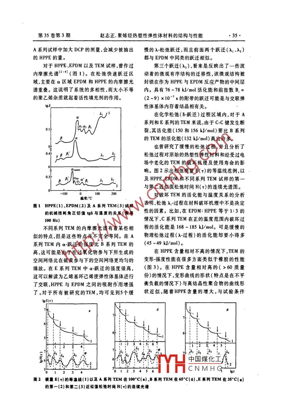 第35卷第3期世界橡膠工業(yè)vol.35No.3:34-372008年3月World Rubber Industry.析與測試ˇ聚烯烴熱塑性彈性體材料的結(jié)構(gòu)與性能趙志正(中橡集團西北橡膠塑料研究設計院陜西咸陽712023)編譯摘要:文中介紹了以HPPE與含第三單體ENB、DCPD的各種EPDM為基礎(chǔ)含有結(jié)構(gòu)助劑(DCP、堿黃、DM)的4個系列熱塑性彈性體材料:A系列TEMB系列TEM、C系列TEM、E系列介電型TEM的制造方法和性能,以及TEM各組分對其機械特性(彈性模量、強度、伸長率)及介電特性的影響。關(guān)鍵詞:聚烯烴;熱塑性彈性體;HPPE;EPDM中圖分類號:TQ314.2文獻標識碼:B文章編號:16718232(2008)03003404以聚烯烴為基礎(chǔ)的熱塑性彈性體材料為了制造介電型E系列的熱塑性彈性體(TEM),特別是熱塑性橡膠(TPR),也被人稱材料,使用了專門合成的EPDM60。它是通過為動態(tài)熱彈性塑料,它們的特征是:與其他彈性使乙烯、丙烯與乙烯基環(huán)己烯(VCH)在氯化二體相比,其線膨脹系數(shù)比較小,耐熱性、對氣候異丁基鋁和三乙?;淄徕C的參與下,在和輻射作用的穩(wěn)定性比較高,并且在長時間使10°C下產(chǎn)生共聚合制得的。所得粉末狀交聯(lián)用中可保持這些性能(l。共聚物的成分[%(mol)]如下:乙烯(51.9)丙該文的目的是研究熱塑性彈性體材料的制烯(47)、vCH(1.1)。作方法和成分對其機械性能(變形-強度和松弛E系列TEM的制造方法與A系列TEM的的性能)及電性能的影響。制法類似。把極性的活性劑從成分中清除出用兩種方法為基礎(chǔ)加工制造聚烯烴熱塑性去能改善材料的介電特性。E系列TEM的成彈性體:即乙丙彈性體[含有二環(huán)戊二烯分如下(質(zhì)量份):EPDM(100)、HPPE(10(DCPD)的EPDM40、EPDM50和含有亞乙基80)。降冰片烯(ENB)的EPDM40]及高密度聚乙烯與EPDM60與HPPE的機械共混體不同(HPPE)。結(jié)構(gòu)化組分使用的是硫黃與促進劑在A系列的TEM中會產(chǎn)生化學的變化。B系二硫代二苯并噻唑(DM),還可使用過氧化二列的TEM中,此類變化,實際上并未觸及HPE異丙苯(DCP)。相;在A系列的TEM中,上述兩種聚合物都參A系列的TEM(TPR)是使用開煉機在溫度與了跟過氧化二異丙苯的反應,產(chǎn)生了HPPE160~180°C,輥距約-02mm的條件下對原始部分接枝于彈性體上的現(xiàn)象。的材料進行共混,待結(jié)晶的HPPE軟化和熔化在TEM中的紅外光譜中可以看到,原始彈以后,再添加含有第三單體二環(huán)戊二烯的性體的特征譜帶:720cm(乙烯)、1378cmEPDM60。為了達到十分均勻的混合,宜進行(丙烯)、3045cm(二烯)的吸收強度減小了。25min混煉。A系列熱塑性彈性體的配合成分然而這種強度變化與各組分含量的變化不成比(質(zhì)量份):EPDM(100)、HPPE(10~80)、DCP例。這可證明在TEM的制造過程中發(fā)生了化學反應,(或者能證明結(jié)晶度發(fā)生了變化)。B系列TEM的制作與A系列的TEM相將試樣在沸滕酸中長時間浸泡以后,就能同。B系列TEM的成分(質(zhì)量份):EPDM夠把各TEM系列中的HPPE抽提出去。研究(100:2.08)、促進劑DM(1.8)、硫表明V中國煤化工HPE抽提黃(2.0)出去CNMHGA系列試樣C系列的TEM是把一定數(shù)量的EPDM60中將HPPE相完全抽出卻是做不到的。這也證與熔融的HPPE經(jīng)過機械混合制成。實了原始聚合物發(fā)生了部分的化學反應。而在第35卷第3期趙志正,聚烯烴熱塑性彈性體材料的結(jié)構(gòu)與性能35·A系列試樣中加大DCP的劑量,會減少被抽出慢的λ松弛躍遷,而且前面兩個躍遷(A1、A2)的HPPE的量。都與EPDM中同類的躍遷相似。對于HPPE、EPDM以及TEM試樣,曾作過第三個躍遷(λ3),看來是反映出了一些波內(nèi)摩擦光譜12(圖1)。在松弛快速躍遷區(qū)動著的微觀有序結(jié)構(gòu)的遷移性該微觀結(jié)構(gòu)被域,主要在a區(qū)域EPDM和HPPE的內(nèi)摩擦光封鎖在作為HPPE與EPDM反應產(chǎn)物的中間層譜重疊。這說明了系統(tǒng)的多相性,而大小不等內(nèi)。具有76-78kJ/ml活化能和前指數(shù)B的聚乙烯雜質(zhì)就起著活性填充劑的作用。(2-9)×10s的附帶的躍遷可能是與交聯(lián)彈性體基體內(nèi)存著結(jié)晶相有關(guān)。在化學松弛(8躍遷)過程區(qū)域內(nèi),對于A系列和E系列的TEM來說,由于C-C鍵發(fā)生斷裂,其活化能(150和156kJ/mol)要比B系列的TEM的活化能(132kJ/mol)高出許多。也曾研究了緩慢的松弛過程,并且分析了松弛過程對原始的熱塑性彈性材料和經(jīng)受過電場中老化的TEM的破壞機理及使用壽命的影響。圖2示出松弛模量E()的等溫線范例,以aa B及HPPE、EPDM和不同系列TEM試樣的第與第二近似值松弛時間H(T)的連續(xù)光譜圖溫度/℃對破壞TEM的活化能與溫度關(guān)系的分析圖1HPPE(1)、EPDM(2)及A系列TEM(3)試樣表明,松弛λ過程在材料破壞機理中不是決定的機械損耗角正切值與溫度的關(guān)系(頻率性的因素。比如,在EPDM:HPE等于1:3的100Hz)情況下,C系列TEM在正的溫度范圍內(nèi)破壞過不同系列TEM的內(nèi)摩擦光譜有著某些相程的活化能是168-185kJ/mol可是緩慢的似的特點但是這些特點并不完全等同。在A物理松弛過程(λ過程)的活化能卻要小得多系列TEM內(nèi)a躍遷的強度比B系列TEM的(45-49kJ/mol)高,這可能是由于在過氧化物參與下所生成的在HPPE含量相對不高的情況下,TEM的空間網(wǎng)絡比在硫黃參與下的空間網(wǎng)絡更均勻的變形強度性能在很多方面類似于橡膠的性能緣故。在E系列TEM中α躍遷的強度很高,(圖3)。在HPE含量相對高的(>60質(zhì)量這可以解讀為乙烯基環(huán)已烯