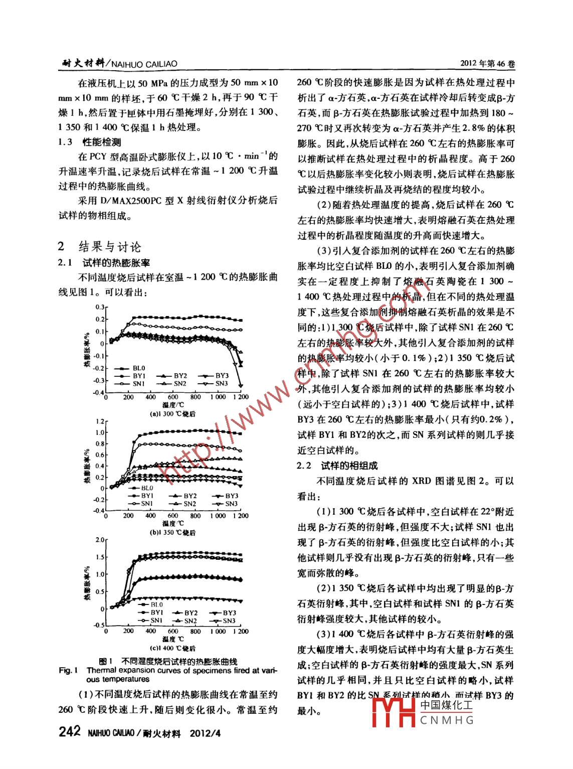 oNi耐火材料241 ~ 243第46卷第4期AIHUU (AILAU復(fù)合添加劑對(duì)熔融石英陶瓷析晶的影響卜景龍申書(shū)斌于立學(xué)王志發(fā)河北省無(wú)機(jī)非金屬材料重點(diǎn)實(shí)驗(yàn)室河北聯(lián)合大學(xué)材料科學(xué)與工程學(xué)院河北唐 山063009摘要:以粒徑 ≤0.10 mm的熔融石英粉為主要原料,分別添加相對(duì)于熔融石英粉質(zhì)量1%、2%、3%的復(fù)合添加劑B,C-Yb2Oz(B,C與Yb2O3的質(zhì)量比為1:1)或SizN.-Nd2O3(SizN4與Nd2O,的質(zhì)量比為1:1),以聚乙烯醇為結(jié)合劑,經(jīng)攪拌、成型、干燥后,分別于1 300、1 350和1 400心C埋炭(石墨)保溫1 h熱處理,然后在常溫~1 200 C對(duì)燒后試樣進(jìn)行熱膨脹試驗(yàn),并對(duì)其進(jìn)行XRD分析,以研究復(fù)合添加劑B,C- Yb2O3和SizN,-Nd2O3對(duì)熔融石英陶瓷在熱處理過(guò)程中析晶的影響。結(jié)果表明:添加B,C-Yb2O,或SijN,-Nd2O,對(duì)熔融石英熱處理過(guò)程中的析晶均有不同程度的抑制作用,且B,C-Yb2O,抑制熔融石英析晶的效果比Si,N,-Nd2O3的更好,尤其是在較高的熱處理溫度下。關(guān)鍵詞:熔融石英陶瓷;析晶;復(fù)合添加劑;碳化硼;氧化鐿;氮化硅;氧化釹中圖分類號(hào):TQ174文獻(xiàn)標(biāo)識(shí)碼:A文章編號(hào):1001 - 1935(2012)04 -0241 -03熔融石英的熱膨脹系數(shù)小(0.54x10-6 C-'),m(Si;N) :m(Nd,0,) =1:1的Si,N,-Nd2O,兩種復(fù)熱導(dǎo)率低,抗熱震性好,熔體黏度大(不易被氣流沖刷合添加劑使用。結(jié)合劑為w(聚乙烯醇) =2%的聚乙流失),被廣泛應(yīng)用于玻璃、冶金、化工等領(lǐng)域"。以烯醇溶液。熔觸石英微細(xì)顆粒為原料,按照陶瓷生產(chǎn)工藝制備的1.2試樣制備熔融石英陶瓷材料,因熔融石英顆粒間存在微小孔試樣的配料組成見(jiàn)表1。表中復(fù)合添加劑和聚隙,其抗裂紋擴(kuò)展能力和韌性增強(qiáng),進(jìn)一步提高了材乙烯醇的加人量是相對(duì)于100份質(zhì)量的熔融石英粉料使用的安全性和可靠性,擴(kuò)大了應(yīng)用領(lǐng)域|2-3)。但的質(zhì)量,例如配方BYl,若熔融石英粉的質(zhì)量為100是,隨著溫度的升高,熔融石英析晶出方石英晶體,導(dǎo)g,則B,C-Yb2O3和聚乙烯醇溶液的質(zhì)量分別為1和致材料的使用性能下降。6 g;若以質(zhì)量分?jǐn)?shù)表示,則熔融石英粉. B,C- Yb2O,-.些研究者研究了熔融石英材料的析晶行為和和聚乙烯醇溶液的質(zhì)量分?jǐn)?shù)分別為93. 46%、0. 93%、析晶動(dòng)力學(xué),有些研究者研究了添加單一非氧化物或5.61%。單一稀土氧化物對(duì)熔融石英析晶的抑制作用14-7] ,但表1試樣的配料組成( 相對(duì)質(zhì)t)Table 1 Formulations of specimens目前尚未見(jiàn)到添加復(fù)合添加劑抑制熔融石英析晶的BLO BYI BY2_ BY3_ SNI SN2_ SN3研究報(bào)道。為此,研究了復(fù)合添加劑B,C-Yb2O3和熔融英粉100 100 100 100 10000 10B4C-Yb2OzSi,N,-Nd2O,對(duì)熔融石英陶瓷析晶的影響。SizN,-Nd2O3聚乙烯醇溶液1試驗(yàn)將熔融石英粉和添加劑放人XM-4型行星快速1.1 原料研磨機(jī)中,加人適址剛玉球混合60 min, 出料后置于試驗(yàn)用主要原料為粒徑≤0.10 mm(dso =研缽中,加入聚乙烯醇溶液攪拌10~15 min,過(guò)40目19 μm)、w(SiO2) =99. 9%的熔融石英粉。添加劑(0. 355 mm)篩,然后置于塑料袋中,用手揉捏2 ~有:do=27 μm、w(B,C) =95. 0%的碳化硼微粉,5min后,密封困料6h。dso =20 μm、w( Yb20,) =99. 9%的氧化鐿微粉,dso =30 μm、w(Si;N,) = 90. 0%的氮化硅微粉和dso =●國(guó)家自然科學(xué)基金資助項(xiàng)目(51072046)。20 μm、w( Nd2O3) = 99.9%的氧化釹微粉,并將它們.卜景龍:男,1957年生,博士,教授。E-mail bjil@ hru.配制成m(B,C) :m(Yb20,) =1:1的B,C-Yb2O3和收稿日期2012-0中國(guó)煤化工二湍輯:黃衛(wèi)國(guó);HCNMHGs 241 .2012/4“麗火材科/ KCTKALiUKIES耐火材料/NAIHUO CAILIAO2012年第46卷在液壓機(jī)上以50 MPa的壓力成型為50 mmx10260C階段的快速膨脹是因?yàn)樵嚇釉跓崽幚磉^(guò)程中mmx 10 mm的樣坯,于60 C干燥2 h,再于90 C干析出了a-方石英,a-方石英在試樣冷卻后轉(zhuǎn)變成β-方燥1 h,然后置于匣缽中用石墨掩埋好,分別在1 300、石英,而β-方石英在熱膨脹試驗(yàn)過(guò)程中加熱到180~1350和1400C保溫1h熱處理。270 C時(shí)又再次轉(zhuǎn)變?yōu)閍-方石英并產(chǎn)生2. 8%的體積1.3 性能檢測(cè)膨脹。因此,從燒后試樣在260 C左右的熱膨脹率可在PCY型高溫臥式膨脹儀上,以10 C●min~'的以推斷試樣在熱處理過(guò)程中的析晶程度。高于260升溫速率升溫,記錄燒后試樣在常溫~1200 9C升溫C以后熱膨脹率變化較小則表明,燒后試樣在熱膨脹過(guò)程中的熱膨脹曲線。試驗(yàn)過(guò)程中繼續(xù)析晶及再燒結(jié)的程度均較小。采用D/MAX2500PC型x射線衍射儀分析燒后(2)隨著熱處理溫度的提高,燒后試樣在260 C試樣的物相組成。左右的熱膨脹率均快速增大,表明熔融石英在熱處理過(guò)程中的析晶程度隨溫度的升高而快速增大。2結(jié)果與討論(3)引人復(fù)合添加劑的試樣在260 C左右的熱膨2.1試樣的熱膨脹率脹率均比空白試樣BLo的小,表明引人復(fù)合添加劑確不同溫度燒后試樣在室溫~1200 C的熱膨脹曲實(shí)在一定程度上抑制了熔融石英陶瓷在1300~線見(jiàn)圖1??梢钥闯?1400C熱處理過(guò)程中的析晶,但在不同的熱處理溫度下,這些復(fù)合添加劑抑制熔融石英析晶的效果是不.2-同的:1)1 300 C燒后試樣中,除了試樣SN1在260 C左右的熱膨脹率較大外,其他引人復(fù)合添加劑的試樣i -0.1的熱膨