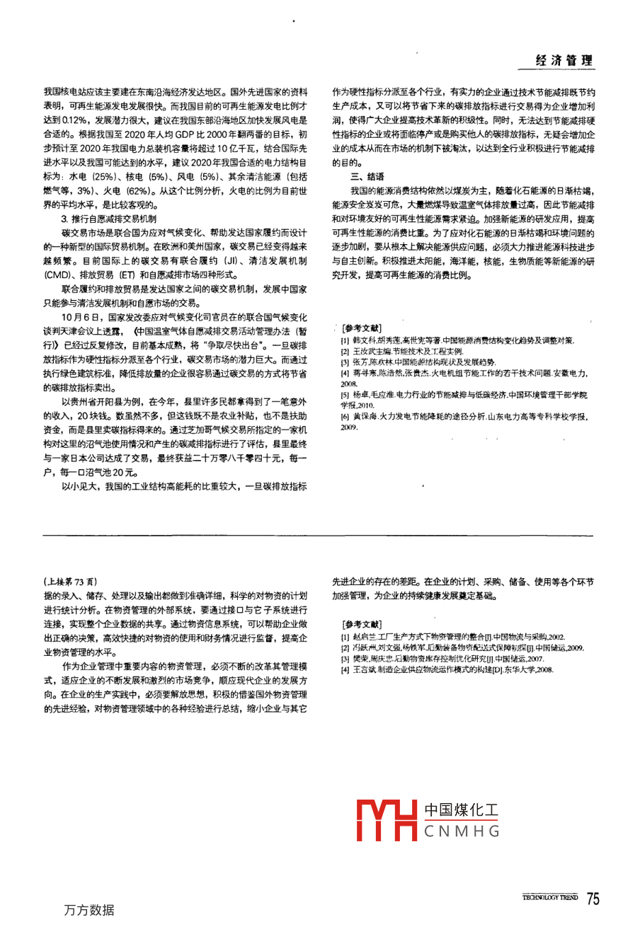 爛枓技爪節(jié)能減排任重道遠(yuǎn)盧森根(廣西電力工業(yè)勘察設(shè)計(jì)研究院,廣西南寧530023)摘要]隨著工業(yè)化水平的不斷提高和人口的不斷增長,能源和環(huán)境問題倍受世人賜目。目前我國的能源有9m%以上來自燃燒化石燃料(煤、石油和天然氣)所釋放的能量。化石燃桿的儲量是有限的,化石燃料的應(yīng)用引起環(huán)境問題也日益突出,因此節(jié)能和減排咸為近些年來人們高度關(guān)注的話題[關(guān)鍵詞]節(jié)能;減排自工業(yè)革命以來,人類社會無限制地向大氣層排放溫室氣體導(dǎo)致地示,2008年全國6000kW及以下電廠發(fā)電消耗原煤134億噸,火電球表面溫度加速變暖,氣候變暖問題已經(jīng)成為國際社會普遍關(guān)心的重大耗煤量占全國原煤總產(chǎn)量的53%。2007年全國供電煤耗為342g全球性問題。氣候變曖主要是由于人類大量使用化石能源所造成的。我kWh,2008年全國平均供電煤耗為349g/kWh,2009年1~8月國改革開放以來,經(jīng)濟(jì)發(fā)展迅速,對能源和資源的需求量也急劇增大,份,全國供電燦耗率為341gkWh工業(yè)鍋爐每燃燒一噸標(biāo)準(zhǔn)煤就產(chǎn)由此而排放的cO2大量增加。1980年,中國的CO2排放量僅為145生CoO2620kg,SO212kg,NOx74kg,因此燃煤鍋爐排放廢氣成為億噸,2000年上升到297億噸。從2000年特別是2002年以來,中大氣的主要污染源之一。而且在未來20年甚至更長時(shí)間內(nèi),煤電在我國的碳排放量出現(xiàn)快速上升趨勢。2002年我國的碳排放量為349億國發(fā)電能源中仍占主導(dǎo)地位,因此電力工業(yè)必須考慮以煤炭為主的發(fā)電噸,到2008年就上升到653億噸。國際能源署預(yù)測,到2030年中國能源結(jié)構(gòu)特點(diǎn),優(yōu)化電源結(jié)構(gòu),選擇各種具有更高經(jīng)濟(jì)性和環(huán)保效益的的CO2排放纛將占世界的292%。我國碳排放量近年來的快速上升引發(fā)電新方式,并最大限度地降低因煤電引起的環(huán)境污染。起了世界的嚴(yán)重關(guān)注。1.采用新技術(shù)、新材料、新工藝,提高發(fā)電熱效率一、我國碳排放量快速上升的主要原因采用新術(shù)、新材料,以降低發(fā)電能耗,提高機(jī)組發(fā)電熱效率。目前我國經(jīng)濟(jì)近年來的快速發(fā)展消耗了大鱟的資源和能源,因此是一種常用的有使用變頻器,降低風(fēng)機(jī)的能耗;采用新型高效的保溫材料,降粗放型的經(jīng)濟(jì)發(fā)展模式,這種發(fā)展模式導(dǎo)致了我國近年來碳排放量的快低管道的熱損失;提高發(fā)電效率速上升。超(超)臨界發(fā)電技術(shù),燃?xì)庹羝?lián)合循環(huán)發(fā)電技術(shù),CFB,發(fā)電)高能耗的重工業(yè)在國民經(jīng)濟(jì)中占比過大技術(shù),大容量熱電聯(lián)產(chǎn)發(fā)電技術(shù)的大力推廣,降低發(fā)生產(chǎn)能耗,提高生自改革開放以來,中國經(jīng)濟(jì)年均增長率高達(dá)98%,居于世界前列。產(chǎn)效率。業(yè)在國民經(jīng)濟(jì)中的比重已經(jīng)從1952年的176%穩(wěn)步提高到2009年通過上述兩種辦法可以達(dá)到一定的節(jié)能減排效果,但隨著火電裝機(jī)的468%。而我國工業(yè)結(jié)構(gòu)中璽工業(yè)特征比較明顯。2008年,中國的總量的增加,煤炭用量也在增加,無法從根本上實(shí)現(xiàn)碳減排的任務(wù)。GDP總額只占世界的33%,卻生產(chǎn)了全世界35%的鋼材,50%的水2.節(jié)能調(diào)度泥,28%的銘,消耗了世界接近一半的煤炭,二分之一的水泥。這種高為適應(yīng)國家經(jīng)濟(jì)可持續(xù)發(fā)展戰(zhàn)略,國家發(fā)改委已經(jīng)開始組織推動電投入、高消耗、高排放的工業(yè)模式導(dǎo)致我國的CO2排放量快速上升。網(wǎng)節(jié)能調(diào)度。其中最關(guān)鍵、重要的還是火電機(jī)組的節(jié)能調(diào)度,目的是讓(二)我國的能源消費(fèi)增長較快,能源結(jié)構(gòu)不太合理能耗低的機(jī)組多發(fā),限制能耗高的機(jī)雄發(fā)電,充分利用高參數(shù)大機(jī)組的近年來。我國能源消費(fèi)呈現(xiàn)持續(xù)快速增長的態(tài)勢,2002年,我性能優(yōu)勢,減少國內(nèi)火電機(jī)組的整體能耗量。國一次能源消費(fèi)量為1058億噸油當(dāng)量,到2008年增長到20億噸油3開拓新能源,減小火電比例當(dāng)量。6年間幾乎翻了一番。中國統(tǒng)計(jì)年鑒(2001~2006)的統(tǒng)計(jì)數(shù)加大水電、風(fēng)能、核能、太陽能、潮汐能等、生物質(zhì)能源等可再生據(jù)表明2001-2006年間,我國每年一次性能源的消費(fèi)比重均在90%能源的比例。在我國,有豐富的水能、風(fēng)能、太陽能和潮汐等資源,它以上(見表1),而風(fēng)能,太陽能,生物質(zhì)能等新能源的利用率仍然很們在利用的過程中,不會對自然界排放CO2等廢氣,而且在大自然的低。我國能源消費(fèi)構(gòu)成的特點(diǎn):1)石化能源消費(fèi)比重偏高。2)新能源環(huán)境中能重復(fù)利用。而生物質(zhì)能源是通過光和作用將大氣中的C以生物利用率低,目前對新能源的利用率不足10%質(zhì)的形式保存下來再進(jìn)行利用的能源,在此利用過程中,雖然也會排放表12001200年中國能源消費(fèi)總及構(gòu)成據(jù)來源于中國統(tǒng)計(jì)年鑒2001200cO但是在整個(gè)循環(huán)過程中沒有像石化燃料一樣向環(huán)境新增COn因能消費(fèi)占鮭源消貿(mào)總量的比重(%此生物質(zhì)能源也是清潔的可