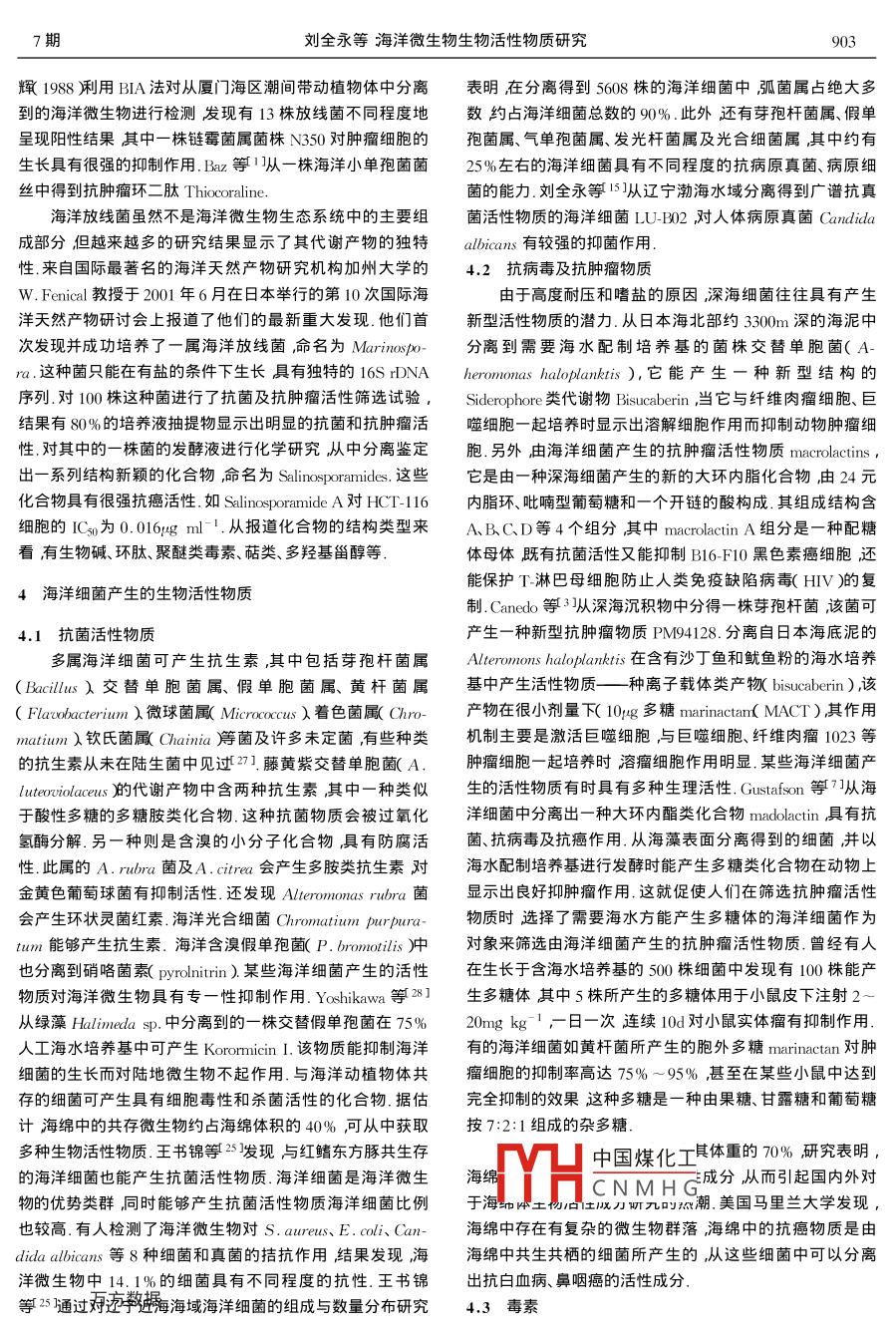 應(yīng)用生態(tài)學(xué)報(bào)2002年7月第13卷第7期CHINESE JOURNAL OF APPLIED ECOLOGY Jul 2002 137): 901--905海洋微生物生物活性物質(zhì)研究劉全永¨胡江春薛德林馬成新王書錦中國科學(xué)院沈陽應(yīng)用生態(tài)研究所沈陽110016)【摘要】海洋微生物以其分類的多樣性和遺傳背景的特殊性而具有產(chǎn)生新型生物活性物質(zhì)的巨大潛力本文對海洋微生物產(chǎn)生的生物活性物質(zhì)的研究進(jìn)展進(jìn)行了綜述.從報(bào)道的研究結(jié)果看占海洋微生物主導(dǎo)地位的海洋細(xì)菌產(chǎn)生的活性物質(zhì)種類最為豐富海洋真菌和海洋放線菌雖非海洋微生物中的主要菌群但其產(chǎn)生新型生物活性物質(zhì)的潛能不可低估.此外目前研究主要局限于那些在常規(guī)條件下易于培養(yǎng)的微生物類群玪今后的趨勢之一是對于非可培養(yǎng)海洋微生物產(chǎn)生的生物活性物質(zhì)的探索.我國應(yīng)充分利用國內(nèi)海洋微生物資源優(yōu)勢加強(qiáng)這一領(lǐng)域的研究關(guān)鍵詞海洋真菌海洋放線菌海洋細(xì)菌生物活性物質(zhì)文章編號1001-933X2002)7-0901-05中圖分類號Q938.8文獻(xiàn)標(biāo)識碼ABio-active substances derived from marine microorganisms. LIU Quanyong ,HU Jiangchun XUE Delin , MAChengxin and WANG Shujin Institute of Applied Ecology, Chinese Academy of Sciences, Shenyang110016)(hin.J.App.Fol.2002x7)901~905Marine microorganisms which are taxonomically diverse and genetically special have powerful potential in producing novel bio-active substances. This article summarized research progress in this respect. The results showedthat marine bacteria which are main marine microorganism flora can produce rich kinds of bio-active substancesand that even though marine actinomycetes and marine fungi are not as many as marine bacteria in species andquantity they should be paid no less attention about their bio-active substances. Besides, present research arelimited to those marine microorganisms which are easily cultured. One of the future research trends will be fo-cused on bio-active substances derived from non-culturable marine microorganismsKey words Marine fungi, Marine actinomycetes Marine bacteria, Bio-active substan持續(xù)利用性因此海洋微生物產(chǎn)生的生物活性物質(zhì)目前正1引言成為國內(nèi)外研究的熱點(diǎn)領(lǐng)域.現(xiàn)就海洋微生物中的海洋真海洋約占地球表面的71%其中蘊(yùn)藏著豐富的微生物菌、海洋放線菌及海洋細(xì)菌三大類群所產(chǎn)生的主要生物活資源海洋微生物對于維持海洋生態(tài)平衡發(fā)揮著重要作用.性物質(zhì)研究綜述如下此外海洋微生物在寡營養(yǎng)的海洋環(huán)境條件下可產(chǎn)生多種2海洋真菌產(chǎn)生的生物活性物質(zhì)生理活性物質(zhì).以海洋微生物為對象研究其群落結(jié)構(gòu)、功能及其產(chǎn)生的生物活性物質(zhì)對了解生態(tài)系統(tǒng)的穩(wěn)定性和變2.1抗菌活性物質(zhì)遷密切相關(guān)研究開發(fā)海洋微生物生物活性物質(zhì)有以下幾根據(jù) Kohlmeyer等(1998)調(diào)查,已鑒定321種海洋真方面優(yōu)勢起源于海洋的微生物具有特異的遺傳和代謝特菌包括255種子囊菌6種擔(dān)子菌60無性態(tài)真菌隨著新性往往能產(chǎn)生新型生物活性物質(zhì)來源于陸地的海洋微生菌體的發(fā)現(xiàn)和描述數(shù)量在不斷增大不少科研結(jié)果統(tǒng)計(jì)證物經(jīng)過長期環(huán)境適應(yīng)其生理和代謝特性也發(fā)生明顯變化,明從海洋真菌分離出的次級代謝產(chǎn)物70%-80%具有生因而不少菌株能產(chǎn)生陸地上所不能產(chǎn)生的新活性物質(zhì)與物活性王書錦等2以中國黃、渤海、遼寧近海地區(qū)分離得海洋動植物共生存的微生物提高了宿主在海洋中的環(huán)境適到海洋真菌508株,已鑒定的有20多株,主要有青霉屬應(yīng)性和生存能力可產(chǎn)生抑制宿主競爭對手的次生物質(zhì)這( Penicillum)曲霉屬( Aspergillus)鐮刀菌屬 Fusarium汲類菌的產(chǎn)抗率遠(yuǎn)高于非附生海洋微生物和陸地微生物根新的真菌10%以上發(fā)酵產(chǎn)物具有抗細(xì)菌或抗真菌生物活據(jù)生態(tài)學(xué)觀點(diǎn)抗生素是微生物搶奪資源和營養(yǎng)物的武性中國煤化工器”因此微生物可在其它菌的誘導(dǎo)下產(chǎn)生原先沒有的活性CNMHG中發(fā)現(xiàn)一些環(huán)縮二氨酸物質(zhì)盧與海洋動植物相比海洋微生物又具有生長周期短、它們以單體或二聚體形式岀現(xiàn)而且經(jīng)常含有S具有不同代謝易于調(diào)控、菌種較易選育、可通過大規(guī)模發(fā)酵實(shí)現(xiàn)工業(yè)化等特點(diǎn)故海洋微生物相關(guān)的天然產(chǎn)物開發(fā)還具有潛在國家九五“科技攻關(guān)項(xiàng)目(96010202和遼寧省重點(diǎn)科技攻關(guān)資助項(xiàng)目(96805005)產(chǎn)業(yè)化優(yōu)勢與海洋動植物相比海洋微生物的開發(fā)不至于**通訊聯(lián)系導(dǎo)致海洋物種玀生態(tài)環(huán)境失衡更具有自然資源的可200107-23收稿200204-1接受902應(yīng)用生態(tài)學(xué)報(bào)13卷的抗菌活性. Okutani等(2000從印度洋中的真菌A很缺乏相當(dāng)數(shù)量的真菌還沒有被認(rèn)識和分離但從已獲得ρ bergillus sp.的培養(yǎng)液中分離到一種新型環(huán)縮二氨酸 gliotox-的研究結(jié)果表明海洋真菌資源將是今后新藥開發(fā)的重要in它對 Staphylococcus aureus和 Bacillus subtilis具有抗菌活寶庫之一性陸地真菌