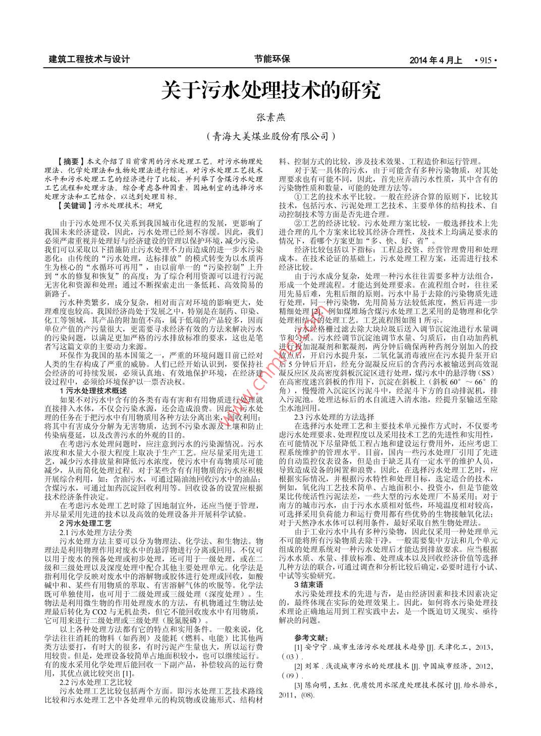 建筑工程技術(shù)與設(shè)計節(jié)能環(huán)保2014年4月上●915 ●關(guān)于污水處理技術(shù)的研究張素燕(青海大美煤業(yè)股份有限公司)[摘要]本文介紹了目前常用的污水處理工藝。對污水物理處 料、控制方式的比較,涉及技術(shù)效果、工程造價和運行管理。理法、化學(xué)處理法和生物處理法進行綜述,對污水處理工藝技術(shù)對于某一t具體的污水,由于可能含有多種污染物質(zhì),對其處水平和污水處理工藝的經(jīng)濟進行了比較,并列舉了含煤污水處理理要求 也有可能不同,因此,首先應(yīng)弄清污水性質(zhì),其中含有的工藝流程和處理方法。綜合考慮各種因素,因地制宜的選擇污水污 染物性質(zhì)和數(shù)量,可能的處理方法等。處理方法和工藝結(jié)合,以達到處理目標(biāo)。①工藝的技術(shù)水平比較。一-般在經(jīng)濟合算的原則下,比較其. [關(guān)鍵詞]污水處理技術(shù);研究技術(shù),包括污水、污泥處理工藝技術(shù)、主要單體的結(jié)構(gòu)技術(shù)、自動控制技術(shù)等方面是否先進合理。由于污水處理不僅關(guān)系到我國城市化進程的發(fā)展,更影響了②工藝的經(jīng)濟比較。污水處理方案比較,-般選擇技術(shù)上先我國未來經(jīng)濟建設(shè),因此,污水處理已經(jīng)刻不容緩。因此,我們進合 理的幾個方案來比較其經(jīng)濟合理性,及技術(shù)上均滿足要求的必須嚴(yán)肅重視并處理好與經(jīng)濟建設(shè)的管理以保護環(huán)境,減少污染。情況下,看哪個方案更加“多、快、好、我們可以采取以下措施防止污水處理不力而造成的進一步水污染經(jīng)濟比較包括以下指標(biāo):工程總投資、經(jīng)營管理費用和處理惡化:由傳統(tǒng)的“污水處理,達標(biāo)排放”的模式轉(zhuǎn)變?yōu)橐运|(zhì)再成本。 在技術(shù)論證的基礎(chǔ)上,污水處理工程方案,還需進行技術(shù)生為核心的“水循環(huán)可再用”,由以前單一的“污染控制”上升經(jīng)濟比較 。到“水的修復(fù)和恢復(fù)”的高度;為了綜合利用資源可以進行污泥由于污水成分復(fù)雜,處理一種污水往往需要多種方法組合,無害化和資源和處理;通過不斷探索走出一條低耗、 高效簡易的形成一 一個處理流程。才能達到處理要求。在流程組合時,往往采新路子。用先易后難,先粗后細的原則。污水中易于去除的污染物質(zhì)先進污水種類繁多,成分復(fù)雜,相對而言對環(huán)境的影響更大,處行處理, 同-一種污染物,先用簡易方法較低濃度,然后再進一一步理難度也較高。我國經(jīng)濟尚處于發(fā)展之中,特別是在制藥、印染、精細處理[2]。例如煤堆場含煤污水處理工藝采用的是物理和化學(xué)化工等領(lǐng)域,其產(chǎn)品的附加值不高,屬于低端的產(chǎn)品較多,因而處理相結(jié) 合的處理工藝。工藝流程圖如圖1所示。單位產(chǎn)值的產(chǎn)污量很大,更需要尋求經(jīng)濟有效的方法來解決污水污水經(jīng)格柵過濾去除大塊垃圾后送入調(diào)節(jié)沉淀池進行水量調(diào)的污染問題,以滿足更加嚴(yán)格的污水排放標(biāo)準(zhǔn)的要求,這也是筆節(jié)和勻質(zhì)。污水經(jīng)調(diào)節(jié)沉淀池調(diào)節(jié)水量、勻質(zhì)后,由自動加藥機者寫這篇文章的主要動力來源。進行投加混凝劑和絮凝劑,兩分鐘后確保兩種藥劑分別加入的投環(huán)保作為我國的基本國策之一,嚴(yán)重的環(huán)境問題目前已經(jīng)對放點后, 開啟污水提升泵,瓦化氯消毒液應(yīng)在污水提升泵開啟人類的生存構(gòu)成了嚴(yán)重的威脅。人們已經(jīng)開始認(rèn)識到,要保持社后5分鐘后開啟,經(jīng)充分混凝反應(yīng)后的含藥污水被輸送到高效混會經(jīng)濟的可持續(xù)發(fā)展,必須認(rèn)真地、有效地保護環(huán)境,在經(jīng)濟建凝 反應(yīng)區(qū)及高密度斜板沉淀區(qū)進行處理,煤污水中的懸浮物(SS)設(shè)過程中,必須給環(huán)境保護以一- 票否決權(quán)。在高密度迷宮斜板的作用”下,沉淀在斜板上(斜板60° ~ 66”的1污水處理技術(shù)概述角),慢慢滑入沉淀區(qū)污泥斗中,經(jīng)泥斗下方的自動排泥機,排如果不對污水中含有的各類有毒有害和有用物質(zhì)進行處理就入污泥池。處理達標(biāo)后的水自流進入清水池,經(jīng)提升泵輸送至除直接排入水體,不僅會污染水源,還會造成浪費。因此,污水處塵水池回用。理的任務(wù)在于把污水中有用物質(zhì)用各種方法分離出來,回收利用:2.3污水處理的方法選擇將其中有害成分分解為無害物質(zhì),達到不污染水源及土壤和防止在選擇污水處理工藝和主要技術(shù)單元操作方式時,不僅要考傳染病蔓延,以及改善污水的外觀的目的。慮污水處理要求、處理程度以及采用技術(shù)工藝的先進性和實用性,在考慮污水處理問題時,應(yīng)注意到污水的污染源情況。污水在可能情況下盡量降低工程占地和建設(shè)運行費用外,還應(yīng)考慮工濃度和水量大小很大程度上取決于生產(chǎn)工藝。應(yīng)盡量采用先進工程 系統(tǒng)維護的管理水平。目前,國內(nèi)一些污水處理廠引用了先進藝,減少污水排放量和降低污水濃度,使污水中有毒物質(zhì)盡可能的 自動監(jiān)控儀表設(shè)備,但是由于缺乏具有一定水 平的維護人員,減少,從而簡化處理過程。對于某些含有有用物質(zh