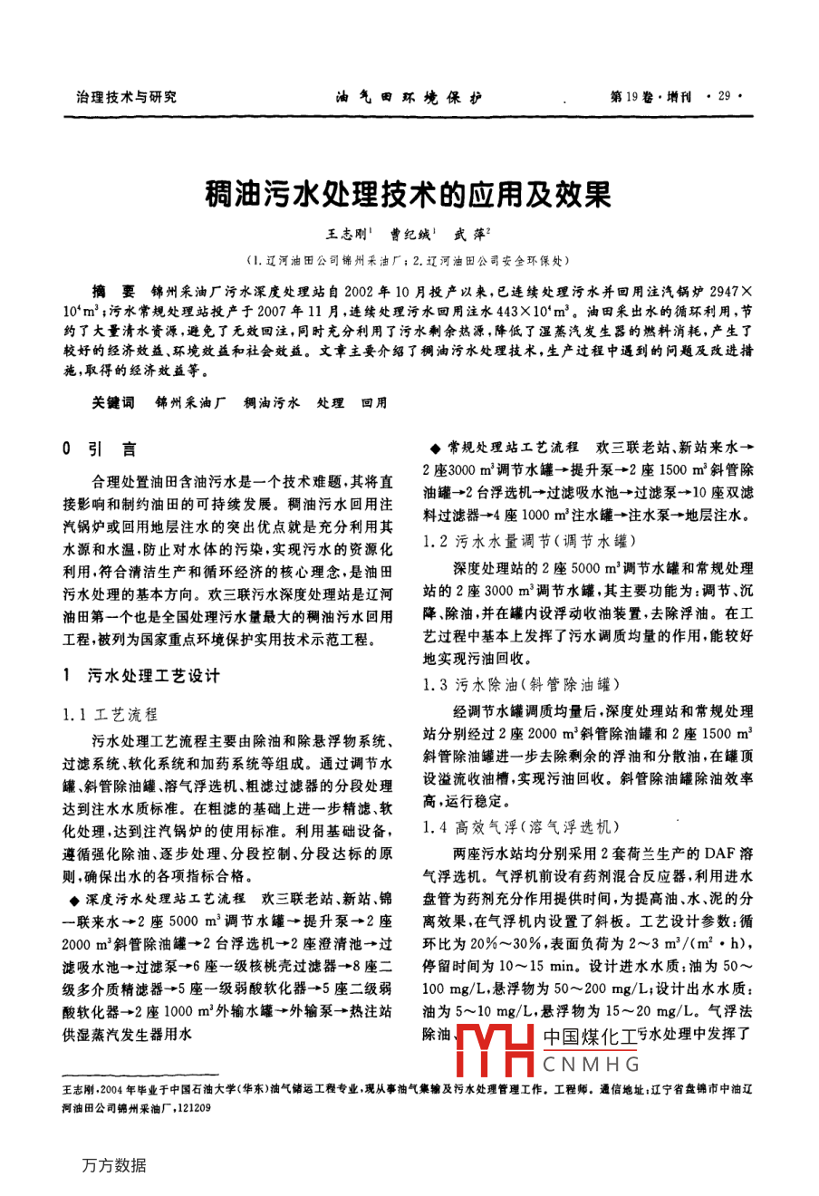 治理技術(shù)與研究油氣田環(huán)境保護第19卷,增刊●29.稠油污水處理技術(shù)的應用及效果王志剛’曹紀絨'武萍?(1.遼河油田公司錦州采油廠; 2.遼河油田公司安全環(huán)保處)摘妻錦州采油廠污水深度處理站自2002年10月投產(chǎn)以來,已連續(xù)處理污水并回用注汽鍋爐2947X10'm' ;污水常規(guī)處理站投產(chǎn)于2007年11月,連續(xù)處理污水回用注水443X10'm'.油田采出水的循環(huán)利用,節(jié)約了大量清水資源,避免了無效回注,同時充分利用了污水剩余熱源,降低了濕蒸汽發(fā)生器的燃料消耗,產(chǎn)生了較好的經(jīng)濟效益.環(huán)境效益和社會效益。文章主要介紹了稠油污水處理技術(shù),生產(chǎn)過程中遇到的問題及改進措施,取得的經(jīng)濟效益等。關(guān)鍵詞錦州采油廠 稠油污水處理回用0引言◆常規(guī)處理站工藝流程 歡三聯(lián)老站、新站來水→合理處置油田含油污水是-一個技術(shù)難題,其將直2座3000 m'調(diào)節(jié)水罐-→ 提升泵→2座1500 m'斜管除接影響和制約油田的可持續(xù)發(fā)展。稠油污水回用注油罐-→2臺浮選機→過濾吸水池→過濾泵→10座雙濾汽鍋爐或回用地層注水的突出優(yōu)點就是充分利用其料過濾器→4座1000 m?注水罐-→注水泵+地層注水。水源和水溫,防止對水體的污染,實現(xiàn)污水的資源化1.2污水水量調(diào)節(jié)(調(diào)節(jié)水罐)利用,符合清潔生產(chǎn)和循環(huán)經(jīng)濟的核心理念,是油田深度處理站的2座5000 m'調(diào)節(jié)水罐和常規(guī)處理污水處理的基本方向。歡三聯(lián)污水深度處理站是遼河站的2座3000 m'調(diào)節(jié)水罐,其主要功能為:調(diào)節(jié)、沉油田第一個也是全國處理污水量最大的稠油污水回用降、除油,并在罐內(nèi)設(shè)浮動收油裝置,去除浮油。在工工程,被列為國家重點環(huán)境保護實用技術(shù)示范工程。藝過程中基本上發(fā)揮了污水調(diào)質(zhì)均量的作用,能較好地實現(xiàn)污油回收。1污水處理工藝設(shè)計1.3污水除油(斜管除油罐)1.1工藝流程經(jīng)調(diào)節(jié)水罐調(diào)質(zhì)均量后,深度處理站和常規(guī)處理污水處理工藝流程主要由除油和除懸浮物系統(tǒng)、站分別經(jīng)過2座2000 m'斜管除油罐和2座1500 m'過濾系統(tǒng)、軟化系統(tǒng)和加藥系統(tǒng)等組成。通過調(diào)節(jié)水斜管除油罐進-一步去除剩余的浮油和分散油,在罐頂罐、斜管除油罐、溶氣浮選機、粗濾過濾器的分段處理設(shè)溢流收油槽,實現(xiàn)污油回收。斜管除油罐除油效率達到注水水質(zhì)標準。在粗濾的基礎(chǔ)上進一步精濾、軟高,運行穩(wěn)定?;幚?達到注汽鍋爐的使用標準。利用基礎(chǔ)設(shè)備,1.4高效氣浮(溶氣浮選機)遵循強化除油、逐步處理、分段控制、分段達標的原兩座污水站均分別采用2套荷蘭生產(chǎn)的DAF溶則,確保出水的各項指標合格。氣浮選機。氣浮機前設(shè)有藥劑混合反應器,利用進水◆深度污水處理站工藝流程歡三聯(lián)老站 、新站、錦盤管為藥劑充分作用提供時間,為提高油.水、泥的分-聯(lián)來水→2座5000 m'調(diào)節(jié)水罐→提升泵→2座離效果,在氣浮機內(nèi)設(shè)置了斜板。工藝設(shè)計參數(shù):循2000 m2斜管除油罐→2臺浮選機→2座澄清池→過環(huán)比為20%~30%,表面負荷為2~3 m'/(m2●h),濾吸水池-◆過濾泵→6座一級核桃殼過濾 器→8座二停留時間為10~15 min。設(shè)計進水水質(zhì):油為50~級多介質(zhì)精濾器→5座一級弱酸軟化器-→5座二級弱100 mg/L,懸浮物為50~200 mg/L;設(shè)計出水水質(zhì):酸軟化器-→2座1000 m'外輸水罐→外輸泵→熱注站油為5~10 mg/L,懸浮物為15~20 mg/L.氣浮法供濕蒸汽發(fā)生器用水除油中國煤化工虧水處理中發(fā)揮了YHCNMHG王志剛,2004年畢業(yè)于中國石油大學(華東)油氣儲運工程專業(yè),現(xiàn)從事油氣集輸及污水處理管理工作。工程師。通信地址:遼寧省盤錦市中油遼河油田公司錦州采油廠,1212092009年11月油氣田環(huán)境保護治理技術(shù)與研究核心作用,出水指標遠低于設(shè)計指標(油為1~聯(lián)來水沒有進入常規(guī)處理站的工藝設(shè)計,只能進人深2 mg/IL,懸浮物為10~15 mg/L),為后段的過濾系.度處理站進行處理。統(tǒng)減輕了負擔.也為整個污水處理系統(tǒng)的平穩(wěn)運行提表1三座聯(lián)合站出水水質(zhì)參數(shù)供了保證。1.5粗濾技術(shù)(一級過濾)站別污水硬度/ SiO) 含量/含油/含懸浮物/溫度/C (mg/I) (mg/L) (mg/L) (mg/L)深度處理站采用的是6組核桃殼過濾器.污水常老三聯(lián)45~50 8259.4 200~400 300~500規(guī)處理采用的是10組雙濾料(無煙煤和石英砂)過濾新“聯(lián)40~4212068.7 150~300 200~ 300器。兩套粗濾設(shè)備的過濾效果在確保浮選機處理效果的基礎(chǔ)上可滿足設(shè)計出水水質(zhì)要求。常規(guī)站粗濾錦一聯(lián)35~3810560.1 100~200 100~200出水水質(zhì)達到中滲透地層注水水質(zhì)要求。2.2反洗水增加系統(tǒng)處理負擔1.6精濾技術(shù)(二級過濾)深度處理工藝、常規(guī)處理工藝中過濾罐反洗水日深度站軟化系統(tǒng)使用的大孔弱酸陽離子軟化樹產(chǎn)2700 m'左右,進人污水池后經(jīng)泵提升至前端調(diào)節(jié)脂要求污水水質(zhì)較高(含油.含懸浮物低2 mg/L),因水罐進行循環(huán)處理。反洗水雖然含油不高,但懸浮物此在粗濾的基礎(chǔ)上,增加了多