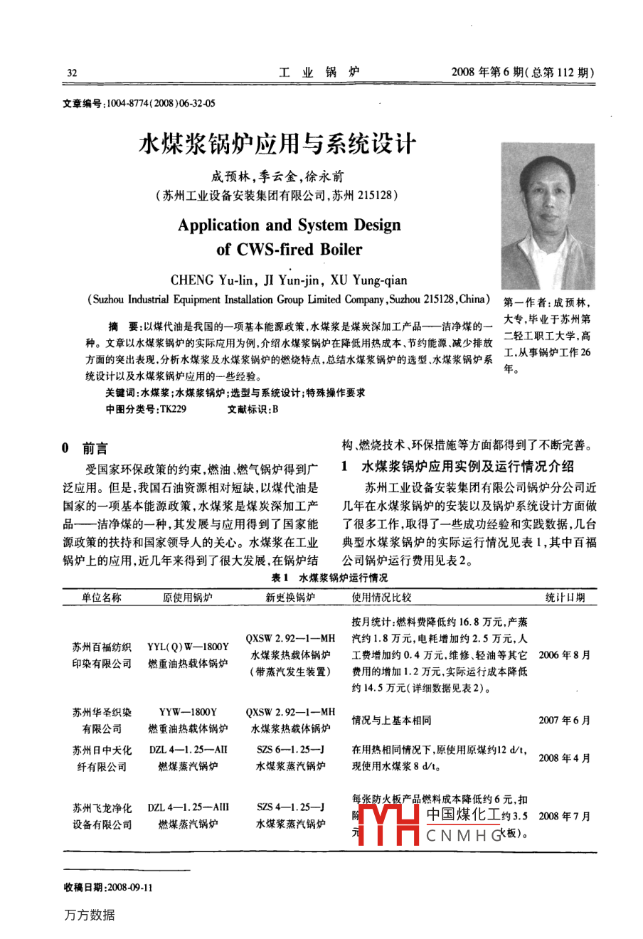 工業(yè)鍋爐008年第6期(總第112期文章編號:10048774(2008)06-32405水煤漿鍋爐應用與系統(tǒng)設計成預林,季云金,徐永前(蘇州工業(yè)設備安裝集團有限公司,蘇州215128)Application and System Designof cwS-fired BoilerCHENG Yu-lin, JI Yun-jin, XU Yung-qian( Suzhou Industrial Equipment Installation Group Limited Company, Suzhou25128,hina)第一作者:成預林,摘要:以煤代油是我國的一項基本能源政策,水煤漿是煤炭深加工產(chǎn)品—潔凈煤的大專,畢業(yè)于蘇州第種。文章以水煤漿鍋爐的實際應用為例介紹水煤漿鍋爐在降低用熱成本、節(jié)約能源減少排放二輕工職工大學高方面的突出表現(xiàn),分析水煤漿及水煤漿鍋爐的燃燒特點,總結水煤漿鍋爐的選型、水煤漿鍋爐系統(tǒng)設計以及水煤漿鍋爐應用的一些經(jīng)驗。關鍵詞:水煤漿;水煤漿鍋爐;選型與系統(tǒng)設計;特殊操作要求中圖分類號:TK229文獻標識:B0前言構、燃燒技術、環(huán)保措施等方面都得到了不斷完善受國家環(huán)保政策的約束,燃油燃氣鍋爐得到廣1水煤漿鍋爐應用實例及運行情況介紹泛應用。但是,我國石油資源相對短缺,以煤代油是蘇州工業(yè)設備安裝集團有限公司鍋爐分公司近國家的一項基本能源政策,水煤漿是煤炭深加工產(chǎn)幾年在水煤漿鍋爐的安裝以及鍋爐系統(tǒng)設計方面做品——潔凈煤的一種,其發(fā)展與應用得到了國家能了很多工作,取得了一些成功經(jīng)驗和實踐數(shù)據(jù),幾臺源政策的扶持和國家領導人的關心。水煤漿在工業(yè)典型水煤漿鍋爐的實際運行情況見表1,其中百福鍋爐上的應用,近幾年來得到了很大發(fā)展,在鍋爐結公司鍋爐運行費用見表2。表1水煤漿鍋爐運行情況單位名稱原使用鍋爐新更換鍋爐使用情況比較統(tǒng)計期按月統(tǒng)計:燃料費降低約16.8萬元,產(chǎn)蒸QXsW292-1-MH汽約1.8萬元,電耗增加約2.5萬元,人蘇州百福紡織YYL(Q)W-1800Y水煤漿熱載體鍋爐工費增加約0.4萬元,維修、輕油等其它2006年8月印染有限公司燃重油熱載體鍋爐(帶蒸汽發(fā)生裝置)費用的增加1.2萬元,實際運行成本降低約14.5萬元(詳細數(shù)據(jù)見表2)。蘇州華圣織染YYW-1800 r QXSW2.92-1-MH2007年6月有限公司燃重油熱載體鍋爐水煤漿熱載體鍋爐情況與上基本相同蘇州日中天化DzL4-1.25-AIzS6-1.25-]在用熱相同情況下,原使用原煤約12d/t水煤漿蒸汽鍋爐現(xiàn)使用水煤漿8d/t2008年4月纖有限公司燃煤蒸汽鍋爐每張防火板產(chǎn)品燃料成本降低約6元扣蘇州飛龍凈化DZL4-1.25-AⅢlss4-1.25水煤漿蒸汽鍋爐中國煤化工約3.500年7月設備有限公司燃煤蒸汽鍋爐CNMH板)。收稿日期:200809-11·節(jié)能改造水煤漿鍋爐應用與系統(tǒng)設計表2百福公司鍋爐運行費用比較(200年8月)燃料單價燃料總價電力增加人工增加蒸汽供應燃料月消耗量/t/(元·t)/萬元/(kW·d-)/(人·d)/(t·d-)水煤漿22016.5600370033.3分析表2列舉數(shù)據(jù),水煤漿鍋爐在降低用熱成發(fā)生器所產(chǎn)生的蒸汽比熱供蒸汽每噸可降低20余本、節(jié)約能源方面表現(xiàn)出很大的優(yōu)越性,在煤、油等元。因此該鍋爐具有較高的熱效率,節(jié)能效果和經(jīng)燃料大幅上漲的情況下,其優(yōu)越性尤為突出。濟效益十分明顯,與原來采用重油和熱供蒸汽供熱圖1所示是2007年12月蘇州百福紡織印染公系統(tǒng)相比,水煤漿鍋爐系統(tǒng)運行成本每年至少可降司在原250×10kcal/h燃水煤漿有機熱載體鍋爐低180萬的基礎上,重新安裝的1臺500×10kcah燃水煤鍋爐投入使用以來始終保持正常運行,沒有發(fā)漿有機熱載體鍋爐,整個系統(tǒng)由5大部分組成。生過因鍋爐燃燒系統(tǒng)故障造成的停爐事故,鍋爐運(1)鍋爐本體:包括鍋爐受壓部件、爐墻及保行穩(wěn)定,自動控制可靠。溫、鋼架;2水煤漿及水煤漿燃燒特點(2)燃燒系統(tǒng):包括水煤漿儲存及供應系統(tǒng)、霧水煤漿是一種清潔燃料,它由煤炭(~6%)化用壓縮空氣系統(tǒng)、柴油助燃點火系統(tǒng)、燃燒器;水(~32%)及少量化學添加劑組合而成,煤炭經(jīng)過(3)通風除塵系統(tǒng):包括數(shù),引風機、煙風道、多研磨、細化,并充分與水均勻混合,產(chǎn)生均勻的流動管除塵器、水膜除塵器等;(4)供熱系統(tǒng):包括高溫循環(huán)油泵、高低位槽、性較好的煤漿,在化學添加劑的作用下,水煤漿可保持長期不沉淀。根據(jù)水煤漿的性質(zhì)和用途,水煤漿輸油管線,為提高鍋爐熱效率,鍋爐煙氣出口設置煙可分為:精煤水煤漿、精細水煤漿、經(jīng)濟性水煤漿、氣道蒸發(fā)器1臺,根據(jù)水媒漿鍋爐的特點及使用單位化水煤漿環(huán)保性水煤漿等,目前用于工業(yè)鍋爐的是的用熱情況,系統(tǒng)配置4Uh導熱油蒸汽發(fā)生器1臺精煤水煤漿。表3所列是目前常用的水煤漿、Ⅱ類(蒸汽輸出與熱供蒸汽管道并網(wǎng));(5)控制系統(tǒng):除了正常有機熱載體鍋爐的控煙煤、Ⅲ類煙煤的一些技術指標。制系統(tǒng)外,該爐的供漿泵、引風機采用變頻控制,有表3水煤漿、Ⅲl、Ⅲ類煙煤的技術指標表名稱水煤漿Ⅱ類姻煤Ⅲ類煙煤效地控制了鍋爐的燃燒,取得明顯的節(jié)電效果。濃度/%67±l粘度/(Pa·s)1.2±0.2平均粒度/μm水分/%灰分/%<40硫分/%<0.6<1.94<1.2揮發(fā)分/%發(fā)熱量/(M·kg-1)與普通煙煤相比,水煤漿的揮發(fā)分較高,灰分和硫分較低。揮發(fā)分高,保證了水煤漿的著火燃燒灰分和硫分低使得煤渣排放量大大減少,煙氣中的含圖1鍋爐供熱
