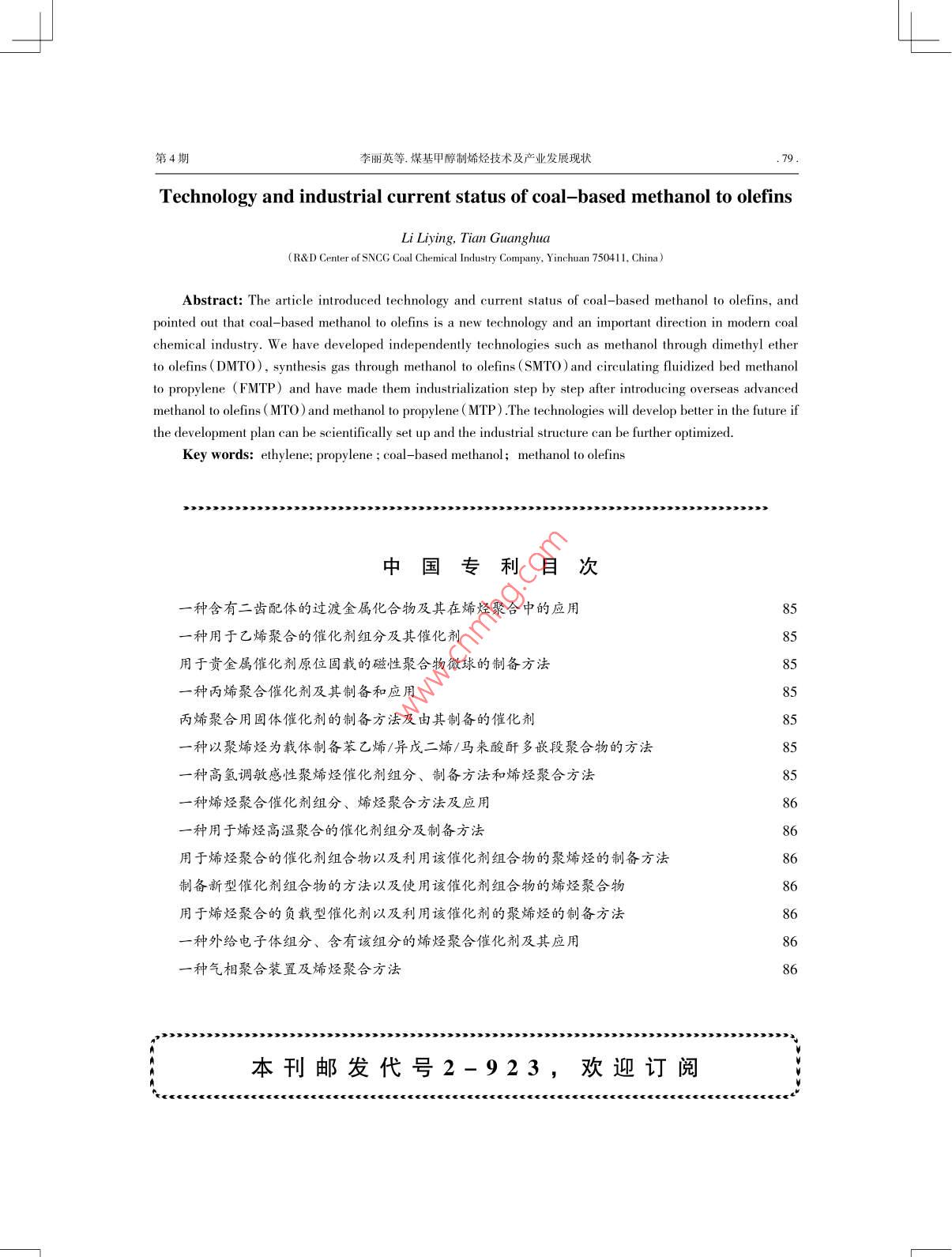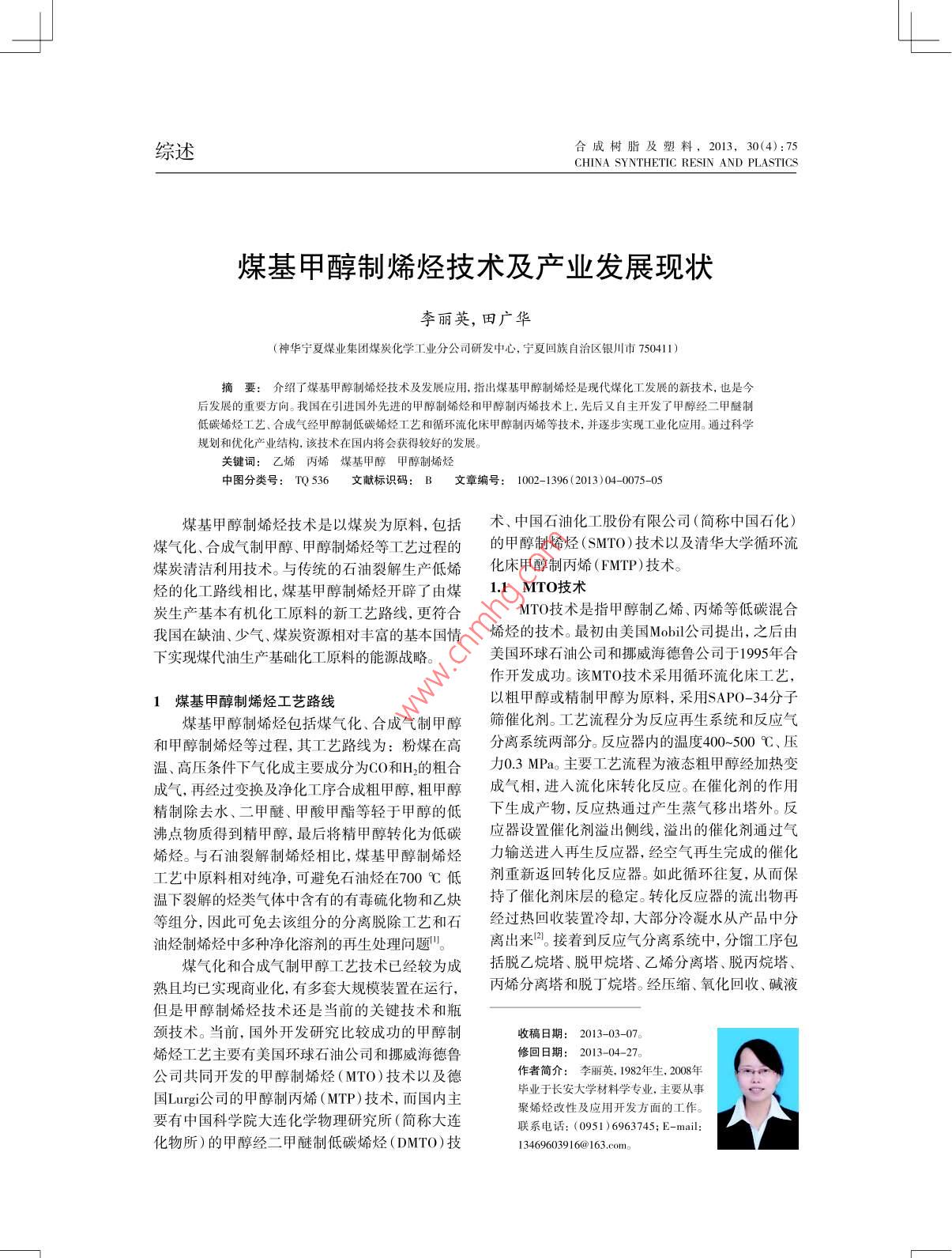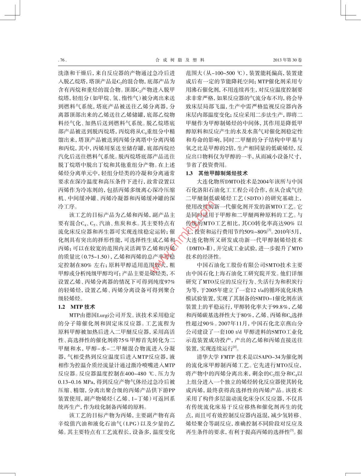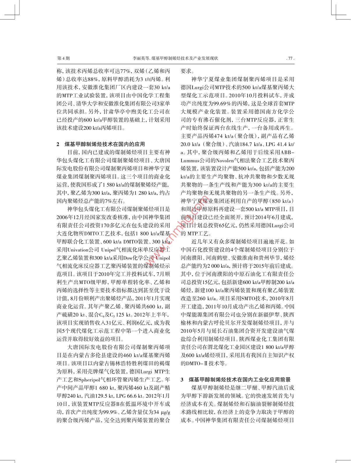 綜述合成樹脂及塑料,2013,30(4):75CHINA SYNTHETIC RESIN AND PLASTICS煤基甲醇制烯烴技術(shù)及產(chǎn)業(yè)發(fā)展現(xiàn)狀李麗英,田廣華(神華寧夏煤業(yè)集團(tuán)煤炭化學(xué)工業(yè)分公司研發(fā)中心,寧夏回族自治區(qū)銀川市750411)摘要: 介紹了煤基甲醇制烯烴技術(shù)及發(fā)展應(yīng)用,指出煤基甲醇制烯烴是現(xiàn)代煤化工發(fā)展的新技術(shù),也是今后發(fā)展的重要方向。我國在引進(jìn)國外先進(jìn)的甲醇制烯烴和甲醇制丙烯技術(shù)上,先后又自主開發(fā)了甲醇經(jīng)二甲醚制低碳烯烴I藝、合成氣經(jīng)甲醇制低碳烯烴工藝和循環(huán)流化床甲醇制丙烯等技術(shù),并逐步實(shí)現(xiàn)工業(yè)化應(yīng)用。通過科學(xué)規(guī)劃和優(yōu)化產(chǎn)業(yè)結(jié)構(gòu),該技術(shù)在國內(nèi)將會獲得較好的發(fā)展。關(guān)鍵詞:乙烯丙烯煤基甲醇甲醇制烯烴中圖分類號: TQ536 文獻(xiàn)標(biāo)識碼: B文章編號: 1002-1396(2013)04 -0075-05煤基甲醇制烯烴技術(shù)是以煤炭為原料,包括術(shù)、 中國石油化工股份有限公司(簡稱中國石化)煤氣化、合成氣制甲醇、甲醇制烯烴等工藝過程的的甲醇制烯烴(SMTO)技術(shù)以及清華大學(xué)循環(huán)流煤炭清潔利用技術(shù)。與傳統(tǒng)的石油裂解生產(chǎn)低烯化床甲醇制丙烯(FMTP)技術(shù)。烴的化工路線相比,煤基甲醇制烯烴開辟了由煤1.1 MTO技術(shù)炭生產(chǎn)基本有機(jī)化工原料的新工藝路線,更符合MTO技術(shù)是指甲醇制乙烯、丙烯等低碳混合我國在缺油、少氣、煤炭資源相對豐富的基本國情烯烴的技 術(shù)。最初由美國Mobil公司提出,之后由下實(shí)現(xiàn)煤代油生產(chǎn)基礎(chǔ)化工原料的能源戰(zhàn)略。美國環(huán)球石油公司和挪威海德魯公司于1995年合作開發(fā)成功。該MTO技術(shù)采用循環(huán)流化床工藝,1煤基 甲醇制烯烴工藝路線以粗甲醇或精制甲醇為原料,采用SAP0-34分子煤基甲醇制烯烴包括煤氣化、合成氣制甲醇篩催化劑。工藝流程分為反應(yīng)再生系統(tǒng)和反應(yīng)氣和甲醇制烯烴等過程,其工藝路線為:粉煤在高分離系統(tǒng)兩部分。反應(yīng)器內(nèi)的溫度400~500 C、壓溫、高壓條件下氣化成主要成分為CO和H的粗合力0.3 MPao主要工藝流程為液態(tài)粗甲醇經(jīng)加熱變成氣,再經(jīng)過變換及凈化I序合成粗甲醇,粗甲醇成氣相, 進(jìn)人流化床轉(zhuǎn)化反應(yīng)。在催化劑的作用精制除去水、二甲醚、甲酸甲酯等輕于甲醇的低下生成產(chǎn)物,反應(yīng)熱通過產(chǎn)生蒸氣移出塔外。反沸點(diǎn)物質(zhì)得到精甲醇,最后將精甲醇轉(zhuǎn)化為低碳應(yīng) 器設(shè)置催化劑溢出側(cè)線,溢出的催化劑通過氣烯烴。與石油裂解制烯烴相比,煤基甲醇制烯烴力輸送進(jìn)人再生反應(yīng)器,經(jīng)空氣再生完成的催化工藝中原料相對純凈,可避免石油烴在700 c低劑 重新返回轉(zhuǎn)化反應(yīng)器。如此循環(huán)往復(fù),從而保溫下裂解的烴類氣體中含有的有毒硫化物和乙炔持 了催化劑床層的穩(wěn)定。轉(zhuǎn)化反應(yīng)器的流出物再等組分,因此可免去該組分的分離脫除工藝和石經(jīng)過熱回收裝 置冷卻,大部分冷凝水從產(chǎn)品中分油烴制烯烴中多種凈化溶劑的再生處理問題"。離出來。接著到反應(yīng)氣分離系統(tǒng)中,分餾工序包煤氣化和合成氣制甲醇I藝技術(shù)已經(jīng)較為成括脫乙烷塔、 脫甲烷塔、乙烯分離塔、脫丙烷塔、熟且均已實(shí)現(xiàn)商業(yè)化.有多套大規(guī)模裝置在運(yùn)行,丙烯分離塔 和脫丁烷塔。經(jīng)壓縮.氧化回收、堿液但是甲醇制烯烴技術(shù)還是當(dāng)前的關(guān)鍵技術(shù)和瓶頸技術(shù)。當(dāng)前,國外開發(fā)研究比較成功的甲醇制收稿日期: 2013-03-07。烯烴工藝主要有美國環(huán)球石油公司和挪威海德魯修回日期: 2013-04-27。公司共同開發(fā)的甲醇制烯烴(MTO)技術(shù)以及德作者簡介:李麗英, 1982年生, 2008年畢業(yè)于長安大學(xué)材料學(xué)專業(yè),主要從事國Lurgi公司的甲醇制丙烯(MTP)技術(shù),而國內(nèi)主聚烯烴改性及應(yīng)用開發(fā)方面的工作。要有中國科學(xué)院大連化學(xué)物理研究所(簡稱大連聯(lián)系電話: (0951) 6963745; E-mail:化物所)的甲醇經(jīng)二甲醚制低碳烯烴(DMTO)技13469603916@163.com..76.合成樹脂及塑料2013年第30卷洗滌和干燥后,來自反應(yīng)器的產(chǎn)物通過急冷后進(jìn)范圍大 (從-100~-500 C),裝置能耗偏高,裝置建人脫乙烷塔,塔頂產(chǎn)品是C2的混合物,底部產(chǎn)品為成后有一定的節(jié)能降耗空間; MTP催化劑采用專含有丙烷和重?zé)N的混合物。頂部C.產(chǎn)物進(jìn)人脫甲用沸 石催化劑,不用連續(xù)再生,對反應(yīng)溫度控制要烷塔,輕組分(如甲烷.氫惰性氣)被分離出來送求非常 嚴(yán)格,如果反應(yīng)器的氣流分布不均,將會導(dǎo)到燃料氣系統(tǒng),塔底產(chǎn)品被送往乙烯分離器,分致床層局部飛溫,生產(chǎn)中需嚴(yán)格監(jiān)視反應(yīng)器內(nèi)各離器頂部出來的乙烯送往乙烯儲罐,底部乙烷物床層內(nèi) 部溫度變化;反應(yīng)采用二步法生產(chǎn),即將二料經(jīng)氣化、加熱后送到燃料氣系統(tǒng)。脫乙烷塔底甲醚作為甲醇制烯烴的中間體,其作用是降低甲部產(chǎn)品被送到脫丙烷塔,丙烷將從C,重組分中