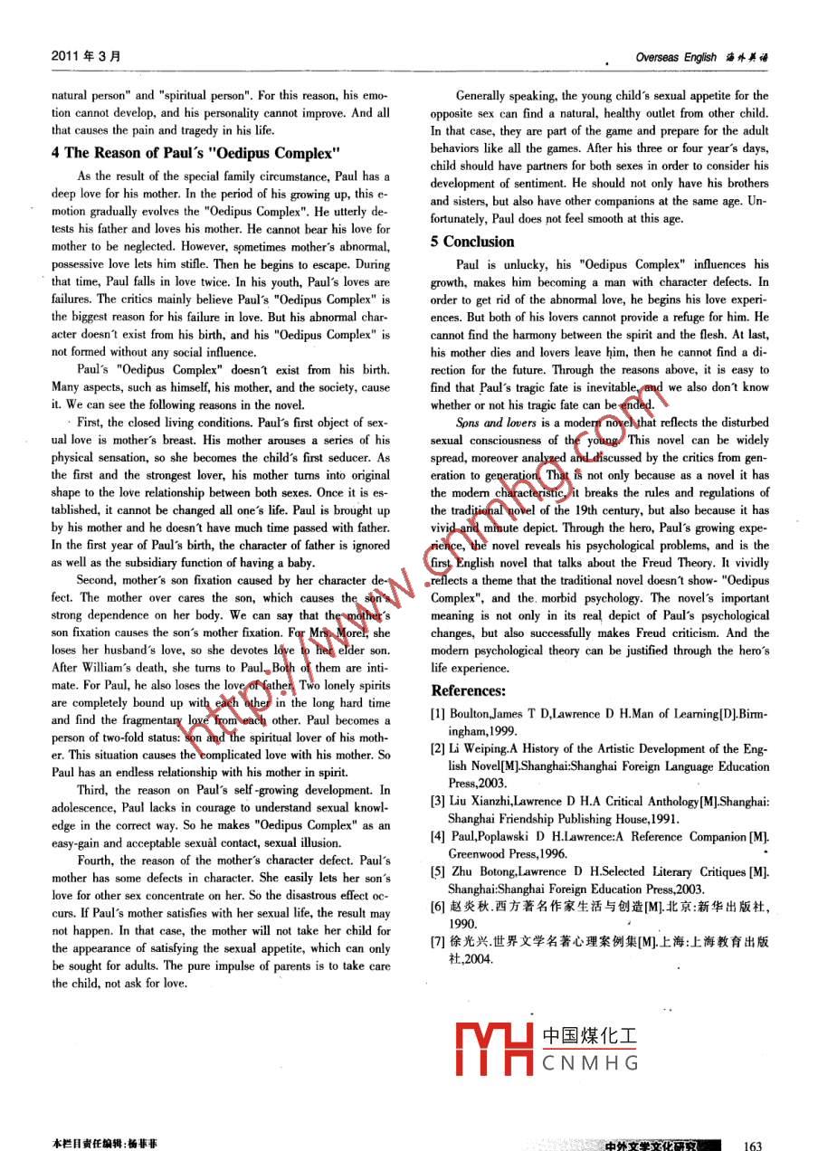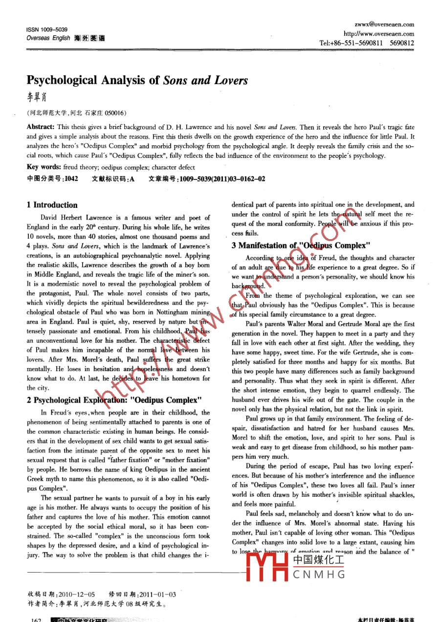 zwwx@overseaen.comISSN 1009 -5039http://www.overseaen.comOverseas English 海處英謂Tel:+86- -551- -5690811 5690812Psychological Analysis of Sons and Lovers李翠肖(河北師范大學(xué),河北石家莊050016)Abstract: This thesis gives a brief background ofD. H. Lawrence and his novel Sons and Lovers. Then it reveals the hero Paul's tragic fateand gives a simple analysis about the reasons. First this thesis dwells on the growth experience of the hero and the infuence for ltdte Paul. Itanalyzes the hero's "Oedipus Complex" and morbid psychology fom the psychological angle. It deeply reveals the family crisis and the so-cial roots, which cause Paul's "Oedipus Complex", fully relects the bad infuence of *the environment to the people s psychology.Key words: freud theory; oedipus complex; character defect中圖分類號(hào):I042文獻(xiàn)標(biāo)識(shí)碼:A文章編號(hào):1009 -5039(2011)03 -0162 -021 Introductiondentical part of parents into spiritual one in the development, andunder the control of spirit he lets the natural self meet the re-David Herbert Lawrence is a famous writer and poet ofquest of the moral conformity. People will be anxious if this pro-England in the early 20* century. During his whole life, he writescess fails.10 novels, more than 40 stories, almost one thousand poems and4 plays. Sons and Lovers, which is the landmark of Lawrence's3 Manifestation of "Oedipus Complex"creations, is an autobiographical psychoanalytic novel. ApplyingAccording to one idea of Freud, the thoughts and characterthe realistic skills, Lawrence describes the growth of a boy bormof an adult are due to his life experience to a great degree. So ifin Middle England, and reveals the tragic life of the miner's son.we want to understand a person's personality, we should know hisIt is a modermistic novel to reveal the psychological problem ofbackground.the protagonist, Paul. The whole. novel consists of two parts,From the theme of psychological exploration, we can seewhich vividly depicts the spiritual bewilderedness and the psy-that Paul obviously has the "Oedipus Complex". 'This is becausechological obstacle of Paul who was borm in Nottingham miningof his special family circumstance to a great degree.area in England. Paul is quiet, shy, reserved by nature but in.Paul's parents Walter Moral and Gertrude Moral are the firsttensely passionate and emotional. From his childhood, Paul has-generation in the novel. They happen to meet in a party and theyan unconventional love for his mother. The characteristic defectfall in love with each other at first sight. After the wedding, theyof Paul makes him incapable of the normal love between hishave some happy, sweet time. For the wife Gertrude, she is com-lovers. After Mrs. Morel's death, Paul suffers the great strikepletely satisfied for three months and happy for six months. Butmentally. He loses in hesitation and hopelesness and doesn'tthis two people have many diferences such as family backgroundknow what to do. At last, he decides to leave his hometown forand personality. Thus what they seek in spirit is different. Afterthe city.the short intense emotion, they begin to quarrel endlessly. The2 Psychological Exploration: "Oedipus Complex"husband ever drives his wife out of the gate. The couple in thenovel only has the physical relation, but not the link in sprit.In Freud's eyes, when people are in their childhood, thePaul grows up in that family environment. The feeling of de-phenomenon of being sentimentally attached to parents is one ofspair, dissatisfaction and hatred for her husband causes Mrs.the common characteristic existing in human beings. He consid-Morel to shift the emotion, love, and spirit to her sons, Paul isers that in the development of sex child wants to get sexual satis-weak and easy to get disease from childhood, so his mother pam-faction from the intimate parent of the opposite sex to meet hispers him very much.sexual request that is called "father fxation" or "mother fixation"During the period of escape, Paul has two loving expeni-by people. He borrows the name of king Oedipus in the ancientences. But because of his mother's interference and the influenceGreek myh to name this phenomenon, so it is also called "Oedi-of his "Oedipus Complex", these two loves all fail. Paul's innerpus Complex".world is often drawn by his mother's invisible spiritual shackles,The sexual partner he wants to pursuit of a boy in his earlyand feeles more painful.age is his mother. He always wants to occupy the position of hisPaul fels sad, melancholy and doesn't know what to do un-father and captures the love of his mother. This emotion cannotder the infuence of Mrs. Morel's abnormal state. Having hisre accepted by the social ethical moral, so it has been con-mother, Paul isn't capable of loving other woman. This "Oedipusstrained. The so-called "complex" is the unconscious form tookComplex" changes into solid love to a large extant, causing himshapes by the depressed desire, and a kind of psychological in-jury. The way to solve the problem is that child changes the iason and the balance of "中國(guó)煤化工TYRCNMHG收稿日期:2010-12-05修回日期:2011-01-03作者簡(jiǎn)介:李翠肖,河北師范大學(xué)08級(jí)研究生。162路中外文學(xué)文化研究5本欄目責(zé)任編輯:楊菲菲萬(wàn)萬(wàn)數(shù)據(jù)2011年3月Overseas English 淄外其語(yǔ)natural person" and "spiritual person". For this reason, his emo-Generally speaking, the young child's sexual appetite for thetion cannot develop, and his personality cannot improve. And allopposite sex can find a natural, healthy outlet from other child.that causes the pain and tragedy in his life.In that case, they are part of the game and prepare for the adult4 The Reason of Paul's "Oedipus Complex"behaviors like all the games. After his three or four year's days,child should have partners for both sexes in order to consider hisAs the result of the special 