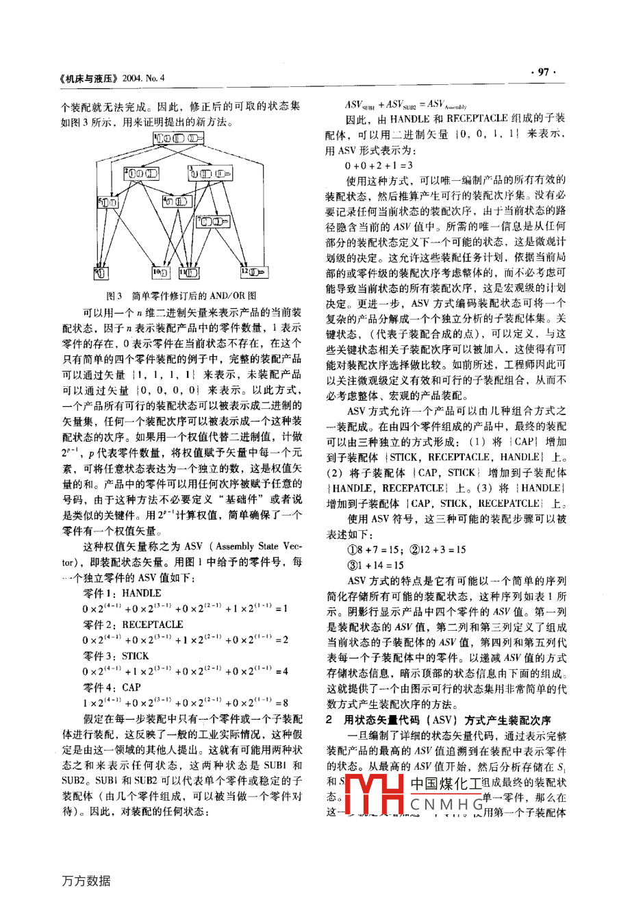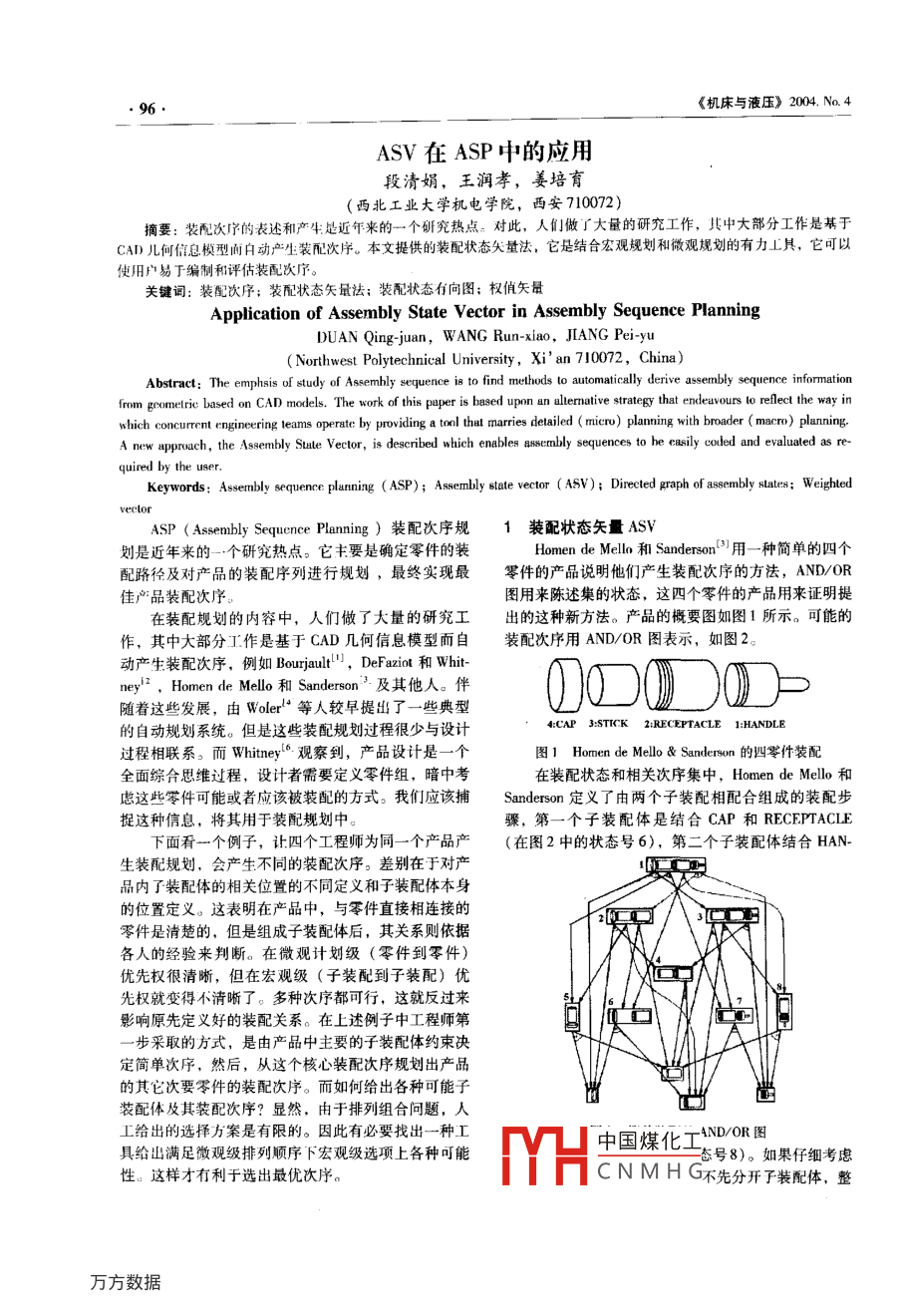 《機(jī)床與液壓》2004.N4ASV在ASP中的應(yīng)用段清娟,王潤(rùn)孝,姜培育西北工業(yè)大學(xué)機(jī)電學(xué)院,西安710072)摘要:裝配次序的表述和產(chǎn)生是近年來(lái)的一個(gè)硏究熱點(diǎn)。對(duì)此,人們做了大量的研究工作,其中大部分工作是基于CAD兒何信息模型而自動(dòng)產(chǎn)生裝配次序。本文提供的裝配狀態(tài)矢量法,它是結(jié)合宏觀規(guī)劃和微觀規(guī)劃的有力工具,它可以使用戶易于編制和評(píng)估裝配次序關(guān)鍵詞:裝配次序;裝配狀態(tài)矢量法;裝配狀態(tài)有向圖;權(quán)值矢量application of Assembly State Vector in Assembly Sequence PlanningDUAN Qing-juan, WANG Run-xiao, JIANG Pei-yuNorthwest Polytechnical University, Xi an 710072, China)bstract: The emphsis of study of Assembly sequence is to find methods to automatically derive assembly sequence informationfrom geometrie based on CAD models. The work of this paper is based upon an altemative strategy that endeavours lo reflect the way inwhich concurrent engineering teams operate: by providing a tool thul marries detailed(mieru)planning with broader( macro)planningA new approach, the Assembly State Vector, is described which enables assembly sequences to he easily coded and evaluated as re-quired by the user.Keywords: Assembly sequence pl( ASP); Assembly state vector(ASV): Directed graph of assembly states: WeightedveclorASP( Assembly Sequence Planning)裝配次序規(guī)1裝配狀態(tài)矢量AsⅤ劃是近年來(lái)的一個(gè)研究熱點(diǎn)。它主要是確定零件的裝Homen de melle和 Sanderson(3用一種簡(jiǎn)單的四個(gè)配路徑及對(duì)產(chǎn)品的裝配序列進(jìn)行規(guī)劃,最終實(shí)現(xiàn)最零件的產(chǎn)品說(shuō)明他們產(chǎn)生裝配次序的方法, AND/OR佳產(chǎn)品裝配次序圖用來(lái)陳述集的狀態(tài),這四個(gè)零件的產(chǎn)品用來(lái)證明提在裝配規(guī)劃的內(nèi)容中,人們做了大量的研究工出的這種新方法。產(chǎn)品的概要圖如圖1所示。可能的作,其中大部分工作是基于CAD幾何信息模型而自裝配次序用 AND/OR圖表示,如圖2動(dòng)產(chǎn)生裝配次序,例如 bourgault", DeFazio和Whitney2, Homen de mello和 Sanderson3·及其他人。伴隨著這些發(fā)展,由 Woler‘等人較早提出了一些典型的自動(dòng)規(guī)劃系統(tǒng)。但是這些裝配規(guī)劃過(guò)程很少與設(shè)計(jì)4: CAP 3: STICK 2: RECEPTACLE 1:HANDLE過(guò)程相聯(lián)系。而 whitney“觀察到,產(chǎn)品設(shè)計(jì)是一個(gè)圖1 Homen de mello& Sanderson的四零件裝配全面綜合思維過(guò)程,設(shè)計(jì)者需要定義零件組,暗中考在裝配狀態(tài)和相關(guān)次序集中, Homen de mello和慮這些零件可能或者應(yīng)該被裝配的方式。我們應(yīng)該捕 Sanderson定義了由兩個(gè)子裝配相配合組成的裝配步捉這種信息,將其用于裝配規(guī)劃中。驟,第一個(gè)子裝配體是結(jié)合CAP和 RECEPTACLE下面看一個(gè)例子,讓四個(gè)工程師為同一個(gè)產(chǎn)品產(chǎn)(在圖2中的狀態(tài)號(hào)6),第二個(gè)子裝配體結(jié)合HAN生裝配規(guī)劃,會(huì)產(chǎn)生不同的裝配次序。差別在于對(duì)產(chǎn)品內(nèi)子裝配體的相關(guān)位置的不同定義和子裝配體本身的位置定義。這表明在產(chǎn)品中,與零件直接相連接的零件是清楚的,但是組成子裝配體后,其關(guān)系則依據(jù)各人的經(jīng)驗(yàn)來(lái)判斷。在微觀計(jì)劃級(jí)(零件到零件優(yōu)先權(quán)很清晰,但在宏觀級(jí)(子裝配到子裝配)優(yōu)先權(quán)就變得不清晰了。多種次序都可行,這就反過(guò)來(lái)影響原先定義好的裝配關(guān)系。在上述例子中工程師第步采取的方式,是由產(chǎn)品中主要的子裝配體約束決定簡(jiǎn)單次序,然后,從這個(gè)核心裝配次序規(guī)劃出產(chǎn)品的其它次要零件的裝配次序。而如何給出各種可能子裝配體及其裝配次序?顯然,由于排列組合問(wèn)題,人工給出的選擇方案是有限的。因此有必要找出一種LAND/OR圖具給出滿足微觀級(jí)排列順序下宏觀級(jí)選項(xiàng)上各種可能中國(guó)煤化工號(hào)8)。如果仔細(xì)考慮性。這樣才有利于選出最優(yōu)次序。CNMHG不先分開(kāi)裝配體,整《機(jī)床與液壓》個(gè)裝配就無(wú)法完成。因此,修正后的可取的狀態(tài)集ASVsum +ASSum =ASVA如圖3所示,用來(lái)證明提出的新方法。因此,由 HANDLE和 RECEPTACLE組成的子裝配體,可以用二進(jìn)制矢量101!來(lái)表用AsV形式表示為使用這種方式,可以唯一編制產(chǎn)品的所有有效的裝配狀態(tài),然后推算產(chǎn)生可行的裝配次序集。沒(méi)有必要記錄任何當(dāng)前狀態(tài)的裝配次序,出于當(dāng)前狀態(tài)的路徑隱含當(dāng)前的ASV值中。所需的唯一信息是從任何部分的裝配狀態(tài)定義下一個(gè)可能的狀態(tài),這是微觀計(jì)劃級(jí)的決定。這允許這些裝配任務(wù)計(jì)劃,依據(jù)當(dāng)前局部的或零件級(jí)的裝配次序考慮整體的,而不必考慮可能導(dǎo)致當(dāng)前狀態(tài)的所有裝配次序,這是宏觀級(jí)的計(jì)劃圖3簡(jiǎn)單零件修訂后的AND/OR圖可以用一個(gè)n維二進(jìn)制矢量來(lái)表示產(chǎn)品的當(dāng)前裝定。更進(jìn)一步,ASⅤ方式編碼裝配狀態(tài)可將一個(gè)復(fù)雜的產(chǎn)品分解成一個(gè)個(gè)獨(dú)立分析的子裝配體集。關(guān)配狀態(tài),因子n表示裝配產(chǎn)品中的零件數(shù)量,1表示鍵狀