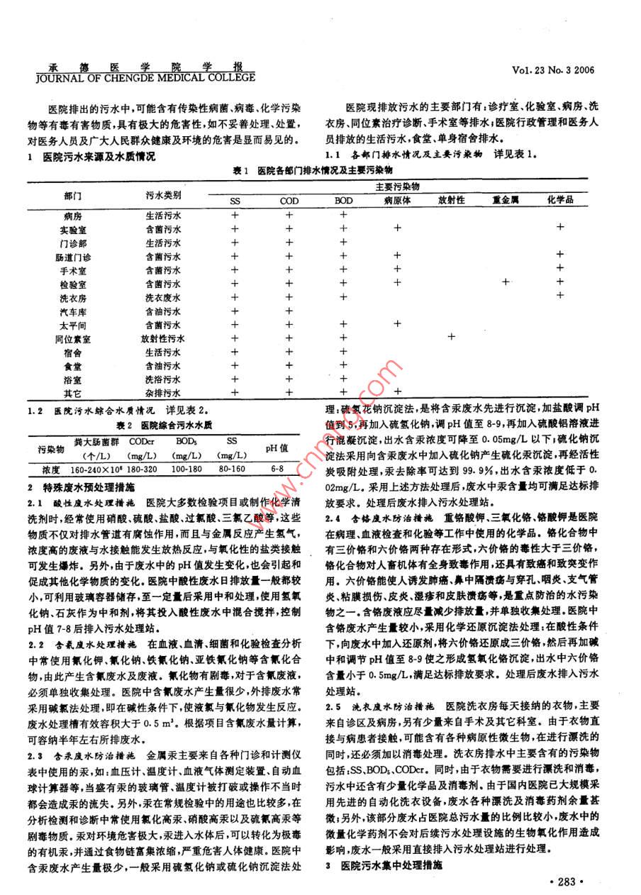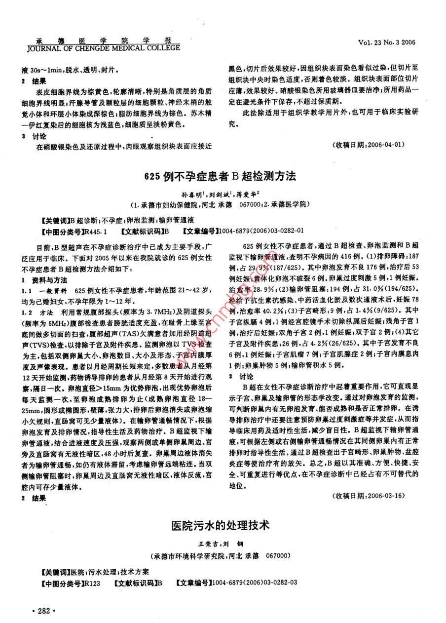 J平C是 MEDICAL COLLEGEVol.23No.32006液308~1min,脫水透明、封片黑色,切片后效果較好,因組織塊表面染色看似過染,但切片至結(jié)果組織塊中央時(shí)染色適度否則著色較淡。組織塊表面部位切片表皮細(xì)胞界線為棕黃色,輪廓清晰特別是角質(zhì)層的角質(zhì)應(yīng)薄,效果較好。硝酸銀染色所用玻璃器皿要潔凈;所用藥品一細(xì)胞界線明顯;汗腺導(dǎo)管及顆粒層的細(xì)胞顆粒神經(jīng)末梢的觸定在避光條件下保存不超過保質(zhì)期覺小體和環(huán)層小體染成深棕色;脂肪細(xì)胞界線為棕色。蘇木精此法除適用于組織學(xué)教學(xué)用片外,也可用于臨床實(shí)驗(yàn)研一伊紅復(fù)染后的細(xì)胞核為淺藍(lán)色細(xì)胞質(zhì)呈淡粉黃色3討論在硝酸銀染色及還原過程中,肉眼觀察組織塊表面應(yīng)接近(收稿日期:2006-0401)625例不孕癥患者B超檢測(cè)方法孫春明,劉劍誠,蔣愛華(1承德市婦幼保健院河北承德0670002承德醫(yī)學(xué)院)【關(guān)鍵調(diào)】B超診斷;不孕癥;卵泡監(jiān)測(cè);輸卵管通液【中圖分類號(hào)衛(wèi)R445.1【文獻(xiàn)標(biāo)識(shí)碼】B【文章編號(hào)】1004-6879(2006)03-0282-01目前B型超聲在不孕癥診斷治療中已成為主要手段,廣625例女性不孕癥患者,通過B超檢查卵泡監(jiān)測(cè)和B超泛應(yīng)用于臨床。下面對(duì)2005年以來在我院就診的625例女性監(jiān)視下輸卵管通液,查明不孕病因的416例。(1)排卵障礙:187不孕癥患者B超檢測(cè)方法介紹如下例,占29.9%(187/625)其中卵泡發(fā)育不良176例,治療后531資料與方法例妊娠黃體化卵泡不破裂6例,卵巢過度刺激5例,1例妊娠1.1一般資料625例女性不孕癥患者年齡范圍21~42歲,治愈率28.9%;(2)輸卵管阻塞:194例,占31.0%(194/625)均為已婚婦女不孕年限為1~12年經(jīng)給予抗生素抗感染、中藥活血化淤及數(shù)次通液術(shù)后,妊娠1.2方法利用常規(guī)腹部探頭(頻率為37MHx)及陰道探頭例治愈率40.2%;(3)子宮畸形:9例,占1.4%(9/625),其中頻率為6MH)腹部檢查患者膀胱適度充盈在恥骨上緣至宮子宮縱膈4例,1例經(jīng)言腔鏡手術(shù)切除縱膈后妊娠;殘角子宮1底間做多切面的掃查,腹部超聲(TAS)欠滿意者加用經(jīng)陰道超例,治療后妊娠;雙角子宮2例,1例妊娠;雙子宮2例;(4)其它聲(TVS)檢查以排除子宮及附件疾患,監(jiān)測(cè)卵泡以TvS檢查子宮及附件疾患:26例,占42%(26/625),其中子宮發(fā)育不良為主包括雙側(cè)卵巢大小卵泡數(shù)目大小及形態(tài)子宮內(nèi)膜厚6例1例妊娠;子宮肌瘤7例;子宮肌腺癥2例;子宮內(nèi)膜息肉度及聲像表現(xiàn),患者以月經(jīng)周期長短來定,多數(shù)患者從月經(jīng)第1例;卵巢腫物5例;輸卵管積水5例12天開始監(jiān)測(cè)藥物誘導(dǎo)排卵的患者從月經(jīng)第8天開始進(jìn)行觀3討論察,隔日一次,卵泡直徑>15mm為優(yōu)勢(shì)卵泡,出現(xiàn)優(yōu)勢(shì)卵泡后B超在女性不孕癥診斷治療中起著重要作用它可直觀顯每天監(jiān)測(cè)一次至卵泡成熟排卵為止(成熟卵泡直徑18-示子宮卵巢及輸卵管的形態(tài)學(xué)改變通過對(duì)卵泡發(fā)育的監(jiān)測(cè)25mm,圓形或橢圓形壁薄張力大排卵后卵泡消失或卵泡縮可判斷卵巢內(nèi)有無卵泡發(fā)育能否成熟和是否正常排卵。在誘小欠規(guī)則,直腸窩可見少量液體)。在輸卵管通暢情況下,根據(jù)導(dǎo)排卵治療中還要注意預(yù)防卵巢過度刺激癥等并發(fā)癥,從而指卵泡發(fā)育及排卵情況,指導(dǎo)性生活及藥物治療。B超監(jiān)視下輸導(dǎo)臨床用藥及適時(shí)性生活減少盲目性。B超監(jiān)視下輸卵管通卵管通液,結(jié)合進(jìn)液速度及壓強(qiáng),觀察兩側(cè)或單側(cè)卵巢周邊、宮液可根據(jù)左側(cè)或右側(cè)輸卵管通暢情況在其同側(cè)卵巢內(nèi)有正常旁及直腸窩有無液性暗區(qū),48小時(shí)后復(fù)查。卵巢周邊液體消失排卵時(shí)指導(dǎo)性生活。通過B超檢查出子宮畸形、卵巢腫物、盆腔者為輸卵管通暢如仍有液體滯留考慮輸卵管遠(yuǎn)端粘連,當(dāng)雙炎癥等使治療有的放矢.總之,B超以其準(zhǔn)確方便快捷安側(cè)輸卵管阻塞時(shí)卵巢周邊及直腸窩無液性暗區(qū)液體反流宮全可重復(fù)進(jìn)行等優(yōu)點(diǎn)在不孕癥診斷中已經(jīng)占有不可替代的腔內(nèi)可存少量液體地位。結(jié)果(收稿日期:2006-03-16)醫(yī)院污水的處理技術(shù)王榮吉,劉鋼(承德市環(huán)境科學(xué)研究院,河北承德067000【關(guān)鍵詞】醫(yī)院污水處理;技術(shù)方案【中田分類號(hào)R123【文獻(xiàn)標(biāo)識(shí)碼】【文章編號(hào)】1004-6879(2006)03-0282-03282·vol.23No.32006JOURNAL OF CHENGDE MEDICAL COLLEGE醫(yī)院排出的污水中可能含有傳染性病菌病毒、化學(xué)污染醫(yī)院現(xiàn)排放污水的主要部門有:診療室、化驗(yàn)室病房、洗物等有毒有害物質(zhì),具有極大的危害性如不妥善處理處置,衣房同位素治療診斷手術(shù)室等排水;醫(yī)院行政管理和醫(yī)務(wù)人對(duì)醫(yī)務(wù)人員及廣大人民群眾健康及環(huán)境的危害是顯而易見的,員排放的生活污水食堂單身宿會(huì)排水1醫(yī)院污水來源及水質(zhì)情況1.1各部門排水情況及主要污染物詳見表11醫(yī)院各部門排水情況及主要污染物主要污染物部門污水類別病原體放射性重金屬化學(xué)品病房生活污水實(shí)驗(yàn)窒含菌污水門診部生活污