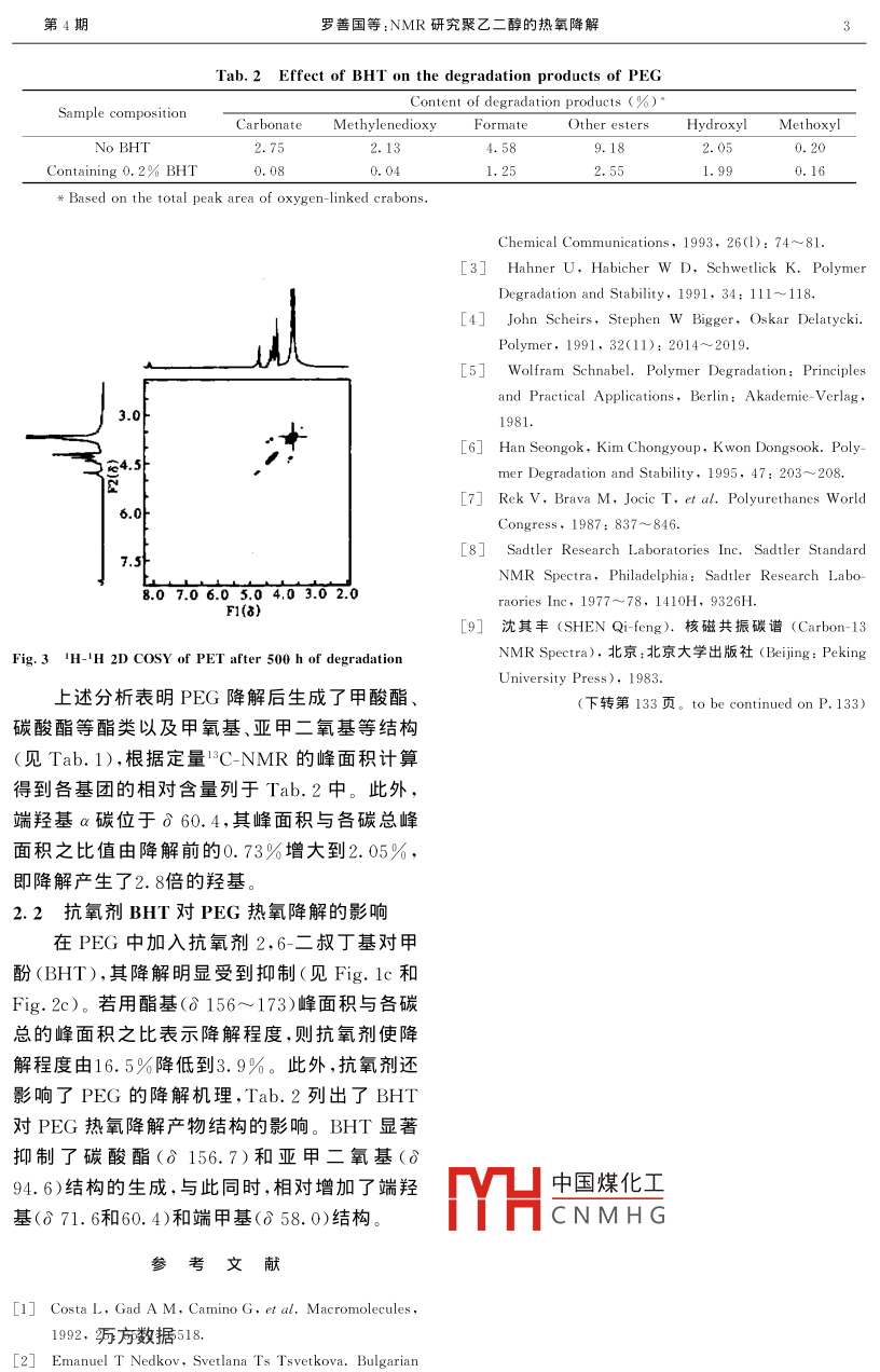 第17卷第4期高分子材料科學(xué)與工程Vol. 17. No. 42001年7月POLYMER MATERIALS SCIENCE AND ENGINEERINGNMR研究聚乙二醇的熱氧降解羅善國(guó)1,陳福泰ψ,譚惠民1,張建國(guó)2,滿(mǎn)光磊1,羅運(yùn)軍1北京理工大學(xué)化工與材料學(xué)院,北京100081;2中國(guó)科學(xué)院長(zhǎng)春應(yīng)化所,吉林長(zhǎng)春130022)摘要:采用H、C和2DNMR技術(shù)研究了聚乙二醇(PEG的熱氧降解,對(duì)產(chǎn)物結(jié)構(gòu)作了詳細(xì)分析和表征,并定量討論了抗氧劑2,6-二叔丁基-4-甲基酚(BHT)對(duì)其熱氧降解的影響。PEG的氧化降解發(fā)生在醚鍵氧碳上,遵循自由基氧化杋理,最后形成大量的甲酸酯等酯類(lèi)以及甲基、亞甲二氧基和醇??寡鮿〣HT不僅降低了PEG的氧化降解程度,而且改變了降解產(chǎn)物的結(jié)構(gòu)分布,顯著抑制了碳酸酯和亞甲二氧基結(jié)構(gòu)的生成,相對(duì)增加了端羥基和端甲基結(jié)構(gòu)關(guān)鍵詞:聚乙二醇;熱氧降解;核磁共振中圖分類(lèi)號(hào):O632.3文獻(xiàn)標(biāo)識(shí)碼:A文章編號(hào):1000-7555(2001)04-0128-0聚醚的熱氧降解已有不少報(bào)道1-3,對(duì)產(chǎn)500h后的樣品做NMR實(shí)驗(yàn)。物的結(jié)構(gòu)表征基本上采用紅外光譜法1.3NMR實(shí)驗(yàn)(IR)4:。然而IR不能區(qū)分一些結(jié)構(gòu)相似的基在 UNITY-400NMR譜儀上測(cè)定。以氘代團(tuán),并且很難給出定量結(jié)果。近幾年來(lái),用核磁氯仿(CDCl3)為溶劑,采用φ5mm樣品管,質(zhì)共振技術(shù)(NMR)研究高分子降解已有一些報(bào)子譜以δws=0.00,碳譜以c1=77.00為譜道,但大都以H譜為依據(jù)。由于H譜化學(xué)線參考位移范圍較窄,信號(hào)重疊嚴(yán)重,提供的信息有1C-NMR實(shí)驗(yàn):觀察頻率為100.58MHz,限?!孀V則可以提供較寬的且分辨很好的結(jié)90脈沖,重復(fù)周期為7.1s,譜寬21kHz,16K構(gòu)信息;此外,二維化學(xué)位移相關(guān)譜可以提供碳數(shù)據(jù)點(diǎn),反轉(zhuǎn)門(mén)控去偶方法(NNE)用于定量測(cè)和氫相互關(guān)聯(lián)的信息,從而可以確定分子骨架定,6000次以上累加。的連接方式。本文采用多種NMR技術(shù)研究聚H-NMR實(shí)驗(yàn):觀察頻率為399.95MHz,乙二醇(PEG)在熱氧降解過(guò)程中的結(jié)構(gòu)變化,譜寬為4.2kHz,64K數(shù)據(jù)點(diǎn),90°脈沖,重復(fù)周并定量討論抗氧劑2,6-二叔丁基4-甲基酚期為2.3s。H-H同核相關(guān)實(shí)驗(yàn)(COSY):觀察(BHT)對(duì)其熱氧降解的影響頻率為399.95MHz,取F1=F2=3.5kHz,2K數(shù)據(jù)點(diǎn),90°脈沖,重復(fù)周期為2.1s,累加32次1實(shí)驗(yàn)部分F1維取數(shù)256,數(shù)據(jù)處理采用正弦鐘窗函數(shù)1.1試劑聚乙二醇(PEG6000):日本進(jìn)口分裝,M2結(jié)果與討論6000,平均官能度為2;2,6二叔丁基4甲基2.1NMR分析產(chǎn)物結(jié)構(gòu)酚(BHT):AR,上?;瘜W(xué)試劑站分裝廠T姑始右葉稱(chēng)規(guī)整性其HNMR1.2熱氧老化實(shí)驗(yàn)吧Fig.1a),其中o3.70將PEG鋪開(kāi)在直徑約為8cm的蒸發(fā)皿CNMHG以了,δ1.95和δ2.82的兩中,置于90C老化烘箱中并保持通風(fēng),取老化收稿日期:1999-08基金項(xiàng)面、據(jù)63”計(jì)劃基金資助課題善國(guó),男,32歲,博士后,副教授.聯(lián)系人:譚惠民高分子材料科學(xué)與工程2001年個(gè)單峰分別歸屬于羥基和水峰。C-NMR譜出(結(jié)構(gòu)C)α碳上的質(zhì)子;?3.39為甲氧基結(jié)構(gòu)現(xiàn)3個(gè)峰(見(jiàn)Fig.2a),其中δ60.4和72.1分(結(jié)構(gòu)D)中的質(zhì)子。COSY譜顯示δ4.39和o別為端羥基中α和β碳的貢獻(xiàn),主鏈碳峰位于4.26分別與?3.78和?3.71交叉,歸屬于酯結(jié)構(gòu)A和C中的亞甲基質(zhì)子。Fig. 2 3C-NMR spectra of PEG at different degradationa: before degradation i b: after 500 h of degradaFig. 1 H-NMR spectra of PEG at different degradation timetion; c: after 500 h of degradation in the presencea: before degradation: b: after 500 h of degradation;c: after 500 h of degradation in the presence of bht.PEG在90C很快熔化,隨著降解進(jìn)行,熔1C-NMR譜中出現(xiàn)δ94.6、0156~173和液逐漸變稀。500h后的H和CNMR譜分別58~73幾組新峰。DEPT譜表明8160.6為叔如Fig.1b和Fig.2b所示,表征的產(chǎn)物結(jié)構(gòu)列碳,是甲酸酯結(jié)構(gòu)(結(jié)構(gòu)A),其氧碳位于δ62.2。δ156~173為季碳,是其它酯基結(jié)構(gòu),其于Tab.1中在H譜中,降解產(chǎn)生的新峰出現(xiàn)在8.10氧碳位于663.0-67,9;多條譜線的出現(xiàn)是由于受鄰近基團(tuán)的影響,酯基及其氧碳存在多種8.18、δ6.10、δ3.39和δ4.1~4.8范圍內(nèi)Fig.3的COSY譜顯示a8.10~8.18、4.71化學(xué)環(huán)境,其中δ156.7為碳酸酯結(jié)構(gòu)(結(jié)構(gòu)E)1。58.0為甲基,是甲氧結(jié)構(gòu)(結(jié)構(gòu)D)的貢δ4.18和3.39是孤立質(zhì)子,其中δ8.108.18是甲酸酯(結(jié)構(gòu)A)質(zhì)子特征峰:δ4.71歸獻(xiàn)其它各碳均為亞甲基,其中δ94.6是亞甲二屬于亞甲二氧基結(jié)構(gòu)(結(jié)構(gòu)B);04,18為酯基氧基結(jié)構(gòu)(結(jié)構(gòu)B)。Tab. 1 NMR characterization of degradation products of PEGDegradation productsNMR characterizationH2=8.10~8.18;Hb=4.39;He=3.78C--OCH, CH,OwCa=160.6;Cb=62MO-CH2--OvH=4.71;C=94.6H=4,18;H=4.26;H4=3.71wOCH,C-CH,CH,OCb=169~173:C=63.0~67.9MMCH-OCH3中國(guó)煤化工CNMHGw-CHO-C-oCH2w第4期羅善國(guó)等:NMR研究聚乙二醇的熱氧降解Tab 2 Effect of BHT on the degradation products of PEGContent of degradation products(%)arbonate Methylenedioxy FormateHydroxyl MethoxylNo BHT2.754.589.182.050.20ng 0. 2% BHTBased o