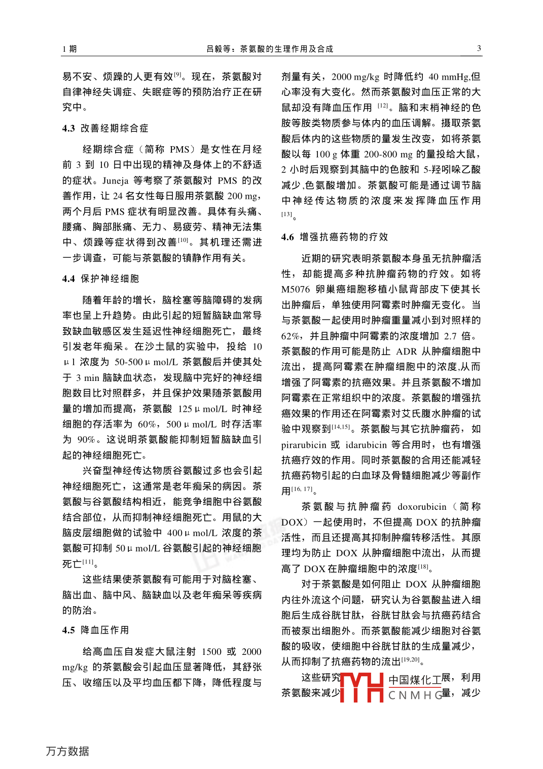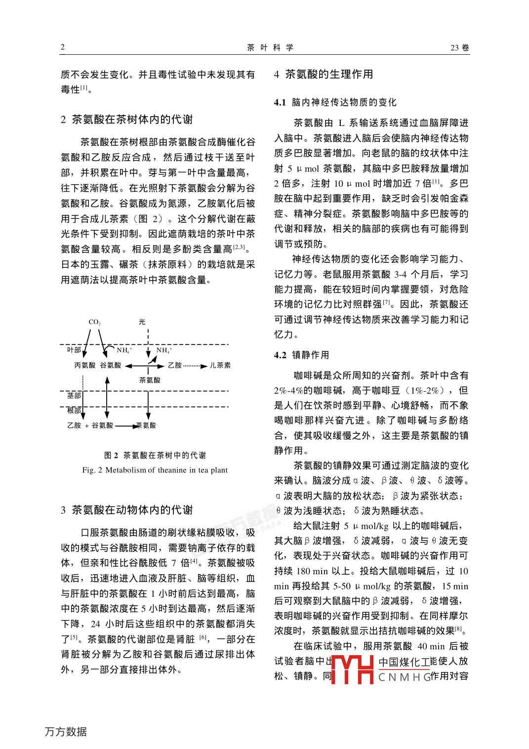 茶葉科學2003,23(1):1-5Journal of Tea Science文章編號: 1000- 369X (2003) 01 - 0001 - 05茶氨酸的生理作用及合成呂毅,郭雯飛”,倪捷兒3,楊賢強(1.浙江大學茶學系,浙江杭州310029; 2. 浙江大學化學系,浙江杭州310027; 3.寧波醫(yī)藥高等專科學校,浙江寧波315104)摘要:茶氨酸是茶葉特有的化學成分之一,對茶葉品質(zhì)有重要影響。近年的研究發(fā)現(xiàn)茶氨酸有多種保健作用,非常具有開發(fā)前景。本文就茶氨酸的性質(zhì)、生理作用、合成等進行綜述。關(guān)鍵詞:茶學;茶;茶氨酸;生理作用;合成中圖分類號: Q946文獻標識碼: AThe Bioactivities and Synthesis of TheanineLU Yi, GUO Wen-fei, NI Jie-er', YANG Xian-qiang'(1. Department of Tea Science, Zhejiang University, Hangzhou 310029, China; 2. Department of Chemistry, Zhejiang University,Hangzhou 310027, China; 3. Ningbo Medicine College, Ningbo 315104, China)Abstract: The recent researches have found that theanine, an unique and important component in tea plants, has manybioactivities, and made it get more and more attention. The property, bioactivities, and industrial preparation oftheanine are reviewed.Key words: Tea science; Tea; Theanine; Bioactivity; Synthesis茶的許多生理功能被科學所證實后,其保具有甜味和鮮爽味,味閾值0.06%, 是茶葉鮮健成分引起了人們的廣泛的興趣。上個世紀中爽味的主要成分。葉開始的有關(guān)茶多酚的研究取得了很大成就。茶氨酸的性質(zhì)較穩(wěn)定。將茶氨酸溶液煮沸近年對茶葉的其他保健成分的研究中,茶氨酸5 min,或?qū)⒉璋彼崛苡趐H 3.0的溶液中并在是比較引人注目的一個化合物,它的許多生理25度下儲放12個月,茶氨酸含量不變。因此.作用被發(fā)現(xiàn)后,合成及提取茶氨酸也成了廣泛在通常的食品加工、殺菌過程中,茶氨酸的性關(guān)注的研究課題。CH2NH_,CH31茶氨酸的性質(zhì)HOOC茶氨酸(圖1) 是茶樹中特有的化學成分之一,又名N-乙基_γ L谷氨酰胺,占茶葉中圖1L-茶氨酸分子結(jié)構(gòu)游離氨基酸總量的50%以上,占茶葉干重的Fig. 1 Molecule structure of theanine1%-2%。茶氨酸為白色針狀晶體,易溶于水,中國煤化工收稿日期: 2002-08-08修訂日期: 2003- 01-07作者簡介:呂毅(1969-), 女,浙江杭州人,現(xiàn)在浙江大學茶學系攻讀博士學位,主要從手則生兒與標口利H刀因y研究。MHC NMH G_2茶葉科學23卷質(zhì)不會發(fā)生變化。并且毒性試驗中未發(fā)現(xiàn)其有4茶氨酸的生理作用毒性川。4.1腦內(nèi)神經(jīng)傳達物質(zhì)的變化2茶氨酸在茶樹體內(nèi)的代謝茶氨酸由L系輸送系統(tǒng)通過血腦屏障進茶氨酸在茶樹根部由茶氨酸合成酶催化谷入腦中。茶氨酸進入腦后會使腦內(nèi)神經(jīng)傳達物氨酸和乙胺反應合成,然后通過枝干送至葉質(zhì)多巴胺顯著增加。向老鼠的腦的紋狀體中注部,并積累在葉中。芽與第一葉中含量最高,射5 umol茶氨酸,其腦中多巴胺釋放量增加往下逐漸降低。在光照射下茶氨酸會分解為谷2倍多,注射10μ mol時增加近7倍川。多巴.氨酸和乙胺。谷氨酸成為氮源,乙胺氧化后被胺在腦中起到重要作用,缺乏時會引發(fā)帕金森用于合成兒茶素(圖2)。這個分解代謝在蔽癥、精神分裂癥。茶氨酸影響腦中多巴胺等的光條件下受到抑制。因此遮蔭栽培的茶葉中茶代謝和釋放,相關(guān)的腦部的疾病也有可能得到氨酸含量較高。相反則是多酚類含量高12.3)。調(diào)節(jié)或預防。日本的玉露、碾茶(抹茶原料)的栽培就是采神經(jīng)傳達物質(zhì)的變化還會影響學習能力、用遮蔭法以提高茶葉中茶氨酸含量。記憶力等。老鼠服用茶氨酸3-4個月后,學習能力提高,能在較短時間內(nèi)掌握要領(lǐng),對危險環(huán)境的記憶力比對照群強7。因此,茶氨酸還CO光可通過調(diào)節(jié)神經(jīng)傳達物質(zhì)來改善學習能力和記憶力。4.2鎮(zhèn)靜作用丙氨酸谷氨酸+個乙胺 ....兒茶素茶氨酸咖啡堿是眾所周知的興奮劑。茶葉中含有2%-4%的咖啡堿,高于咖啡豆(1%-2%) ,但是人們在飲茶時感到平靜、心境舒暢,而不象乙胺+谷氨酸一搽氨酸喝咖啡那樣興奮亢進。除了咖啡堿與多酚絡(luò)合,使其吸收緩慢之外,這主要是茶氨酸的鎮(zhèn)圖2茶氨酸在茶樹中的代謝靜作用。Fig. 2 Metabolism of theanine in tea plant茶氨酸的鎮(zhèn)靜效果可通過測定腦波的變化來確認。腦波分成a波、β波、日θ波、 δ波等。a波表明大腦的放松狀態(tài);β波為緊張狀態(tài);3茶氨酸在動物體內(nèi)的代謝θ波為淺睡狀態(tài);δ波為熟睡狀態(tài)。口服茶氨酸由腸道的刷狀緣粘膜吸收,吸給大鼠注射5 u mol/kg以上的咖啡堿后,收的模式與谷酰胺相同,需要鈉離子依存的載其大腦β波增強,δ波減弱,a波與θ波無變體,但親和性比谷酰胺低7倍4。茶氨酸被吸化,表現(xiàn)處于興奮狀態(tài)??Х葔A的興奮作用可收后,迅速地進入血液及肝臟、腦等組織,血持續(xù)180min以上。投給大鼠咖啡堿后,過10與肝臟中的茶氨酸在1小時前后達到最高,腦min再投給其5-50 μ mol/kg的茶氨酸,15 min中的茶氨酸濃度在5小時到達最高,然后逐漸后可觀察到大鼠腦中的β波減弱,δ 波增強, .下降,24小時后這些組織中的茶氨酸都消失表明咖啡堿的興奮作用受到抑制。在同樣摩爾了I51。茶氨酸的代謝部位是腎臟間, -部分在濃度時,茶氨酸就顯示出拮抗咖啡堿的效果181。腎臟被分解為乙胺和谷氨酸后通過尿排出體在臨床試驗中,服用茶氨酸40min 后被外,另一部分直接排出體外。試驗者腦中出中國煤