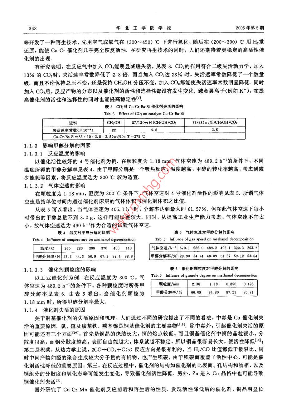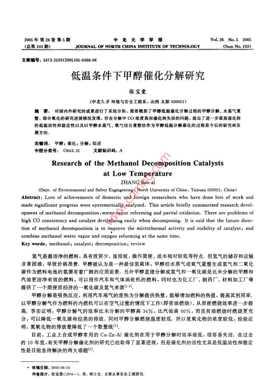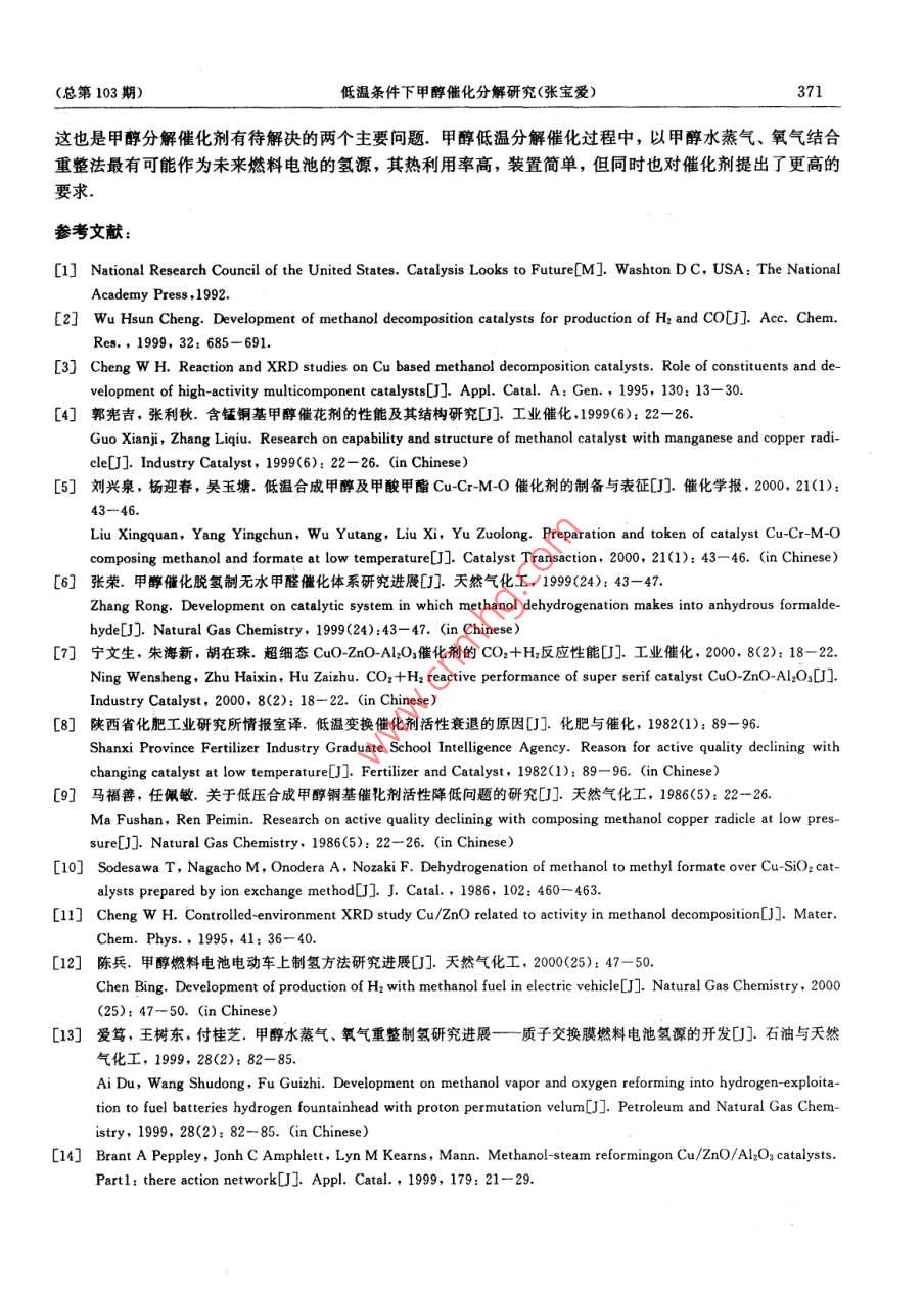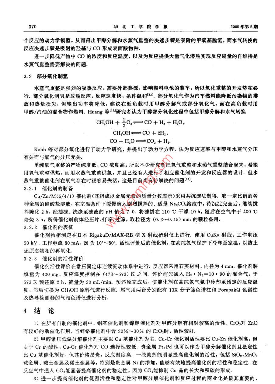 2005年第26卷第5期中北大學學報(總第103期)JOURNAL OF NORTH CHINA INSTITUTE OF TECHNOLOGY(Sum No 103)文章編號:1673-3193(2005)05-036606低溫條件下甲醇催化分解研究張寶愛(中北大學環(huán)境與安全工程系,山西太原030051)摘要:對國內(nèi)外研究的成果進行了系統(tǒng)分析,簡要概括了甲醇低溫催化分解過程的甲醇分解、水蒸氣重整、部分氧化的研究進展情況發(fā)現(xiàn),存在分解中CO濃度高和催化劑失活的問題,提出了進一步提高催化劑的低溫活性和穩(wěn)定性以及以甲醇水蒸氣、氧氣結合重整法作為甲醇低溫分解催化的過程是今后的研究和發(fā)展方向關鍵詞:甲醇;催化;分解;綜述中圖分類號:O643.31文獻標識碼:AResearch of the Methanol Decomposition Catalystsat Low TemperatureZHANG Bao-ai(Dept. of Environmental and Safety Engingeering, North University of China, Taiyuan 030051, China)Abstract Lots of achievements of domestic and foreign researchers who have done lots of work andmade significant progress were systematically analyzed. This article briefly summarized research devel-opment of methanol decomposition, water vapor reforming and partial oxidation. There are problems ofhigh CO consistency and catalyst devitalizing easily when decomposing. It is said that the future direction of methanol decomposition is to improve the microthermal activity and stability of catalyst, andcomne methanol water vapor and oxygen reforming at the same timeKey words: methanol catalyst; decomposition; review氫氣是最潔凈的燃料,具有投資少、流程短、操作簡便、成本相對較低等特點.但氫氣的儲存和運輸非常困難,導致價格昂貴.甲醇被認為是一種最佳氫載體,甲醇經(jīng)水蒸氣或氧氣重整生成氫氣和二氧化碳作為燃料電池的氫源有著廣闊的應用前景.另外甲醇直接分解成氫氣和一氧化碳是比未分解的甲醇和汽油更潔凈有效的燃料,可以用作汽車和氣體渦輪機的燃料,同時也為化工廠、制藥廠、材料加工廠等提供了一個簡便而經(jīng)濟的一氧化碳及氫氣來源2甲醇分解是吸熱反應,利用汽車尾氣的廢熱為分解提供熱量,能夠增加燃料的熱值,提高其利用率.以甲醇分解氣作為燃料的內(nèi)燃機可以在空氣過量的情況下工作(即貧油燃燒),從而使燃燒效率進一步提高.事實證明:甲醇分解氣的效率比未分解的甲醇高34%,比汽油高60%,而且貧油燃燒時燃燒更充分,可以降低一氧化碳和烴類的排放.同時甲醇分解燃燒溫度較低.所以氮氧化物的濃度較低,經(jīng)驗證明:氮氧化物的排放量降低了一個數(shù)量級目前,工業(yè)上合成甲醇常用的Cu-Zn-Al催化劑在用于甲醇分解時效率很低,很容易失活.在過去的10年里,有關甲醇分解催化劑的研究已經(jīng)取得了顯著進展,但是催化劑的活性尤其是低溫活性和穩(wěn)定性是目前急待解決的兩大難題2]·收稿日期:2005-06-24作者簡介:張寶愛(1974-),男,碩士生,主要從事安全工程研究總第103期)低溫條件下甲醇催化分解研究(張寶愛)3671催化劑體系的進展情況1.1銅基催化劑CuO催化劑被認為是甲醇低溫分解的催化劑,一般在(200~275)℃使用.最近發(fā)展起來的CuCr催化體系是高活性甲醇低溫分解催化劑,加入Mg,Ba,Si堿金屬等助劑能進一步提高CuCr催化劑的活性、穩(wěn)定性及選擇性.改性的CuCr催化體系的催化性能要比Cu-Zn催化劑好得多(,但此催化劑存在著Cr污染的問題.目前,國內(nèi)在甲醇低溫裂解催化劑的研究和應用方面,比較先進的是在銅基催化劑的基礎上加入助劑N的效果最為明顯1.1.1催化劑的活性與選擇性1)以ZnO,Cr2O3,CuO,K2O,NiO等為原料,采用不同的配比,經(jīng)溶解、浸漬、干燥、焙燒等工藝過程制備成組成不同的催化劑.由表1列出的4種催表1各種催化劑活性比較化劑可知,以3號、4號催化劑的活性較好.如果Tb1 ctive character comparison of diversified catalys能在催化劑制備的方法和工藝上進一步改進,例如序號催化劑甲醇分解率/催化劑的成型工藝、焙燒溫度和保溫時間等方面的Zno2ZnO-Cr:,改進,催化劑的活性將進一步提高和改善43.6CuO-Zno-CrzO32)在Cu-Zn-Al和Cu-ZnCr催化劑中,如果把Zn去掉,則催化劑表現(xiàn)出更好的活性.另外,引注:試驗條件:溫度300℃,催化劑顆粒度1.18mm,入Mn,Si堿金屬、堿土金屬等也能明顯提高活性氣體空速為4892h-1和選擇性.如通過對Cu-CrMn-Ni催化劑上甲醇分解產(chǎn)物的分析可以看到,在高轉化率時,H2和CO是主要產(chǎn)物;而在低轉化率時,一定量的甲酸甲酯成為主要副產(chǎn)物.進一步的研究表明,低溫(150℃左右)時甲酸甲酯成為主要產(chǎn)物(表2),溫度升高,H2和CO產(chǎn)量提高.由此可以推測甲酸甲酯是甲醇分解的中間產(chǎn)物,即經(jīng)過甲醇轉化為甲醛,進一步生成甲酸甲酯,再由甲酸甲酯分解成CO和CH3OH,而少量二甲醚的生成可能是由于催化劑中Cr等酸性中心使CHOH脫水生成的)表2改性 Cu-Cr-Mn-Ni上甲醇分解的產(chǎn)物分布Tab 2 Production distribution of mathanol decomposition over Cu-Cr-Mn-Ni產(chǎn)物分布/%反應溫度/C轉化率/%Hr CHA Co COz CH3OCH: H20 CH OH HCO: CH, I15016.1817.180.043.130.140.140.1373.685.3222.780.045.780.130.08381542.160.2820.430.4221.90為了進一步提高催化劑的活性和選擇性,需要對催化劑作進一步改性.由于常用銅基催化劑載體Al2O3和組分Cr具有明顯的酸性,能催化甲醇的醚化反應,所以不少研究者加入堿金屬來對催化劑進行改性,以削弱Al2O3和Cr的酸性,提高催化劑的選擇性和活性,也有不少研究者嘗試用ZrO2,SiO2,MnO2,TiO2等氧化物對催化劑進行改性,也能提高銅基催化