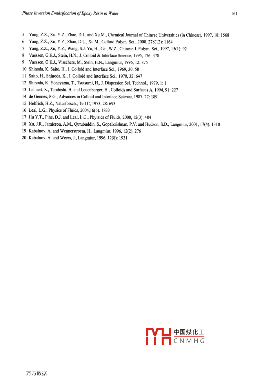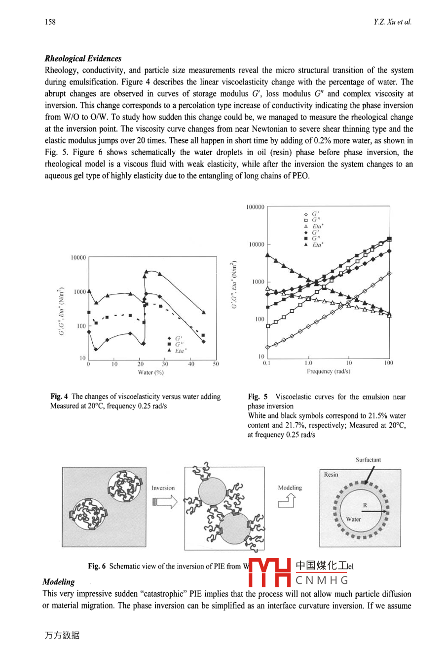 Chinese Journal of Polymer Science Vol. 24, No. 2, (2006), 155-161Chinese Journal ofPolymer Science02006 World- ScientificHYDRODYNAMIC AND THERMODYNAMIC EFFECTS IN PHASE INVERSIONEMULSIFICATION PROCESS OF EPOXY RESIN IN WATER'Yuan-ze Xu"*, Yu-zhe Wu and Jian-mao YangThe Key Laboratory of Molecular Engineering of Polymers, Ministry of Education,Department of Macromolecular Science, Fudan University, Shanghai 200433, ChinaAbstract The mechanism of phase inversion emulsification process (PIE) was studied for waterbormne dispersion of highlyviscous epoxy resin using non- ionic polymeric surfactants. Drop deformation and breakup, rheological properties,conductity, and particle size measurements reveal the micro-stuctural transtion amid emulsification. It is revealed thatstrong flow causes water drop to burst with the formation of droplets and huge interface. Phase inversion corresponds to anabrupt rheological transition from a type of viscous melt with weak elasticity to a highly elastic type of aqueous gel. Thisimplies that the phase inversion equivalent to a curvature inversion. Based on this, a geometric model is postulated tocorrelate process variables to the particle size. The coverage and conformation of the surfactant plays key role for the particlesize of the final emulsion. The interactions of thermodynamic and hydrodynamic effects are also discussed. It is concludedthat the thermodynamics control the PIE while the hydrodynamics drives the creation of interface and involves every stepofPIE.Keywords: Phase inversion; Emulsification; Rheology; Waterborne; Epoxy resin.INTRODUCTIONThe phase inversion emulsification (PIE) have been widely used in the industrial process of waterbormedispersions of polymer resins and in the preparation of homogeneous contollable micro-structures in scientificfrontierl-. It involves the dispersion of water into polymer resin by employing suitable surfactants underoptimal mixing conditions, up to certain temperature and by adding water, the W/O system is inverted to O/W,namely, the dispersion of polymer resin in water. Among various emulsification means, one advantage of PIEtechnique is that it will give very narrow particle size distribution at very high concentration. Process practiceshows that many processing parameters including temperature, shearing, dispersion time, water adding andmaterial parameters, especially, surfactant structure and concentration can significantly influence the quality ofthe final dispersion!2-7. It is desirable to have a clear physical picture and provide a basis for the optimization ofPIE process. So far the theories on PIE mechanism are developed along two separate approaches: thehydrodynamic and thermodynamic consideratiosl-5s. The hydrodynamic theorys9 suggests that thecompetition of drop breakdown and collapse under shearing determines the particle size distribution (PSD). So,the capillary number Cg the combination of interfacial tension, the viscosity ratio and the shear rate is decisive.However, the theoretical prediction leads to a PSD much broader than its distribution after PIE. Thethermodynamic considerations suggest that the mechanical work is required to increase interface. But for manyimmiscible systems PIE is esentially spontaneous with the help of surfatatsl,10-31. The interfacial bendingcaused by the surfactant structure will drive the phase inversin"4,19. This work will add more arguments to our'This project was supported by the National Natural Science Fou中國煤化工Major State BasicResearch Projects No.2003CB61 5604), Shengli Oilfield, SINOPEC..MYHCNMHG” Corresponding author: Yuan-ze Xu (許元澤), E-mail: yuanzexu@fdan.edu.cnReceived April 4, 2005; Revised April 25, 2005; Accepted April 28, 2005156YZ. Xu et al.recent efforts for clarifying the mechanism of PIE process of highly viscous resin and propose a unified pictureof PIE process.EXPERIMENTALMaterialsEpoxy resin (No. 638, Shanghai Resin Co. viscosity: 10 Pa●s) was used as the oil phase. Distilled water withtrace salts was used as water phase to maintain its electric conductivity. Emulsifier, the key component preparedin our lab, is a block copolymer of ABA type, where A is polyethylene glycol, (M = 10000) the hydrophilicsegment, and B is the hydrophobic segment made of bis-A epoxy resin (No. 638). The synthesis of surfactantwas carried out using BF3 type catalyst, which catalyzed the reaction of end hydroxide group and epoxy group.Under well-controlled condition, the molecular weight distribution of the block copolymer was narrow with aconvincible ABA structure (M≈20000).EmulificationA lab-built emulsifier made of four-necked spherical glass flask with anchor stir was used. Temperature waswell controlled using an oil bath. The conductivity change during emulsification was measured using aninductive sensor. Addition of water was accurately controlled using a metering pump.RheologyRheological material functions were measured using a strain-controlled rheometer (ARES, TA Instruments) witha torque transducer capable of measurement in the range of 0.02- 2000 g cm. Small-amplitude oscillatory shearand steady shear measurements were performed using a set of 25 mm diameter parallel-plate geometry in 20°Con fresh samples from emulsifier at various stages of emulsification.The measurements of drop deformation, break- up were done in a four -roll mill rheometer built in our lab.The system creates shearing or elongational field by adjusting the rotation speeds of the four rollers as shown inFig. I. A servo-system allows keeping drop in the center of observation window to trace the deformation andbreak-up of single drop or the recombination of drops. The operation principle is similar to that published inliteratures'16-18]xrollerFig.1 Four-roll mill rheometers to study the drop deformation, break-up and collapse in flow fieldsa) Vertical view; b) Side viewRESULTS AND DISCUSSIONHydrodynamic EffectsThe hydrodynamic, or kinetic models consider the balance of