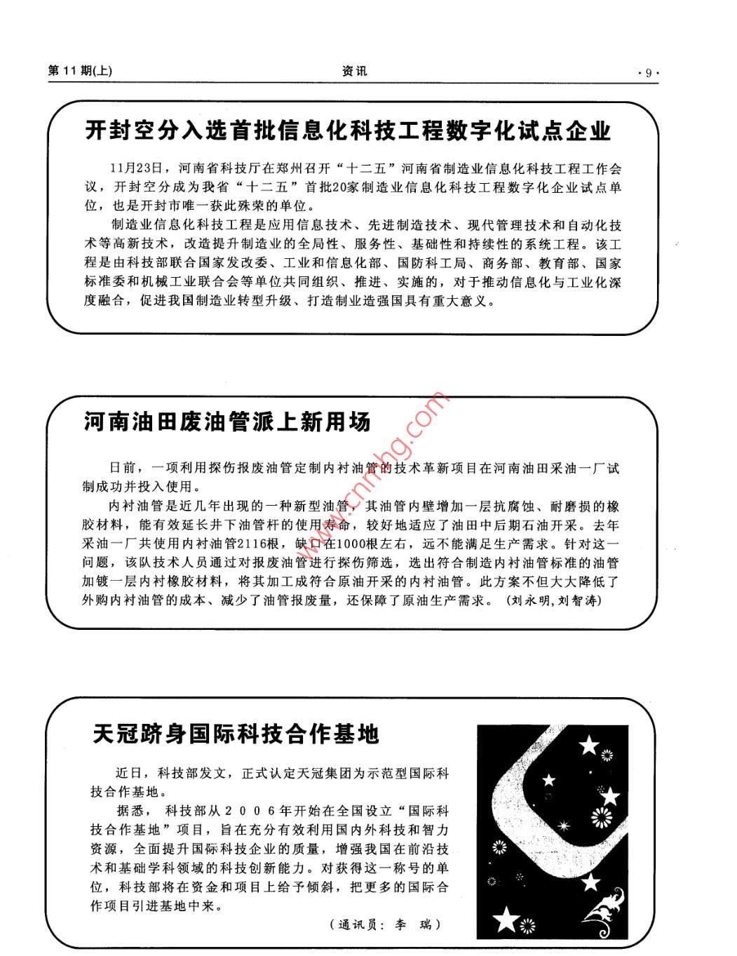 第11期(上)資訊開(kāi)封空分入選首批信息化科技工程數(shù)字化試點(diǎn)企業(yè)11月23日,河南省科技廳在鄭州召開(kāi)“十二五”河南省制造業(yè)信息化科技工程工作會(huì)議,開(kāi)封空分成為我省“十二五”首批20家制造業(yè)信息化科技工程數(shù)字化企業(yè)試點(diǎn)單位,也是開(kāi)封市唯一獲此殊榮的單位。制造業(yè)信息化科技工程是應(yīng)用信息技術(shù)、先進(jìn)制造技術(shù)、現(xiàn)代管理技術(shù)和自動(dòng)化技術(shù)等高新技術(shù),改造提升制造業(yè)的全局性、服務(wù)性、基礎(chǔ)性和持續(xù)性的系統(tǒng)工程。該工程是由科技部聯(lián)合國(guó)家發(fā)改委、工業(yè)和信息化部、國(guó)防科工局、商務(wù)部、教育部、國(guó)家標(biāo)準(zhǔn)委和機(jī)械工業(yè)聯(lián)合會(huì)等單位共同組織、推進(jìn)、實(shí)施的,對(duì)于推動(dòng)信息化與工業(yè)化深度融合,促進(jìn)我國(guó)制造業(yè)轉(zhuǎn)型升級(jí)、打造制業(yè)造強(qiáng)國(guó)具有重大意義。河南油田廢油管派上新用場(chǎng)日前,一項(xiàng)利用探傷報(bào)廢油管定制內(nèi)襯油管的技術(shù)革新項(xiàng)目在河南油田采油一廠試制成功并投入使用。內(nèi)襯油管是近幾年出現(xiàn)的一種新型油管,其油管內(nèi)壁增加一層抗腐蝕、耐磨損的橡膠材料,能有效延長(zhǎng)井下油管桿的使用壽命,較好地適應(yīng)了油田中后期石油開(kāi)采。去年采油一廠共使用內(nèi)襯油管2116根,缺口在1000根左右,遠(yuǎn)不能滿足生產(chǎn)需求。針對(duì)這問(wèn)題,該隊(duì)技術(shù)人員通過(guò)對(duì)報(bào)廢油管進(jìn)行探傷篩選,選出符合制造內(nèi)襯油管標(biāo)準(zhǔn)的油管加鍍一層內(nèi)襯橡膠材料,將其加工成符合原油開(kāi)采的內(nèi)襯油管。此方案不但大大降低了外購(gòu)內(nèi)襯油管的成本、減少了油管報(bào)廢量,還保障了原油生產(chǎn)需求。(劉永明,劉智濤)天冠躋身國(guó)際科技合作基地近日,科技部發(fā)文,正式認(rèn)定天冠集團(tuán)為示范型國(guó)際科★技合作基地。據(jù)悉,科技部從2006年開(kāi)始在全國(guó)設(shè)立“國(guó)際科技合作基地”項(xiàng)目,旨在充分有效利用國(guó)內(nèi)外科技和智力資源,全面提升國(guó)礫科技企業(yè)的質(zhì)量,增強(qiáng)我國(guó)在前沿技術(shù)和基礎(chǔ)學(xué)科領(lǐng)域的科技創(chuàng)新能力。對(duì)獲得這一稱號(hào)的單位,科技部將在資金和項(xiàng)目上給予傾斜,把更多的國(guó)際合6作項(xiàng)目引進(jìn)基地中來(lái)。(通訊員:李瑞)