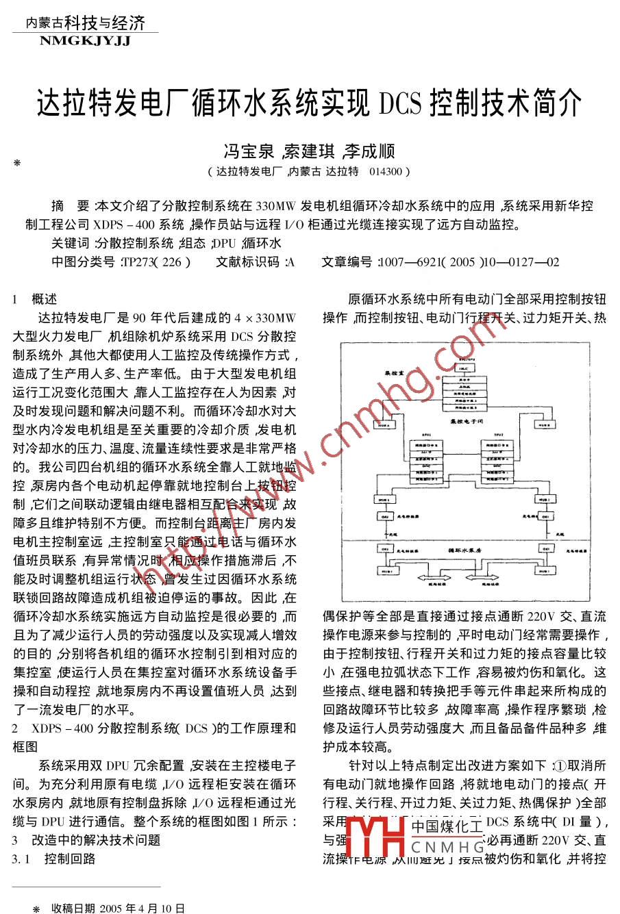 內(nèi)蒙古科技與經(jīng)濟(jì)NMGKJYJJ達(dá)拉特發(fā)電廠循環(huán)水系統(tǒng)實(shí)現(xiàn)DCS控制技術(shù)簡介馮寶泉索建琪李成順*(達(dá)拉特發(fā)電廠,內(nèi)蒙古達(dá)拉特014300)摘要:本文介紹了分散控制系統(tǒng)在330MW發(fā)電機(jī)組循環(huán)冷卻水系統(tǒng)中的應(yīng)用系統(tǒng)采用新華控制工程公司XDPS -400系統(tǒng)操作員站與遠(yuǎn)程I/0柜通過光纜連接實(shí)現(xiàn)了遠(yuǎn)方自動(dòng)監(jiān)控。關(guān)鍵詞:分散控制系統(tǒng)組態(tài);DPU循環(huán)水中圖分類號(hào):TP273( 226)文 獻(xiàn)標(biāo)識(shí)碼:A文章編號(hào):1007- -6921( 2005 )10- -0127- -021概述原循環(huán)水系統(tǒng)中所有電動(dòng)門全部采用控制按鈕達(dá)拉特發(fā)電廠是90年代后建成的4x330MW操作而控制按鈕、電動(dòng)門行程開關(guān)、過力矩開關(guān)、熱大型火力發(fā)電廠機(jī)組除機(jī)爐系統(tǒng)采用DCS分散控制系統(tǒng)外其他大都使用人工監(jiān)控及傳統(tǒng)操作方式,造成了生產(chǎn)用人多、生產(chǎn)率低。由于大型發(fā)電機(jī)組運(yùn)行工況變化范圍大靠人工監(jiān)控存在人為因素對(duì)及時(shí)發(fā)現(xiàn)問題和解決問題不利。而循環(huán)冷卻水對(duì)大型水內(nèi)冷發(fā)電機(jī)組是至關(guān)重要的冷卻介質(zhì)發(fā)電機(jī).對(duì)冷卻水的壓力、溫度、流量連續(xù)性要求是非常嚴(yán)格的。我公司四臺(tái)機(jī)組的循環(huán)水系統(tǒng)全靠人工就地監(jiān)控泵房內(nèi)各個(gè)電動(dòng)機(jī)起停靠就地控制臺(tái)上按鈕控制,它們之間聯(lián)動(dòng)邏輯由繼電器相互配合來實(shí)現(xiàn)故障多且維護(hù)特別不方便。而控制臺(tái)距離主廠房內(nèi)發(fā)_-電機(jī)主控制室遠(yuǎn)主控制室只能通過電話與循環(huán)水eemns攤師水軍房值班員聯(lián)系有異常情況時(shí)相應(yīng)操作措施滯后,不能及時(shí)調(diào)整機(jī)組運(yùn)行狀態(tài),曾發(fā)生過因循環(huán)水系統(tǒng)聯(lián)鎖回路故障造成機(jī)組被迫停運(yùn)的事故。因此在循環(huán)冷卻水系統(tǒng)實(shí)施遠(yuǎn)方自動(dòng)監(jiān)控是很必要的而.偶保護(hù)等全部是直接通過接點(diǎn)通斷220V交、直流且為了減少運(yùn)行人員的勞動(dòng)強(qiáng)度以及實(shí)現(xiàn)減人增效操作電源來參與控制的平時(shí)電動(dòng)門經(jīng)常需要操作,的目的分別將各機(jī)組的循環(huán)水控制引到相對(duì)應(yīng)的由于控制按鈕、行程開關(guān)和過力矩的接點(diǎn)容量比較集控室,使運(yùn)行人員在集控室對(duì)循環(huán)水系統(tǒng)設(shè)備手小在強(qiáng)電拉弧狀態(tài)下工作容易被灼傷和氧化。這操和自動(dòng)程控就地泵房內(nèi)不再設(shè)置值班人員達(dá)到些接點(diǎn)繼電器和轉(zhuǎn)換把手等元件串起來所構(gòu)成的了-流發(fā)電廠的水平?;芈饭收檄h(huán)節(jié)比較多故障率高操作程序繁瑣檢2XDPS-400分散控制系統(tǒng)(DCS)的工作原理和修及運(yùn)行人員勞動(dòng)強(qiáng)度大而且備品備件品種多維框圖護(hù)成本較高。系統(tǒng)采用雙DPU冗余配置安裝在主控樓電子針對(duì)以上特點(diǎn)制定出改進(jìn)方案如下①取消所間。為充分利用原有電纜,I/0遠(yuǎn)程柜安裝在循環(huán)有電動(dòng)門就地操作回路,將就地電動(dòng)門的接點(diǎn)(開水泵房內(nèi)就地原有控制盤拆除,I/0遠(yuǎn)程柜通過光行程、關(guān)行程、開過力矩、關(guān)過力矩、熱偶保護(hù))全部纜與DPU進(jìn)行通信。整個(gè)系統(tǒng)的框圖如圖1所示:采用,中國煤化工 DCS系統(tǒng)中( DI量),3改造中的解決技術(shù)問題與強(qiáng)THCNMHG必再通斷220V交直3.1控制回路流操TF電源從而趕允」按點(diǎn)被灼傷和氧化并將控*收稿日期2005年4月10日.127.內(nèi)蒙古科技與經(jīng)濟(jì)NMGKJYJJ制電纜更換為屏蔽電纜,所有邏輯回路全部由DCS.3.2.2 循環(huán)泵運(yùn)行中故障邏輯。我們設(shè)計(jì)了一個(gè)軟件實(shí)現(xiàn)減少了大量的中間環(huán)節(jié)大大提高了可靠萬能”邏輯,只要循環(huán)泵開關(guān)不是通過DCS指令去性投產(chǎn)至今幾乎沒有缺陷。②電動(dòng)門的DCS控制跳的閘就被定義為循環(huán)泵運(yùn)行中故障”經(jīng)過使系統(tǒng)操作指令由最初設(shè)計(jì)的脈沖式輸出改為電平式用發(fā)現(xiàn)效果特別好。組態(tài)邏輯圖如下:輸出。其理由是脈沖指令要求在就地控制中加裝循環(huán)泵跳閘位置反饋循環(huán)泵運(yùn).自保持回路并且需要與就地電動(dòng)門配合才能完成,AND行中故障其接線復(fù)雜易發(fā)生故障不便于維護(hù)。我們將脈沖指令改為電平指令后,由 DCS指令驅(qū)動(dòng)DO繼電器循環(huán)泵合閘位置反饋- +s來啟動(dòng)電動(dòng)門控制接觸器,電平指令由系統(tǒng)接收就RS觸發(fā)器地反饋狀態(tài)后停止DO的輸出使得操作回路接線|循環(huán)泵出口∩0°位置反饋→R大大簡化。③將電動(dòng)門、開關(guān)及控制柜等所有能監(jiān)視的反饋接點(diǎn)都作為DI量送至DCS系統(tǒng),當(dāng)出現(xiàn)說明:只要循環(huán)泵開關(guān)曾經(jīng)合過閘就將RS觸故障或缺陷后能在畫面上直接顯示出與之相關(guān)連開發(fā)器的S端置1”,RS觸發(fā)器的輸出D端就為1”關(guān)量變位狀態(tài)并發(fā)